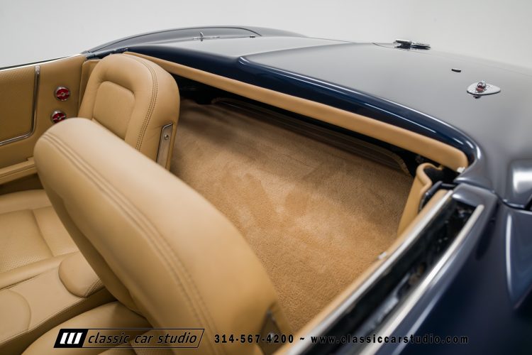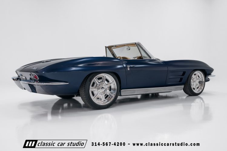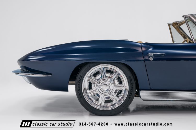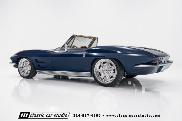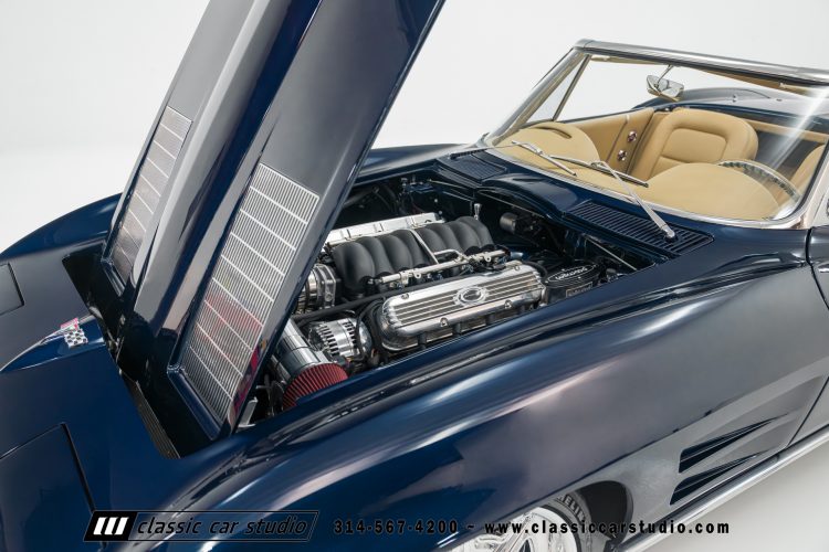 This 1963 Chevrolet Corvette convertible was modified in 2023 with the installation of a 6.2-liter LS3 V8, a four-speed automatic transmission, a replacement frame, and a coilover suspension. Additional work included a repaint in blue and the reupholstering of the seats, dashboard, door panels, and center console in tan leather. The car is further equipped with a removable hardtop, a beige soft top, 18 & 19″ Billet Specialties wheels, Wilwood four-wheel disc brakes, Penske coilovers, power steering, Borla mufflers, Vintage Air air conditioning, Classic Instruments instrumentation, an aftermarket stereo, and a Billet Specialties steering wheel and valve covers. This C2 convertible was purchased by the current owner in 2018 and is now offered on dealer consignment with a clean Illinois title.