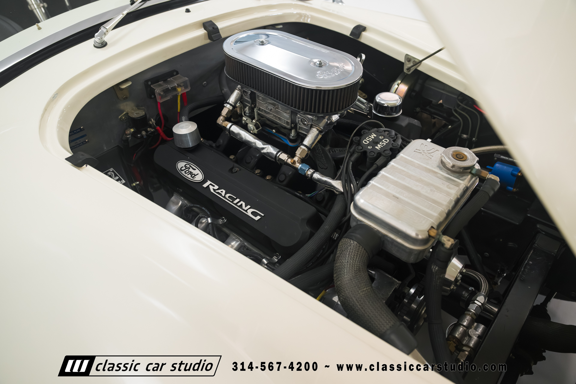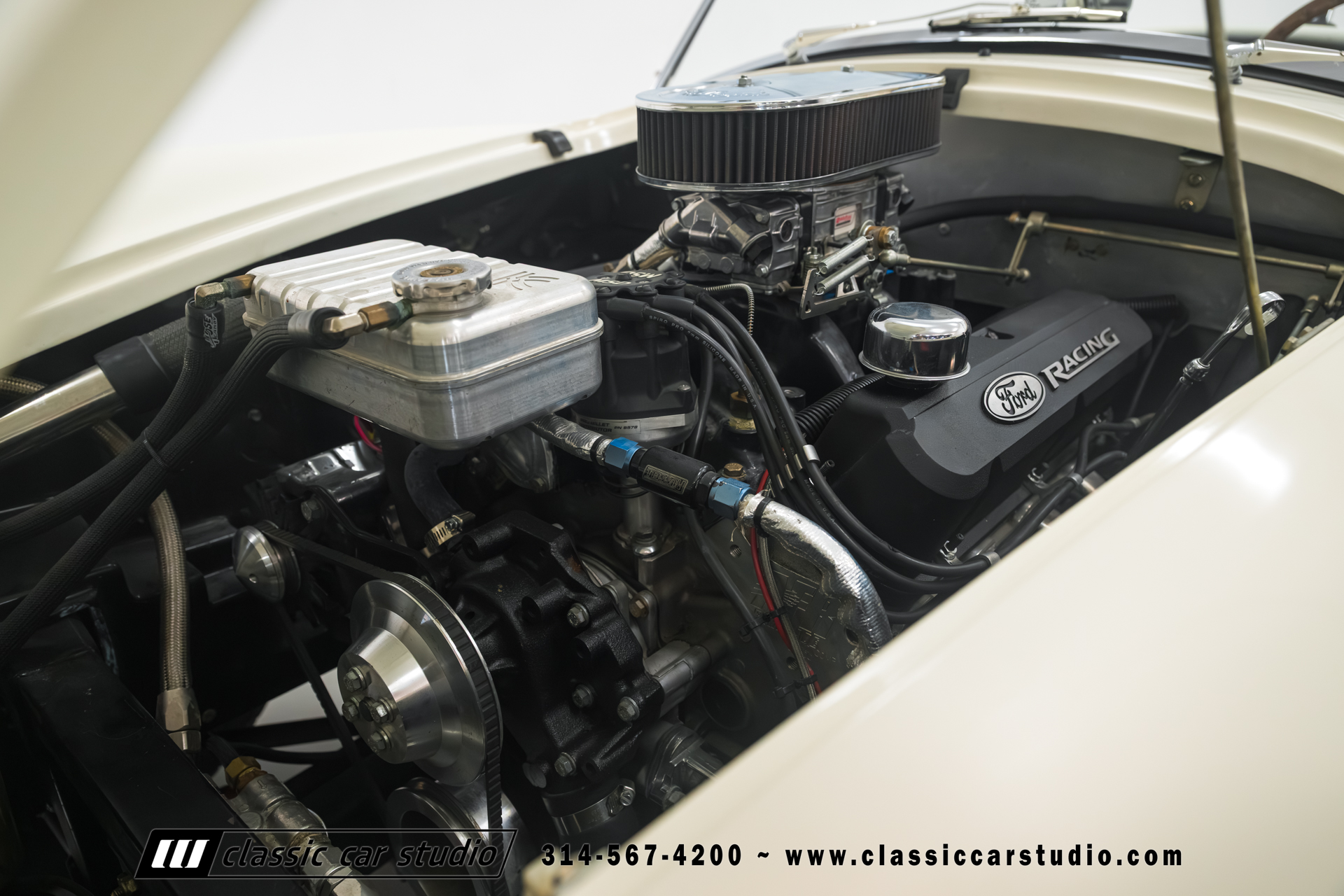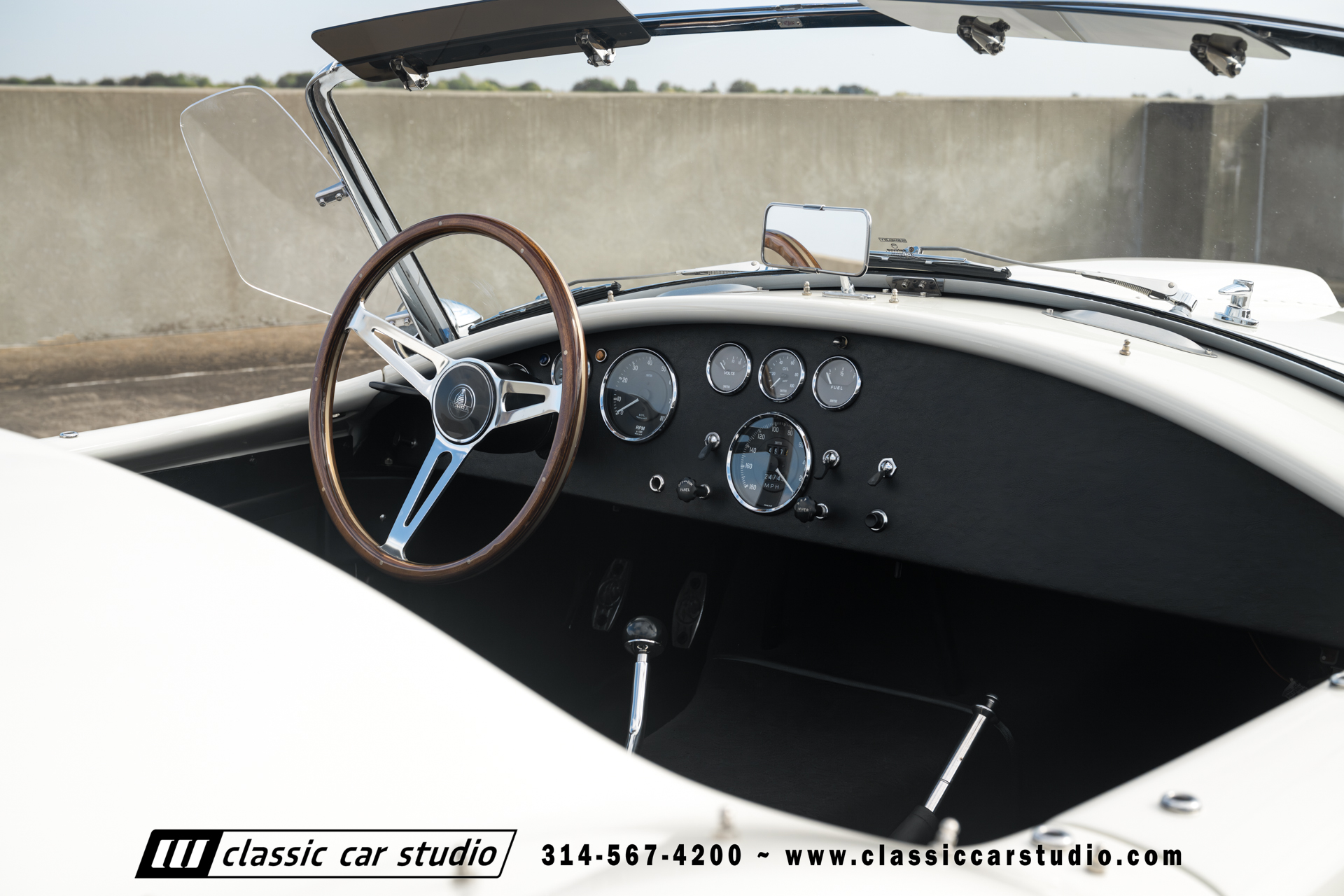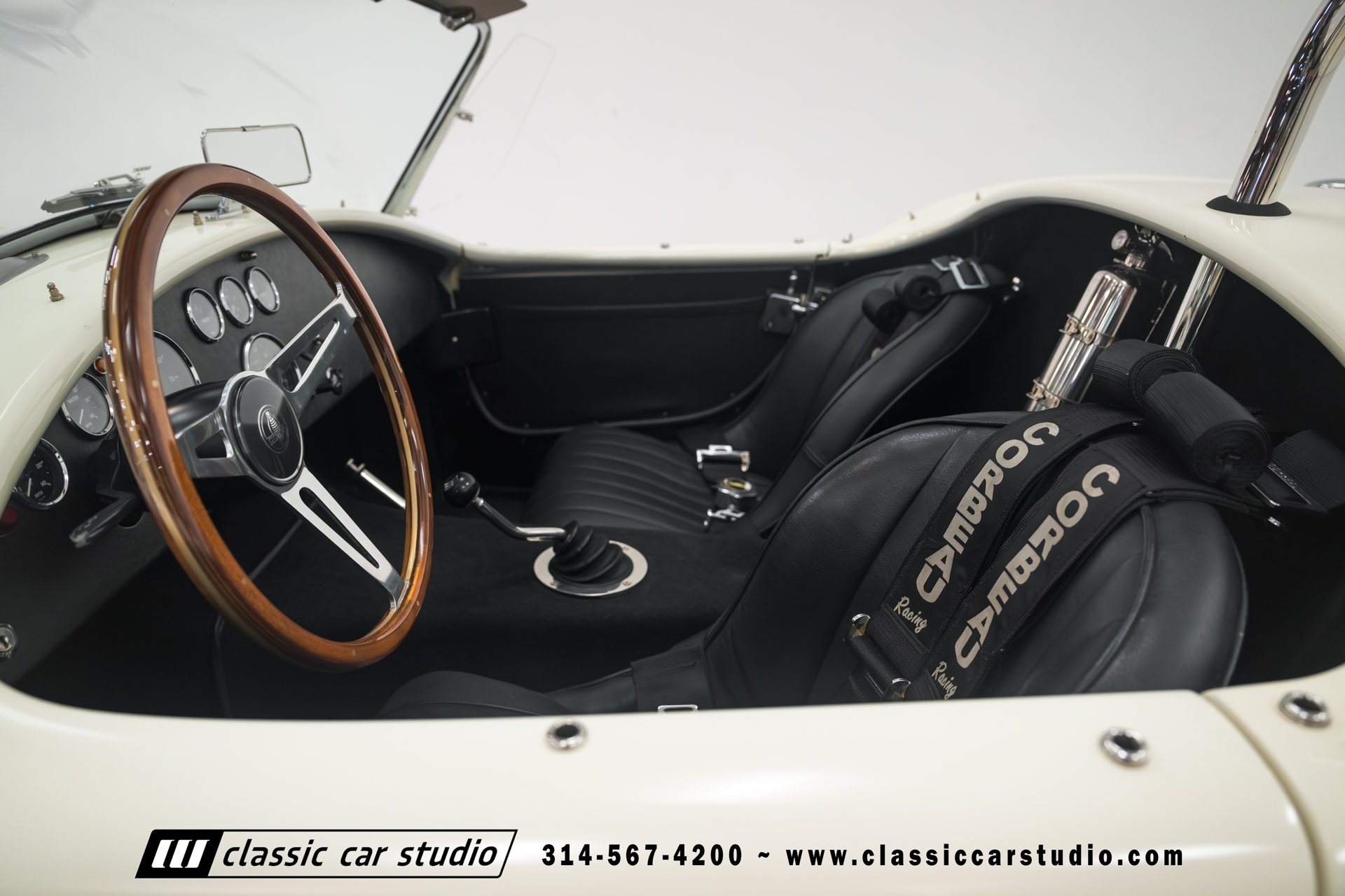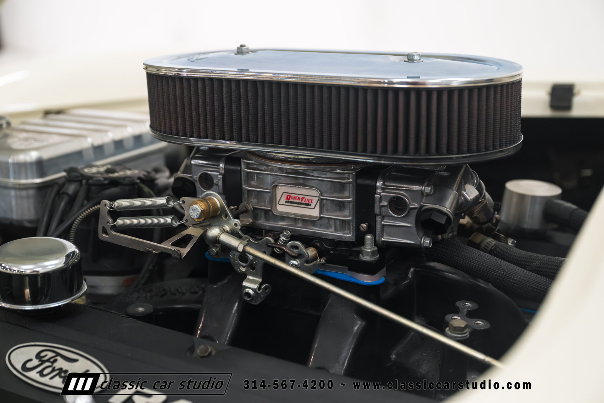 Under the hood sits a Keith Craft–built 427ci V8, featuring a Quick Fuel carburetor, Edelbrock intake manifold, AFR aluminum cylinder heads, MSD ignition, and Ford Racing valve covers. Power is sent through a five-speed manual transmission, offering an engaging driving experience with plenty of torque on tap. The side-exit exhaust gives this roadster an unmistakable, aggressive sound.