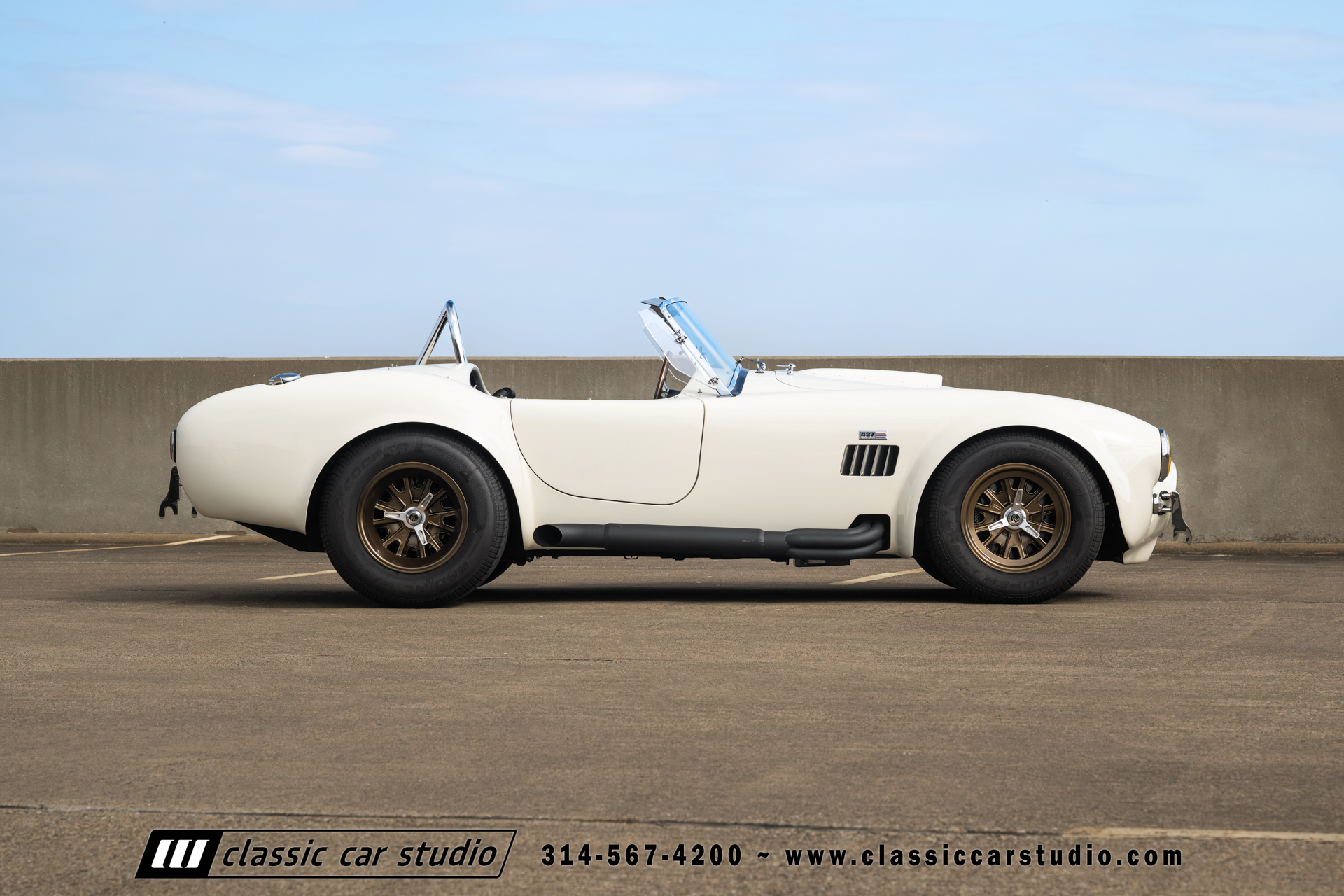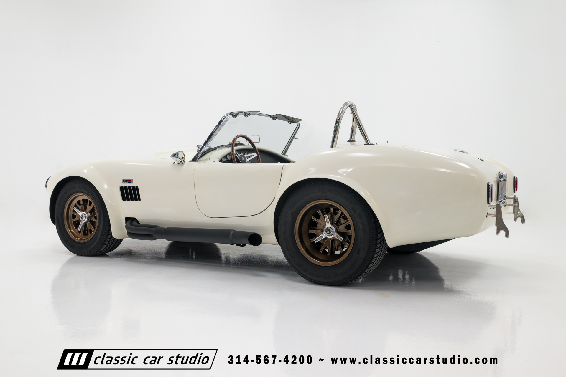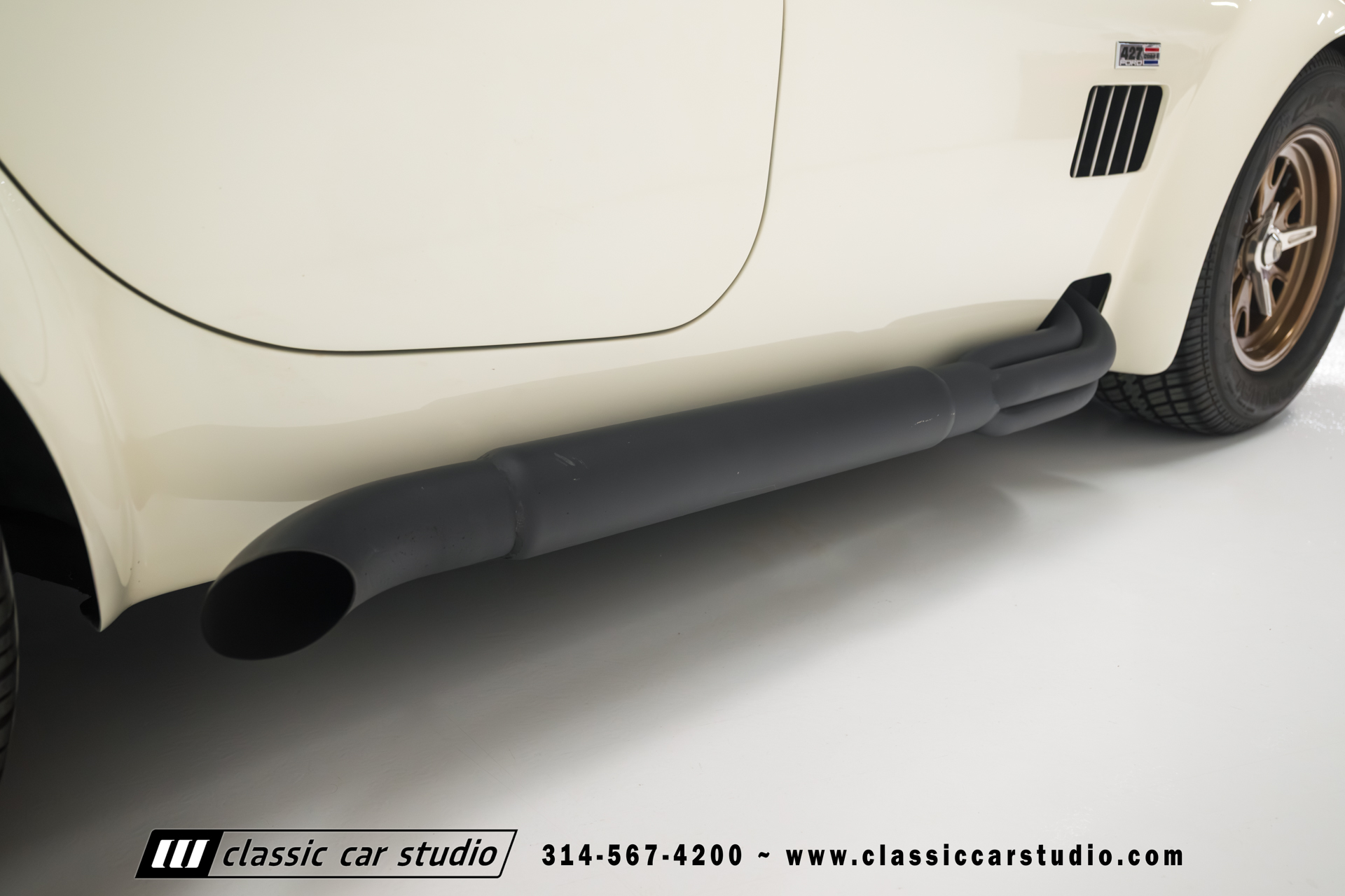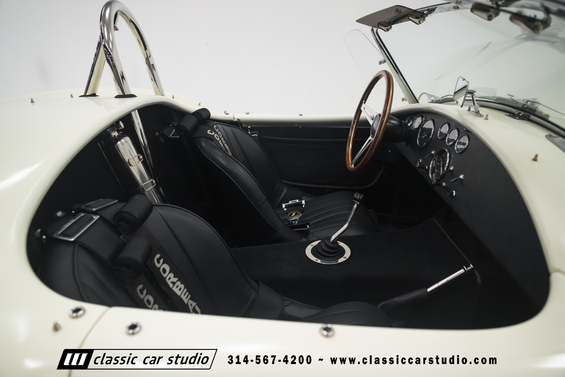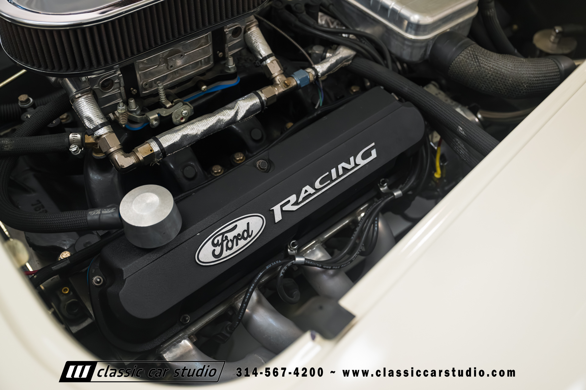 Under the hood sits a Keith Craft–built 427ci V8, featuring a Quick Fuel carburetor, Edelbrock intake manifold, AFR aluminum cylinder heads, MSD ignition, and Ford Racing valve covers. Power is sent through a five-speed manual transmission, offering an engaging driving experience with plenty of torque on tap. The side-exit exhaust gives this roadster an unmistakable, aggressive sound.