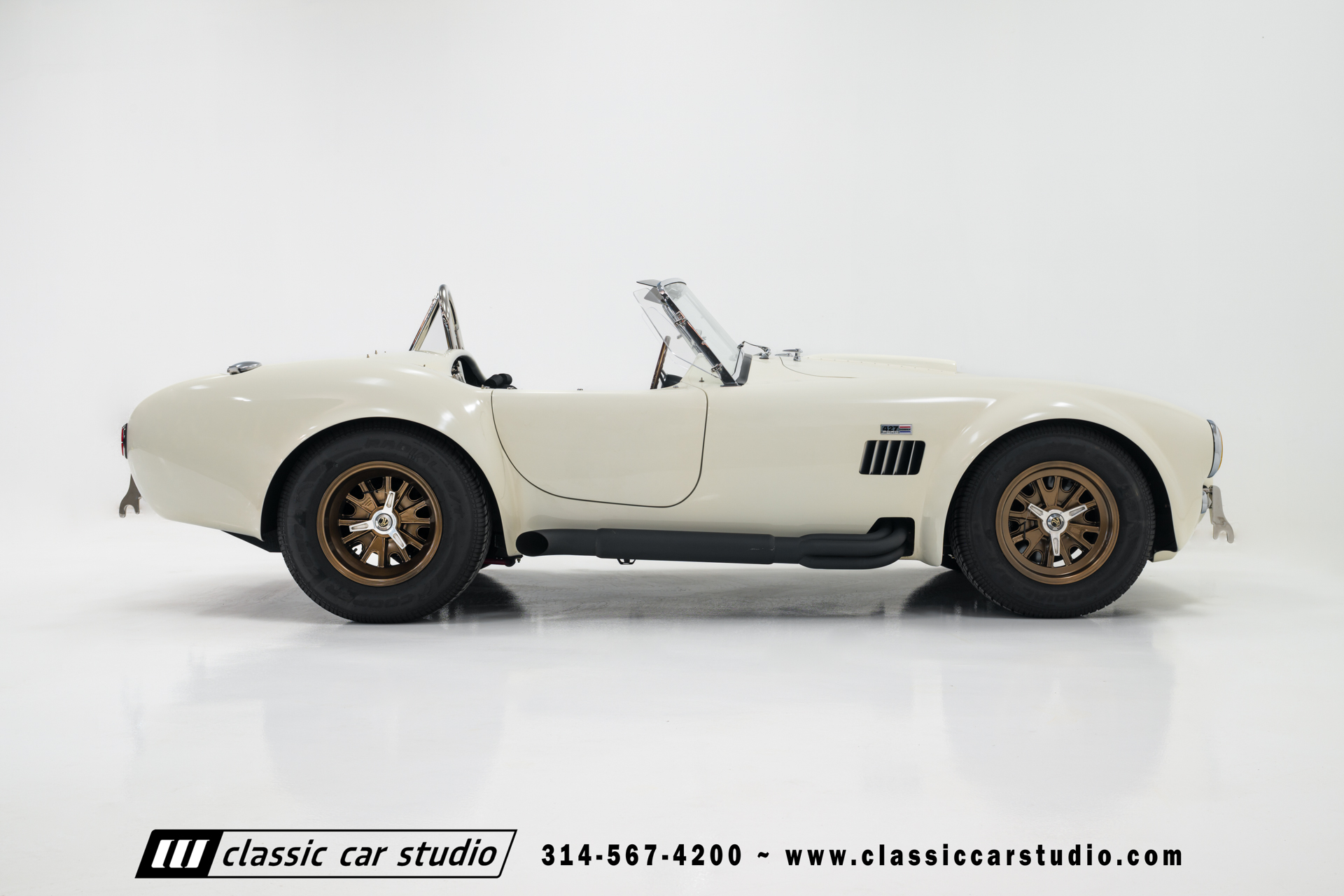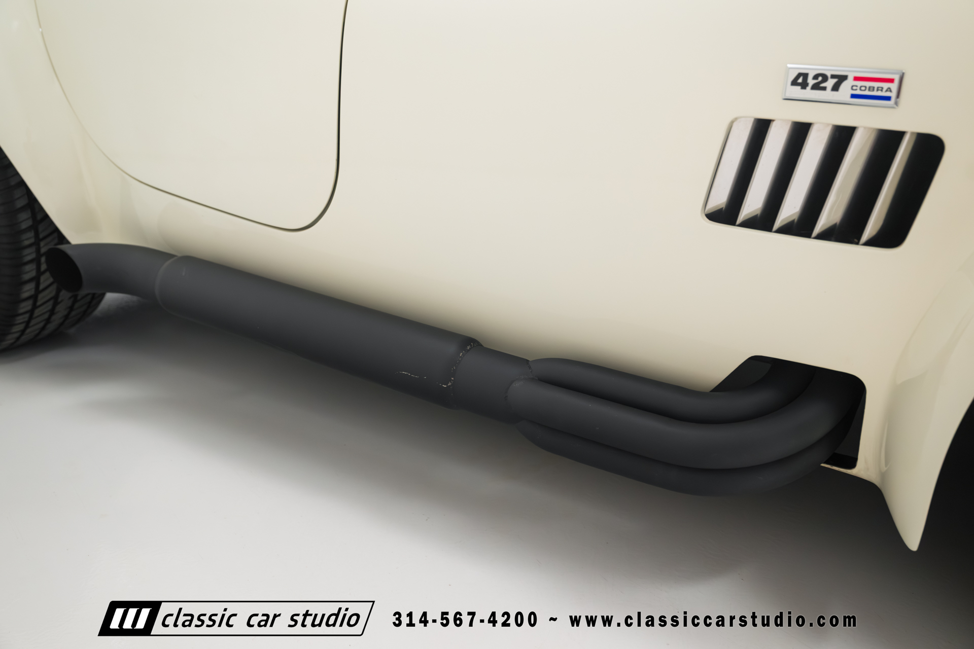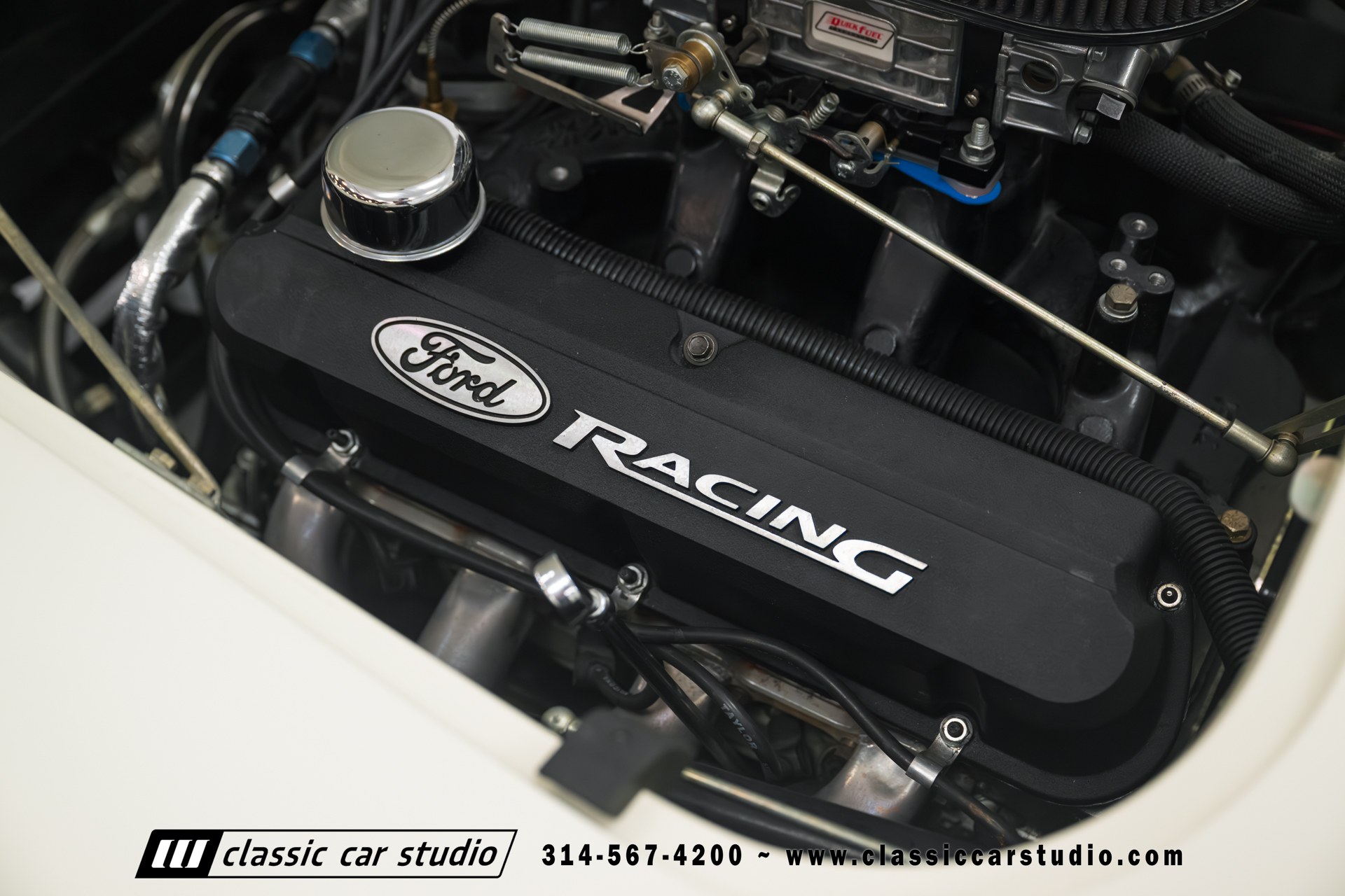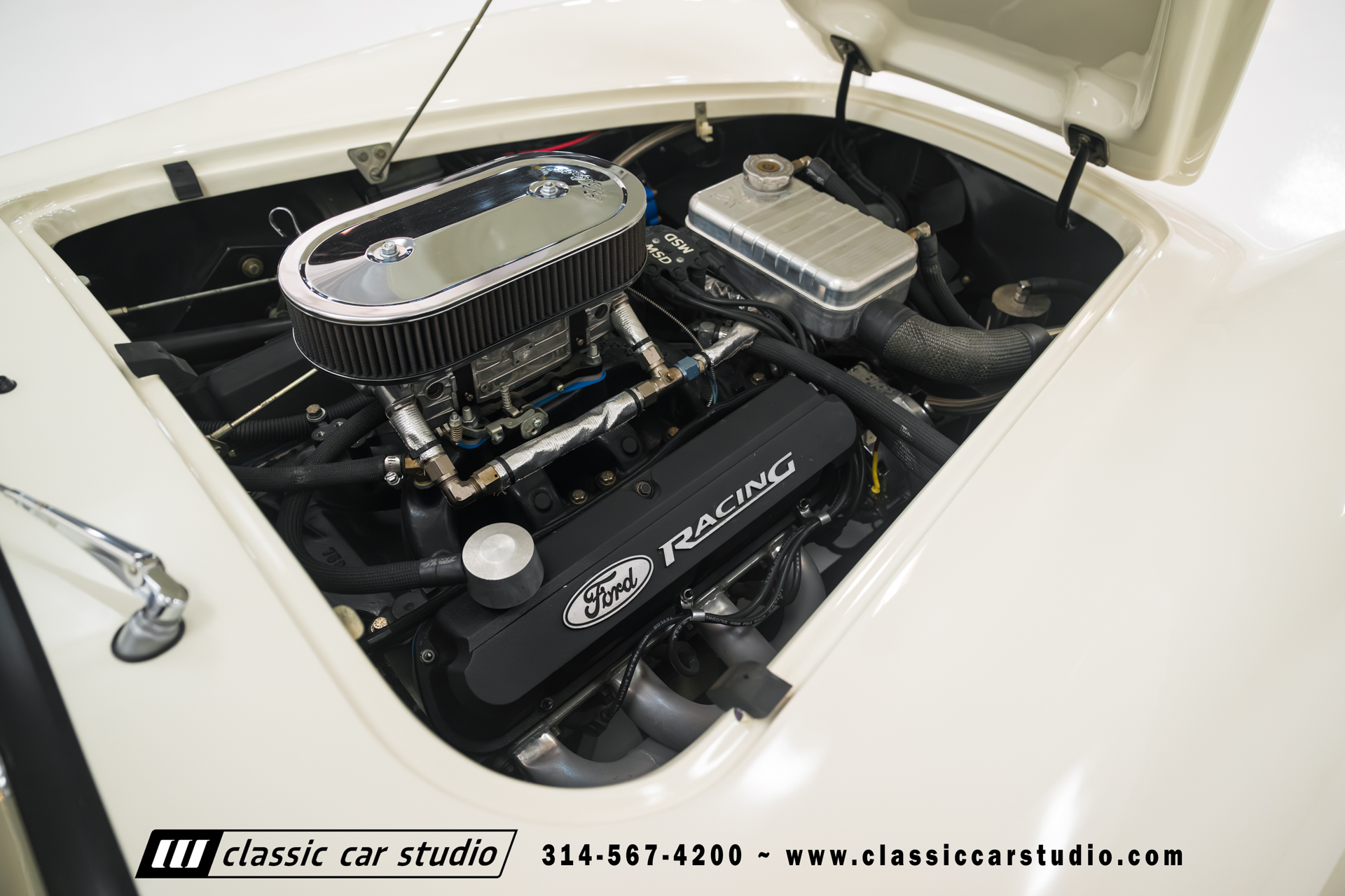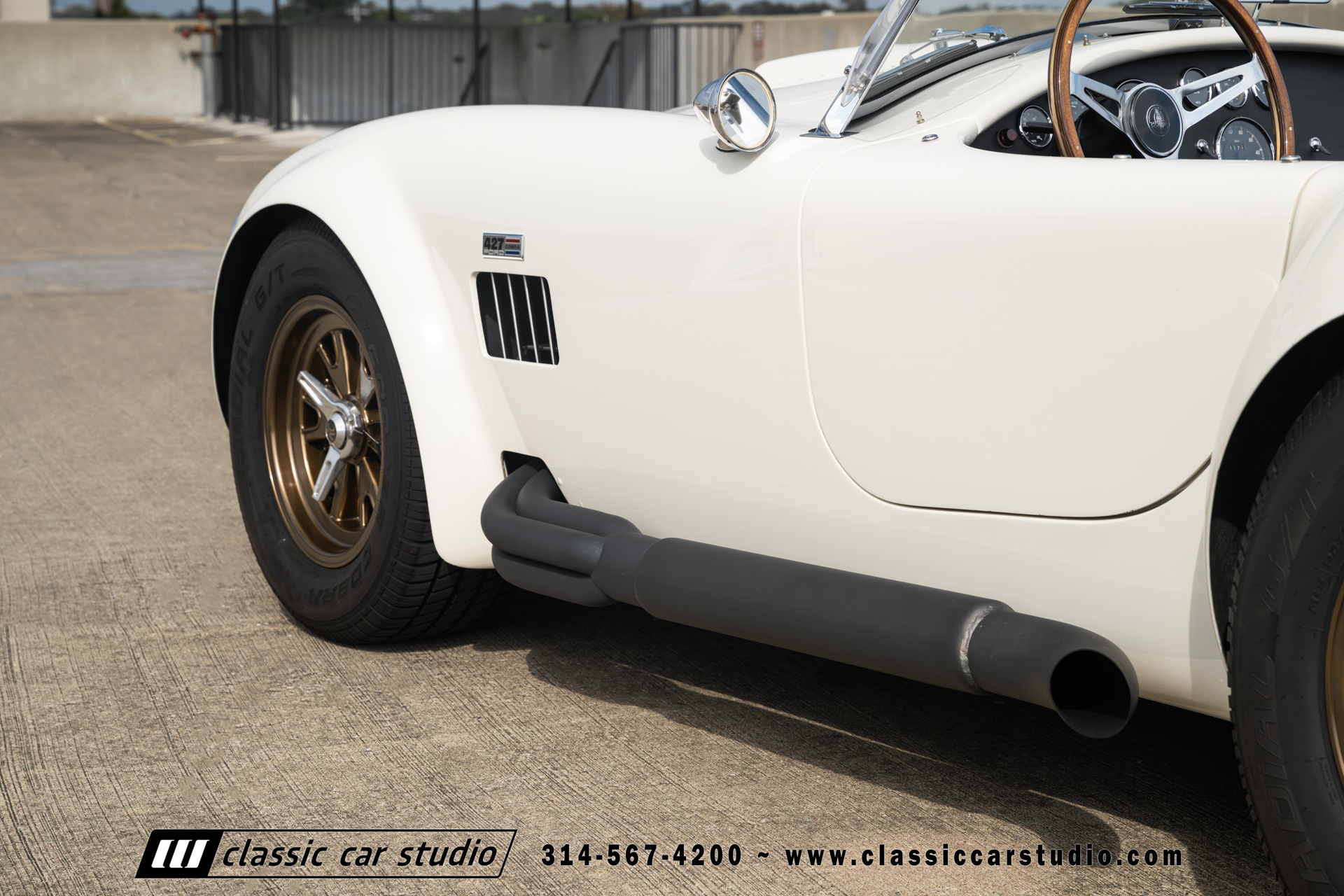 Under the hood sits a Keith Craft–built 427ci V8, featuring a Quick Fuel carburetor, Edelbrock intake manifold, AFR aluminum cylinder heads, MSD ignition, and Ford Racing valve covers. Power is sent through a five-speed manual transmission, offering an engaging driving experience with plenty of torque on tap. The side-exit exhaust gives this roadster an unmistakable, aggressive sound.