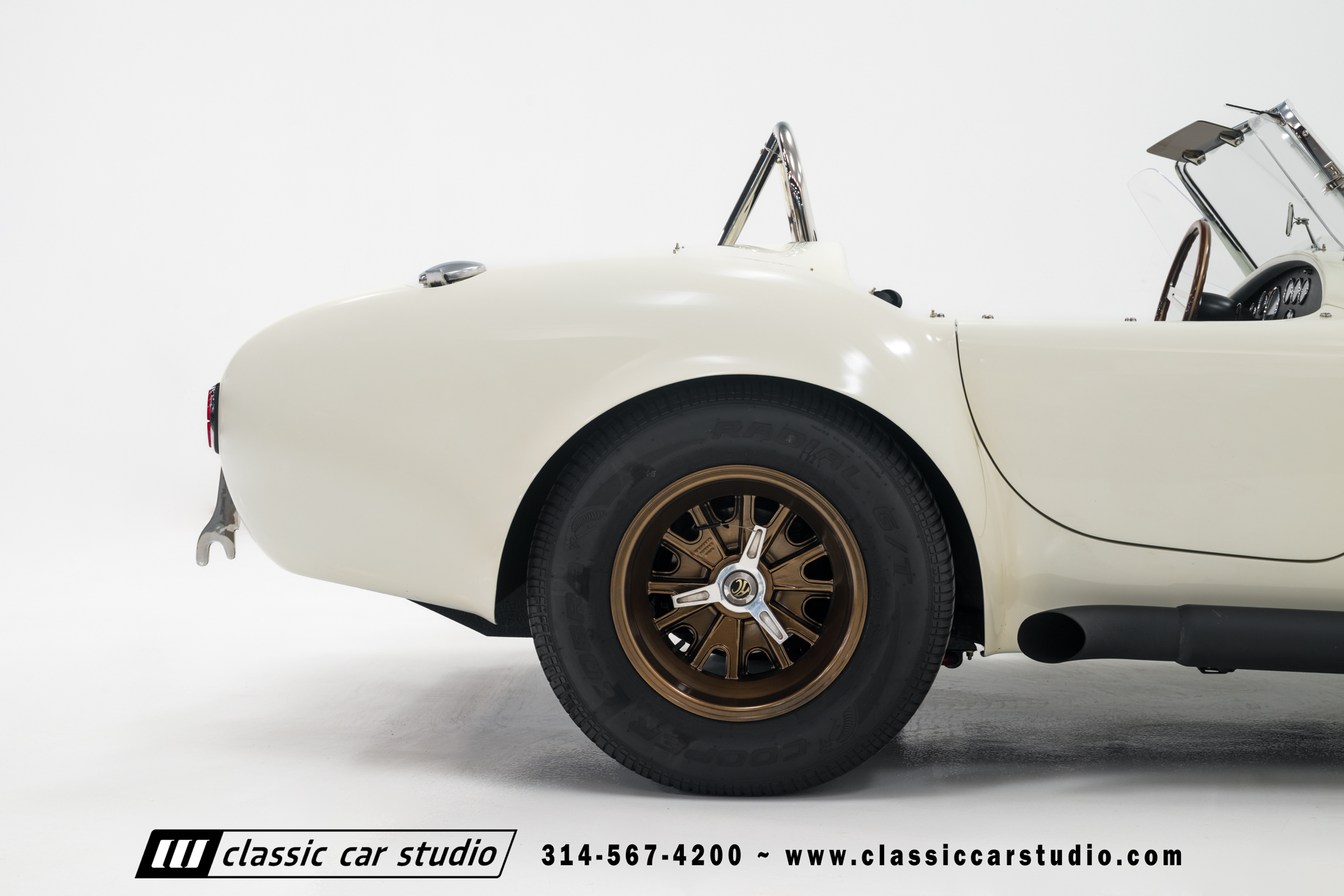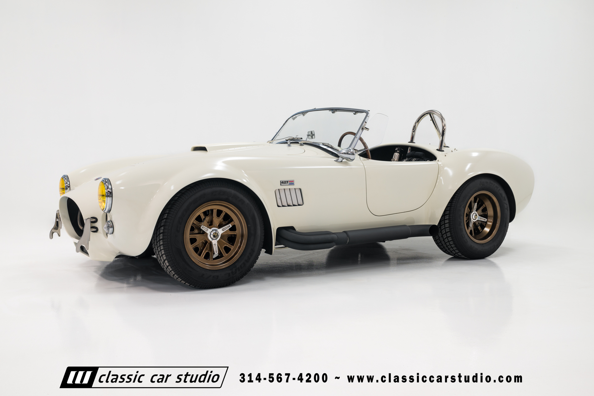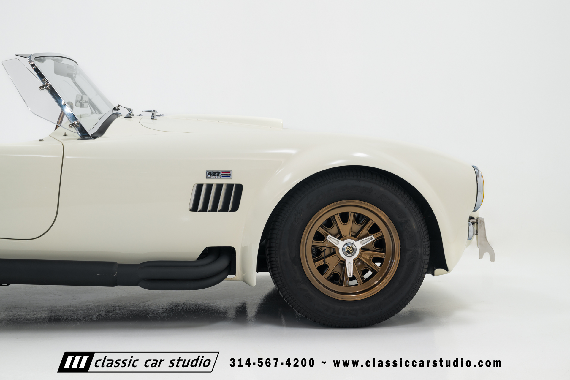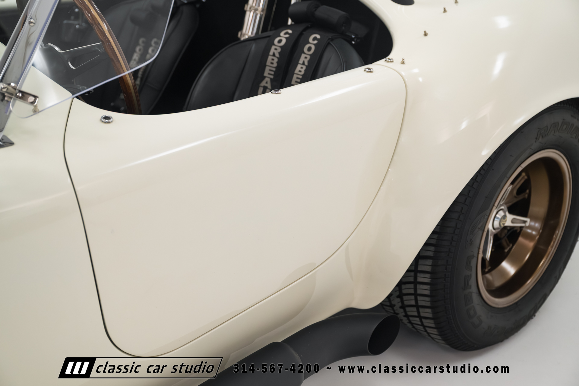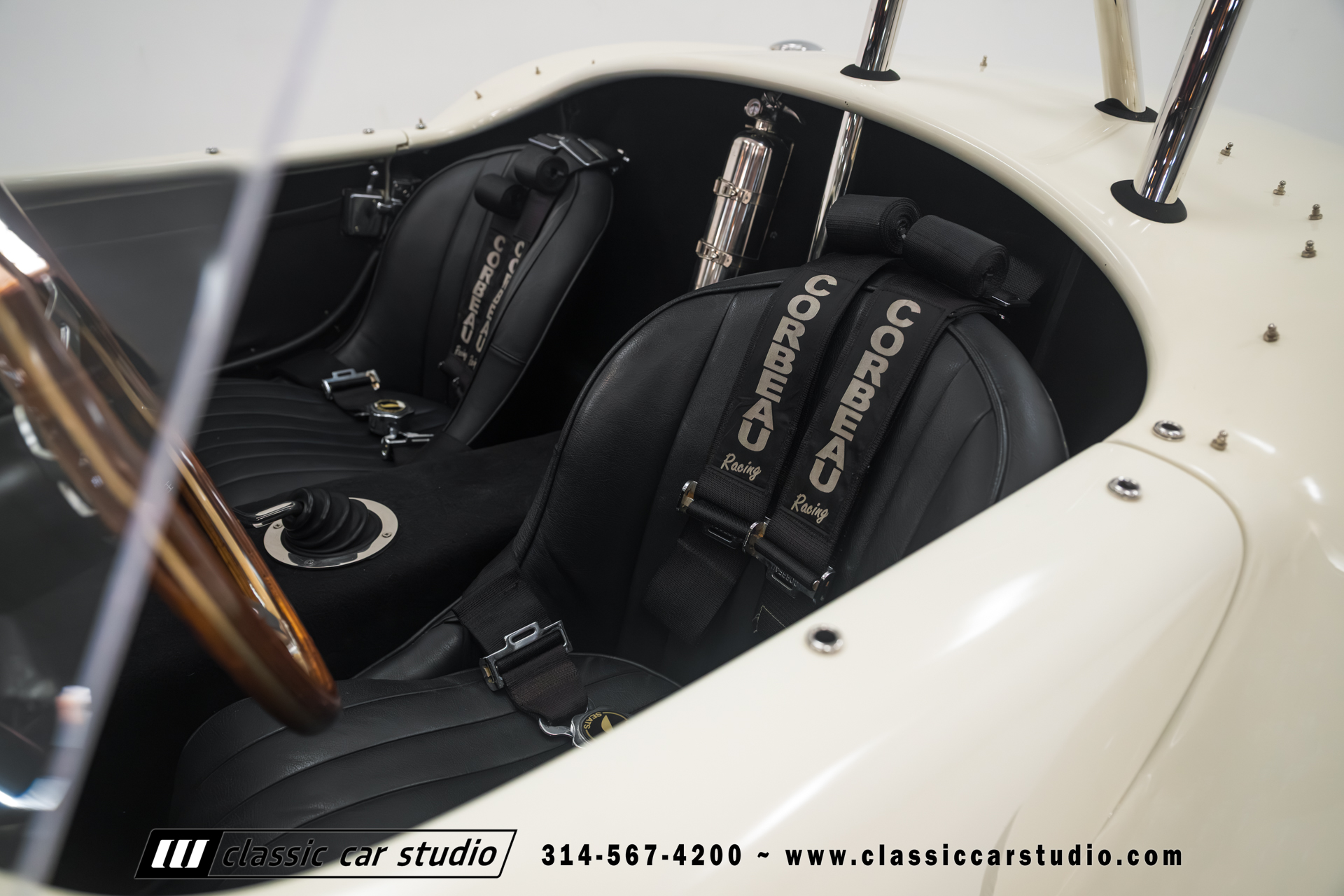 Under the hood sits a Keith Craft–built 427ci V8, featuring a Quick Fuel carburetor, Edelbrock intake manifold, AFR aluminum cylinder heads, MSD ignition, and Ford Racing valve covers. Power is sent through a five-speed manual transmission, offering an engaging driving experience with plenty of torque on tap. The side-exit exhaust gives this roadster an unmistakable, aggressive sound.