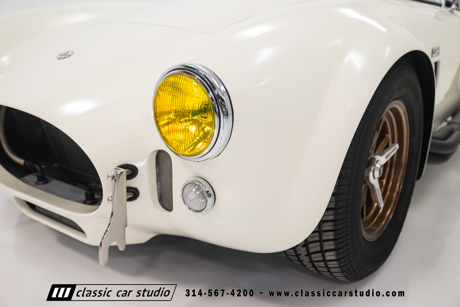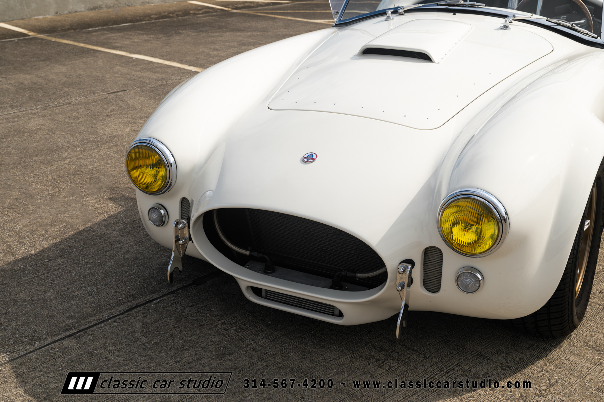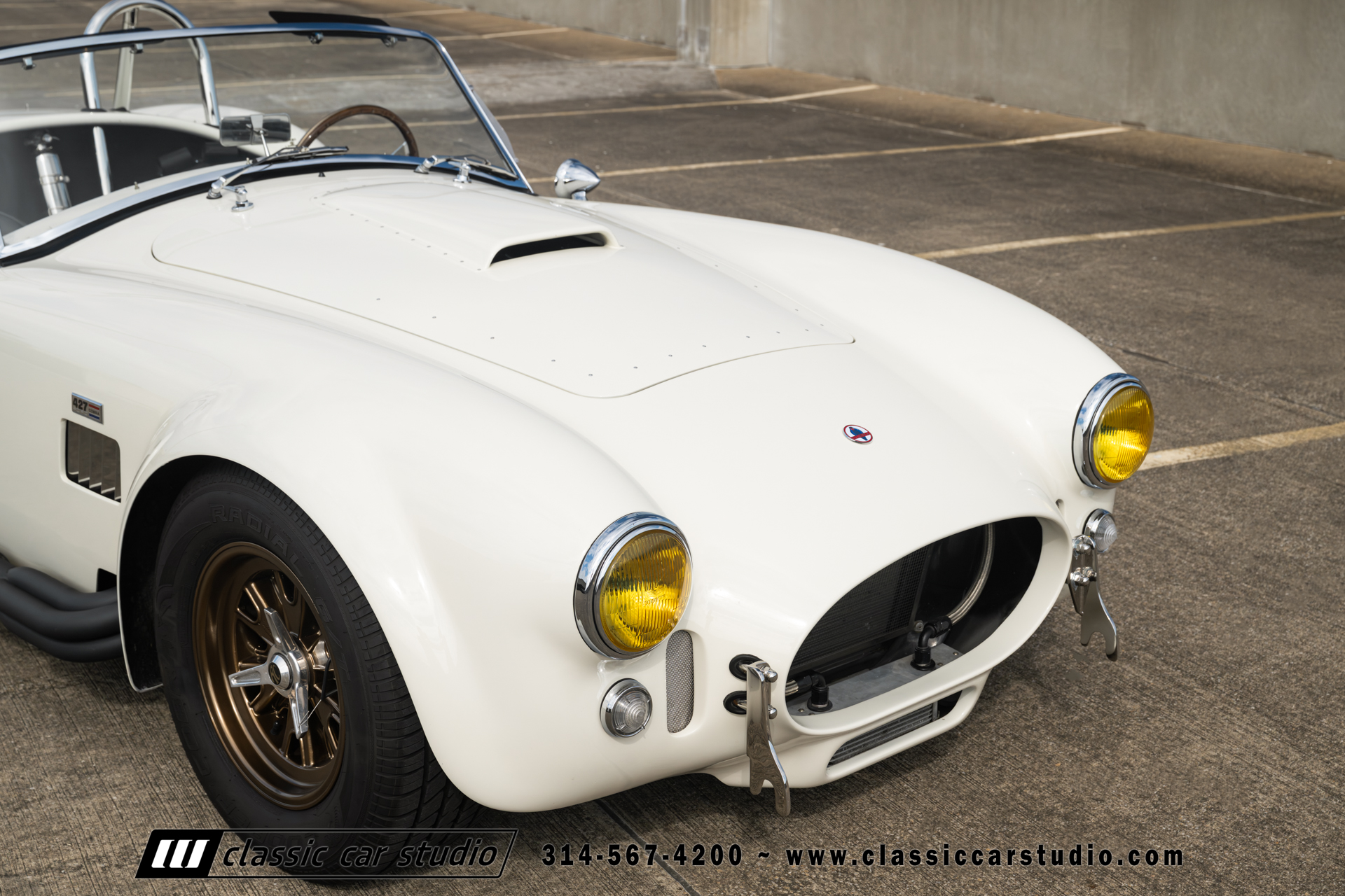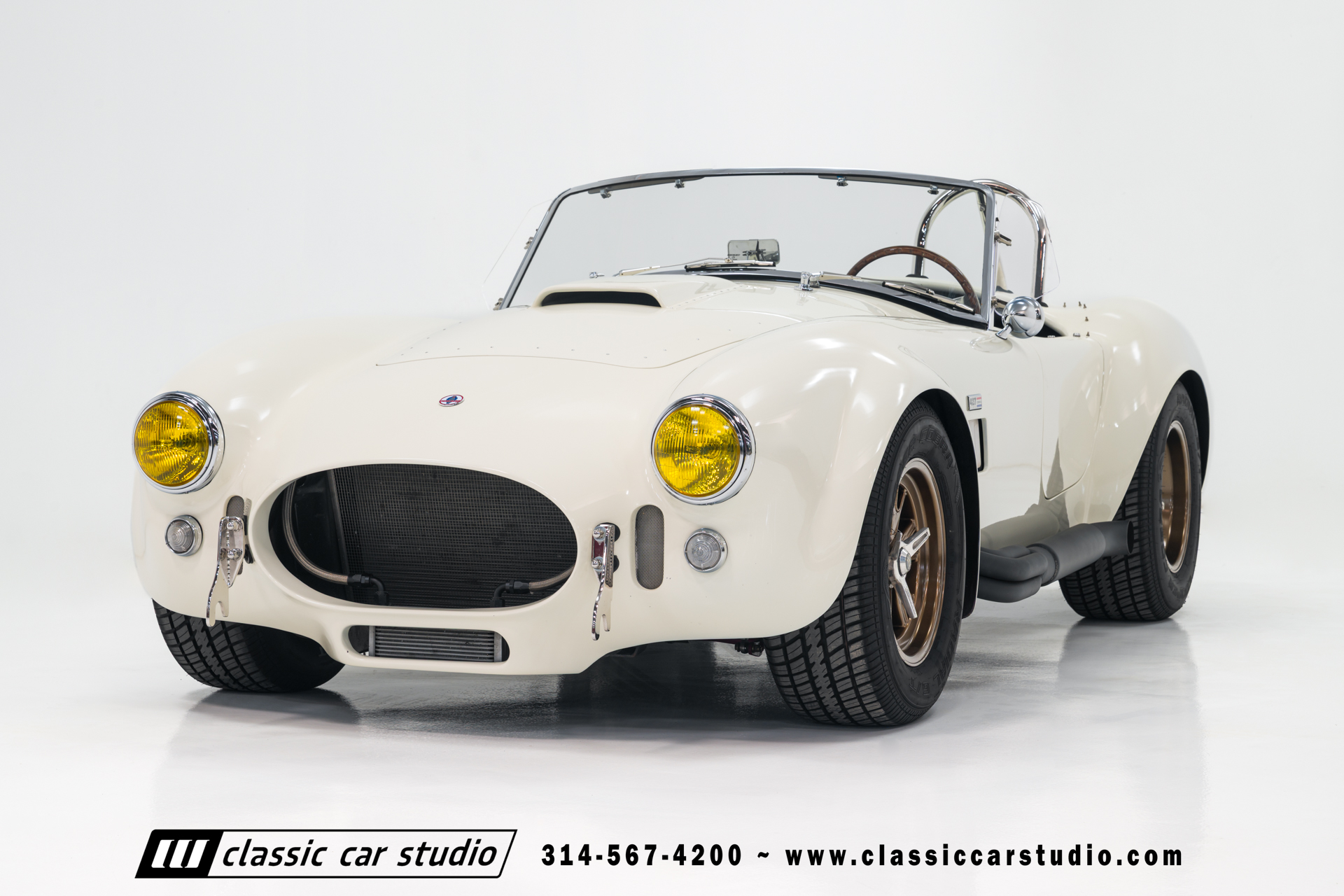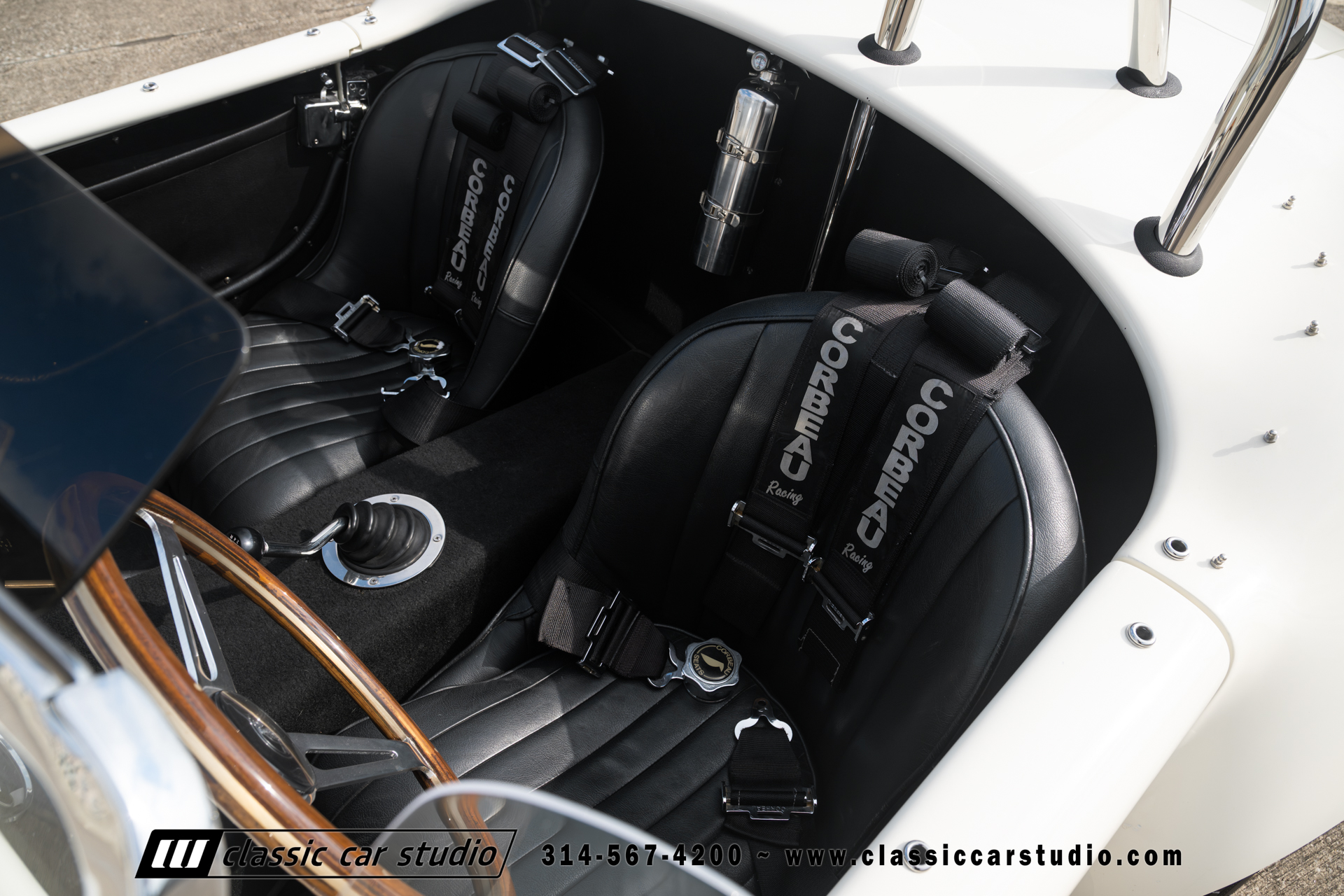 The fiberglass body is finished in gloss white and accented with yellow-lens headlights, quick-jack bumperettes, a roll hoop, wind wings, sun visors, and a functional hood scoop. The look is pure Cobra—muscular, purposeful, and ready for the open road.
