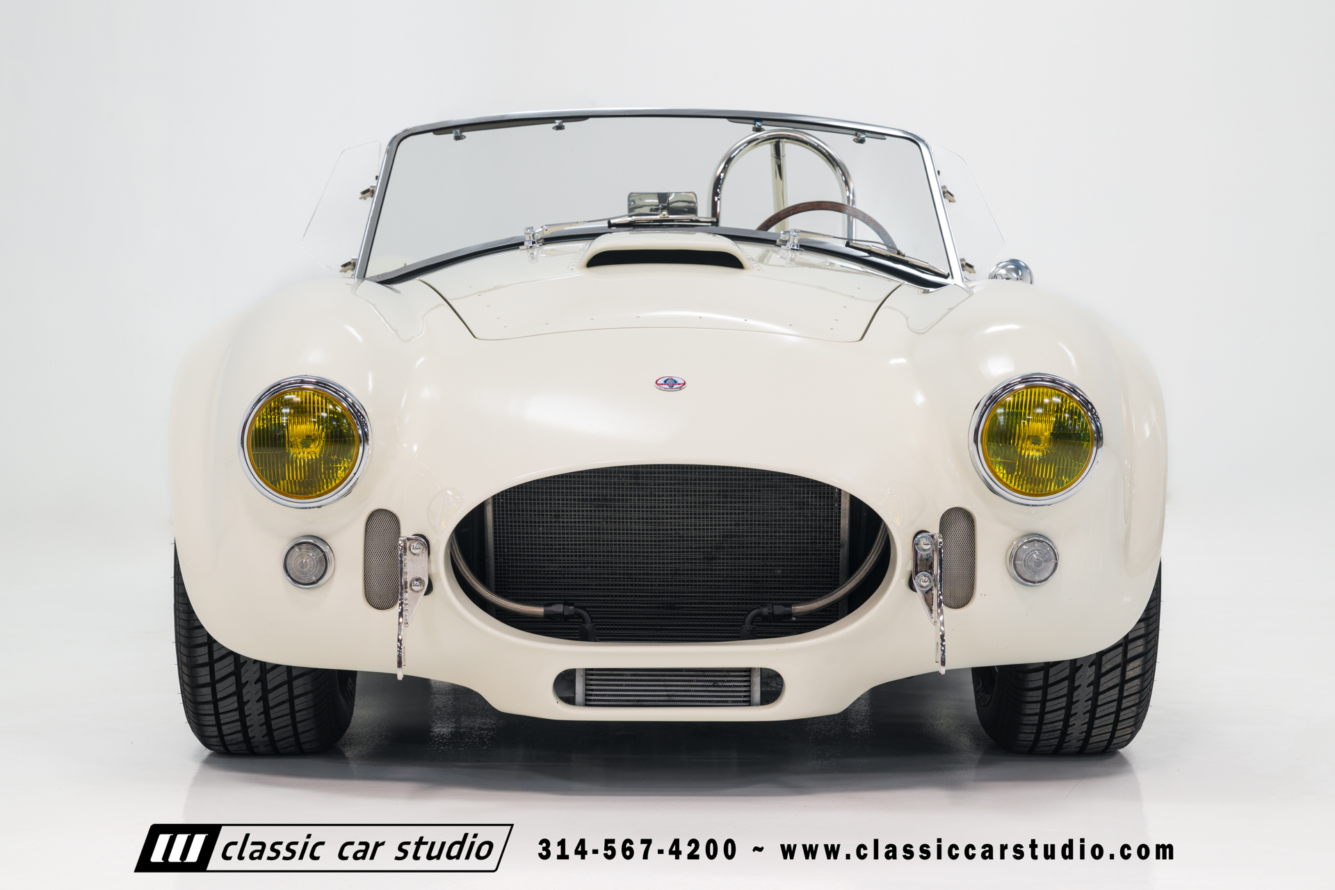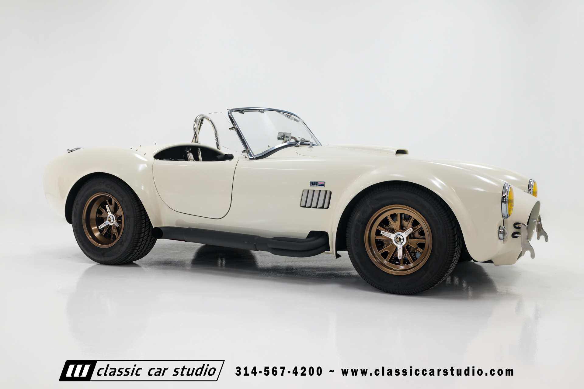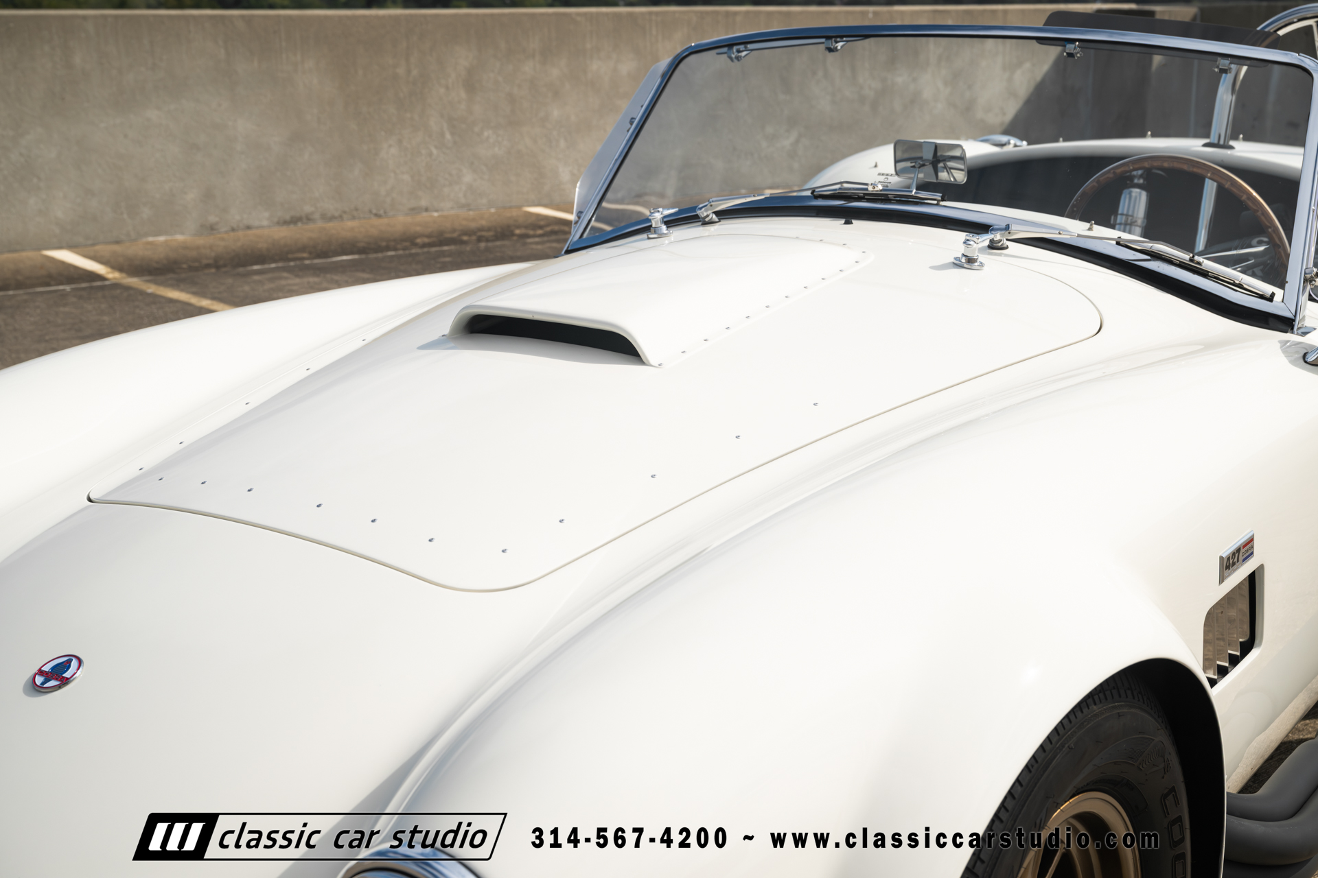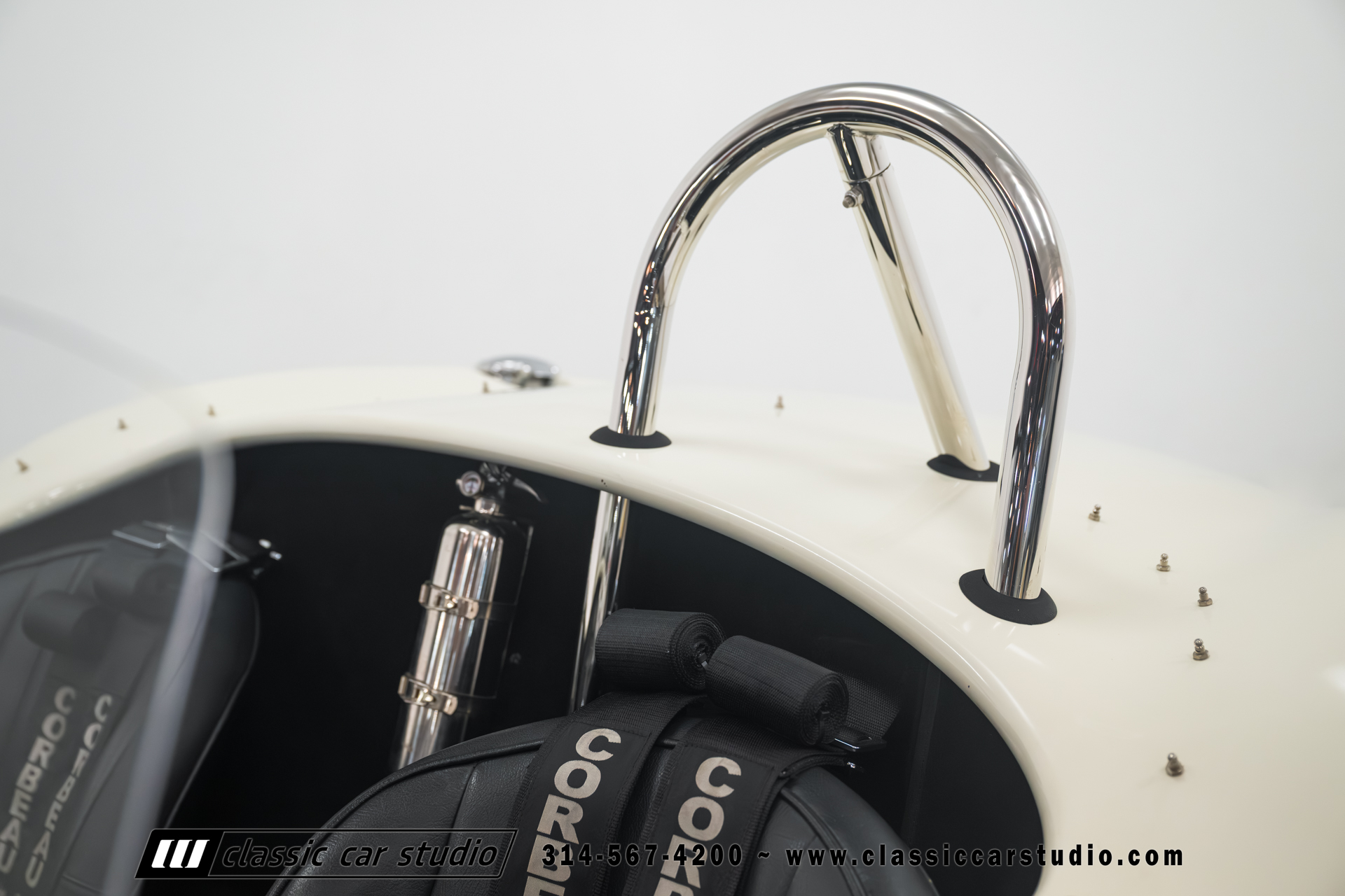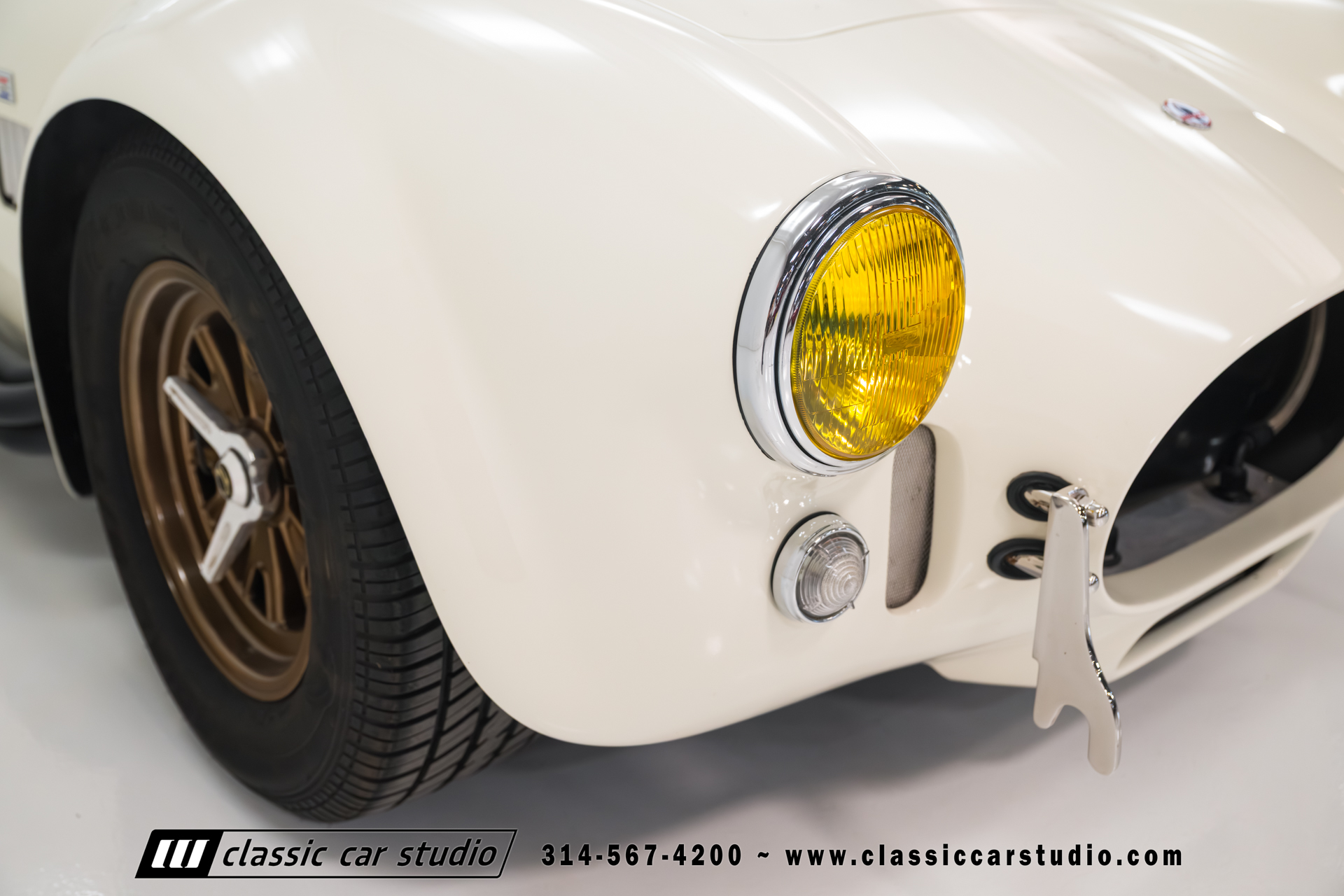 The fiberglass body is finished in gloss white and accented with yellow-lens headlights, quick-jack bumperettes, a roll hoop, wind wings, sun visors, and a functional hood scoop. The look is pure Cobra—muscular, purposeful, and ready for the open road.