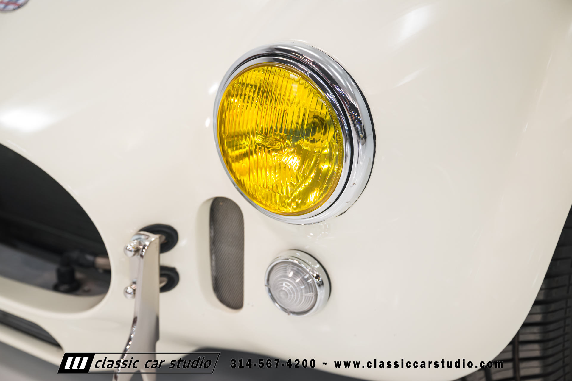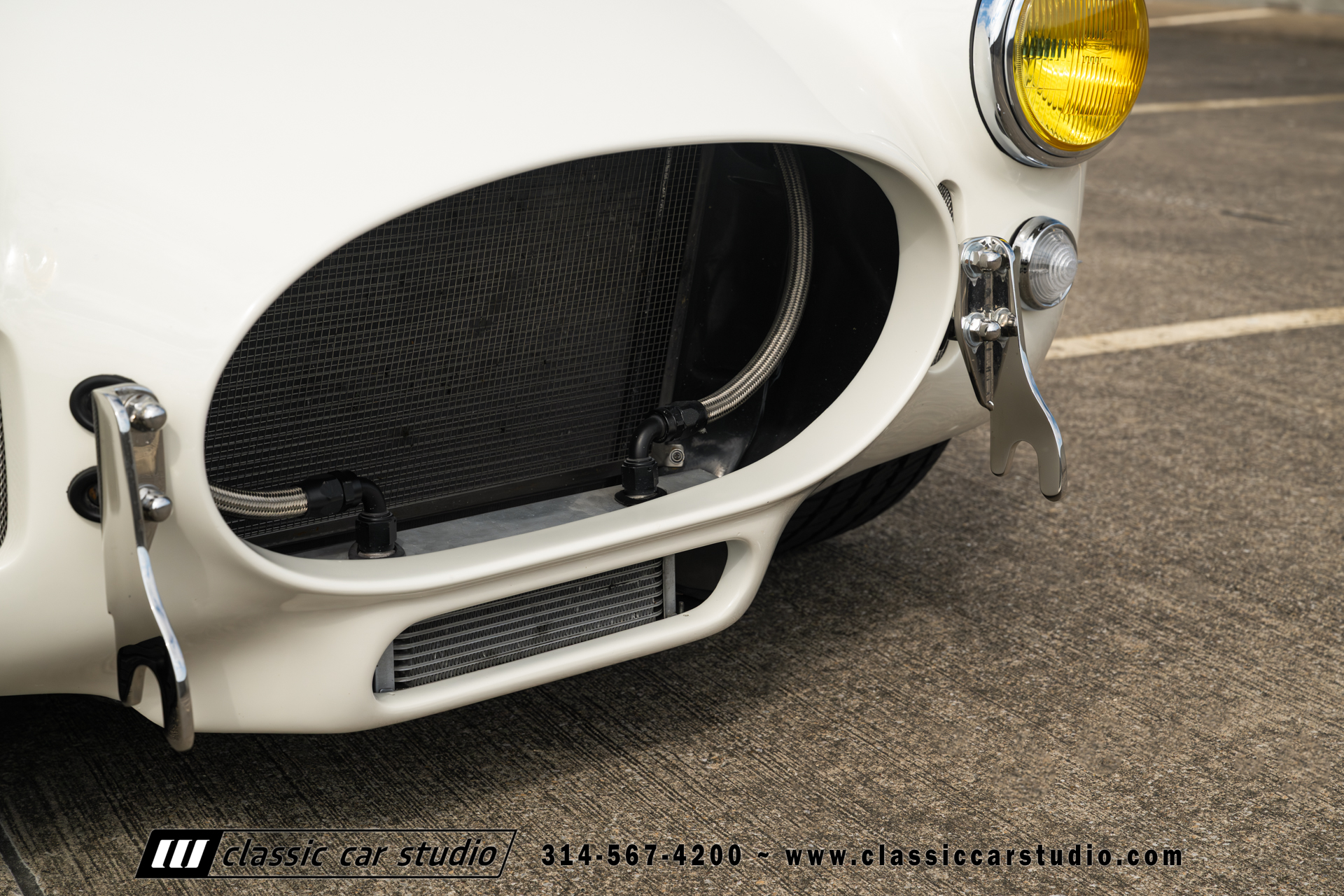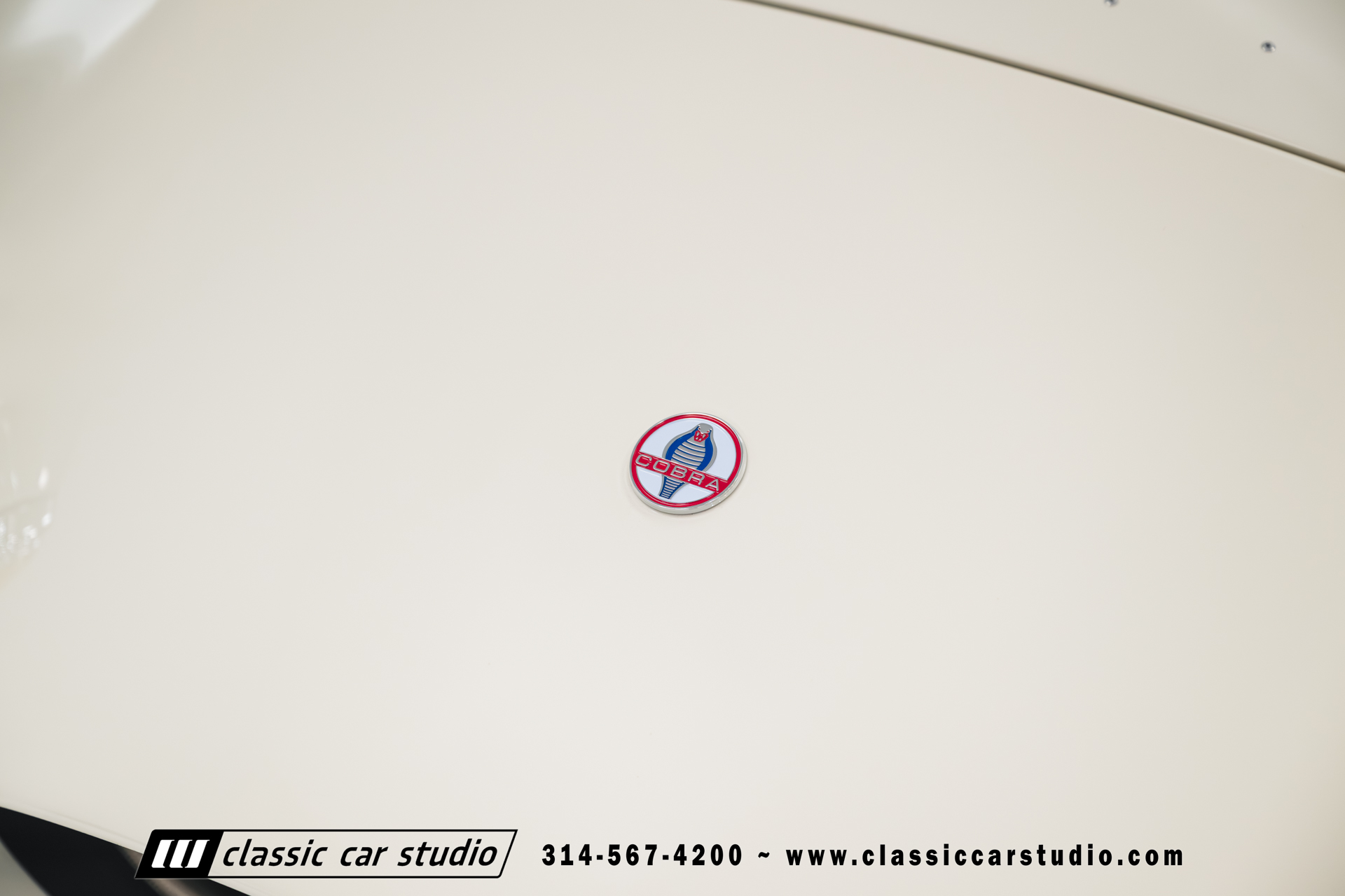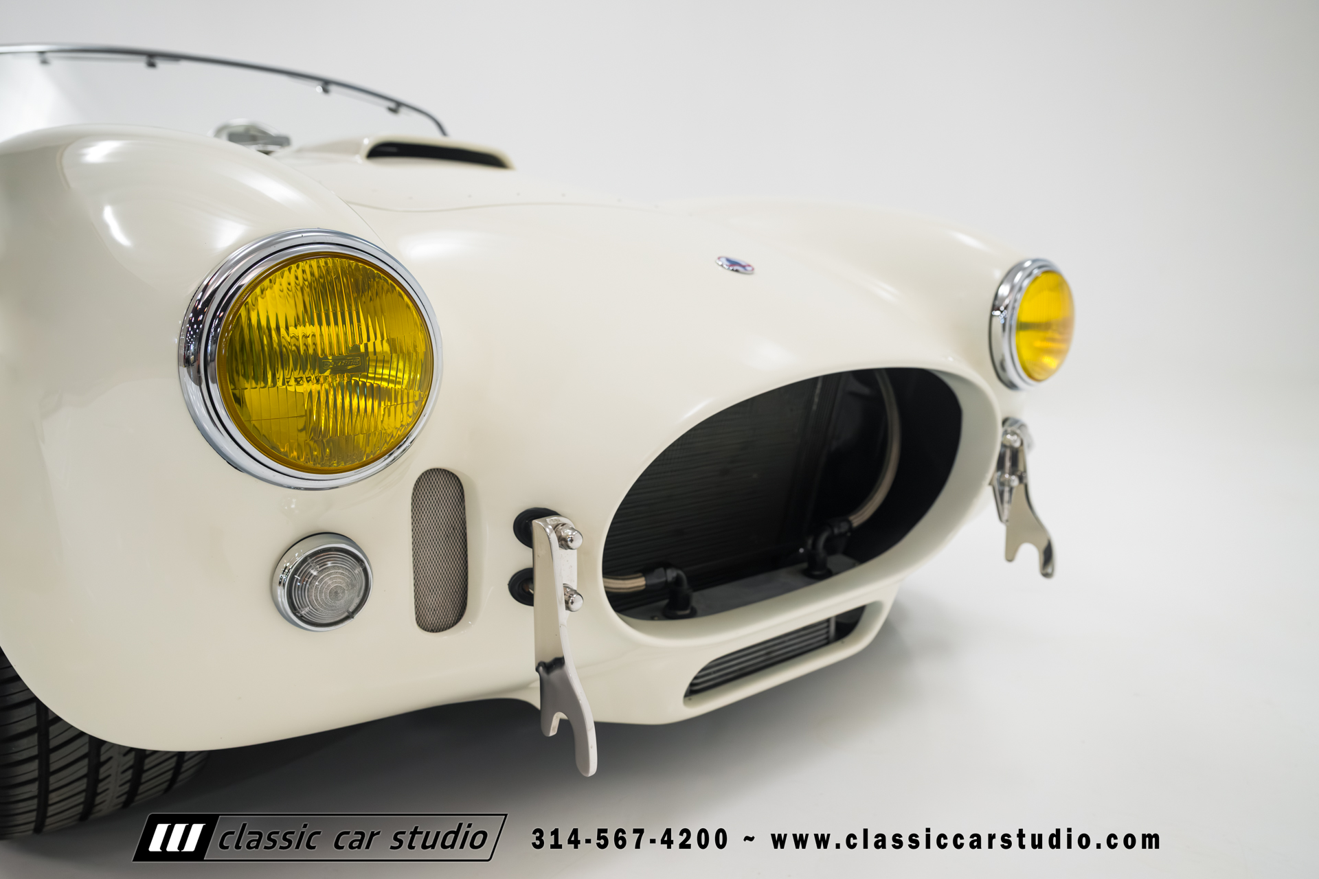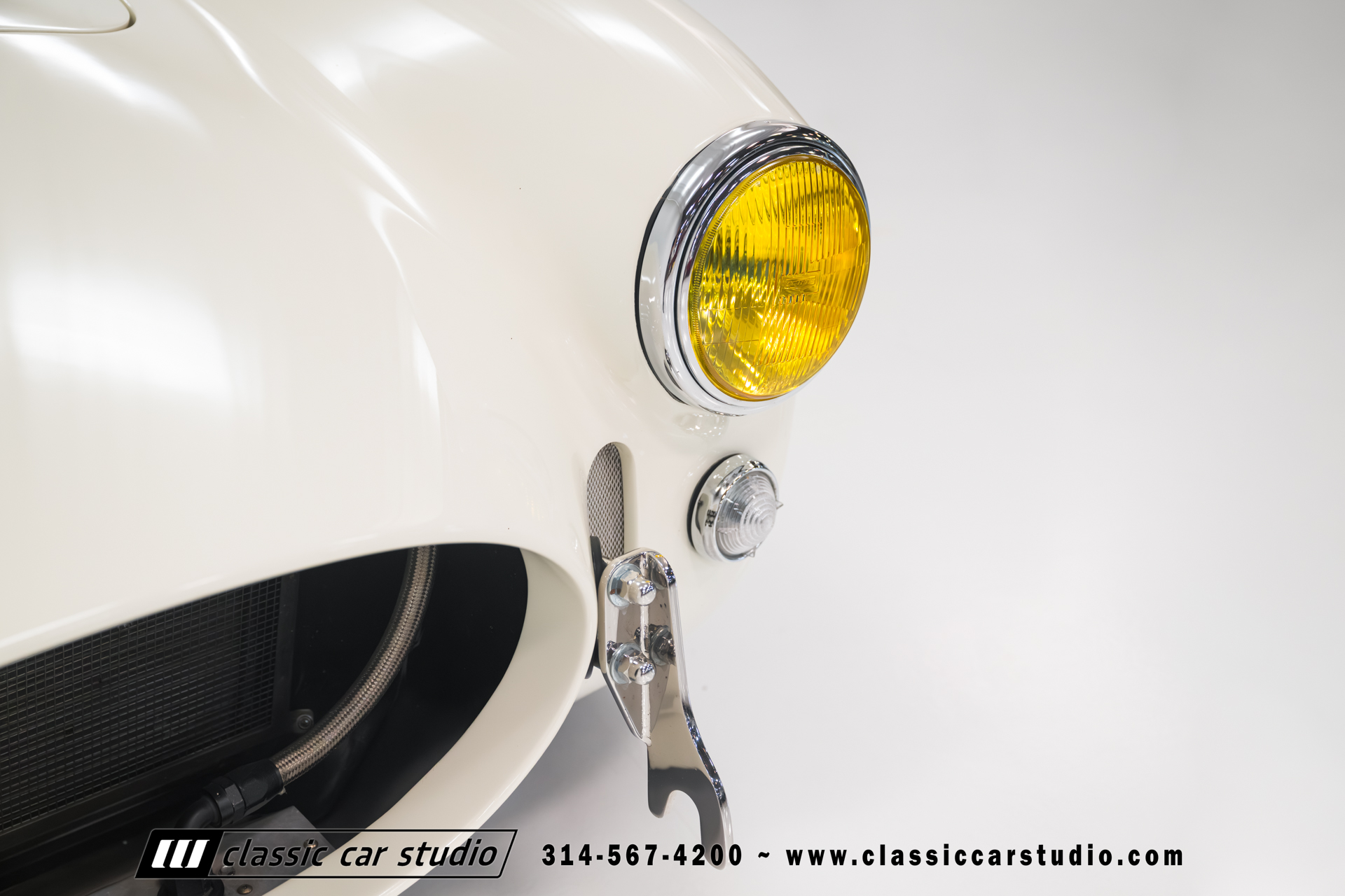The fiberglass body is finished in gloss white and accented with yellow-lens headlights, quick-jack bumperettes, a roll hoop, wind wings, sun visors, and a functional hood scoop. The look is pure Cobra—muscular, purposeful, and ready for the open road.