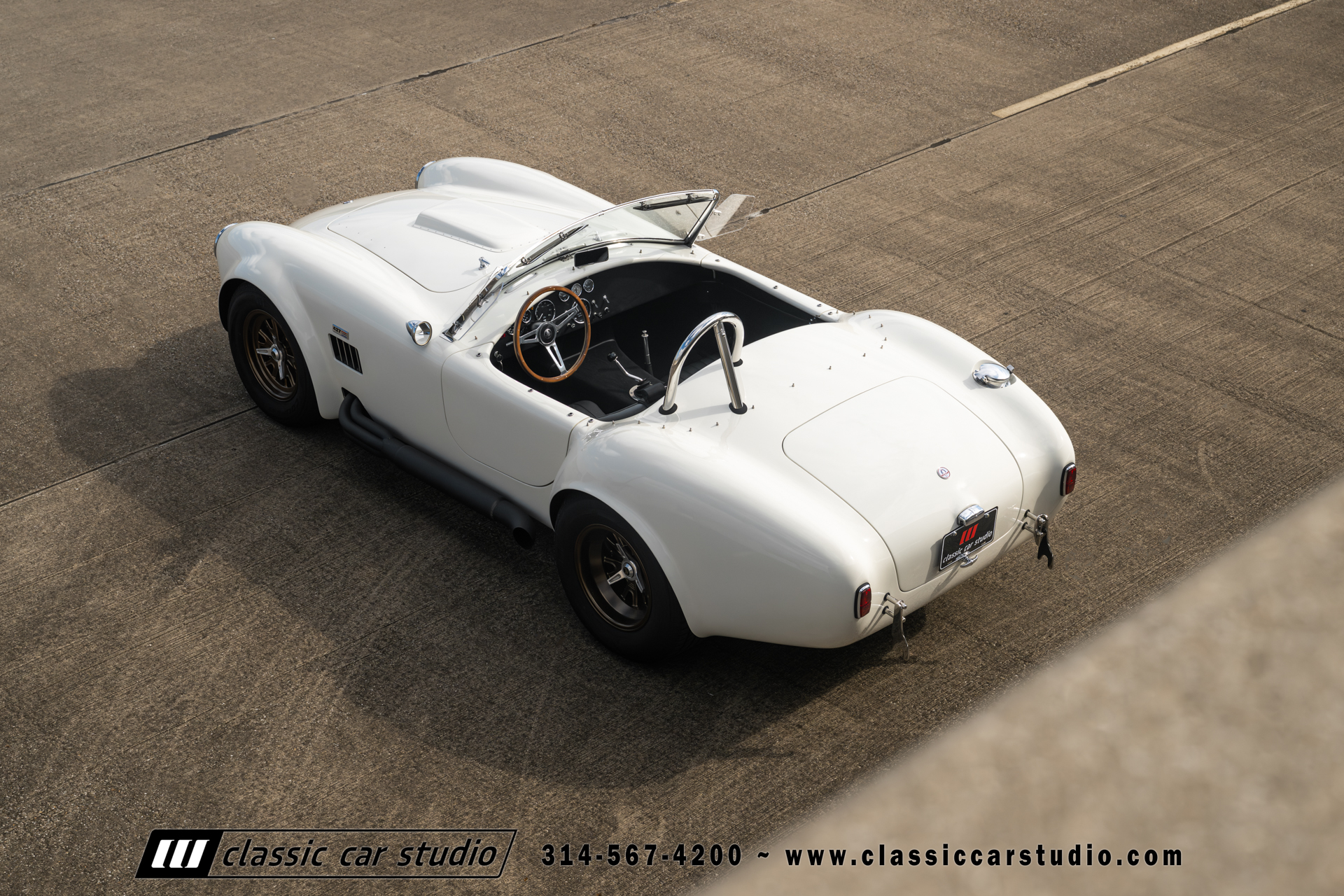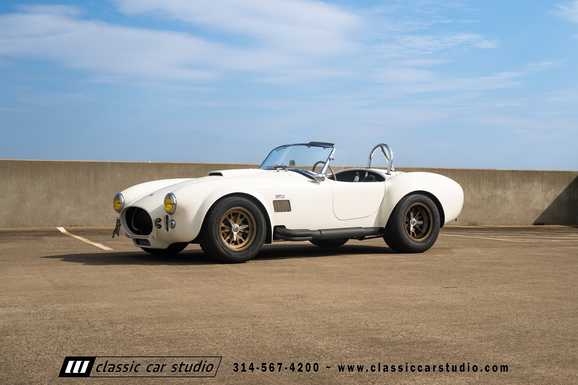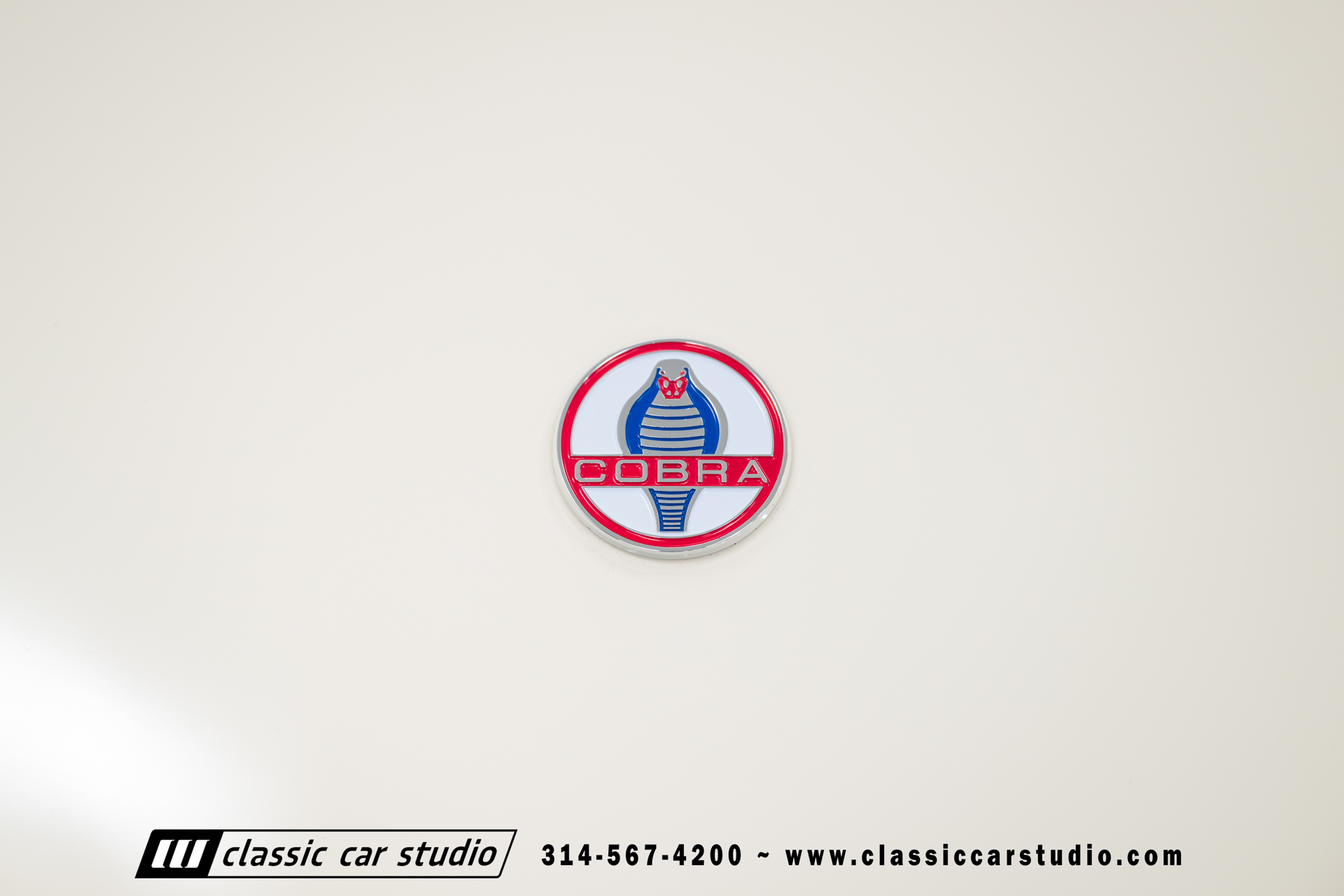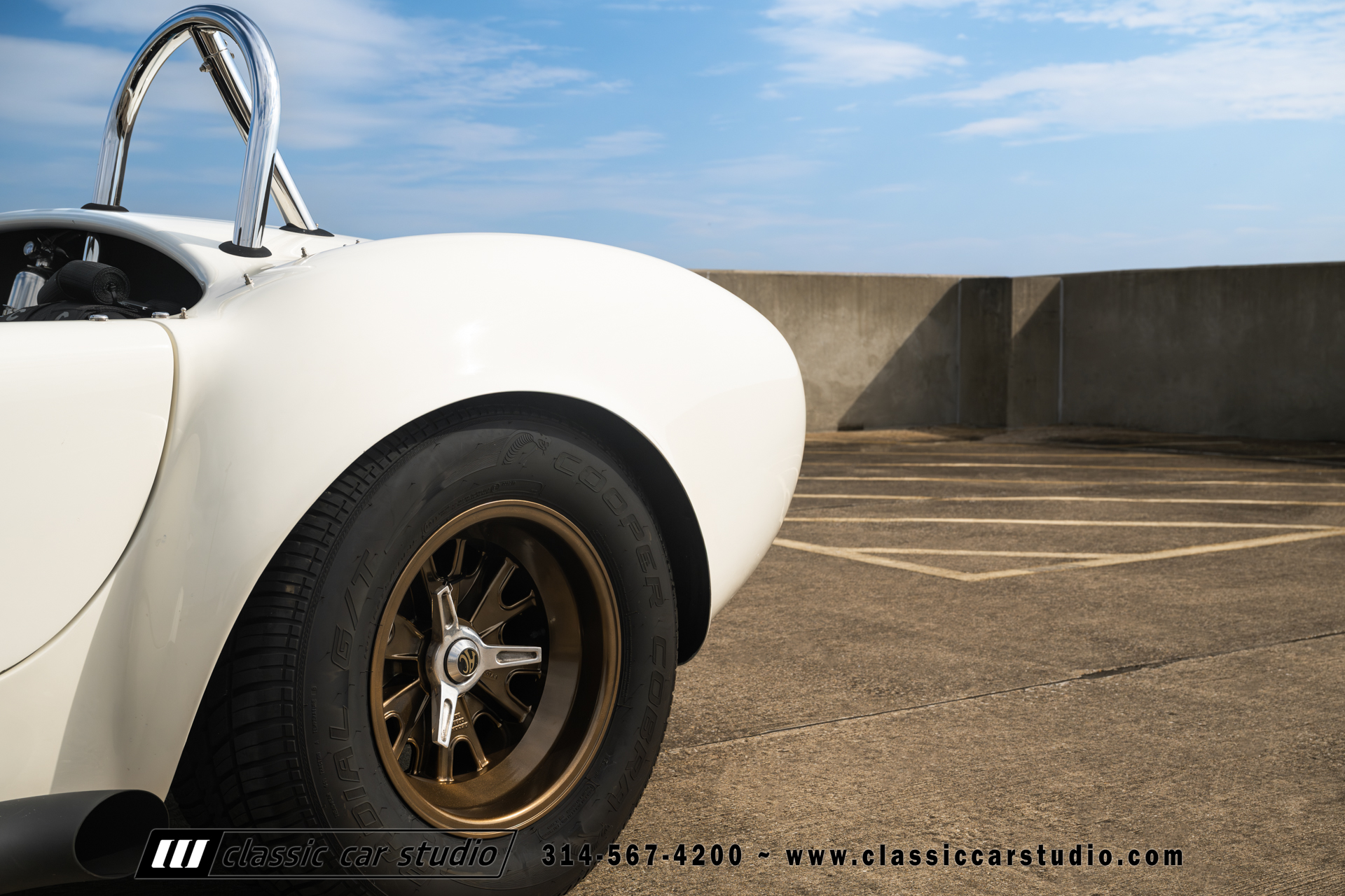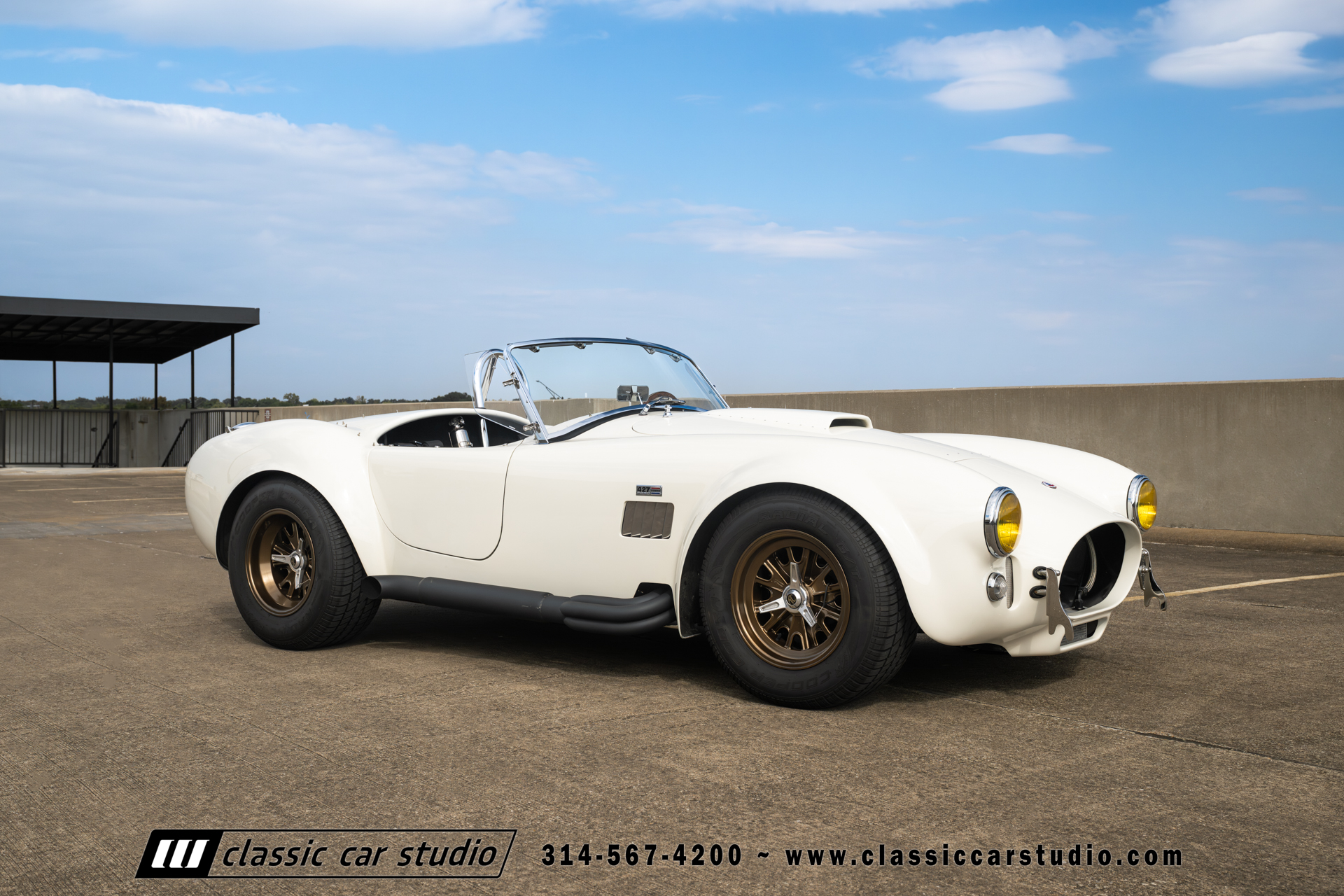The fiberglass body is finished in gloss white and accented with yellow-lens headlights, quick-jack bumperettes, a roll hoop, wind wings, sun visors, and a functional hood scoop. The look is pure Cobra—muscular, purposeful, and ready for the open road.