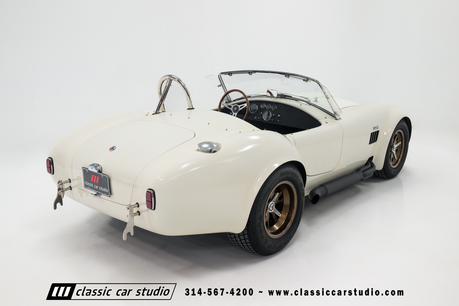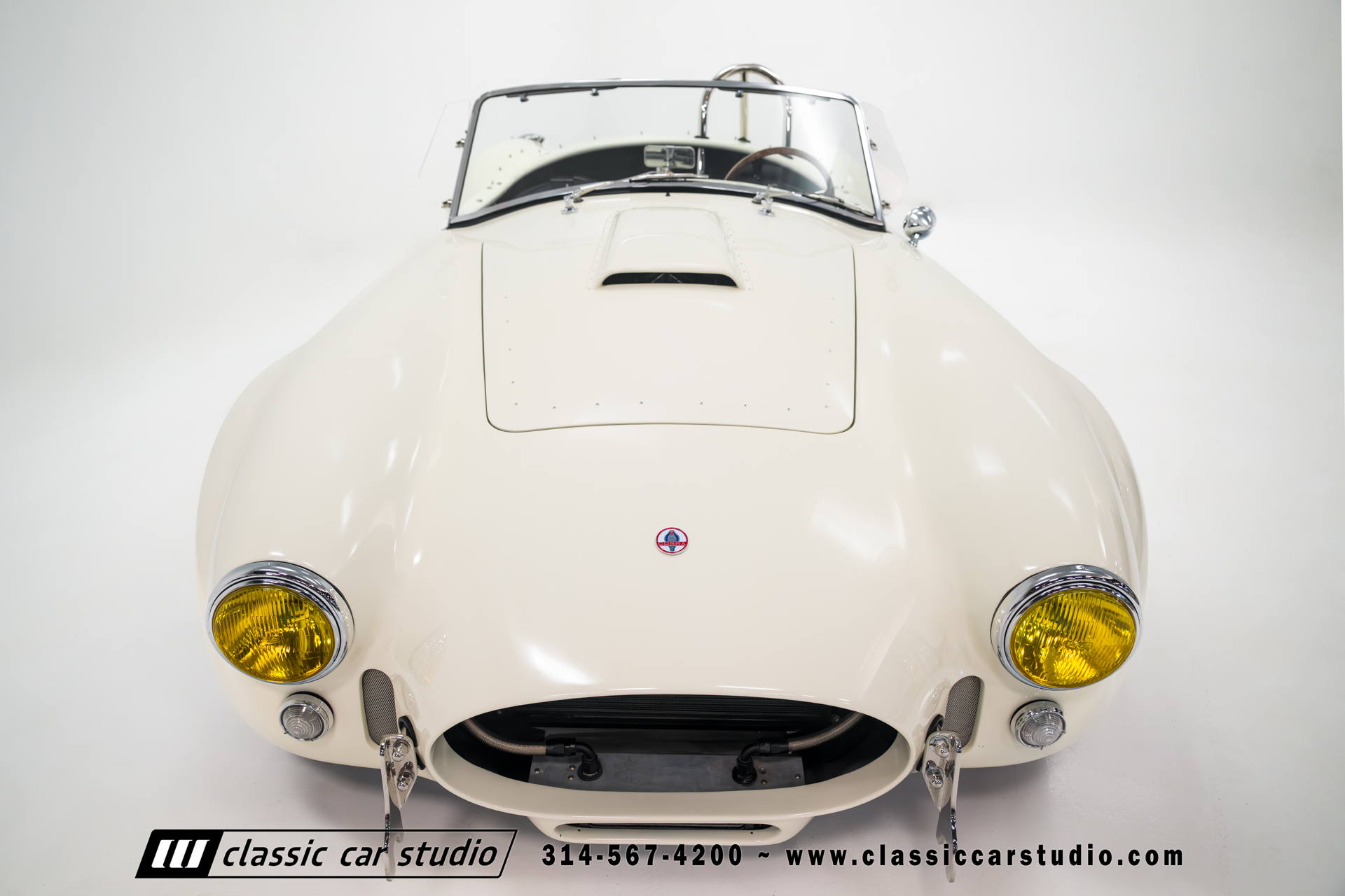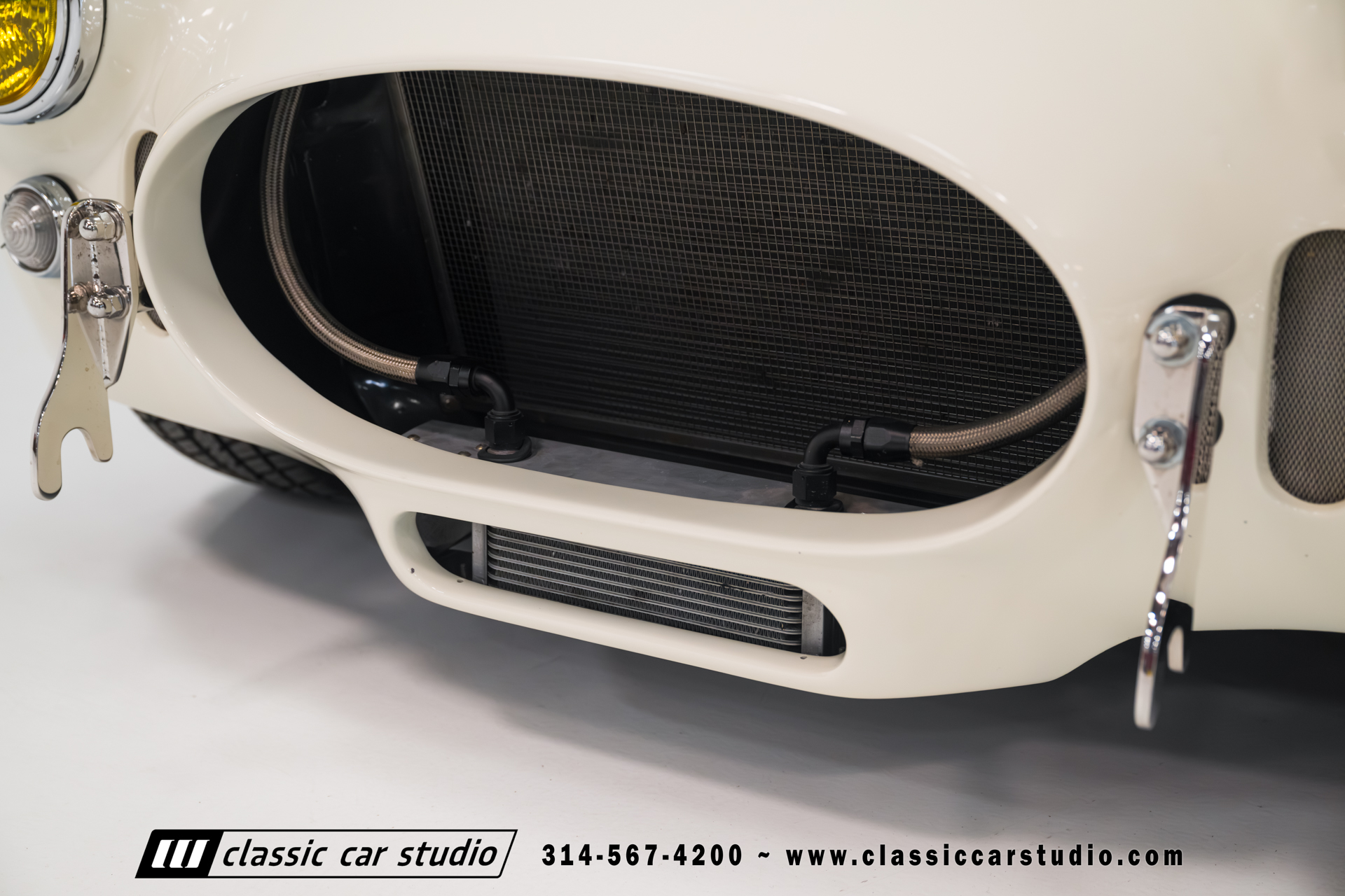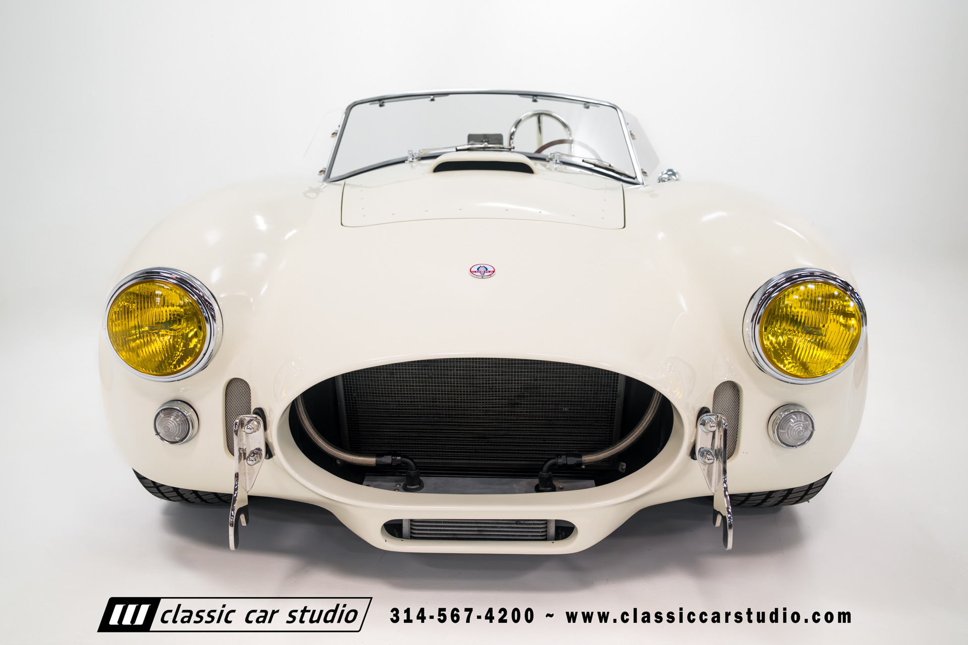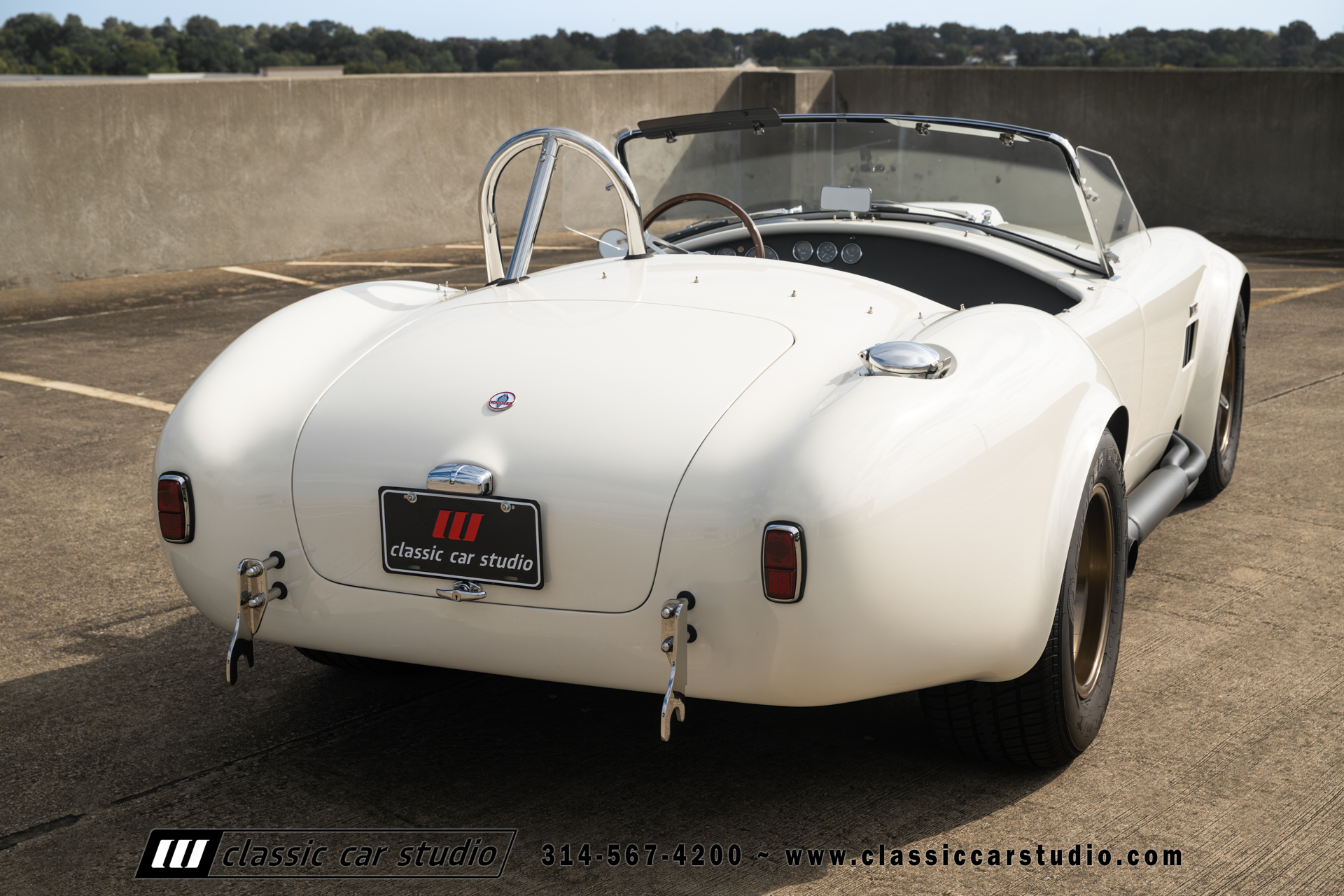 The fiberglass body is finished in gloss white and accented with yellow-lens headlights, quick-jack bumperettes, a roll hoop, wind wings, sun visors, and a functional hood scoop. The look is pure Cobra—muscular, purposeful, and ready for the open road.