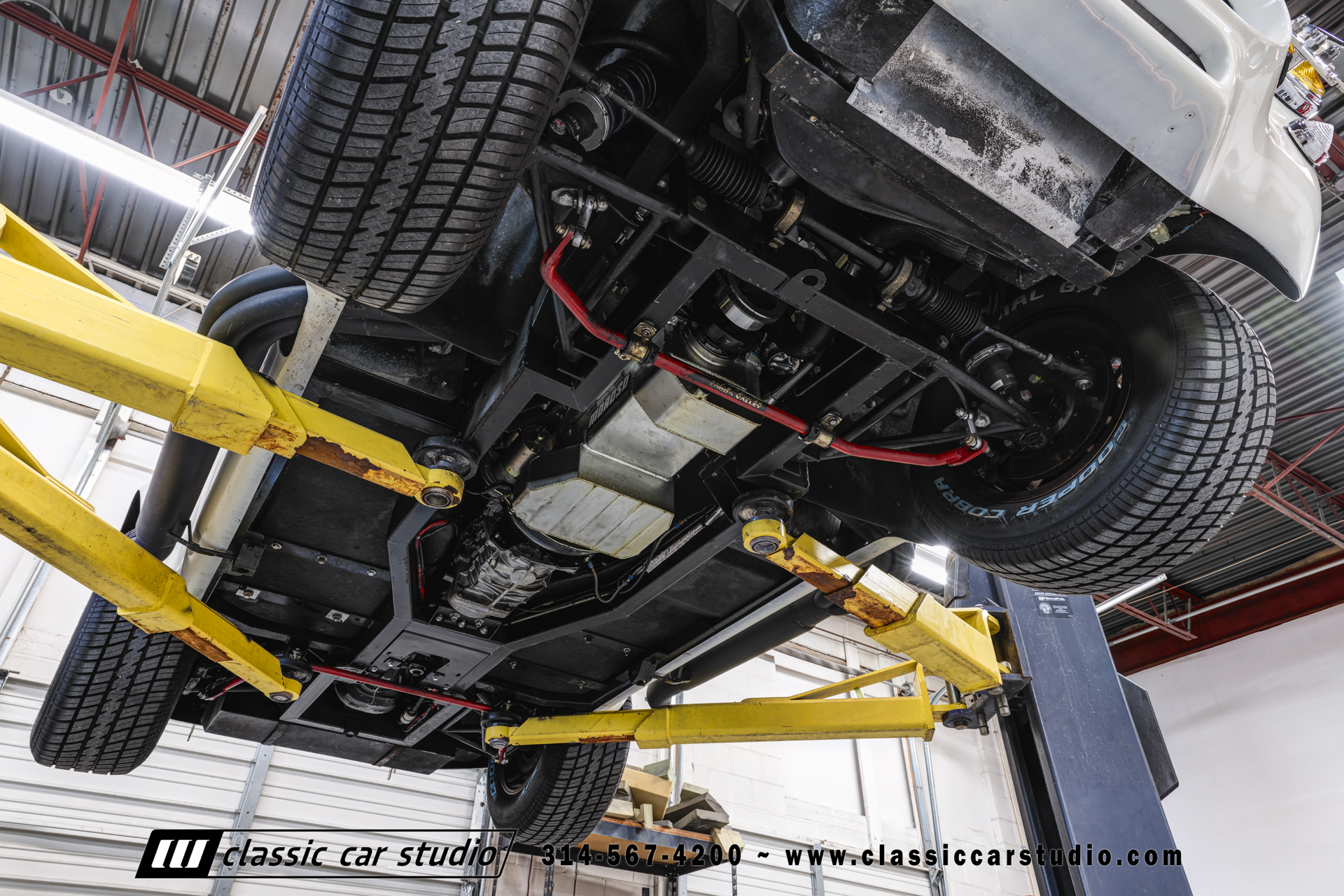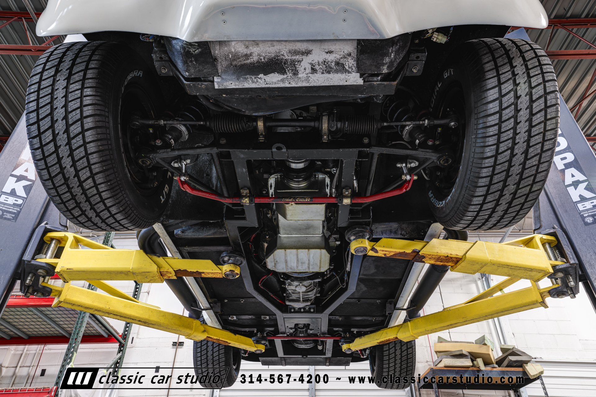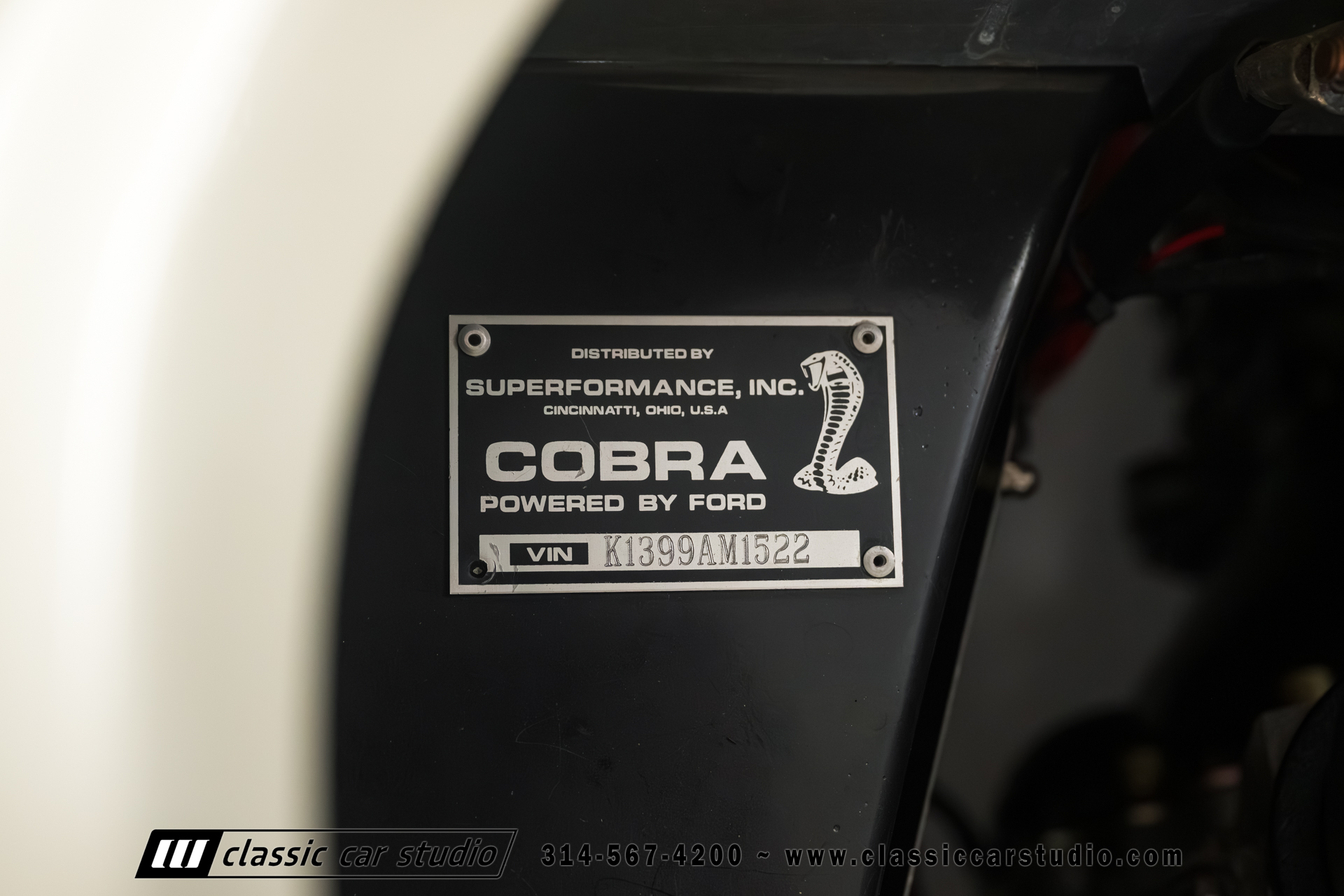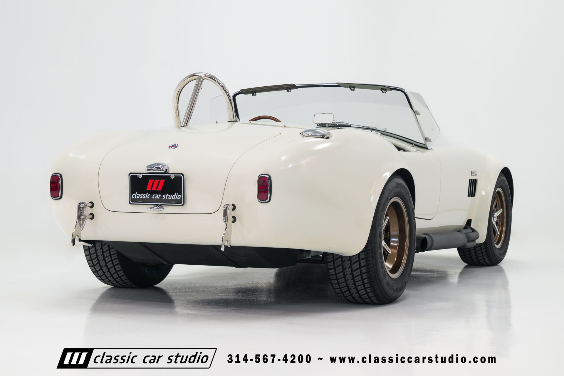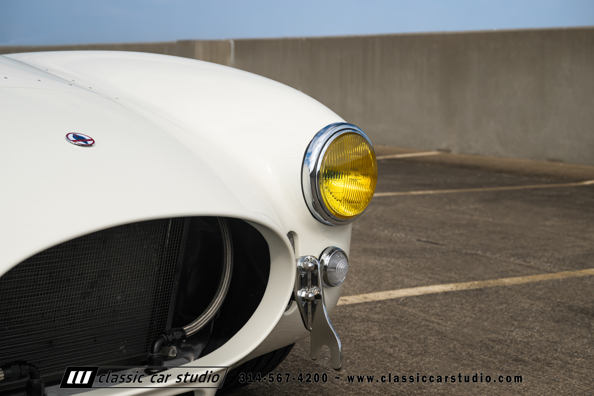 The fiberglass body is finished in gloss white and accented with yellow-lens headlights, quick-jack bumperettes, a roll hoop, wind wings, sun visors, and a functional hood scoop. The look is pure Cobra—muscular, purposeful, and ready for the open road.