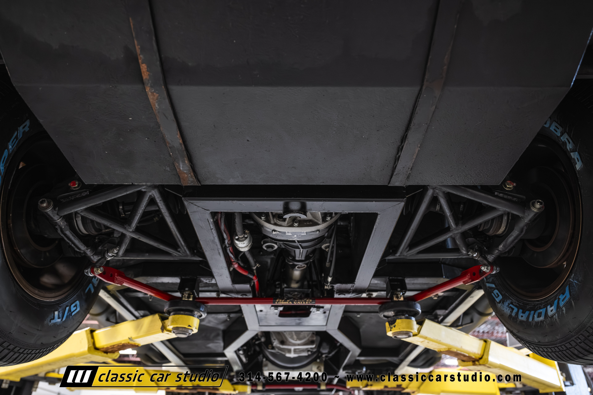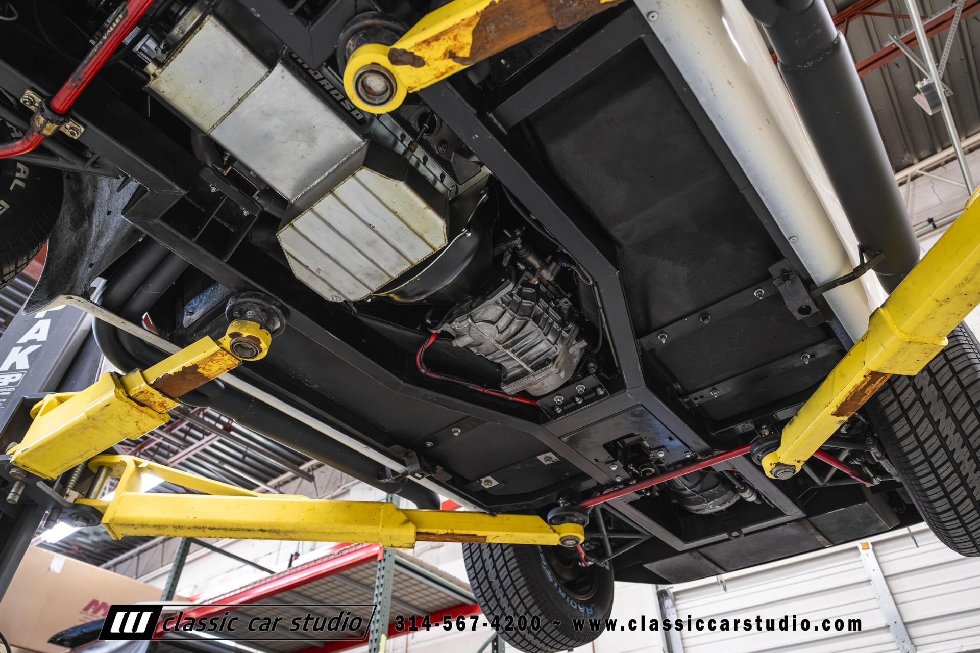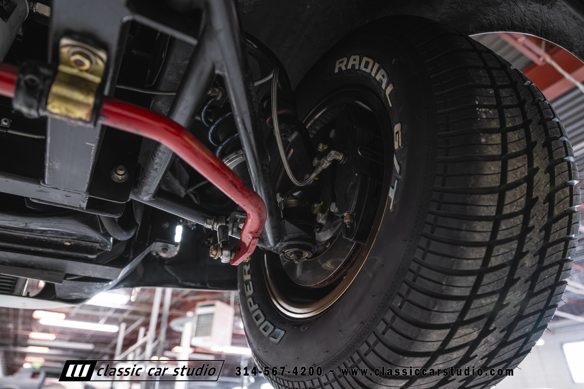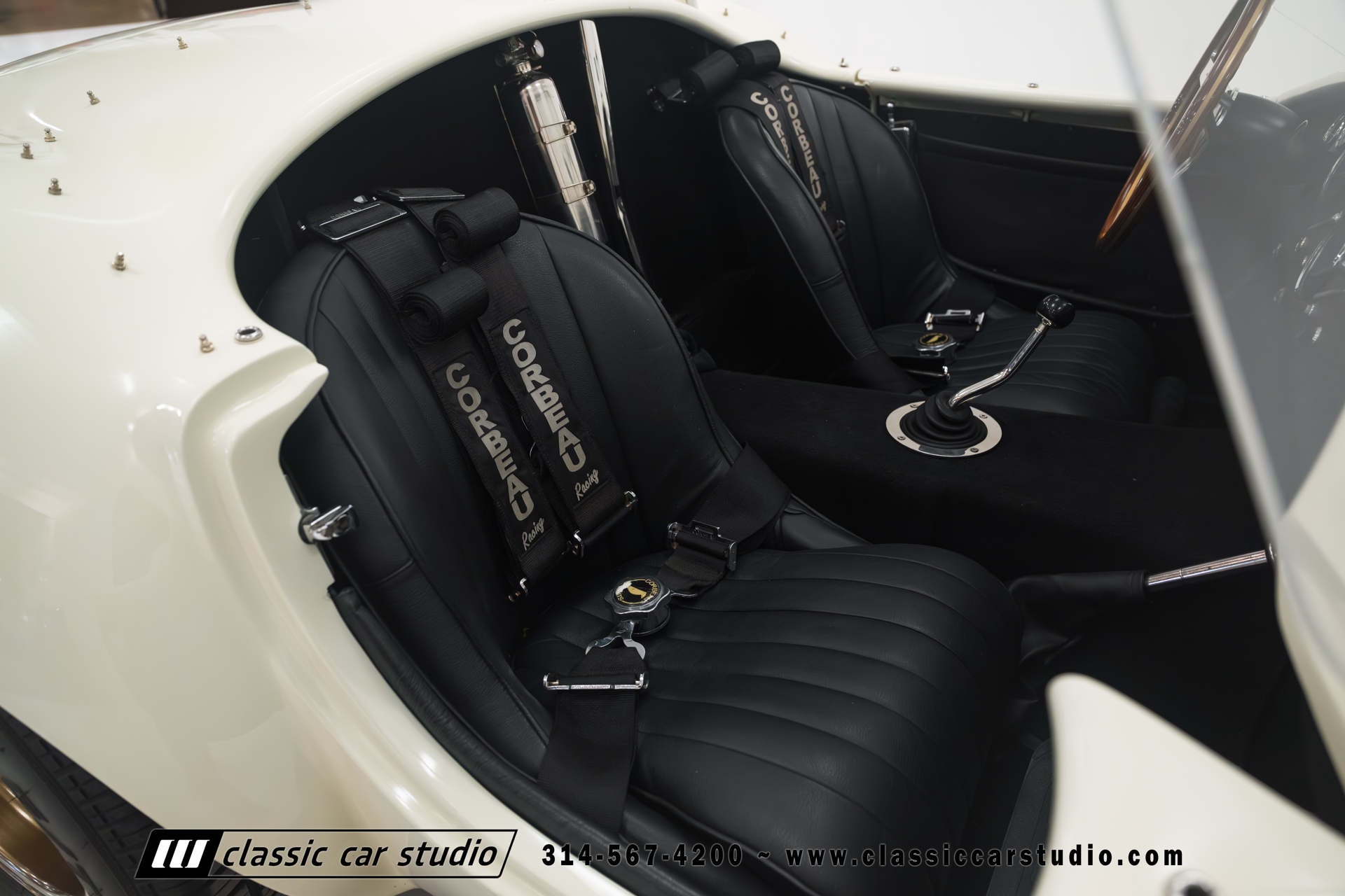 Inside, you’ll find black leather low-back bucket seats with Corbeau multi-point racing harnesses. A wood-rimmed steering wheel and dash-mounted rearview mirror keep the vintage feel authentic, while a fire extinguisher mounted between the seats adds a finishing touch of race-ready detail.