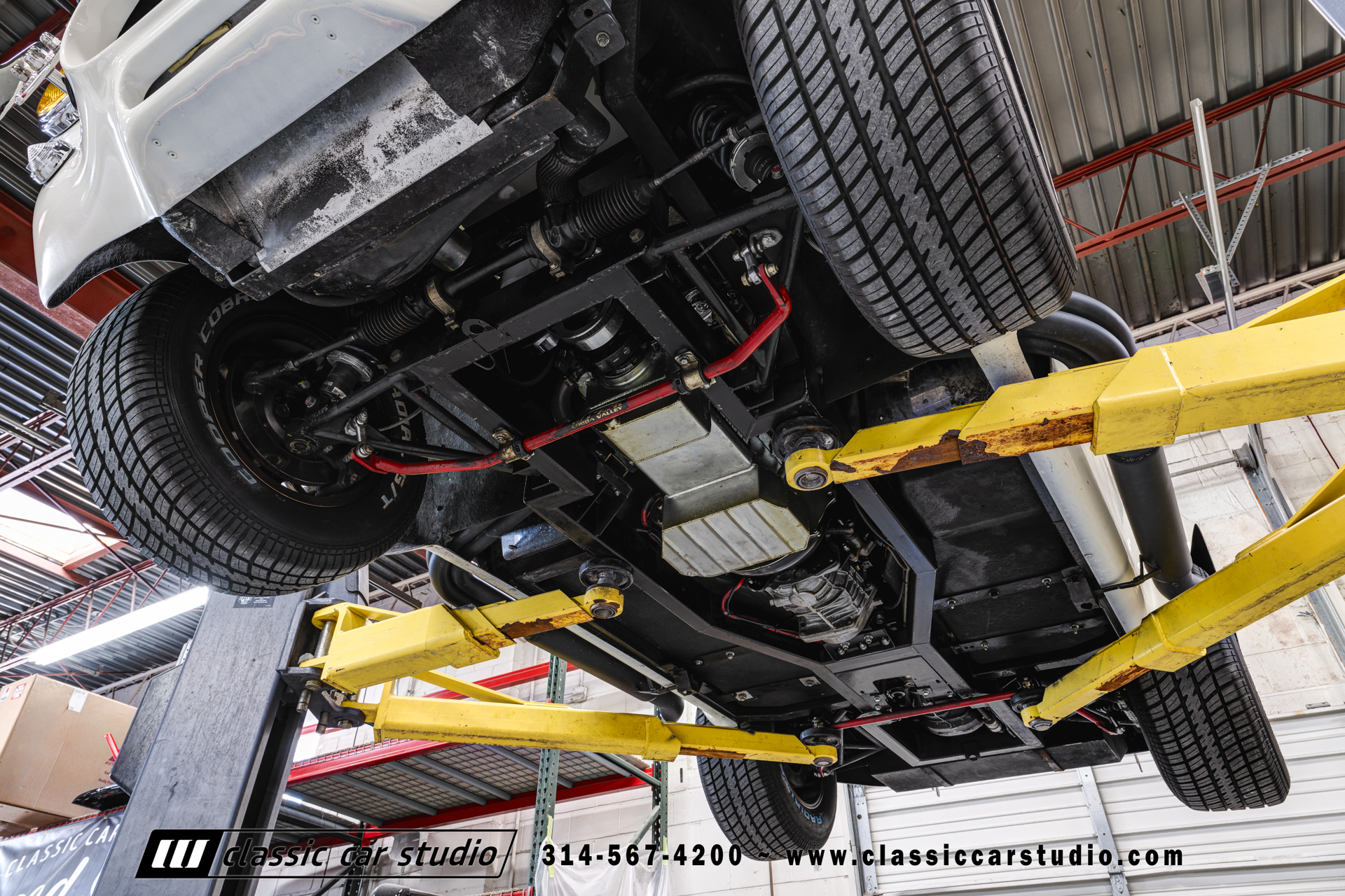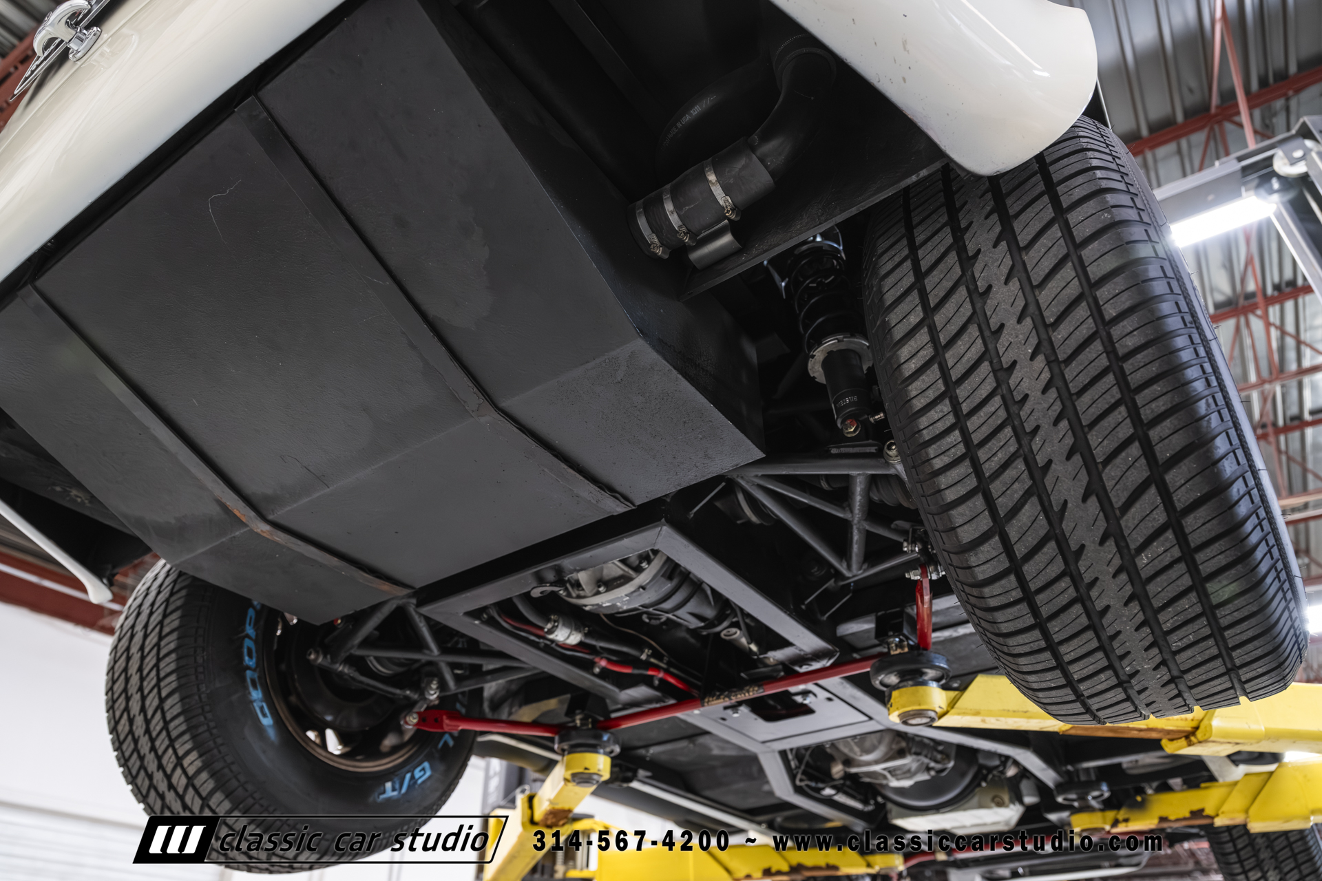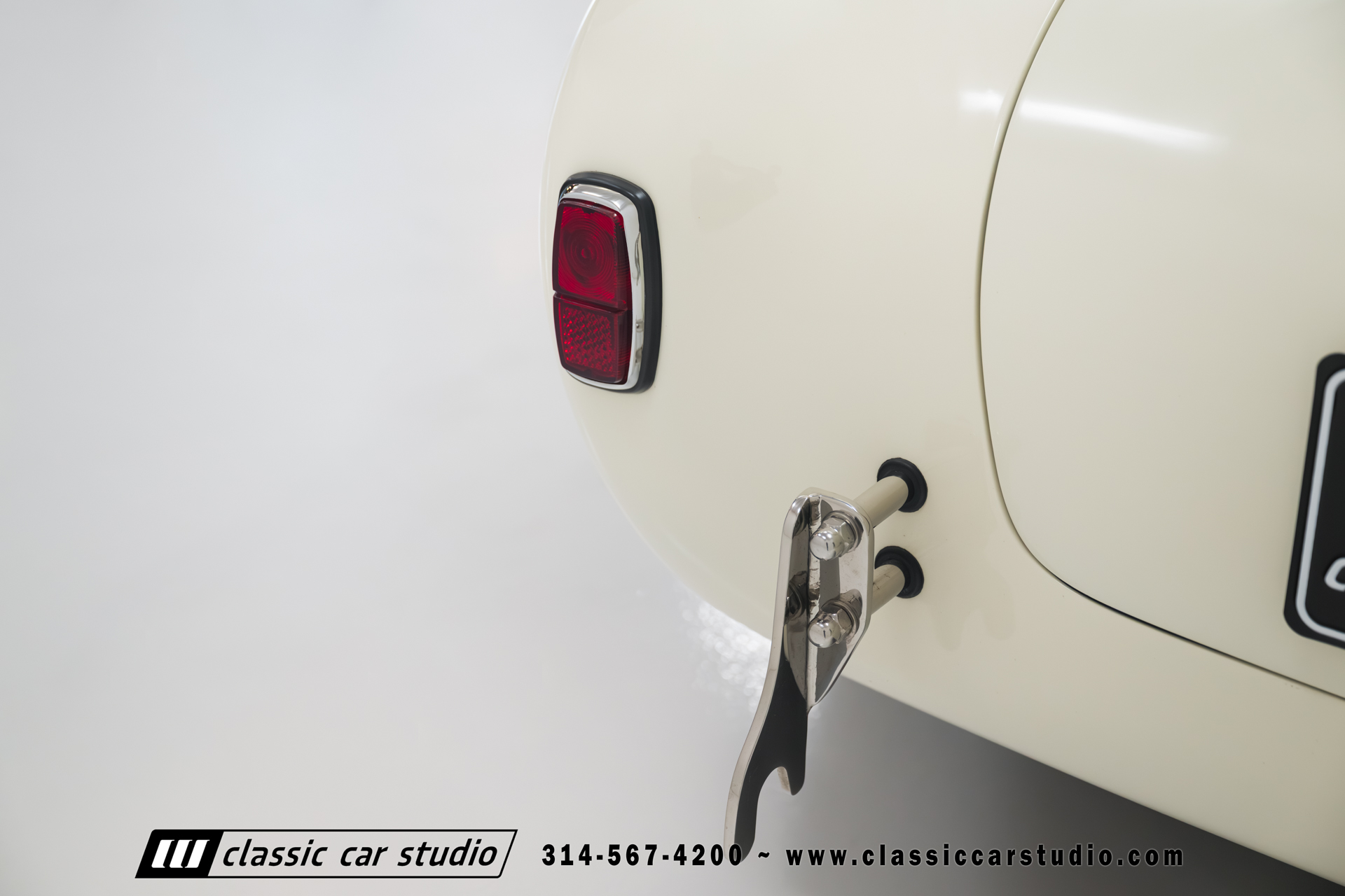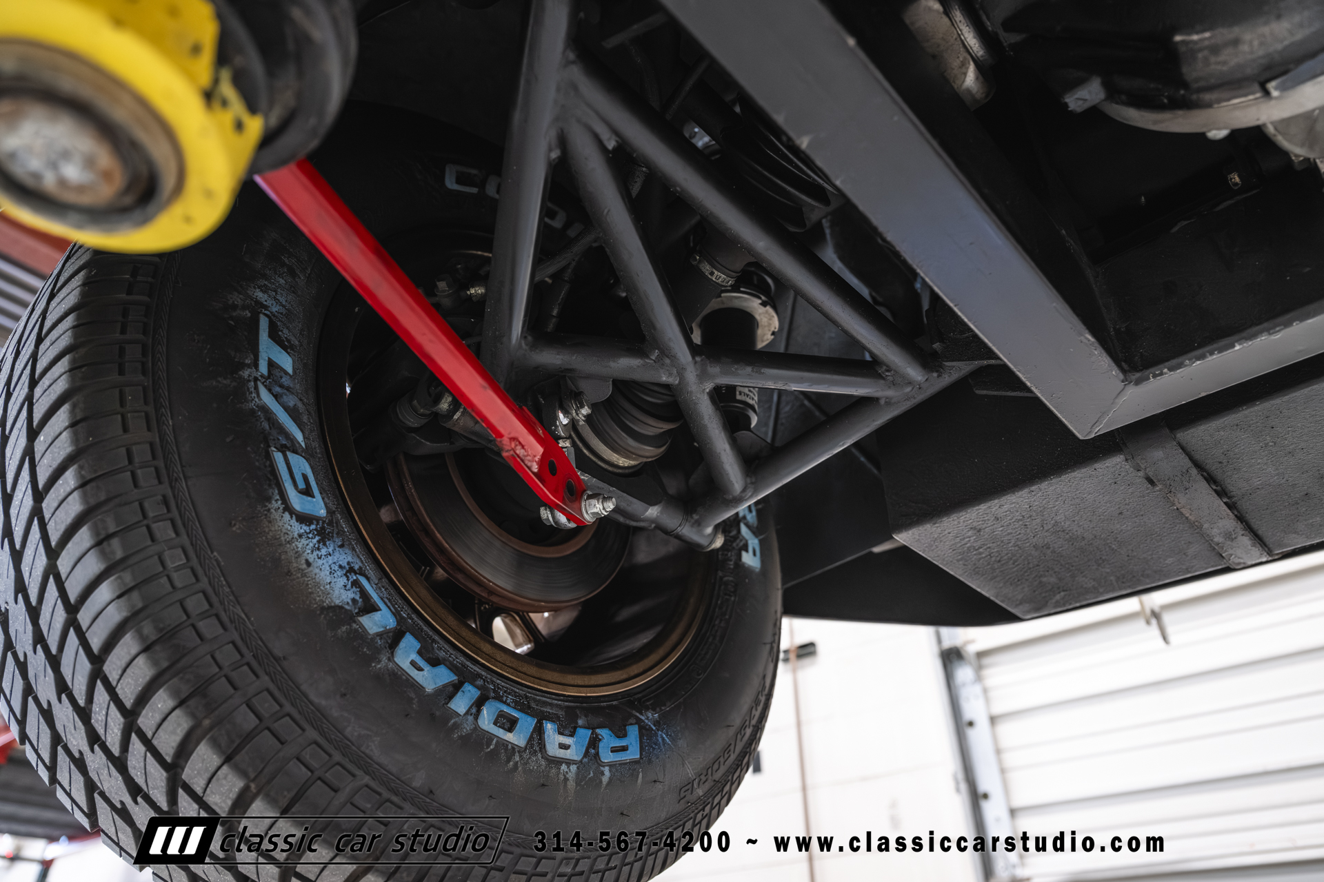 Inside, you’ll find black leather low-back bucket seats with Corbeau multi-point racing harnesses. A wood-rimmed steering wheel and dash-mounted rearview mirror keep the vintage feel authentic, while a fire extinguisher mounted between the seats adds a finishing touch of race-ready detail.
