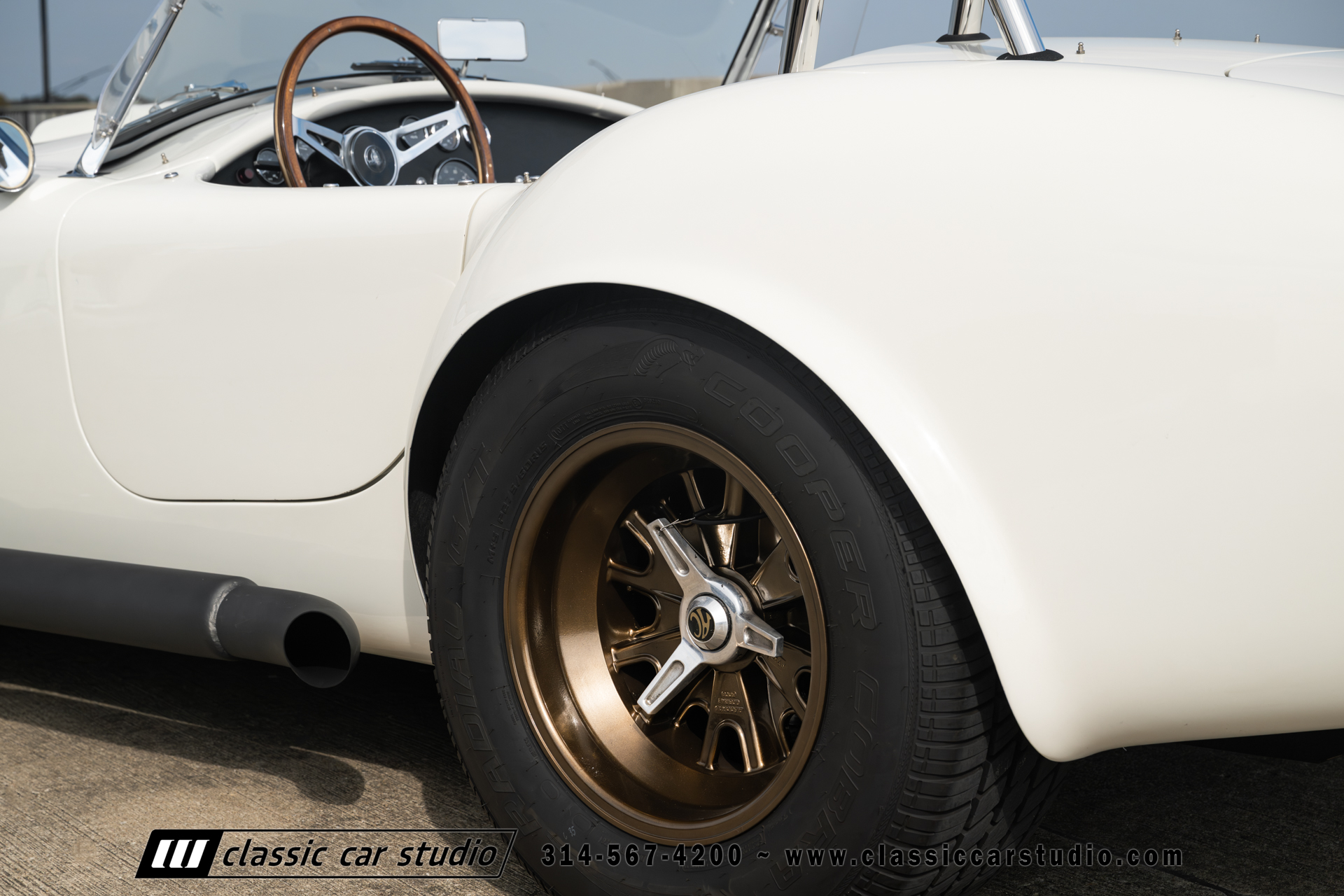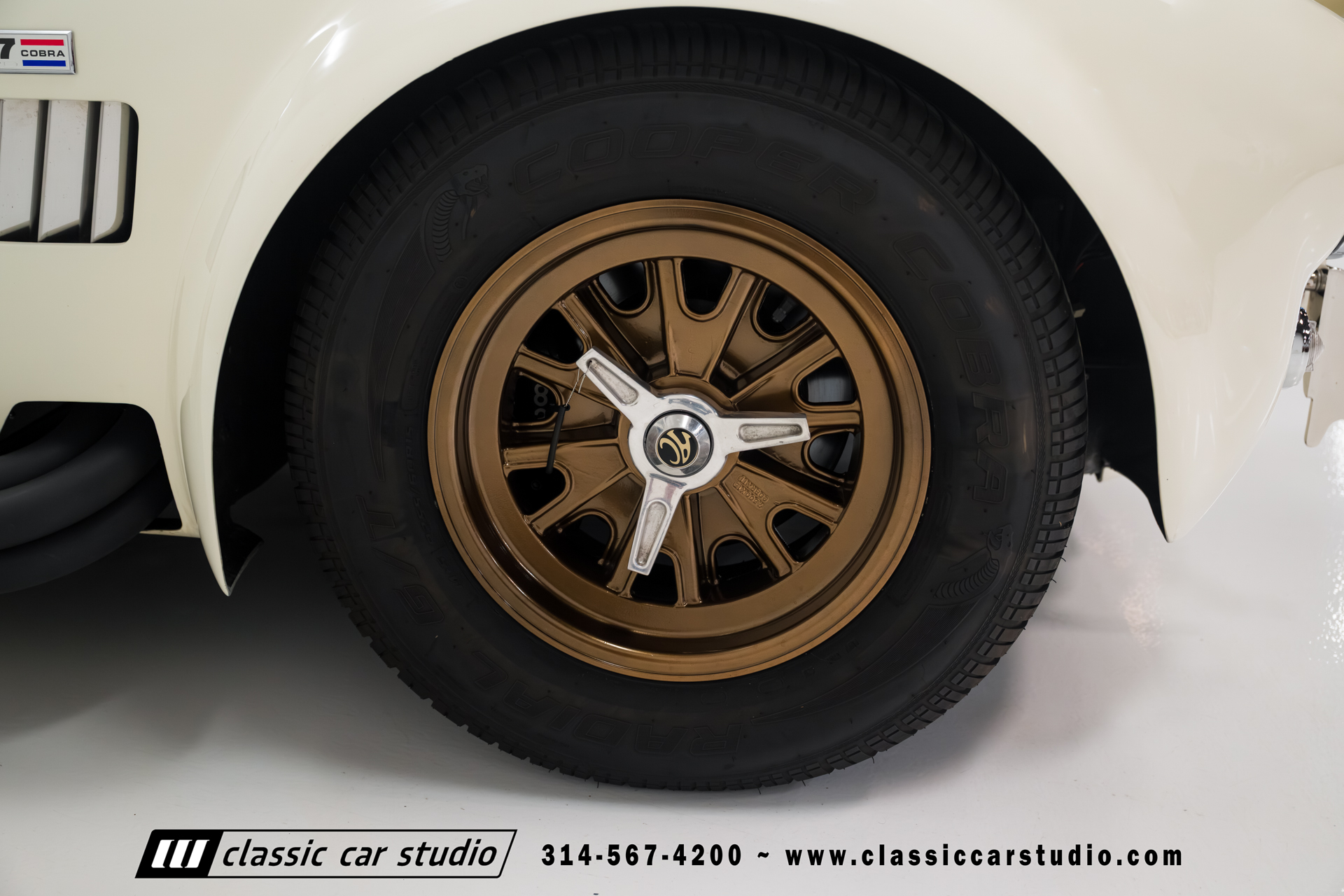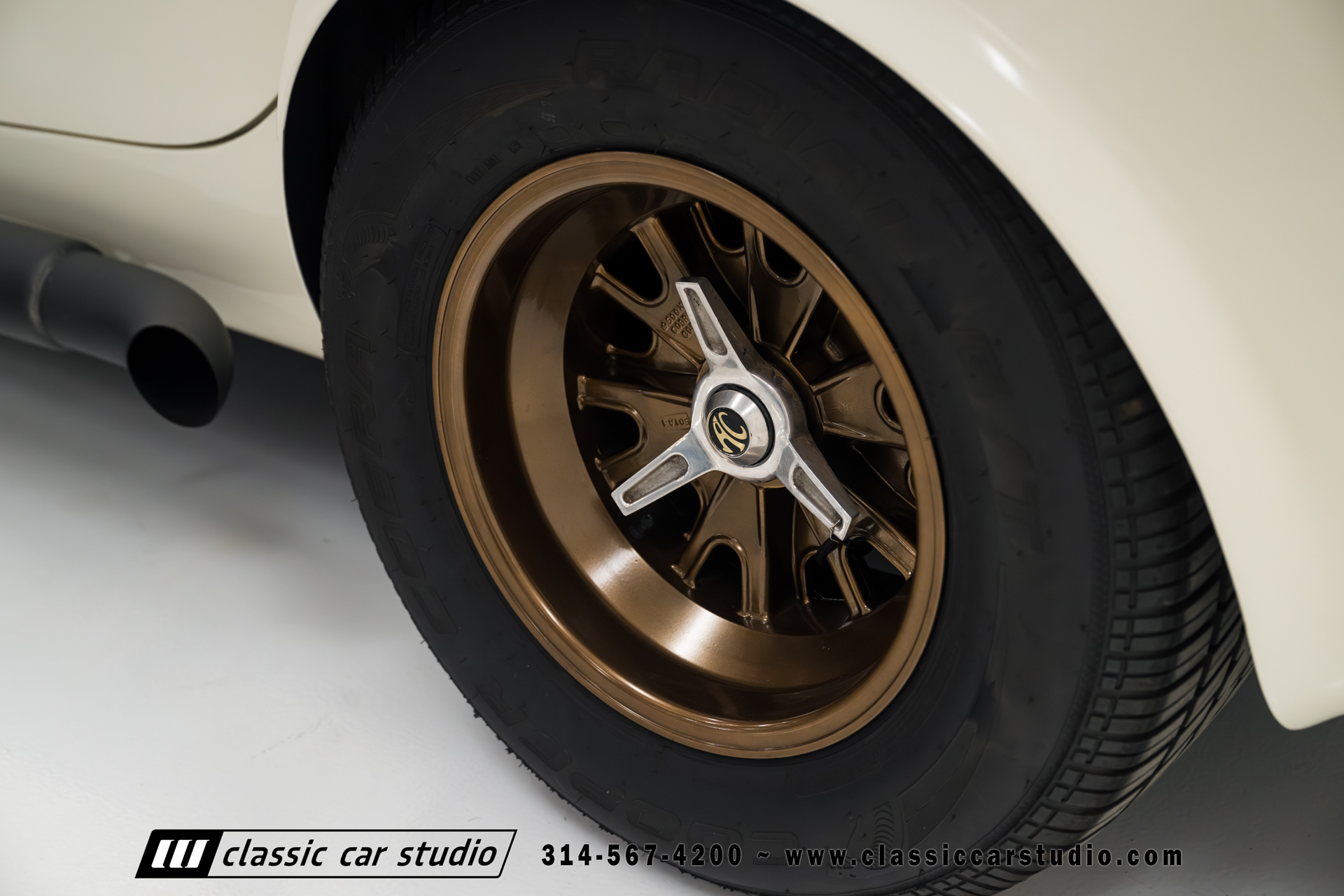The MKIII rides on adjustable Bilstein coilovers and Cobra Valley sway bars, delivering confident handling and a smooth ride. Rack-and-pinion steering provides precise control, while four-wheel disc brakes with Wilwood front calipers ensure reliable stopping power. The car sits on 15-inch bronze Halibrand-style wheels wrapped in Cooper Cobra Radial G/T tires, completing the period-correct stance.