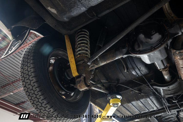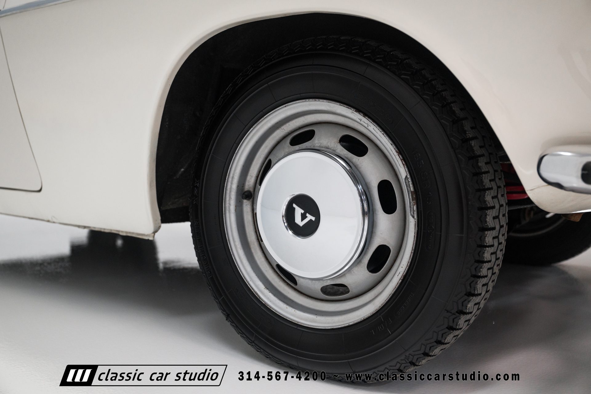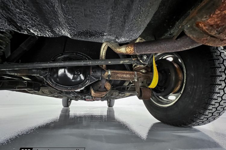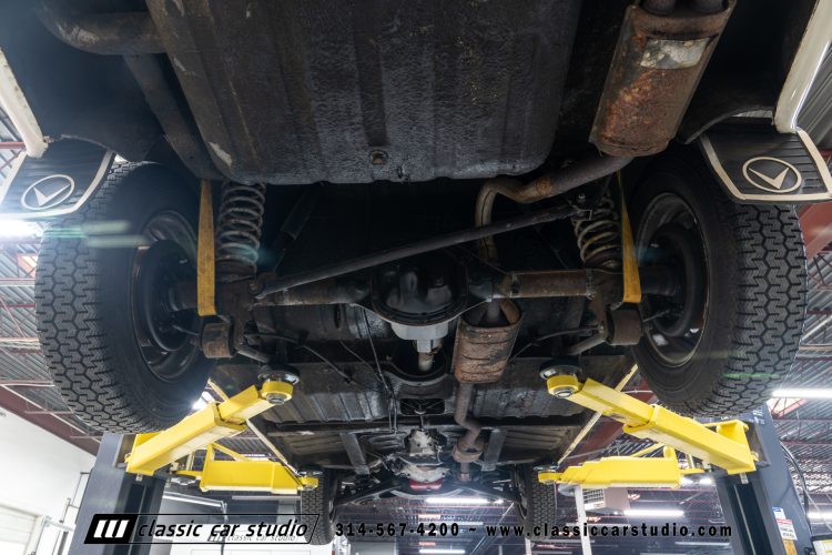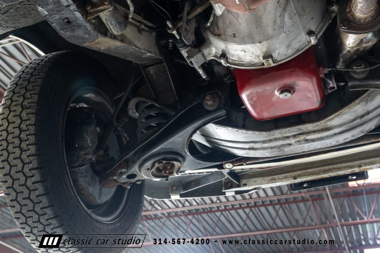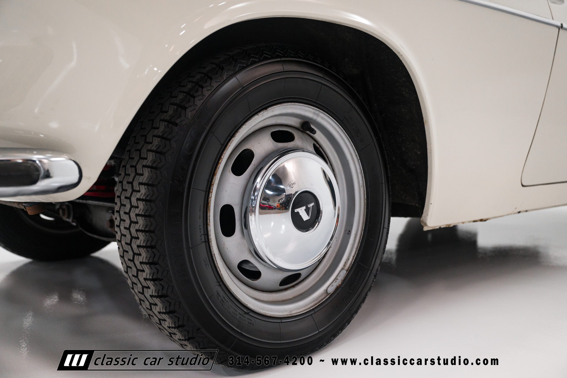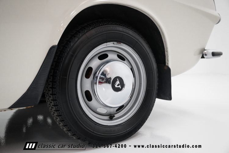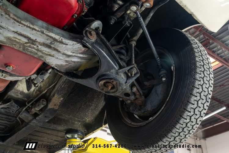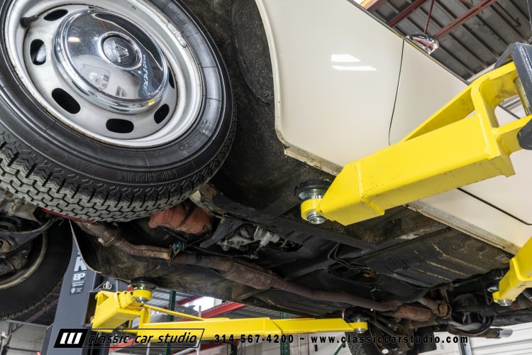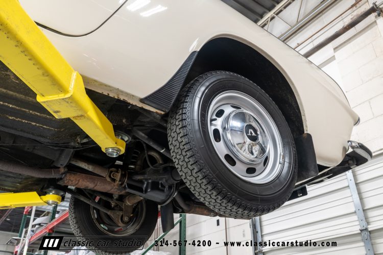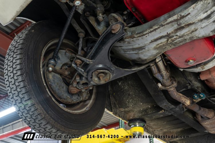 Steel 15″ wheels wear chrome hubcaps and trim rings and are mounted with 165-width Michelin XZX tires. Stopping power is provided by front disc and rear drum brakes. The brake fluid was flushed in preparation for the sale. Corrosion is visible on the wheels.