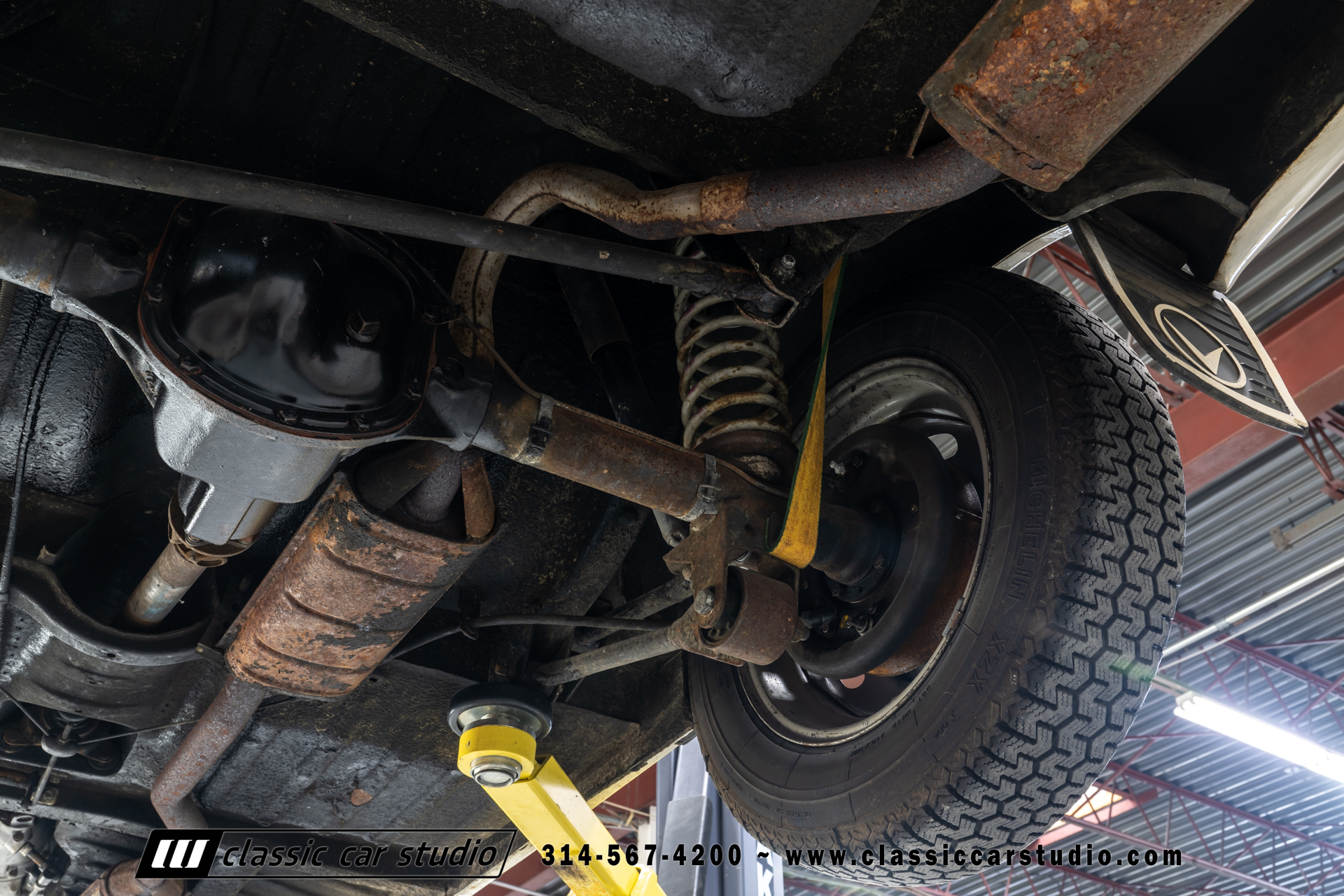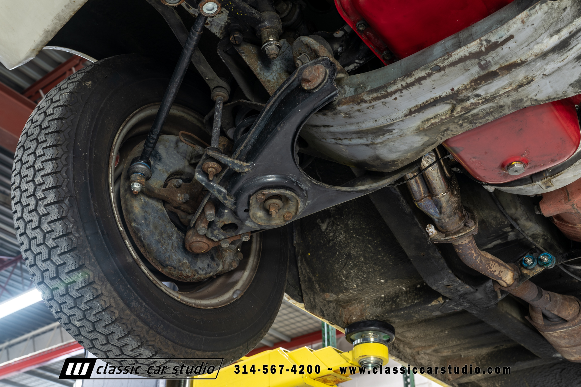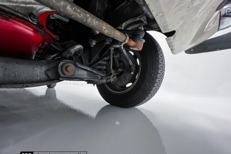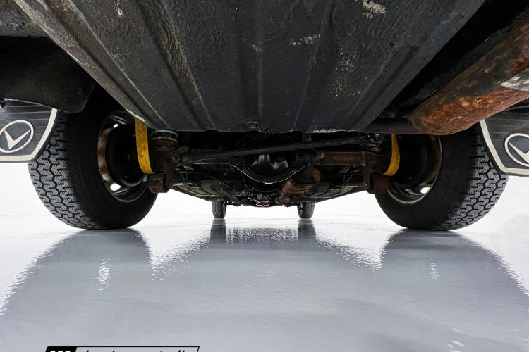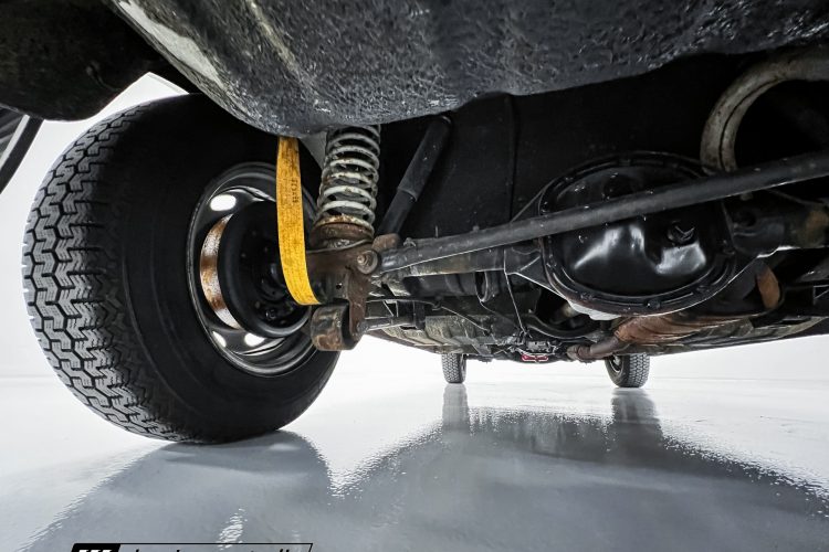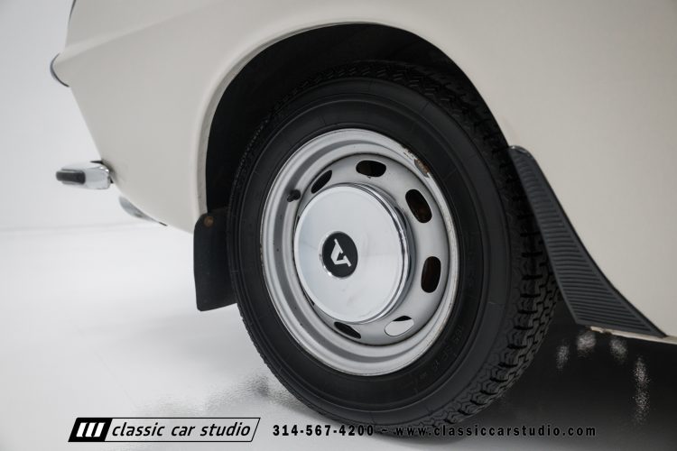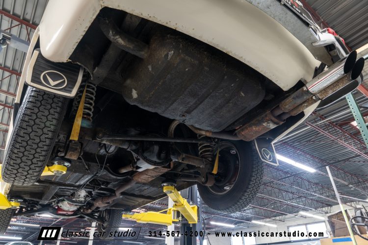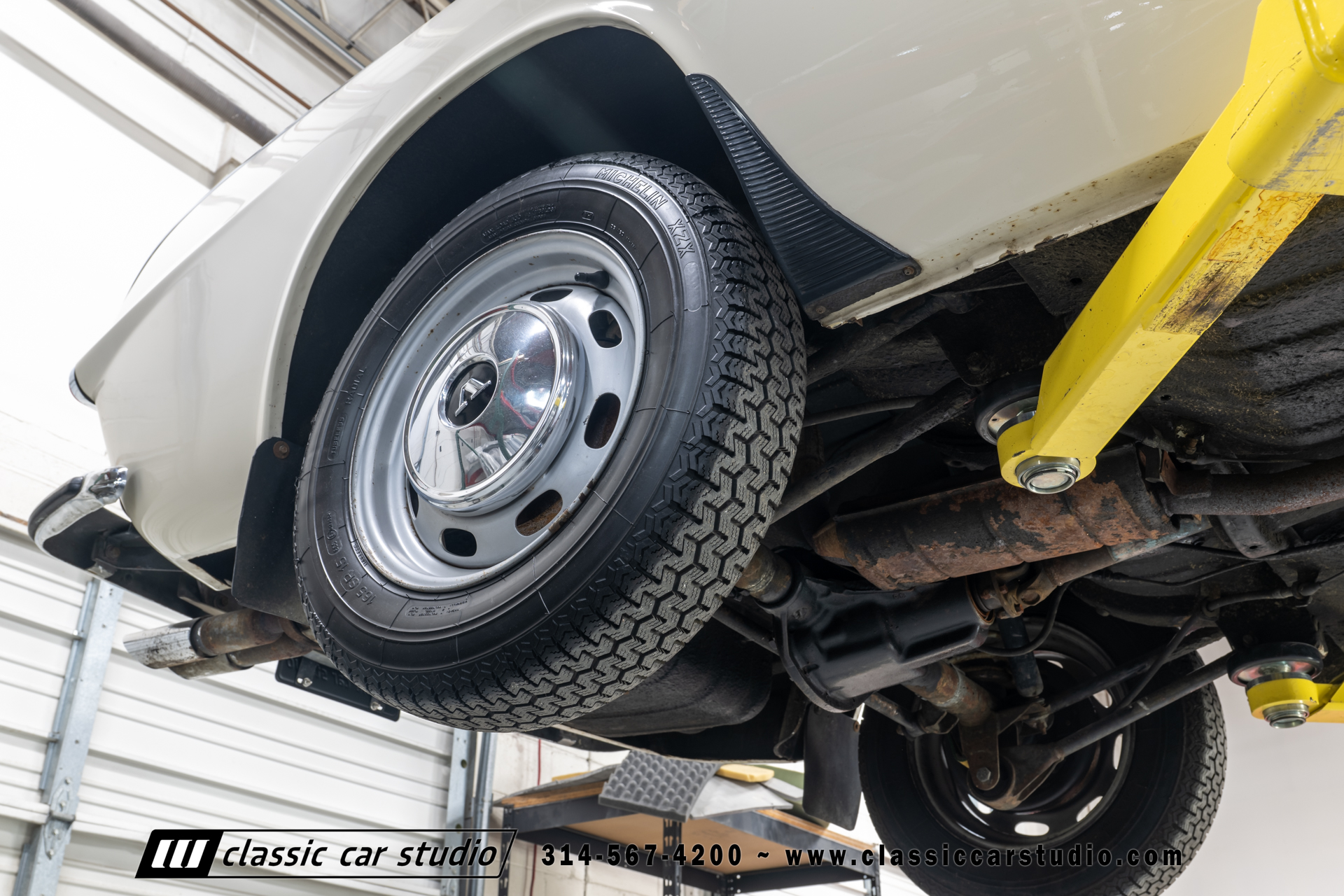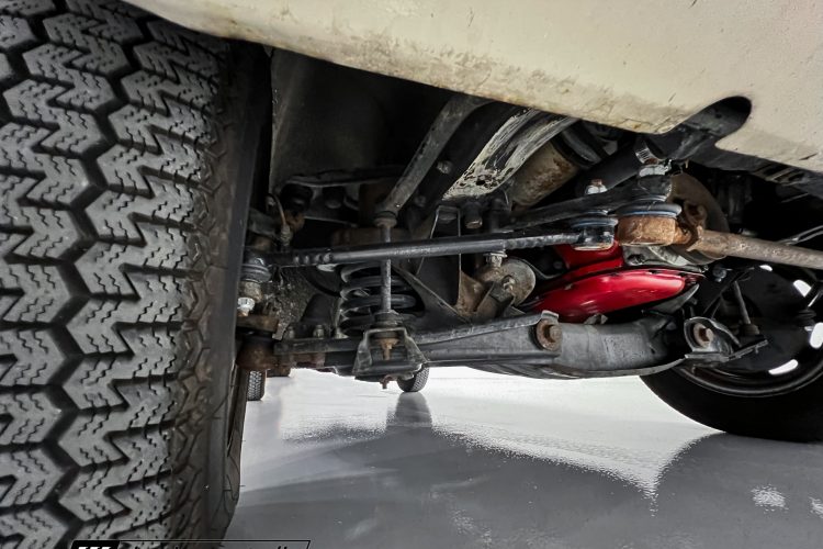 Steel 15″ wheels wear chrome hubcaps and trim rings and are mounted with 165-width Michelin XZX tires. Stopping power is provided by front disc and rear drum brakes. The brake fluid was flushed in preparation for the sale. Corrosion is visible on the wheels.