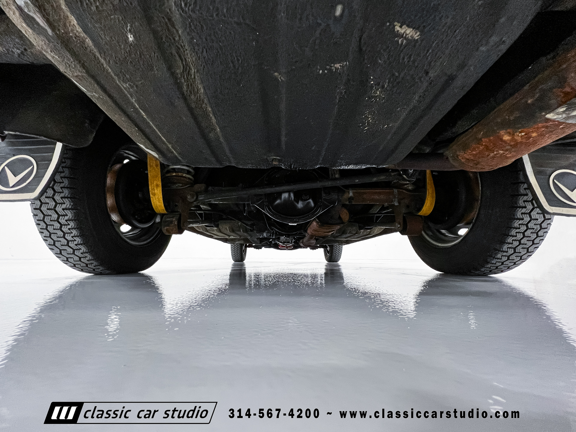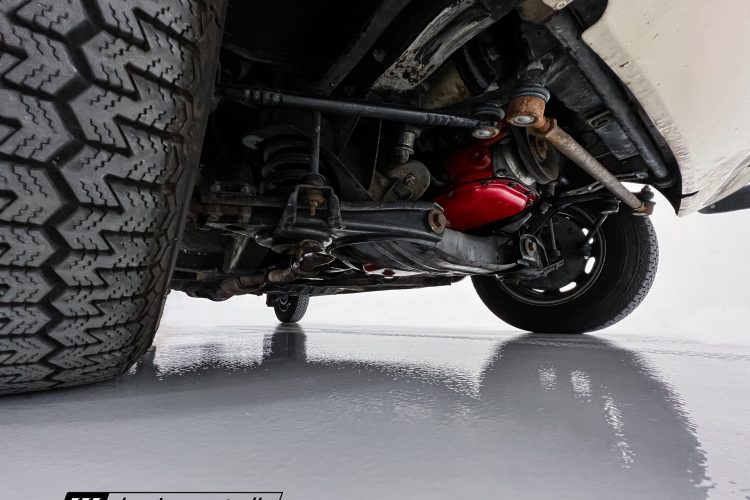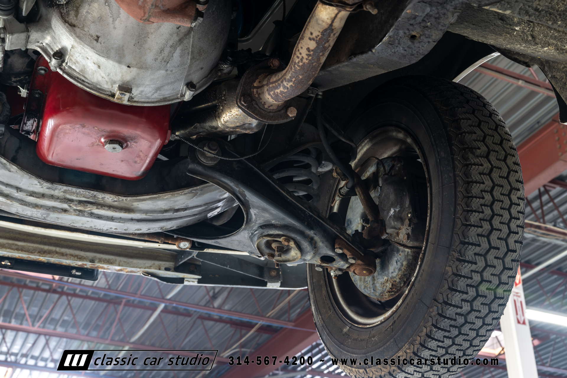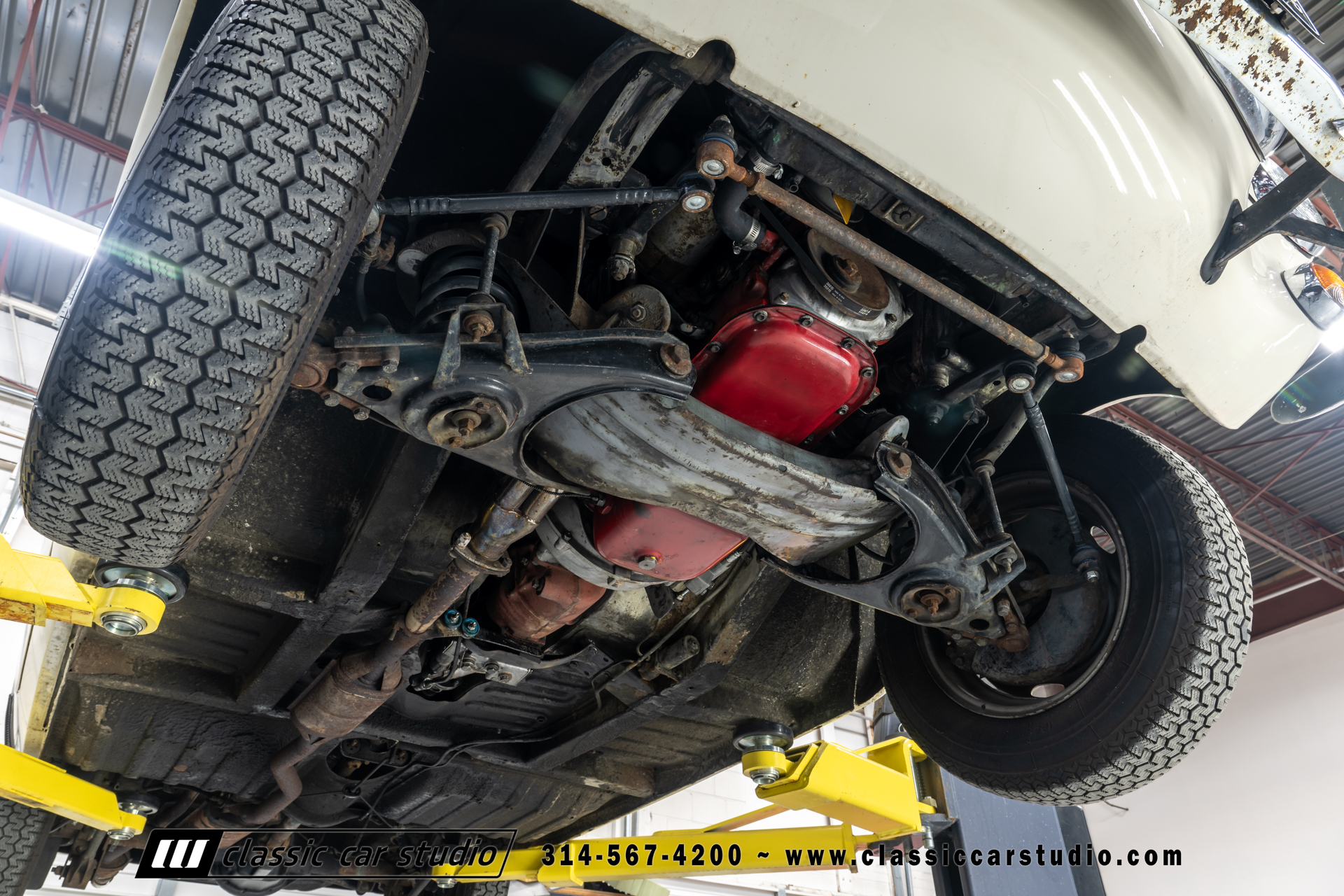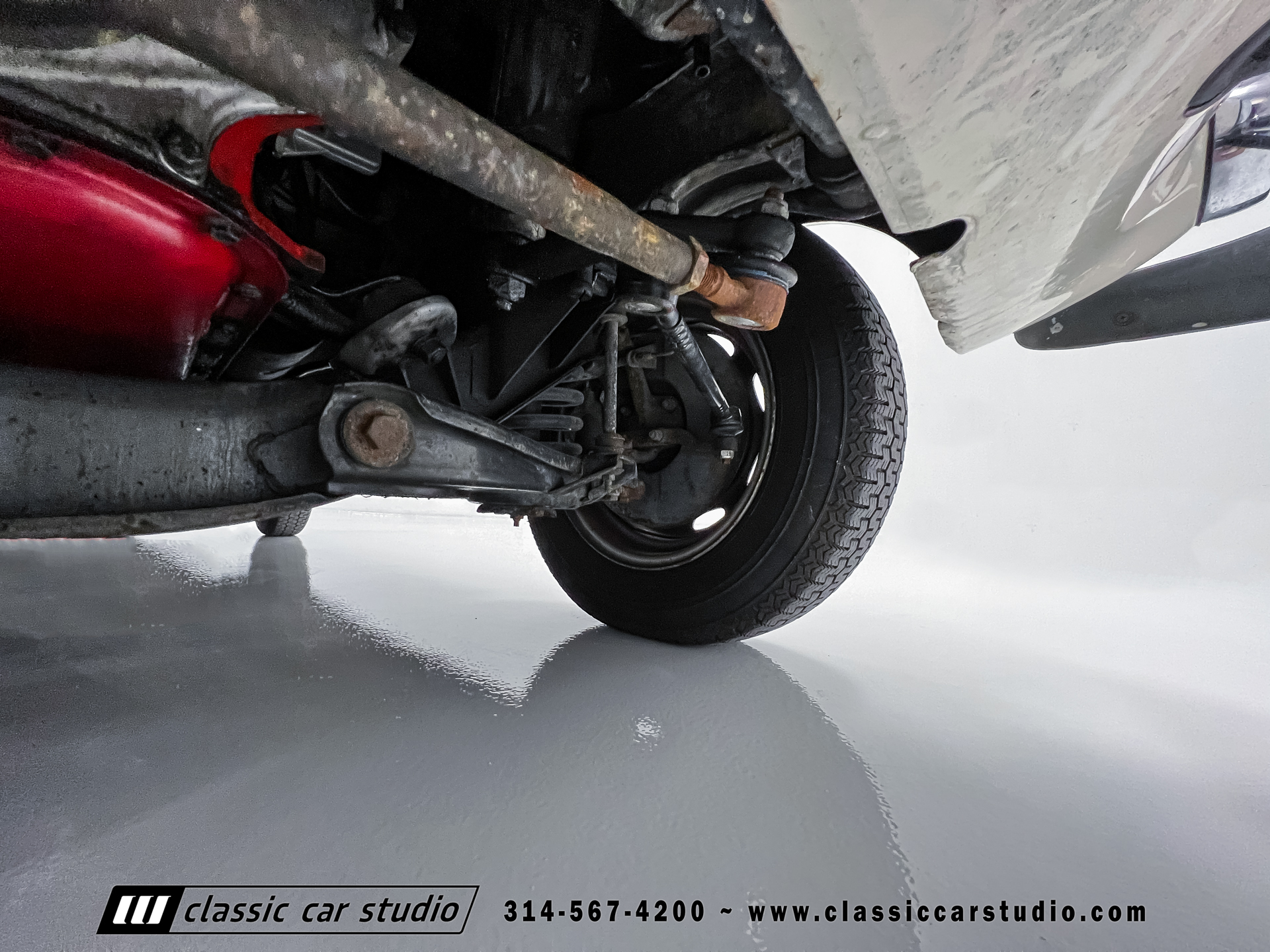 Steel 15″ wheels wear chrome hubcaps and trim rings and are mounted with 165-width Michelin XZX tires. Stopping power is provided by front disc and rear drum brakes. The brake fluid was flushed in preparation for the sale. Corrosion is visible on the wheels.