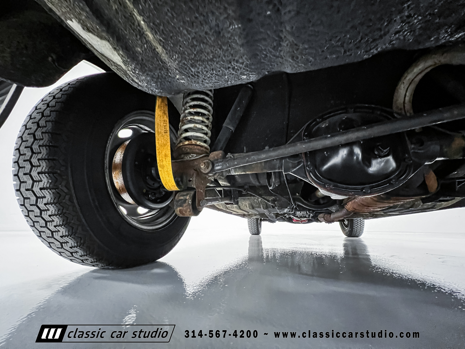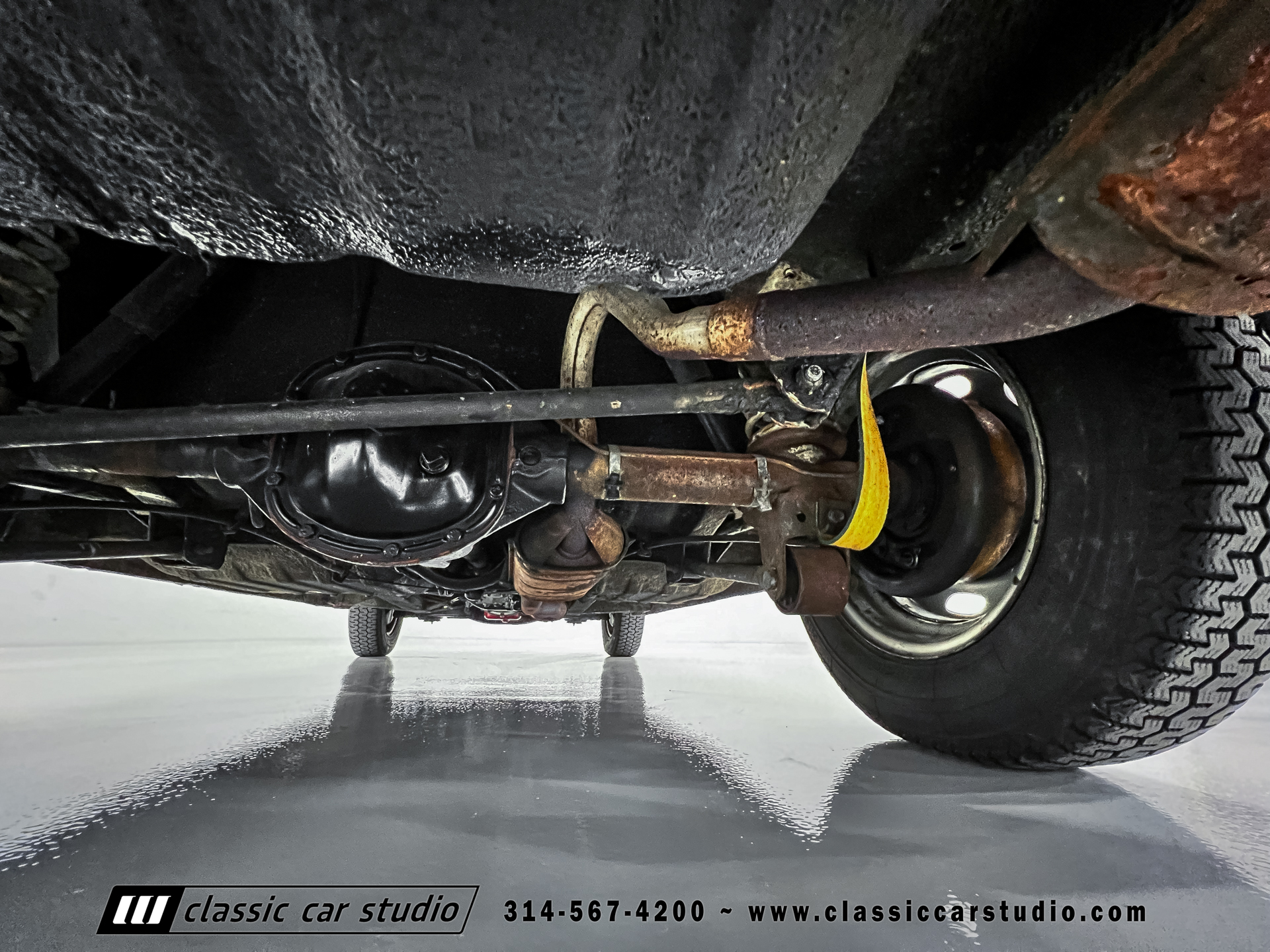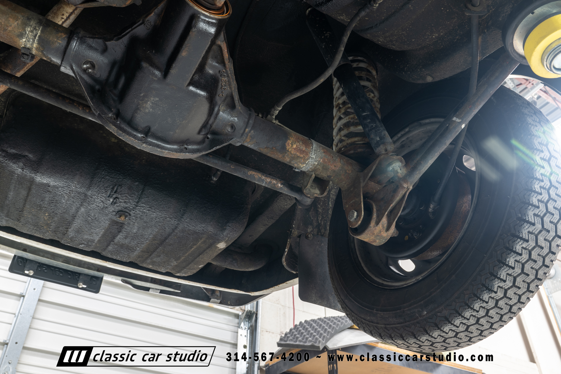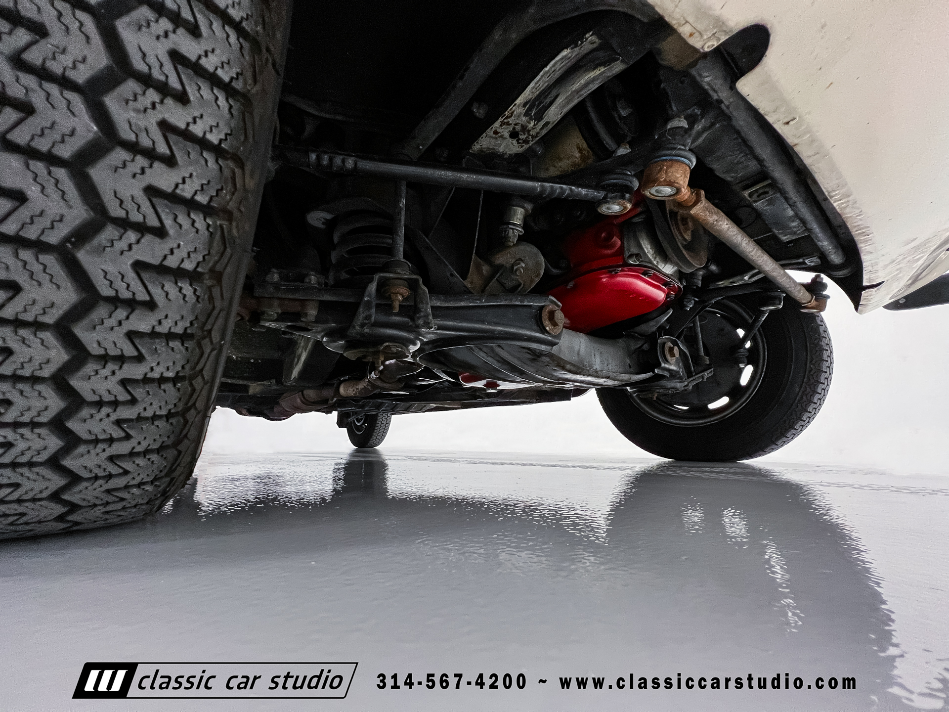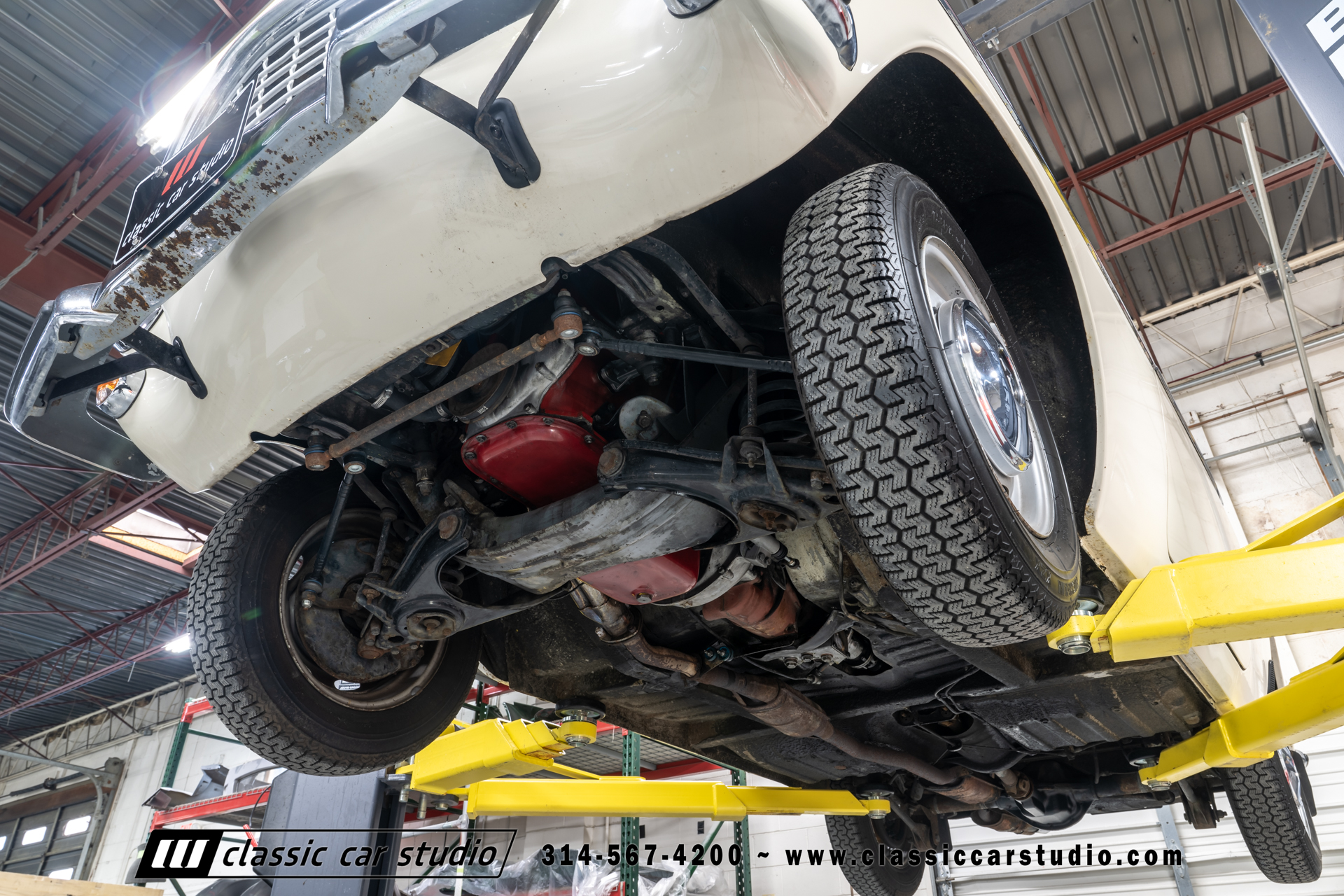 Steel 15″ wheels wear chrome hubcaps and trim rings and are mounted with 165-width Michelin XZX tires. Stopping power is provided by front disc and rear drum brakes. The brake fluid was flushed in preparation for the sale. Corrosion is visible on the wheels.