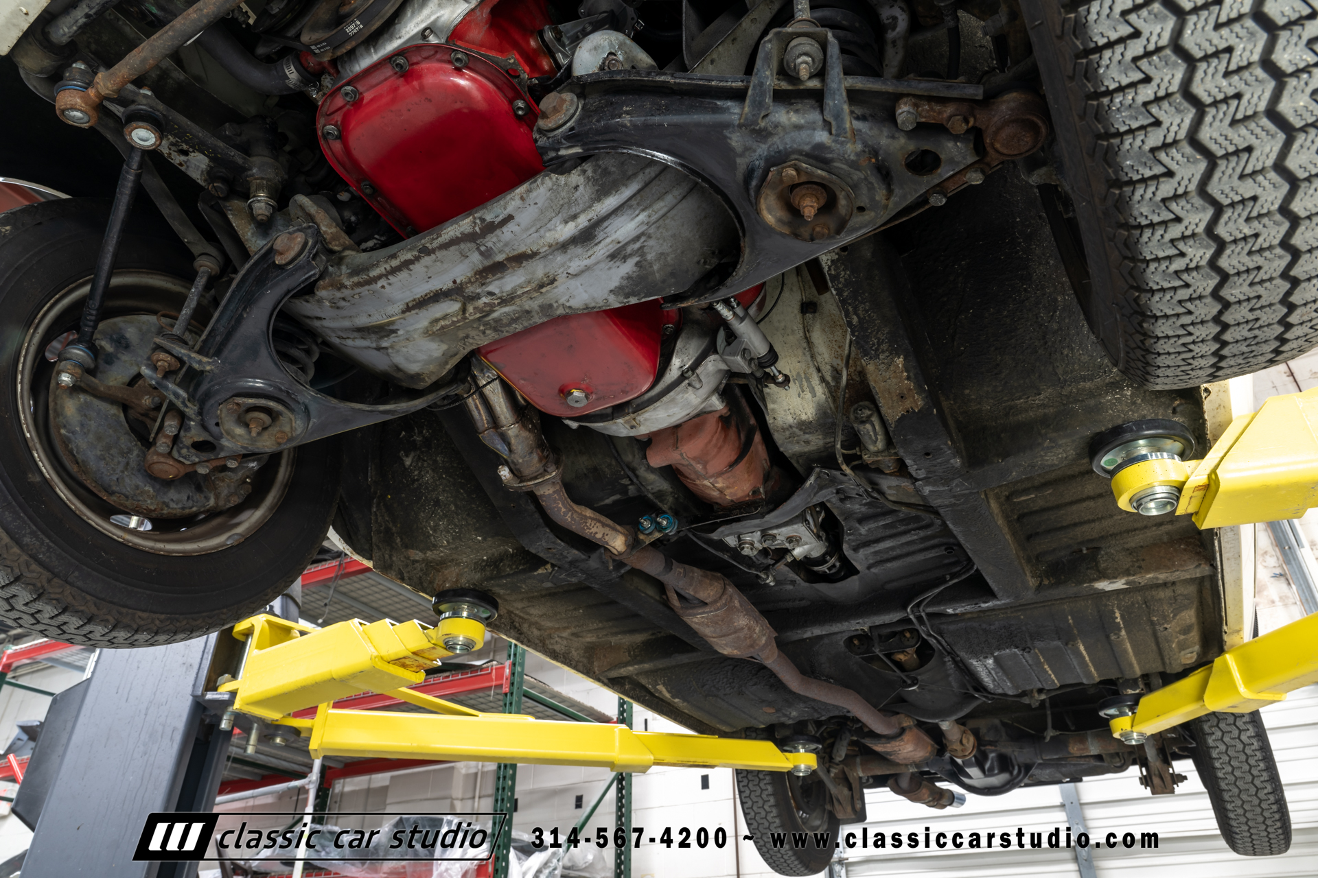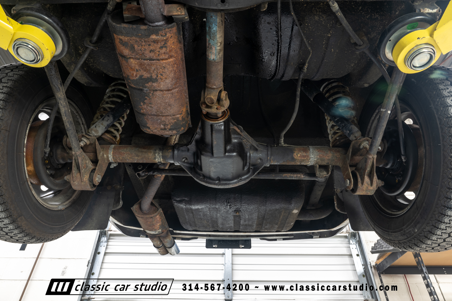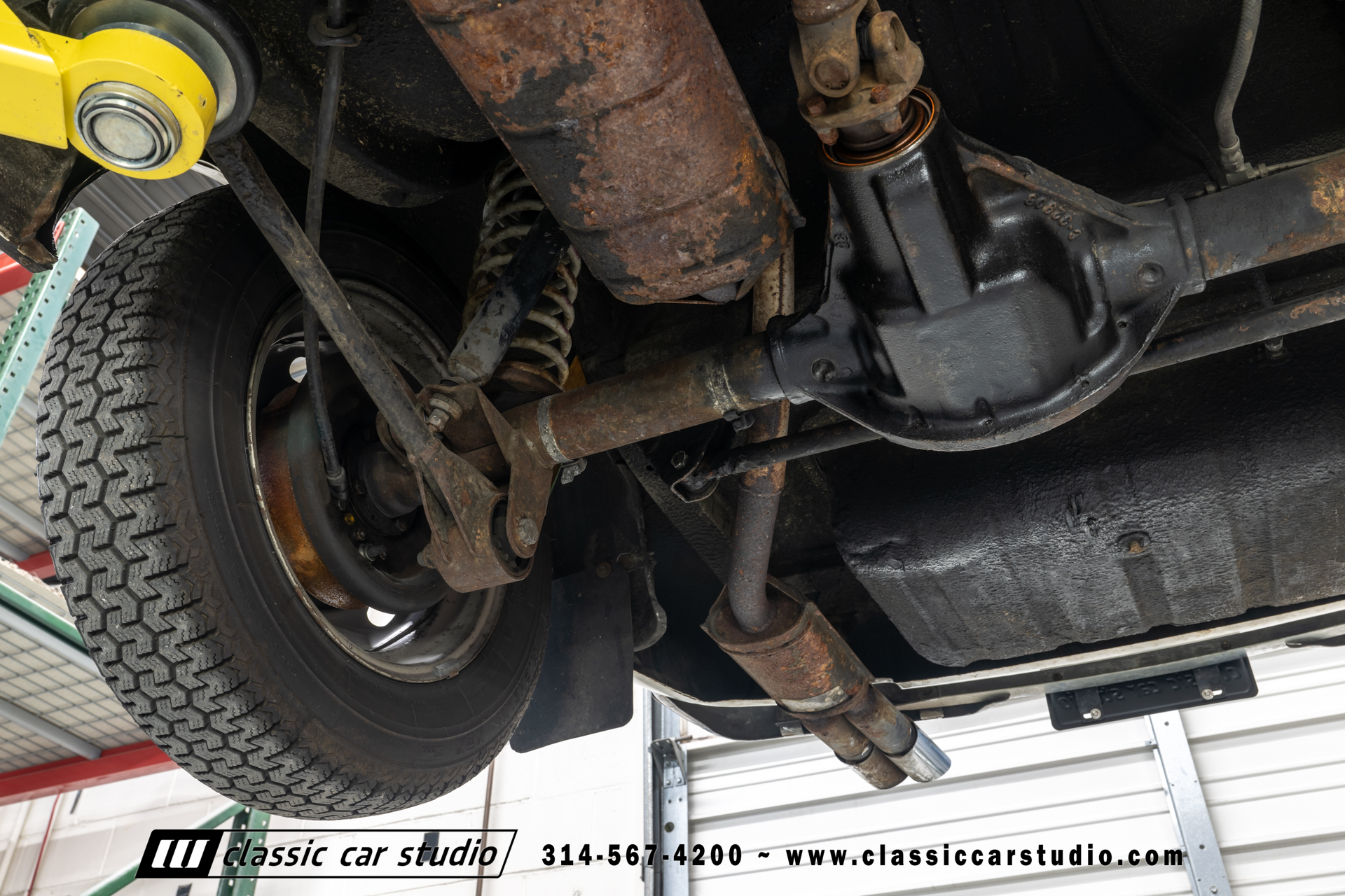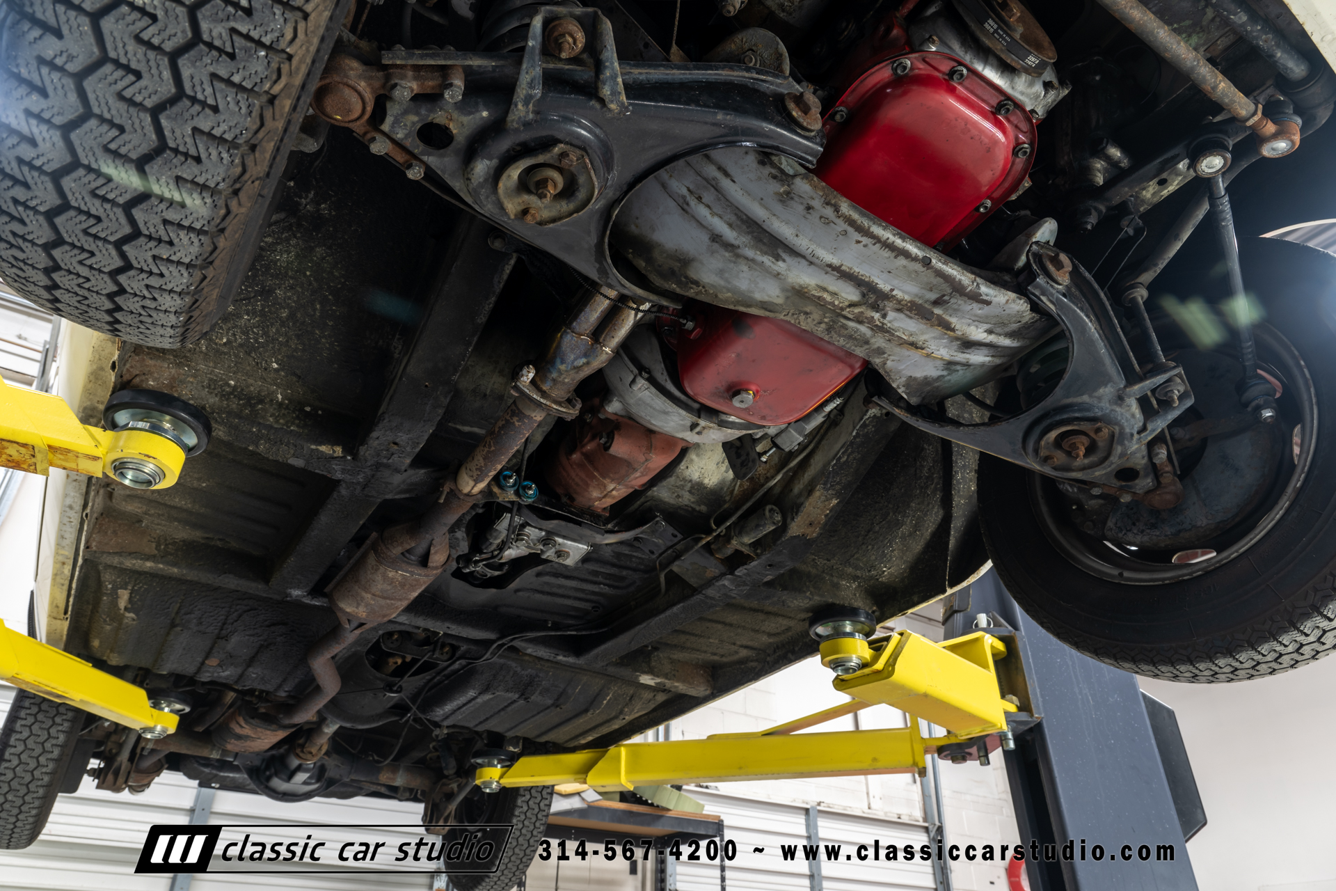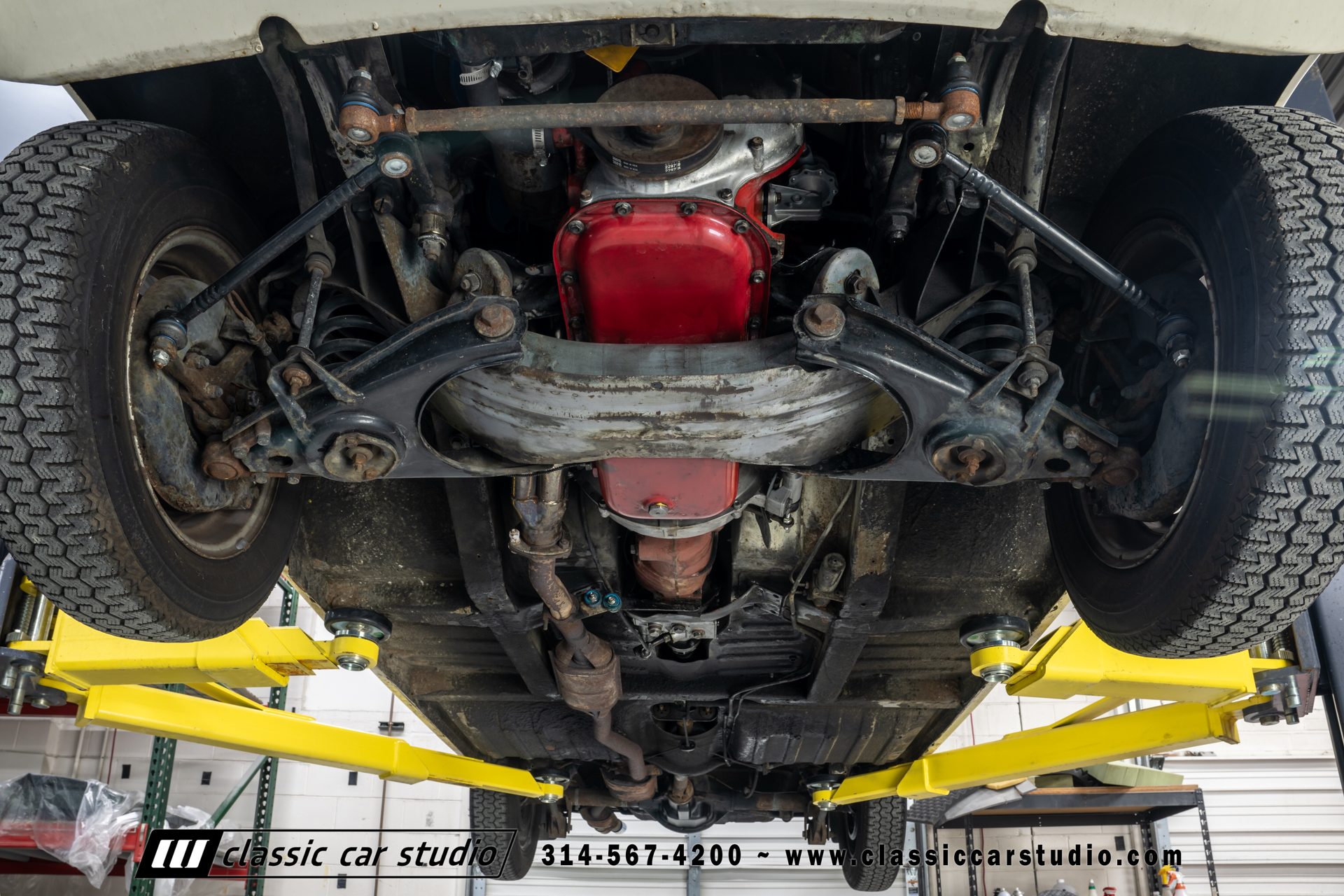 Steel 15″ wheels wear chrome hubcaps and trim rings and are mounted with 165-width Michelin XZX tires. Stopping power is provided by front disc and rear drum brakes. The brake fluid was flushed in preparation for the sale. Corrosion is visible on the wheels.