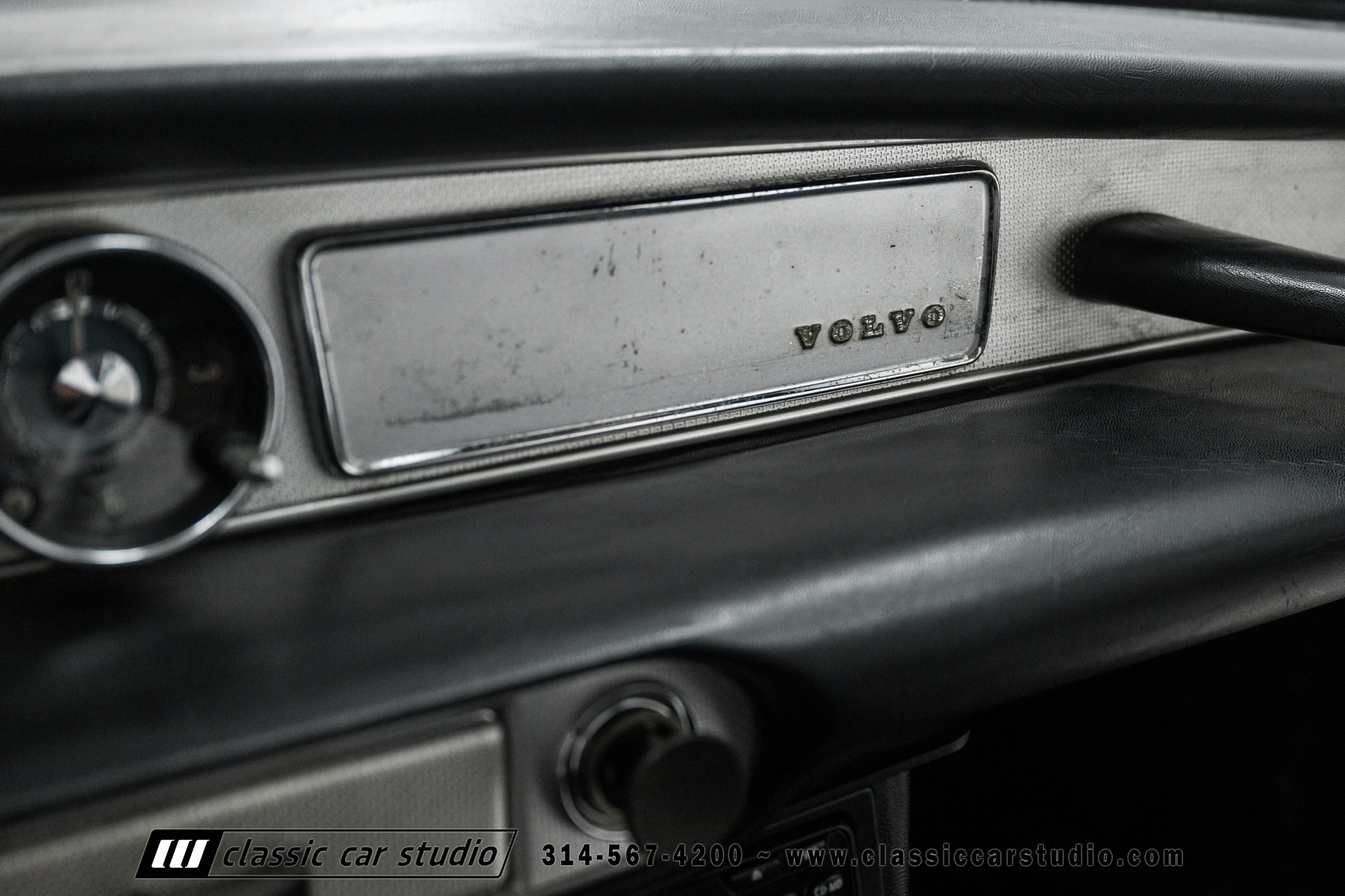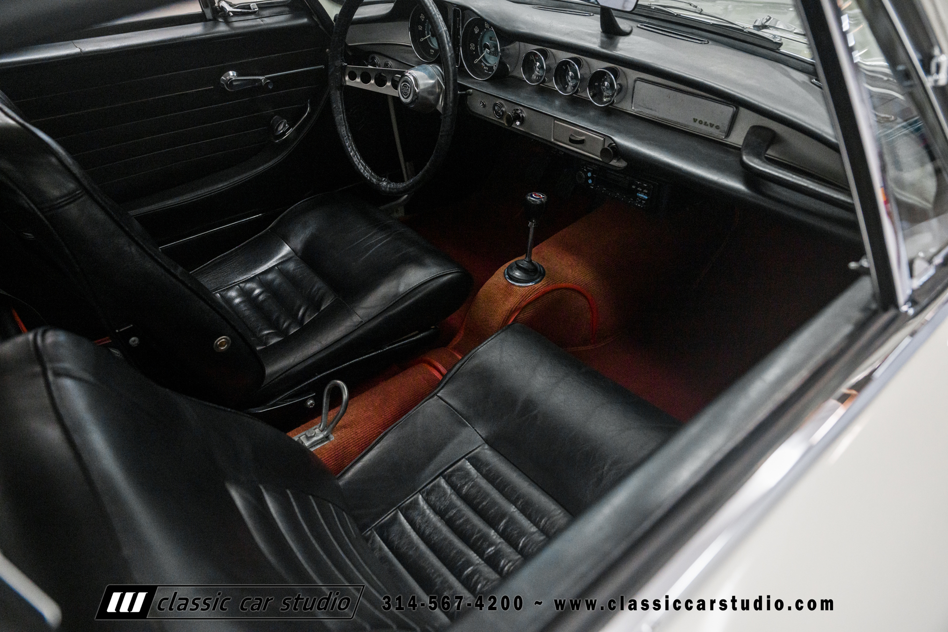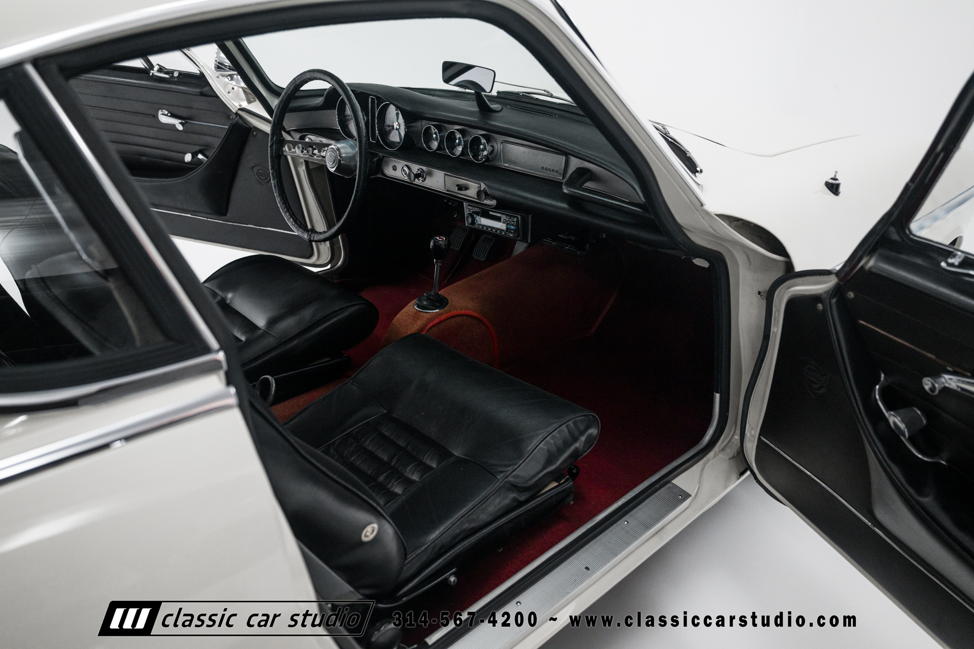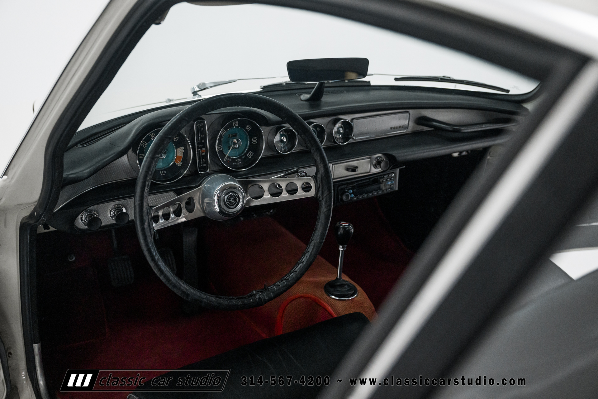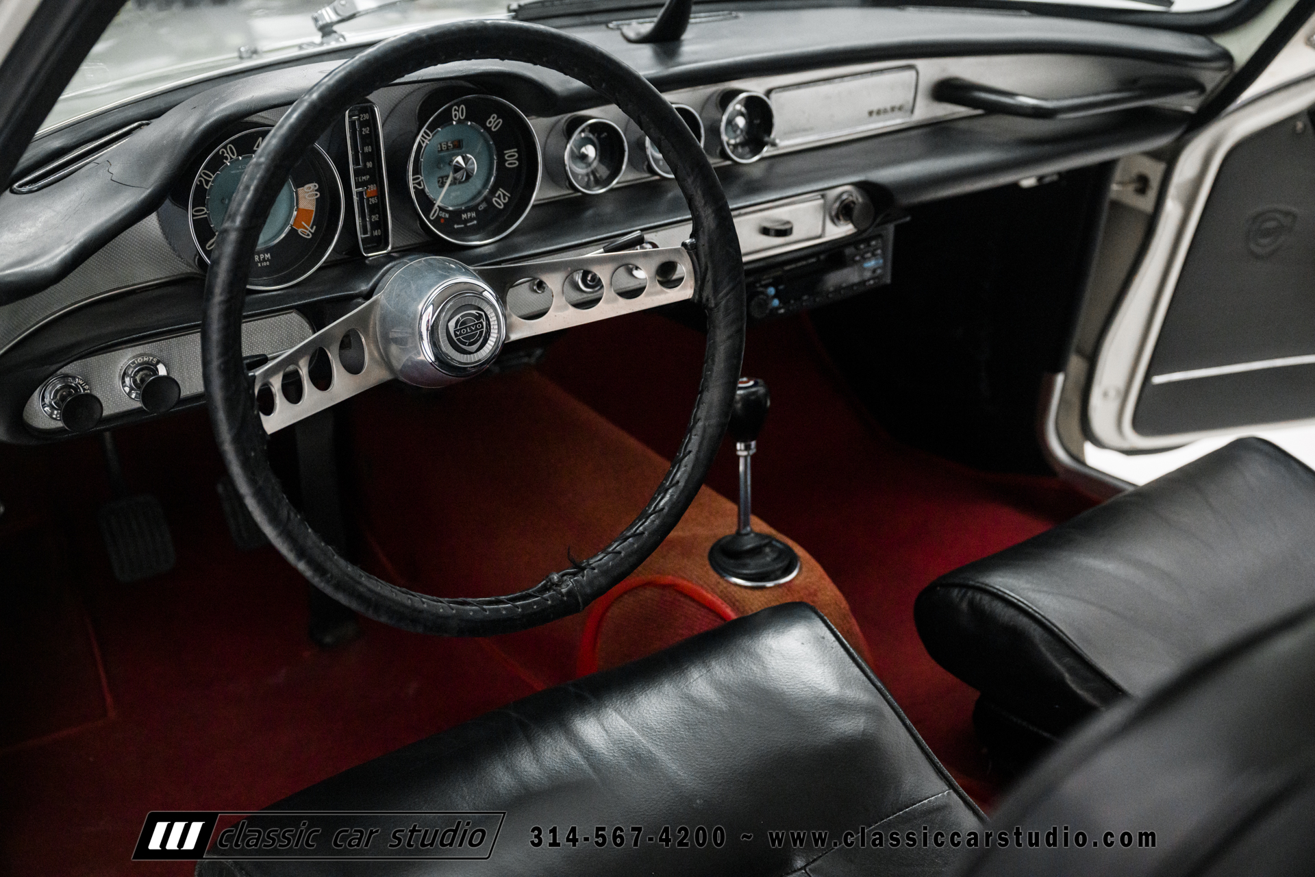 The cabin features front bucket seats and a rear bench upholstered in black vinyl along with a color-coordinated dashboard and door panels. Metal trim accents the dashboard, and equipment includes an analog clock, a heater, a Volvo-branded shift knob, red carpets, and an ESN AM/FM stereo with a cassette player. There a crack in the dashboard above the instrument cluster.