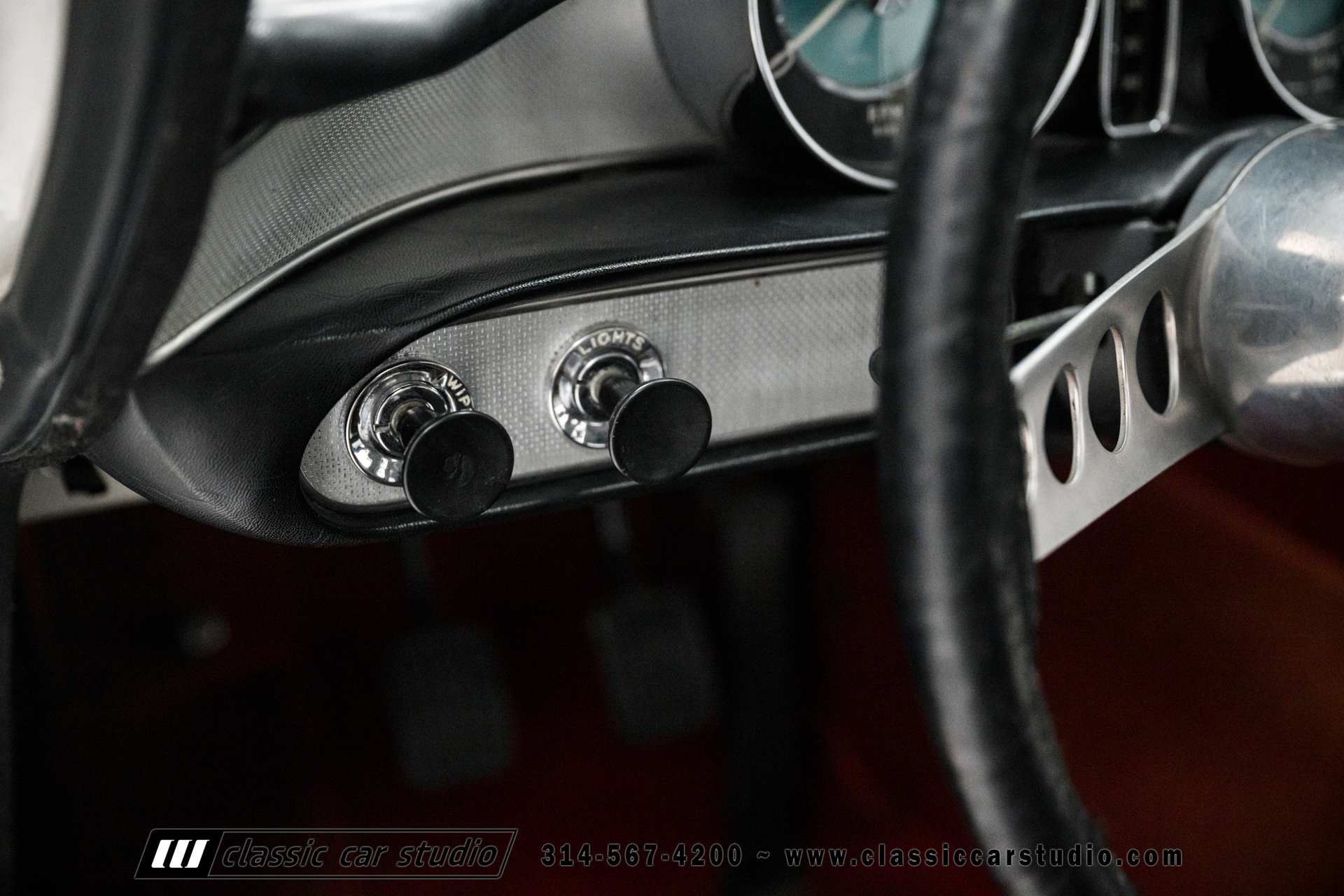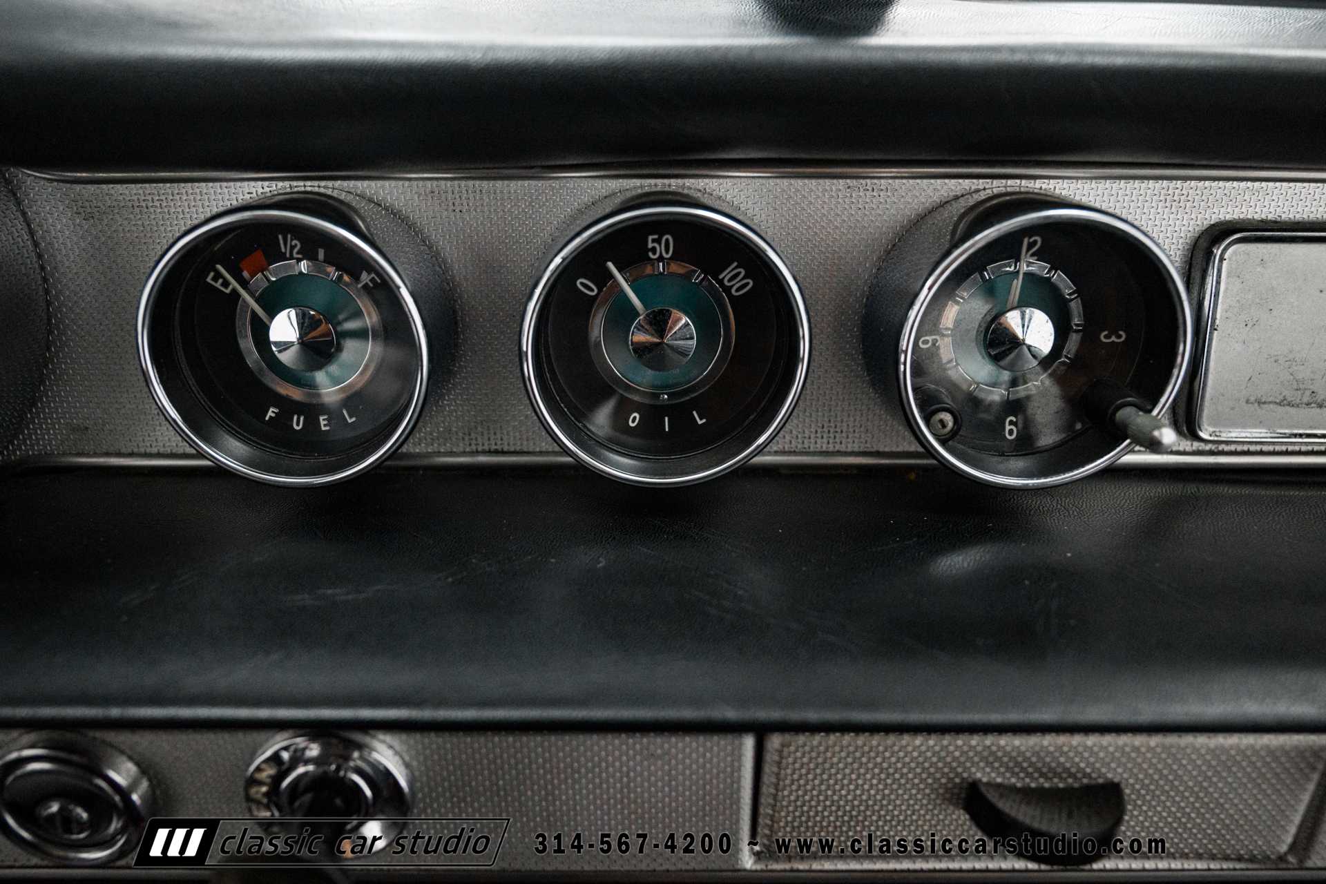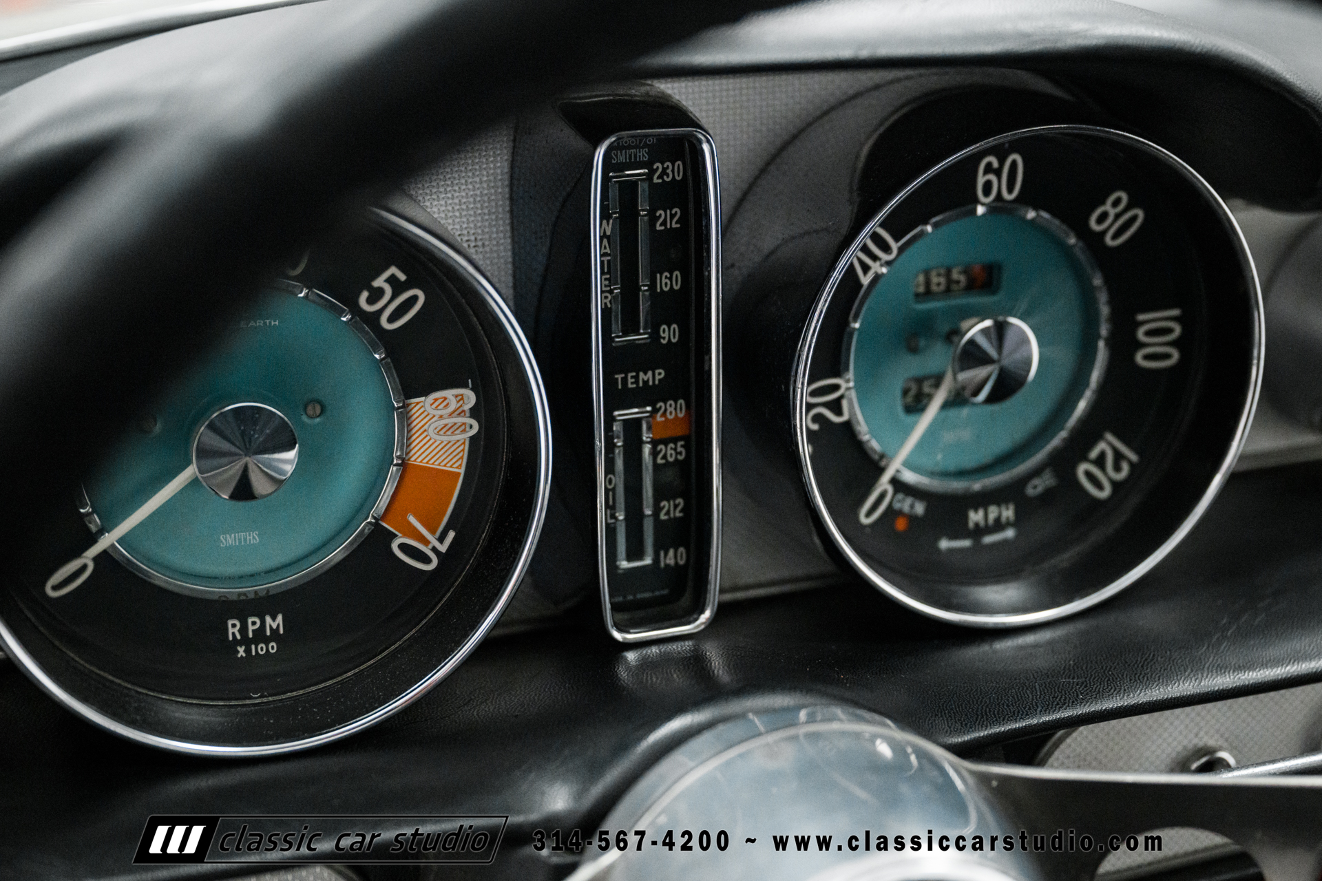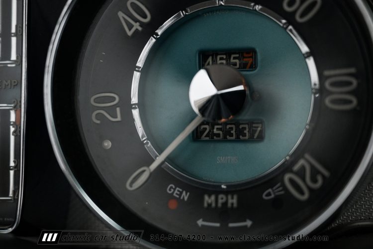 The two-spoke steering wheel wears an aftermarket wrap and frames Smiths instrumentation including a 120-mph speedometer, an inoperative 7k-rpm tachometer, and supplementary vertical gauges for coolant and oil temperature. Additional gauges for fuel level and oil pressure are mounted to the dashboard. The horn does not work. The five-digit mechanical odometer is believed to have rolled over and now shows 25k miles. Total mileage is unknown.