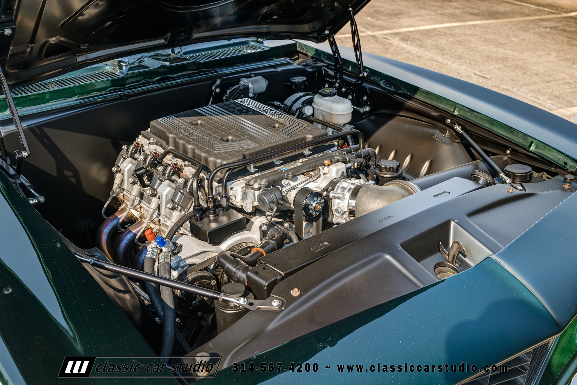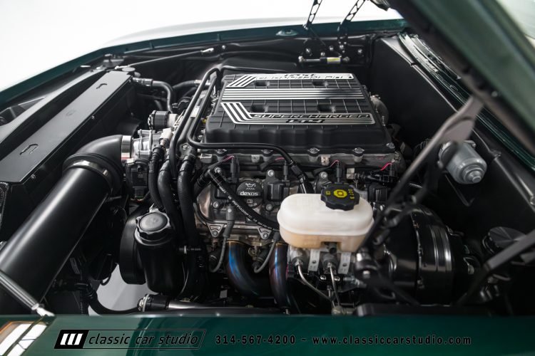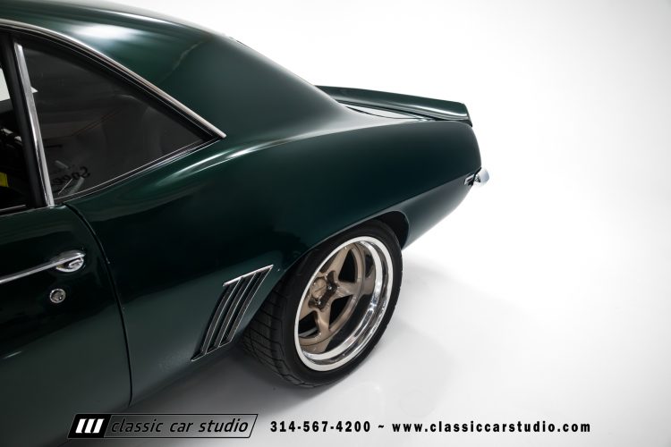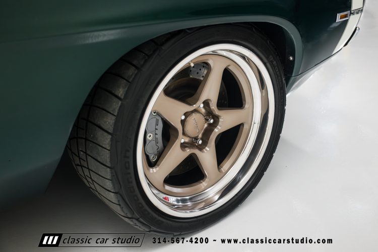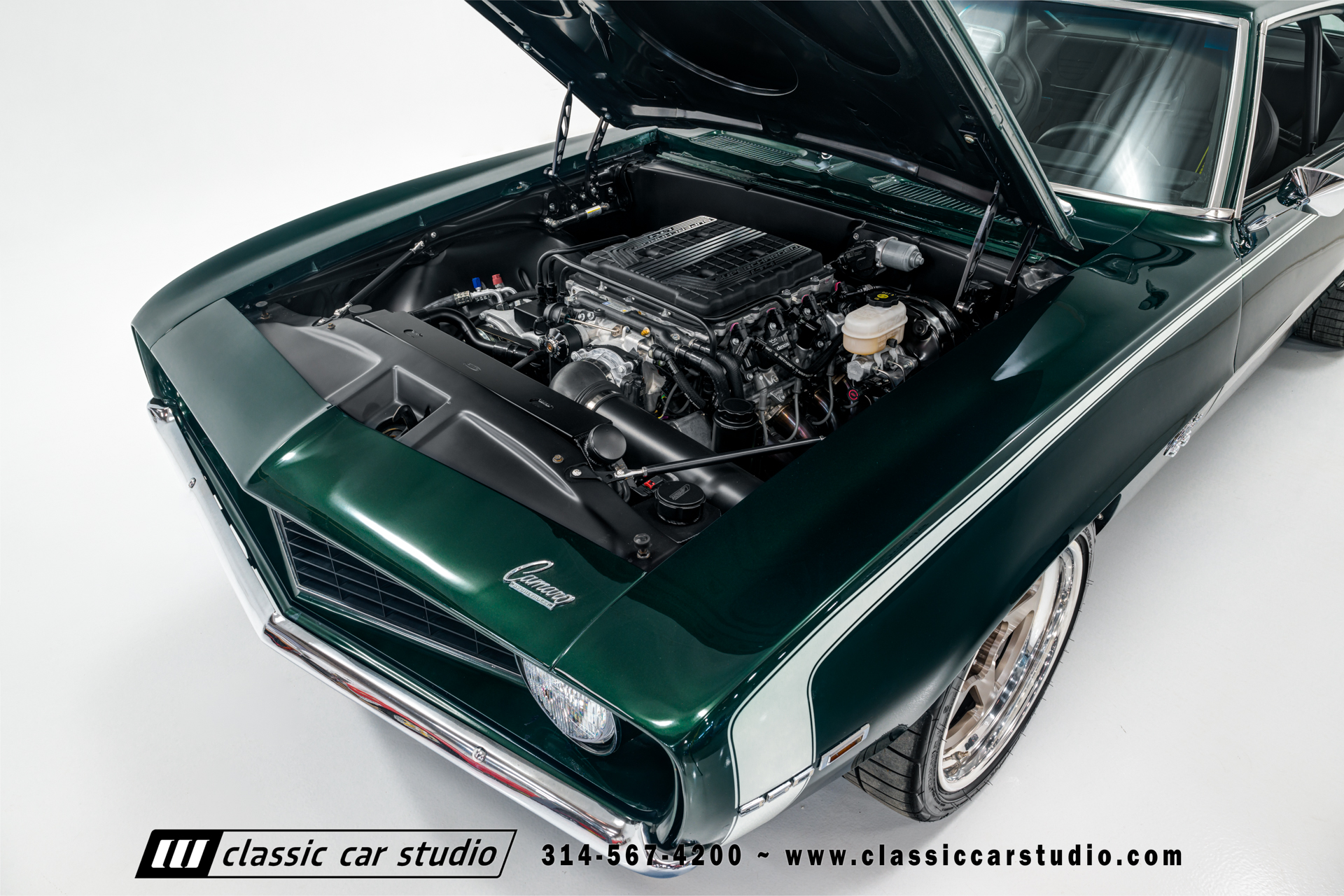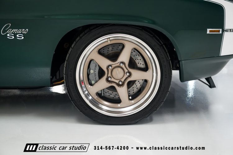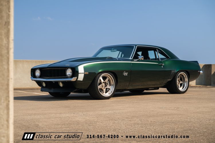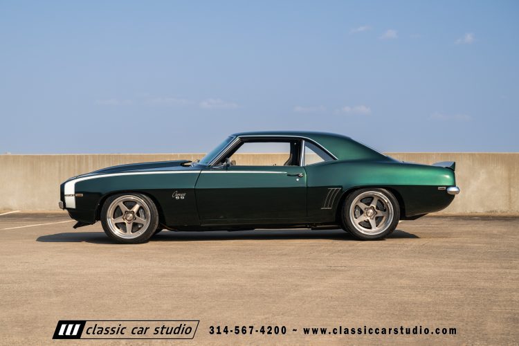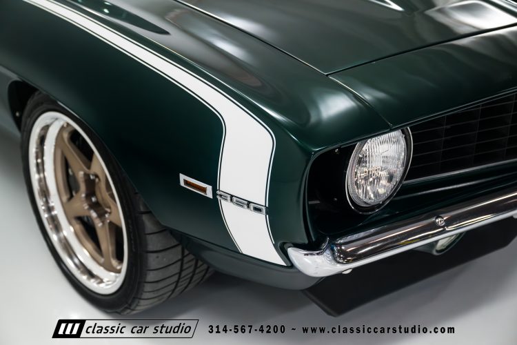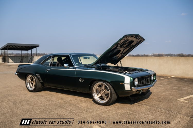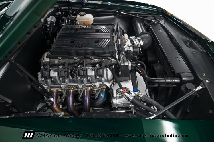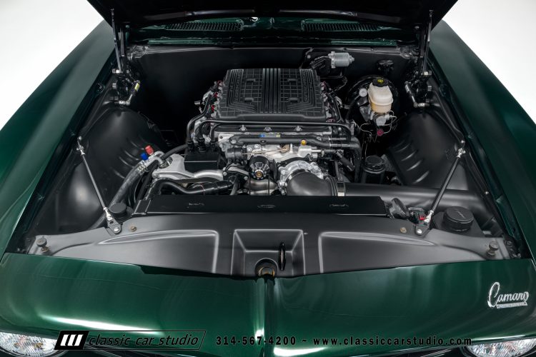 This 1969 Chevrolet Camaro coupe is powered by a 6.2-liter LT4 V8 that is equipped with a Katech supercharger and linked to a Tremec six-speed manual transmission. The car rides on a Detroit Speed suspension kit with a hydroformed front subframe, sway bars, and a Quadralink rear setup, and the Forgeline 18″ wheels are mounted over C6 Z06-specification brakes. The body is finished in dark green with white side stripes and features front and rear spoilers and a cowl induction hood, while the cabin is outfitted with a roll bar, digital climate control, a Kenwood head unit, Hertz audio, cruise control, and black leather Recaro front seats with Schroth harnesses…. (full write up on bringatrailer.com, at the link above)