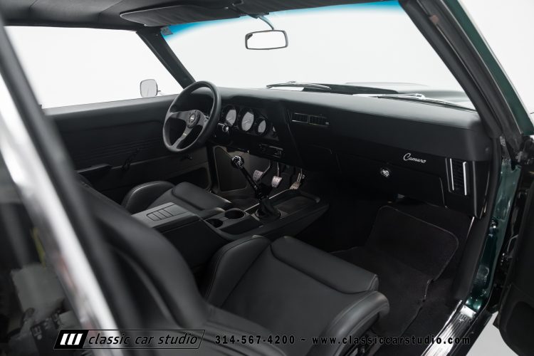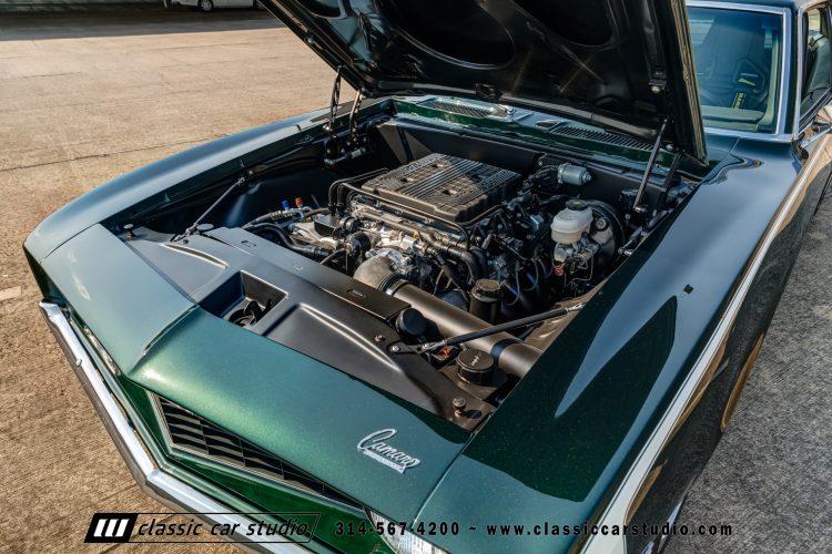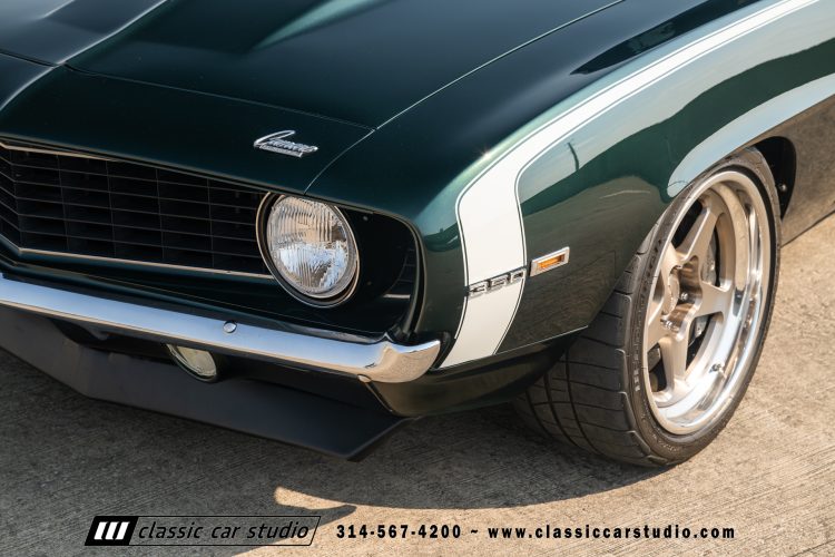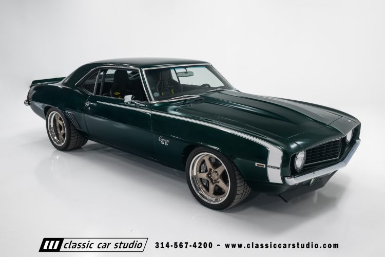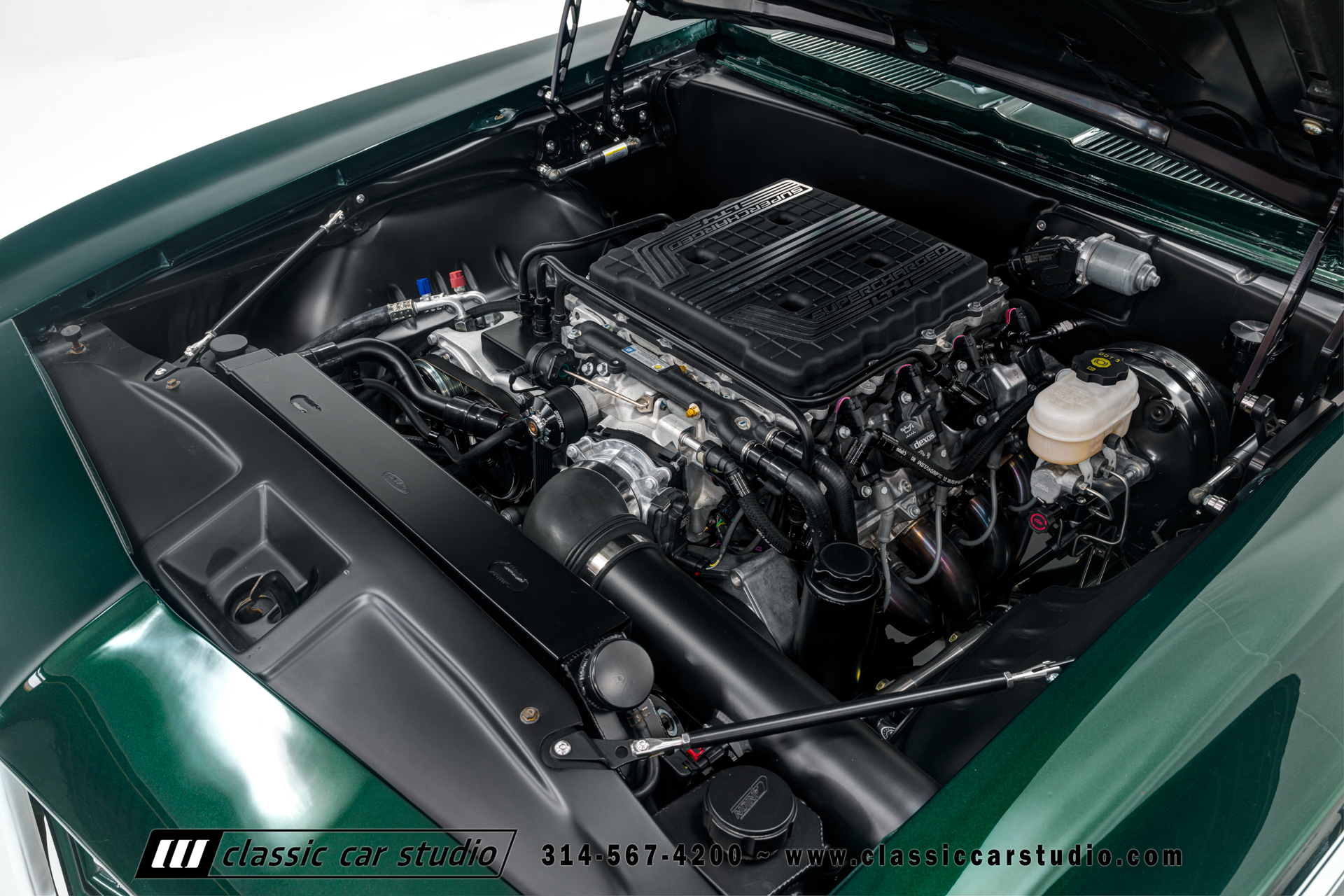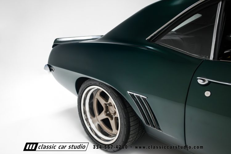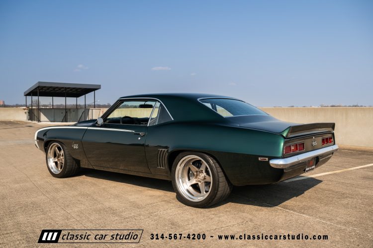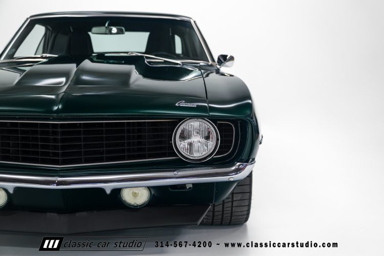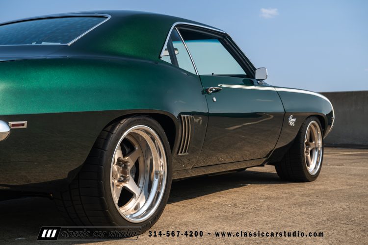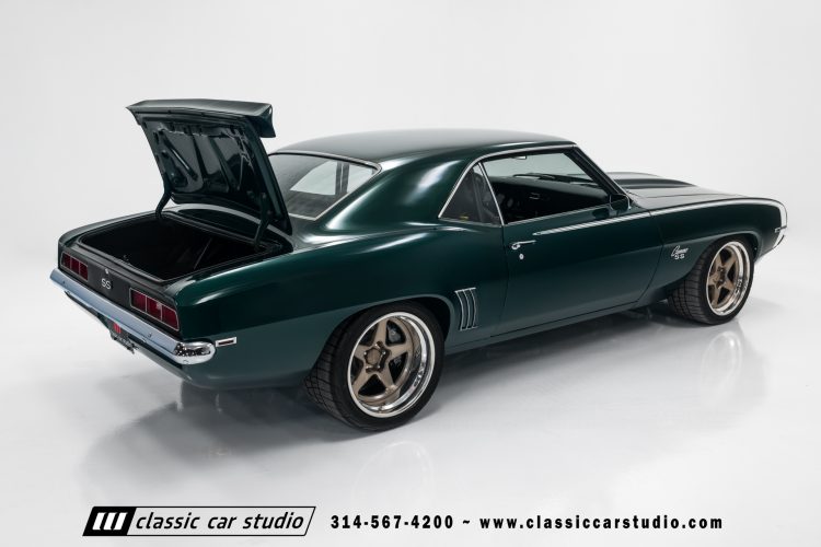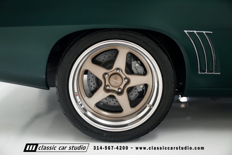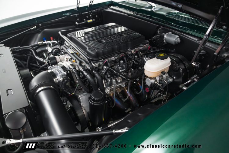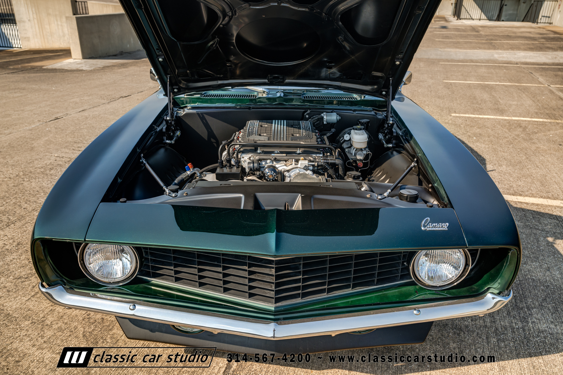 This 1969 Chevrolet Camaro coupe is powered by a 6.2-liter LT4 V8 that is equipped with a Katech supercharger and linked to a Tremec six-speed manual transmission. The car rides on a Detroit Speed suspension kit with a hydroformed front subframe, sway bars, and a Quadralink rear setup, and the Forgeline 18″ wheels are mounted over C6 Z06-specification brakes. The body is finished in dark green with white side stripes and features front and rear spoilers and a cowl induction hood, while the cabin is outfitted with a roll bar, digital climate control, a Kenwood head unit, Hertz audio, cruise control, and black leather Recaro front seats with Schroth harnesses…. (full write up on bringatrailer.com, at the link above)