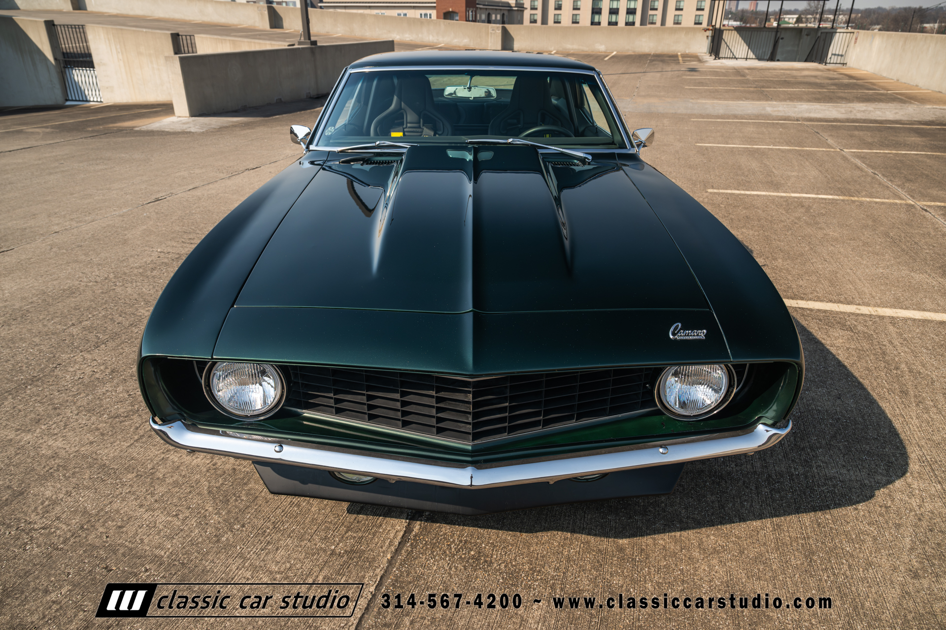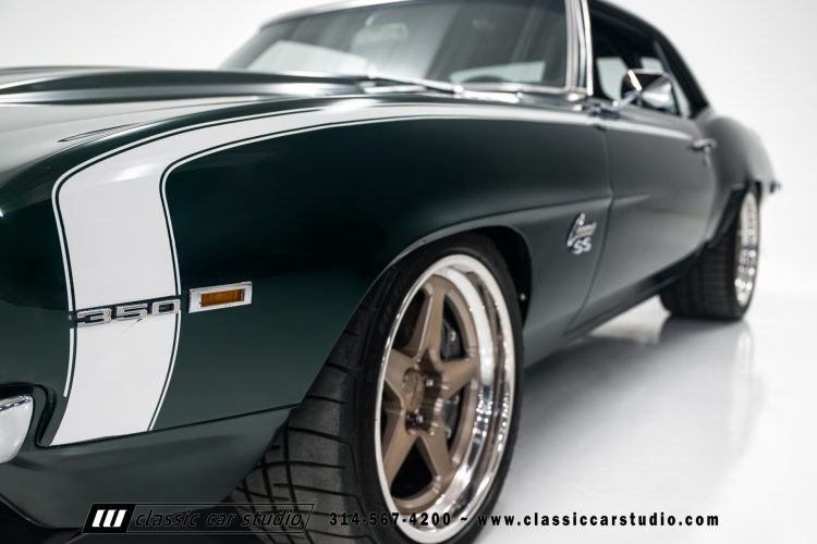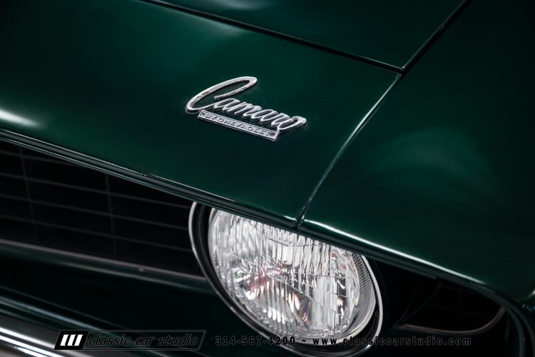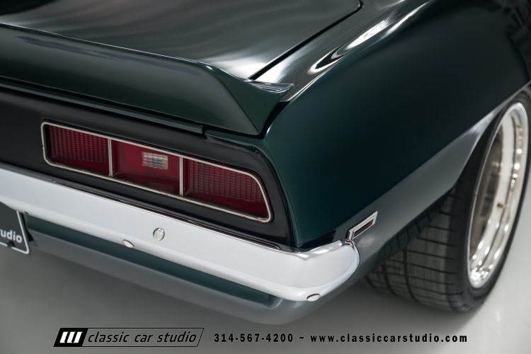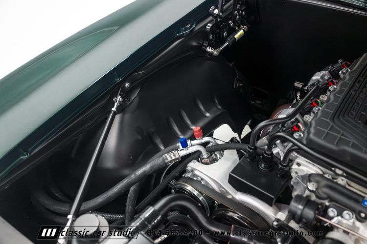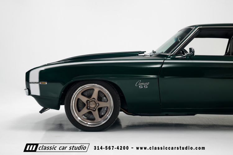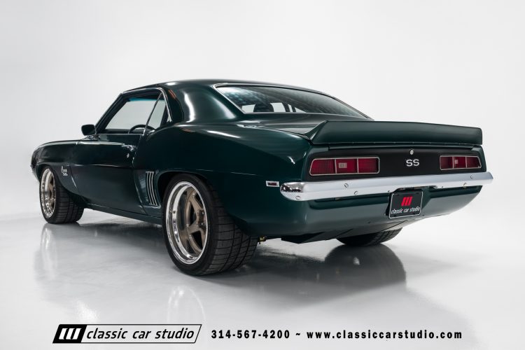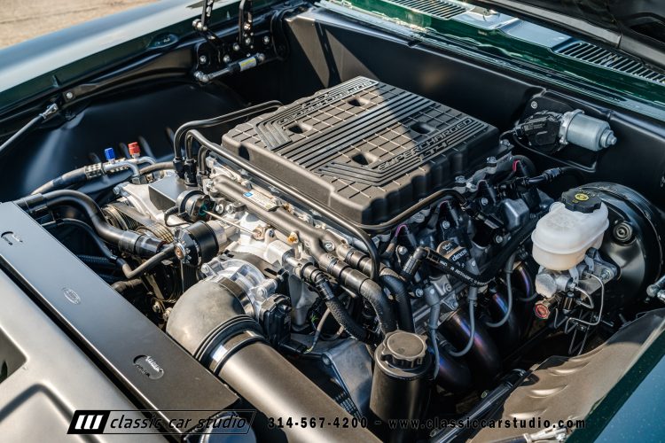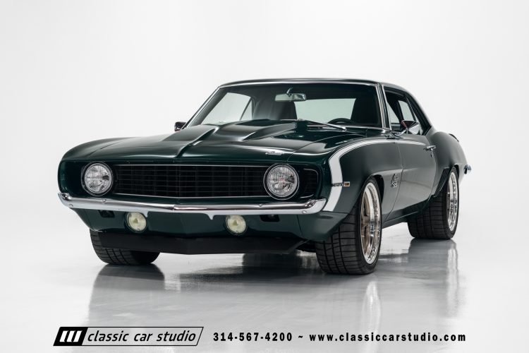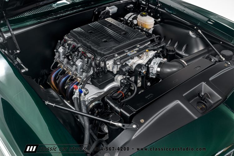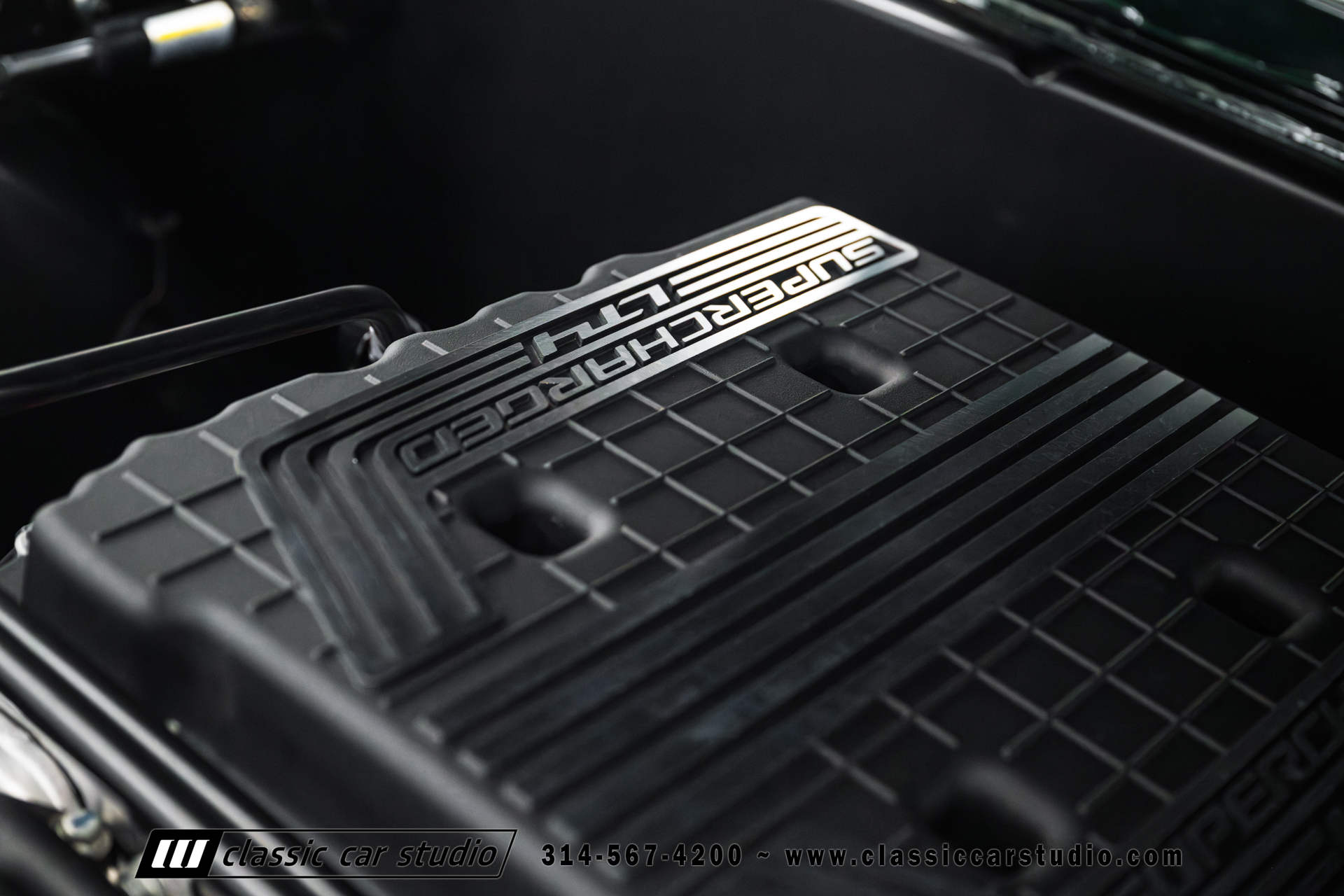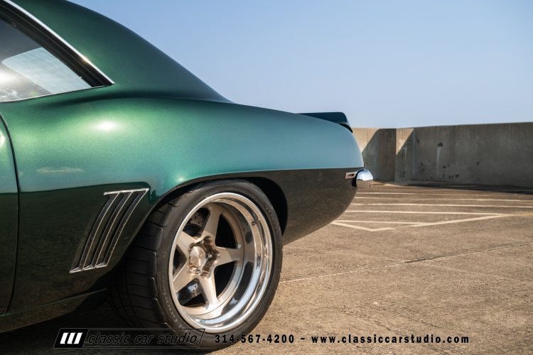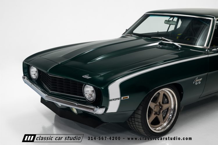 This 1969 Chevrolet Camaro coupe is powered by a 6.2-liter LT4 V8 that is equipped with a Katech supercharger and linked to a Tremec six-speed manual transmission. The car rides on a Detroit Speed suspension kit with a hydroformed front subframe, sway bars, and a Quadralink rear setup, and the Forgeline 18″ wheels are mounted over C6 Z06-specification brakes. The body is finished in dark green with white side stripes and features front and rear spoilers and a cowl induction hood, while the cabin is outfitted with a roll bar, digital climate control, a Kenwood head unit, Hertz audio, cruise control, and black leather Recaro front seats with Schroth harnesses…. (full write up on bringatrailer.com, at the link above)