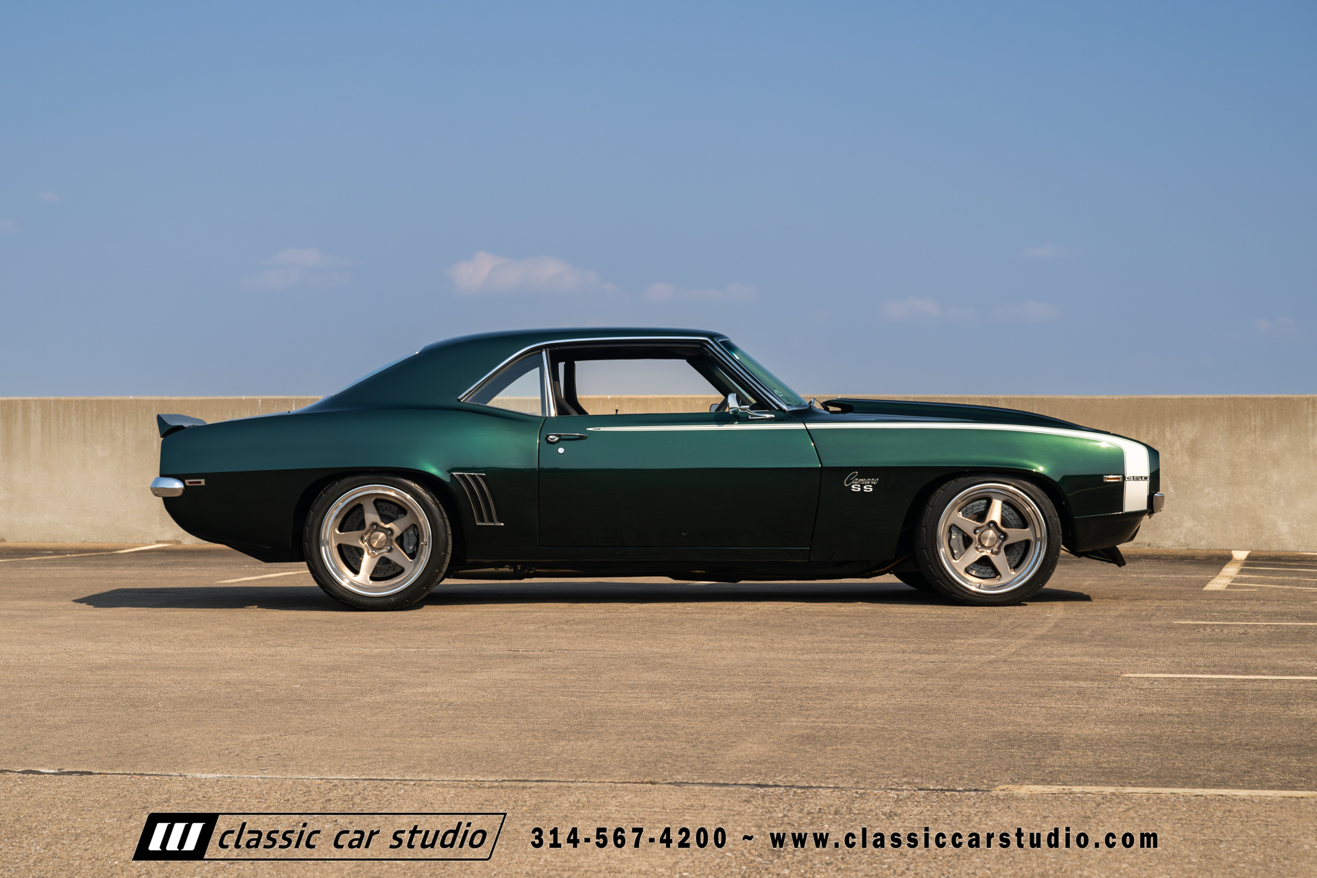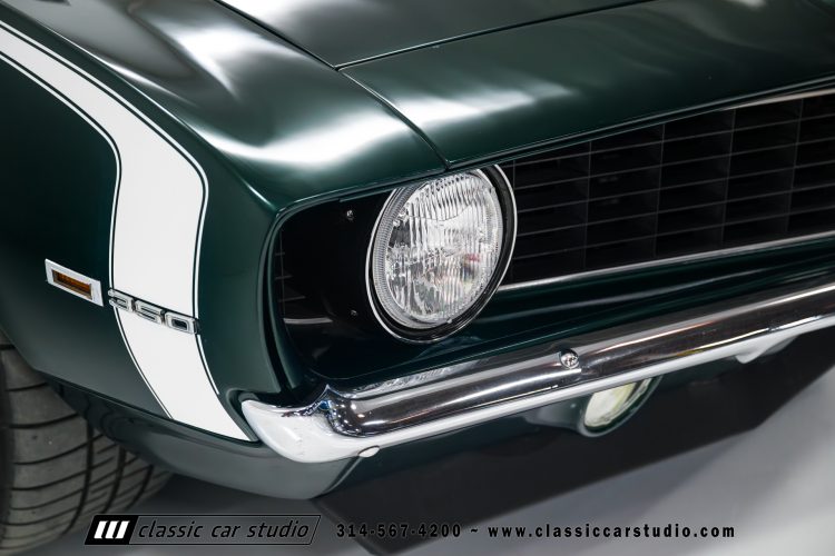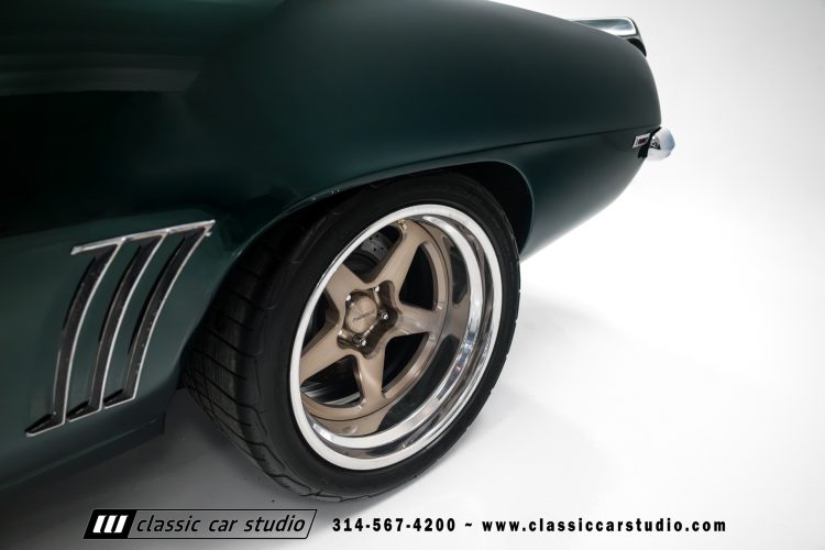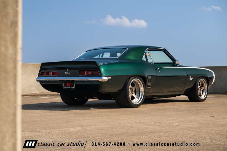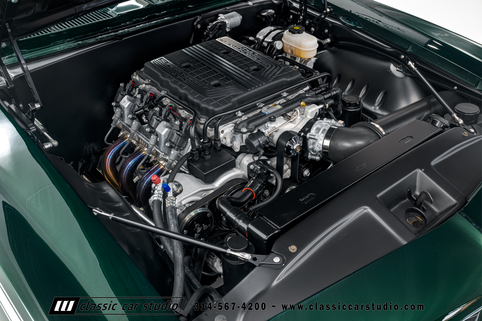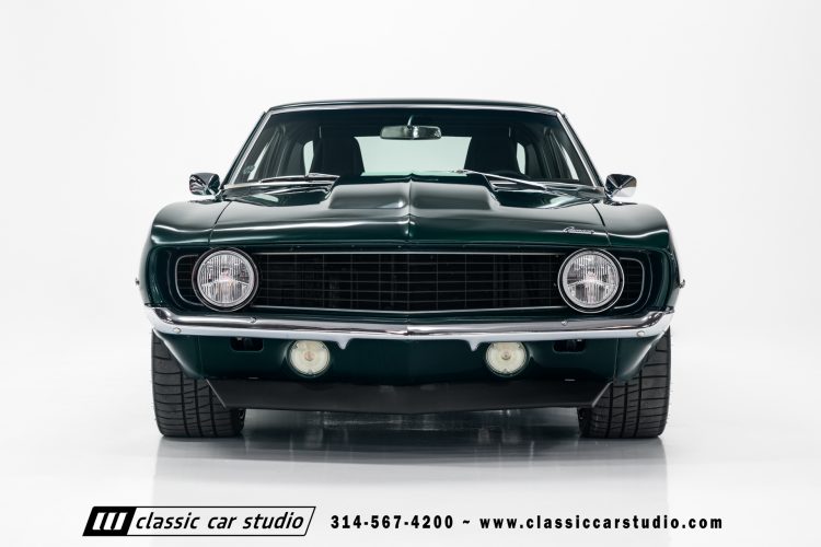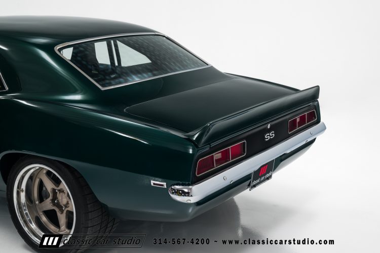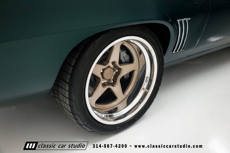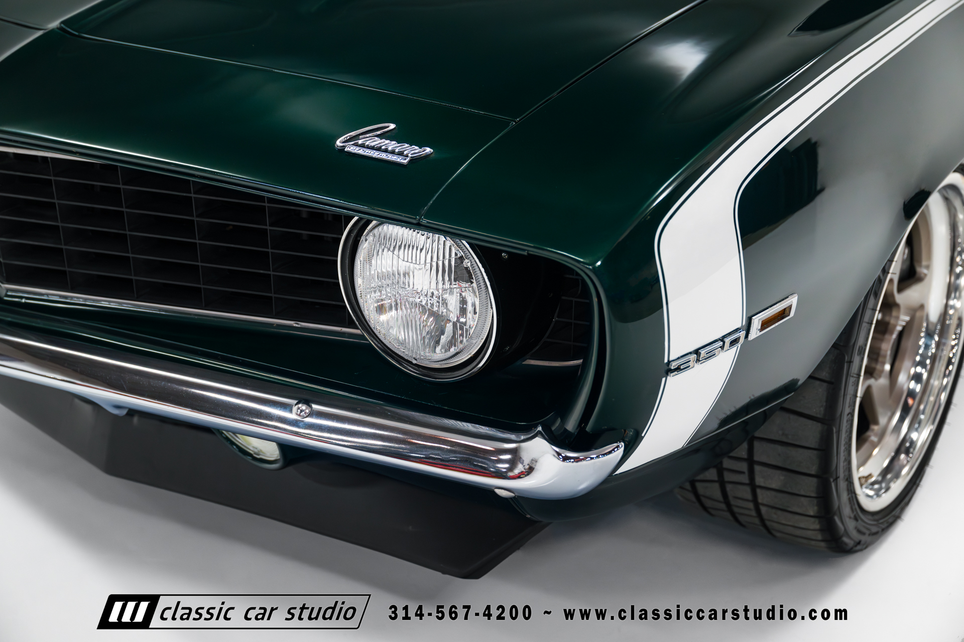 This 1969 Chevrolet Camaro coupe is powered by a 6.2-liter LT4 V8 that is equipped with a Katech supercharger and linked to a Tremec six-speed manual transmission. The car rides on a Detroit Speed suspension kit with a hydroformed front subframe, sway bars, and a Quadralink rear setup, and the Forgeline 18″ wheels are mounted over C6 Z06-specification brakes. The body is finished in dark green with white side stripes and features front and rear spoilers and a cowl induction hood, while the cabin is outfitted with a roll bar, digital climate control, a Kenwood head unit, Hertz audio, cruise control, and black leather Recaro front seats with Schroth harnesses…. (full write up on bringatrailer.com, at the link above)
