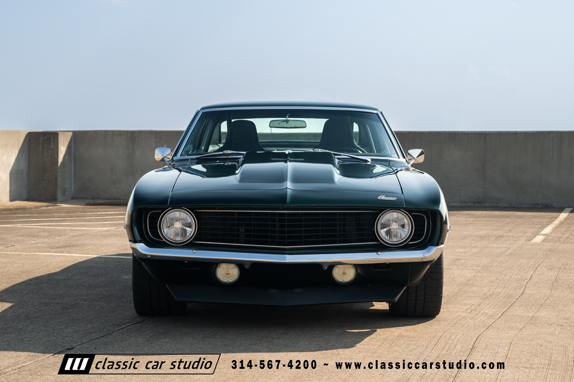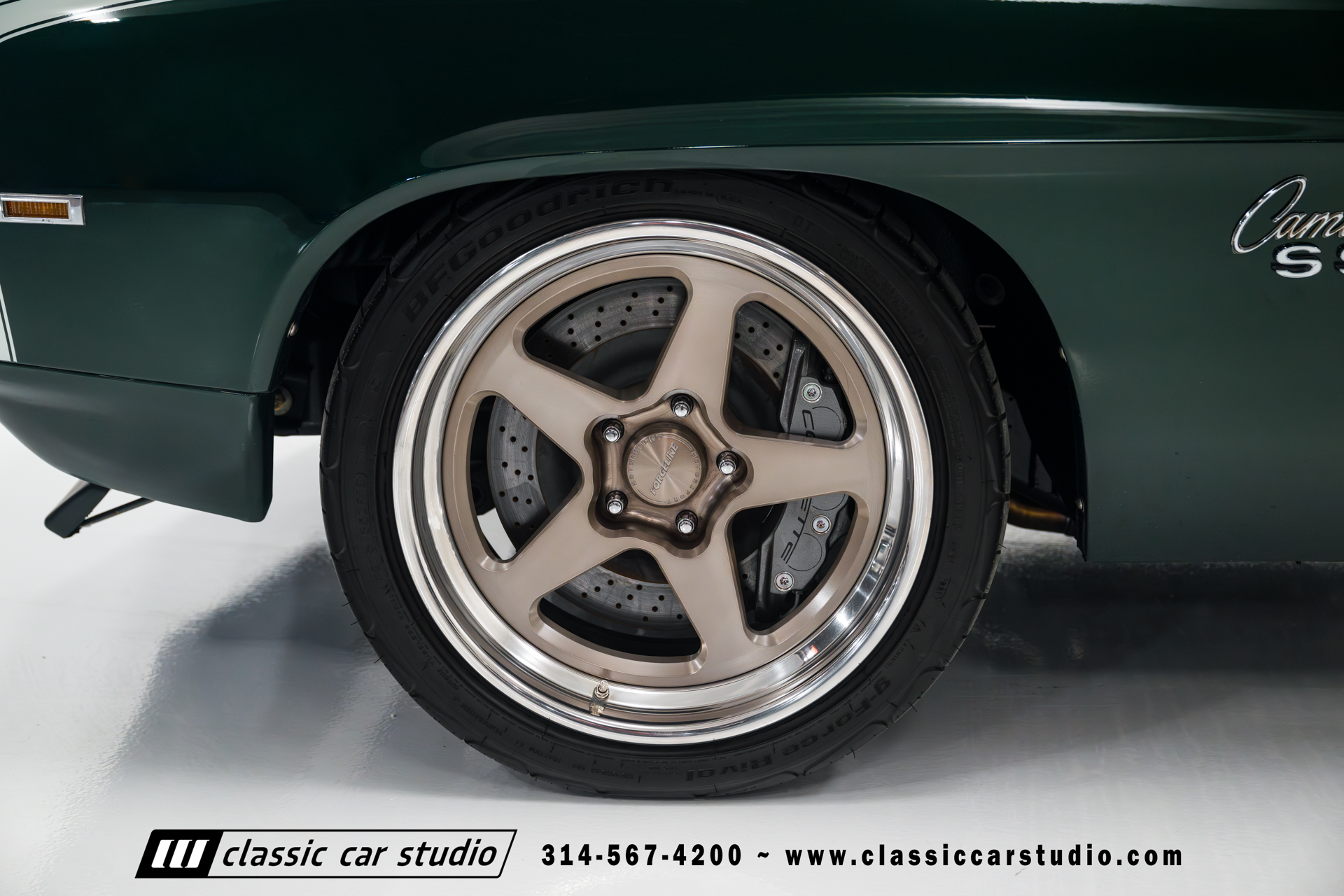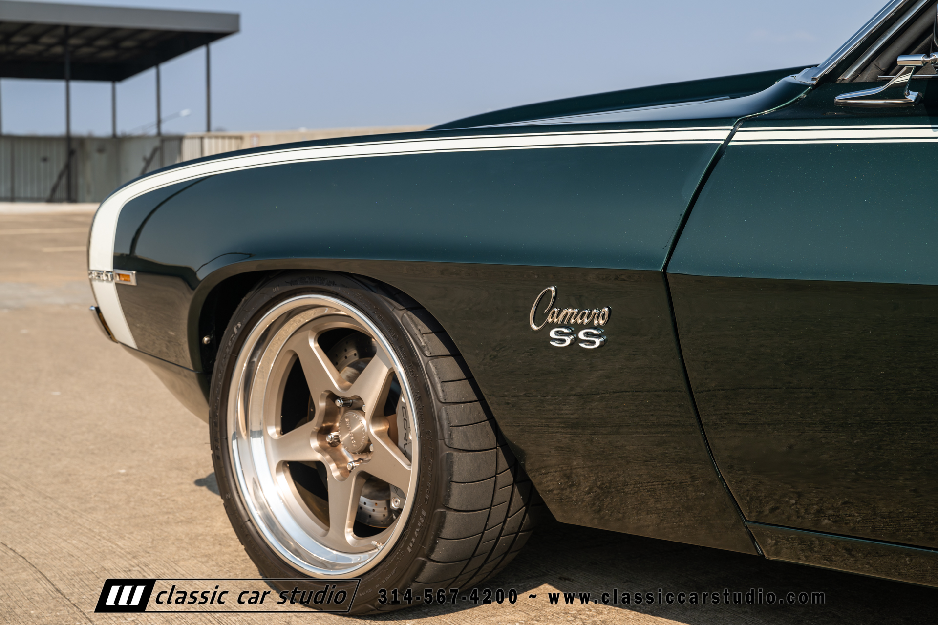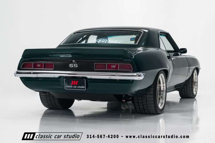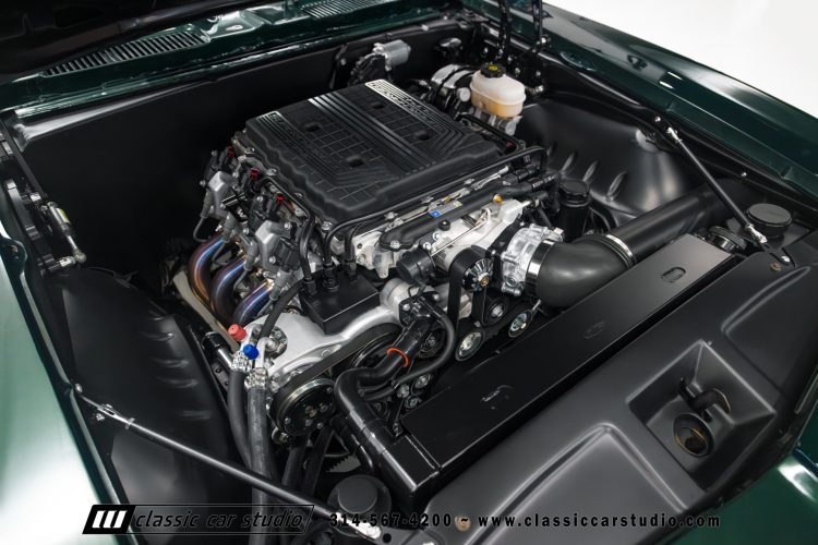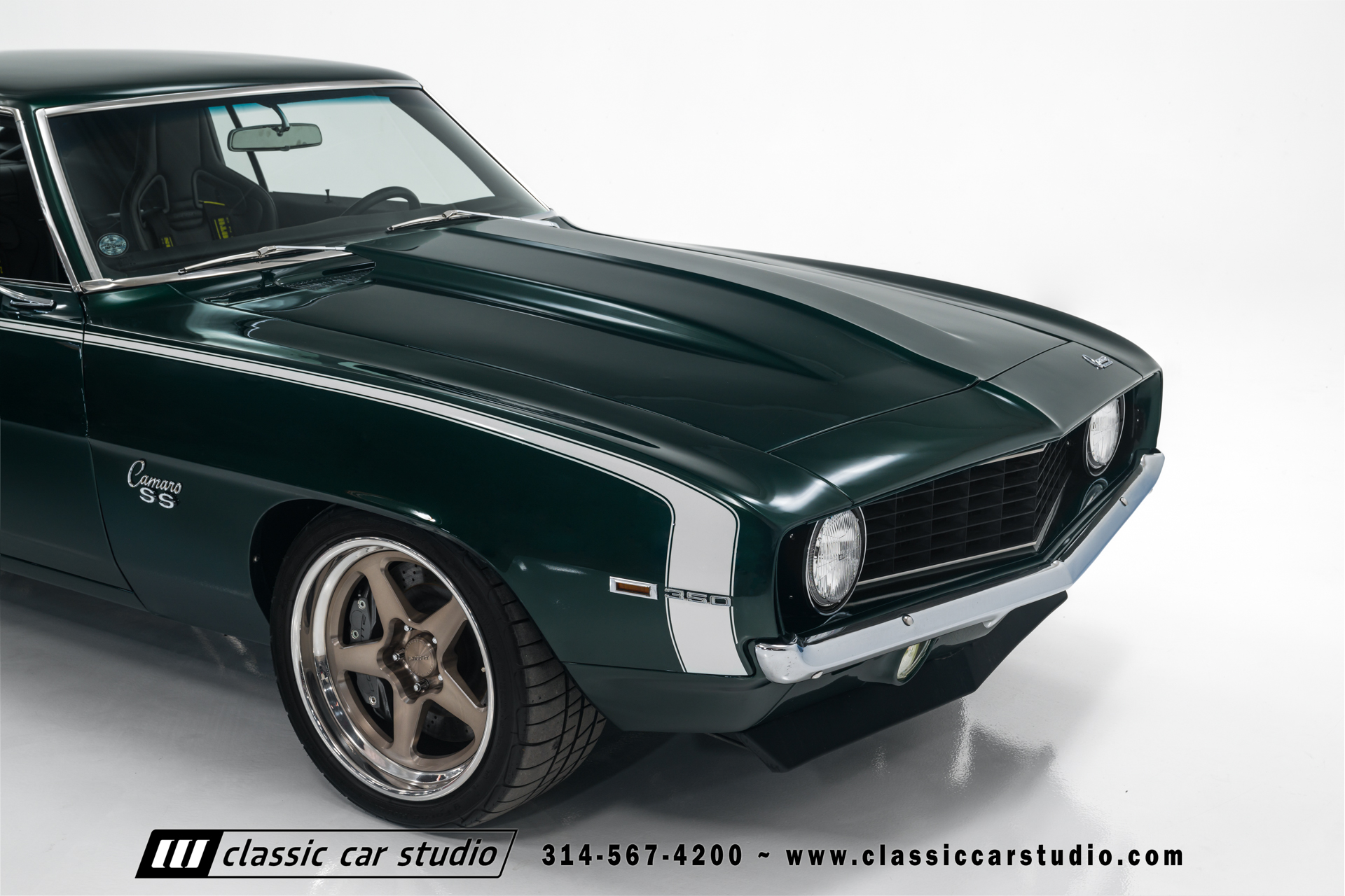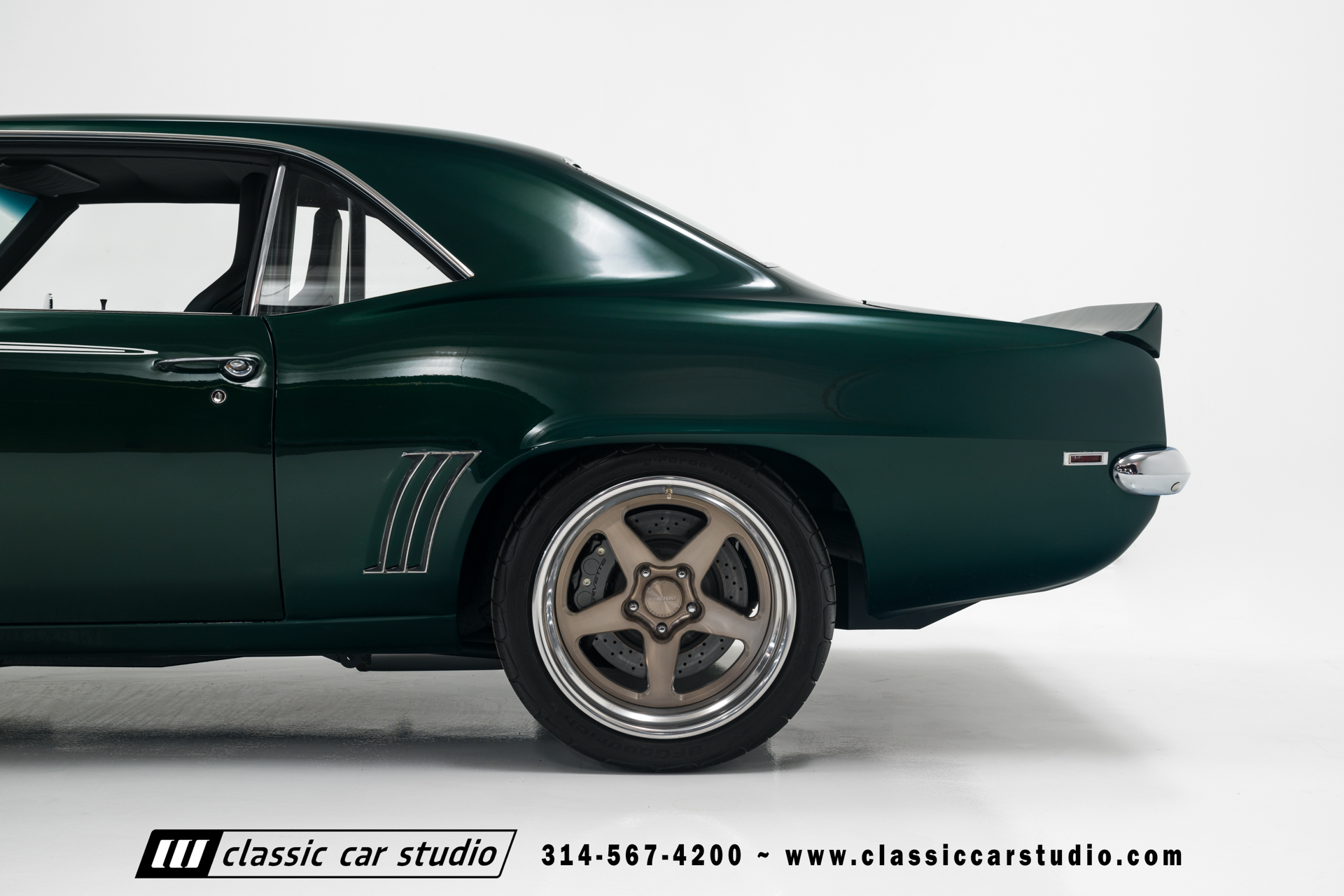 This 1969 Chevrolet Camaro coupe is powered by a 6.2-liter LT4 V8 that is equipped with a Katech supercharger and linked to a Tremec six-speed manual transmission. The car rides on a Detroit Speed suspension kit with a hydroformed front subframe, sway bars, and a Quadralink rear setup, and the Forgeline 18″ wheels are mounted over C6 Z06-specification brakes. The body is finished in dark green with white side stripes and features front and rear spoilers and a cowl induction hood, while the cabin is outfitted with a roll bar, digital climate control, a Kenwood head unit, Hertz audio, cruise control, and black leather Recaro front seats with Schroth harnesses…. (full write up on bringatrailer.com, at the link above)
