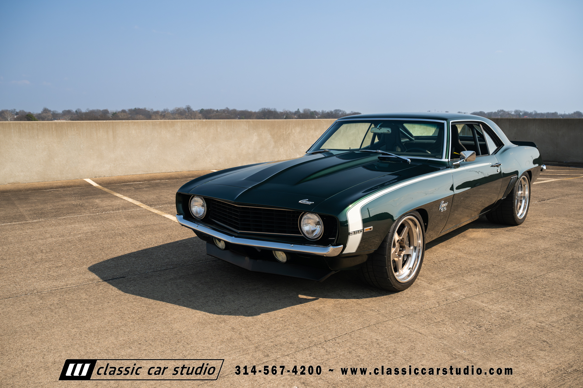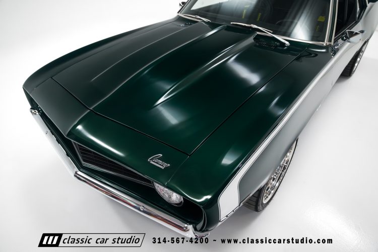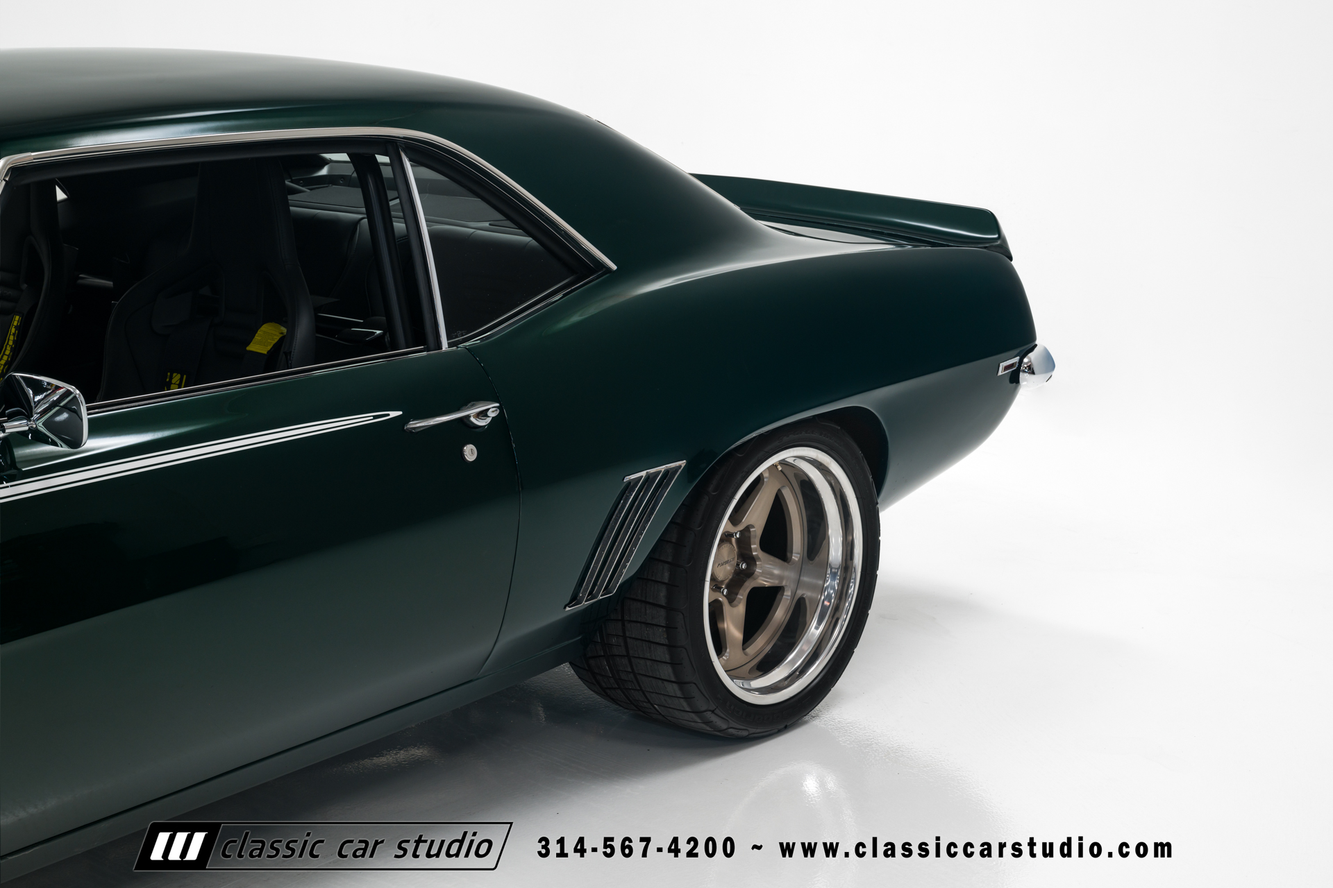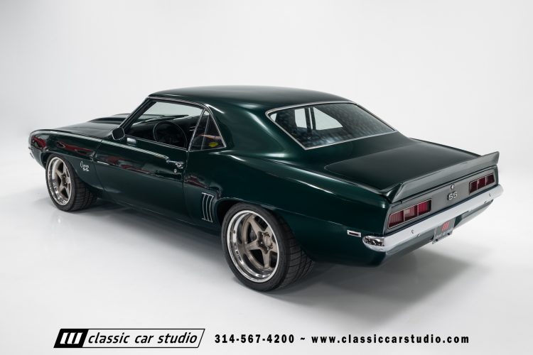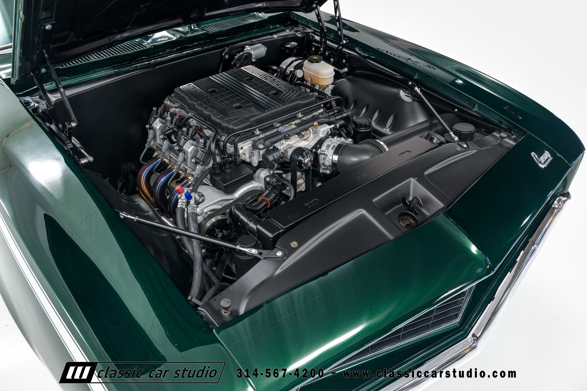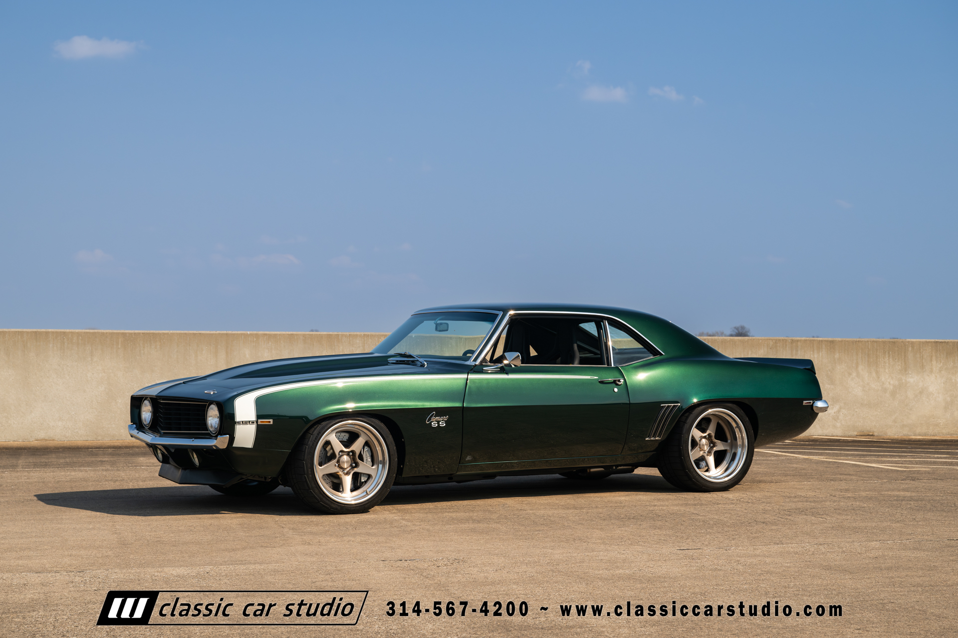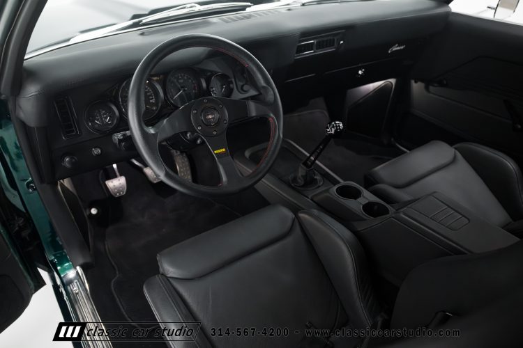 This 1969 Chevrolet Camaro coupe is powered by a 6.2-liter LT4 V8 that is equipped with a Katech supercharger and linked to a Tremec six-speed manual transmission. The car rides on a Detroit Speed suspension kit with a hydroformed front subframe, sway bars, and a Quadralink rear setup, and the Forgeline 18″ wheels are mounted over C6 Z06-specification brakes. The body is finished in dark green with white side stripes and features front and rear spoilers and a cowl induction hood, while the cabin is outfitted with a roll bar, digital climate control, a Kenwood head unit, Hertz audio, cruise control, and black leather Recaro front seats with Schroth harnesses…. (full write up on bringatrailer.com, at the link above)