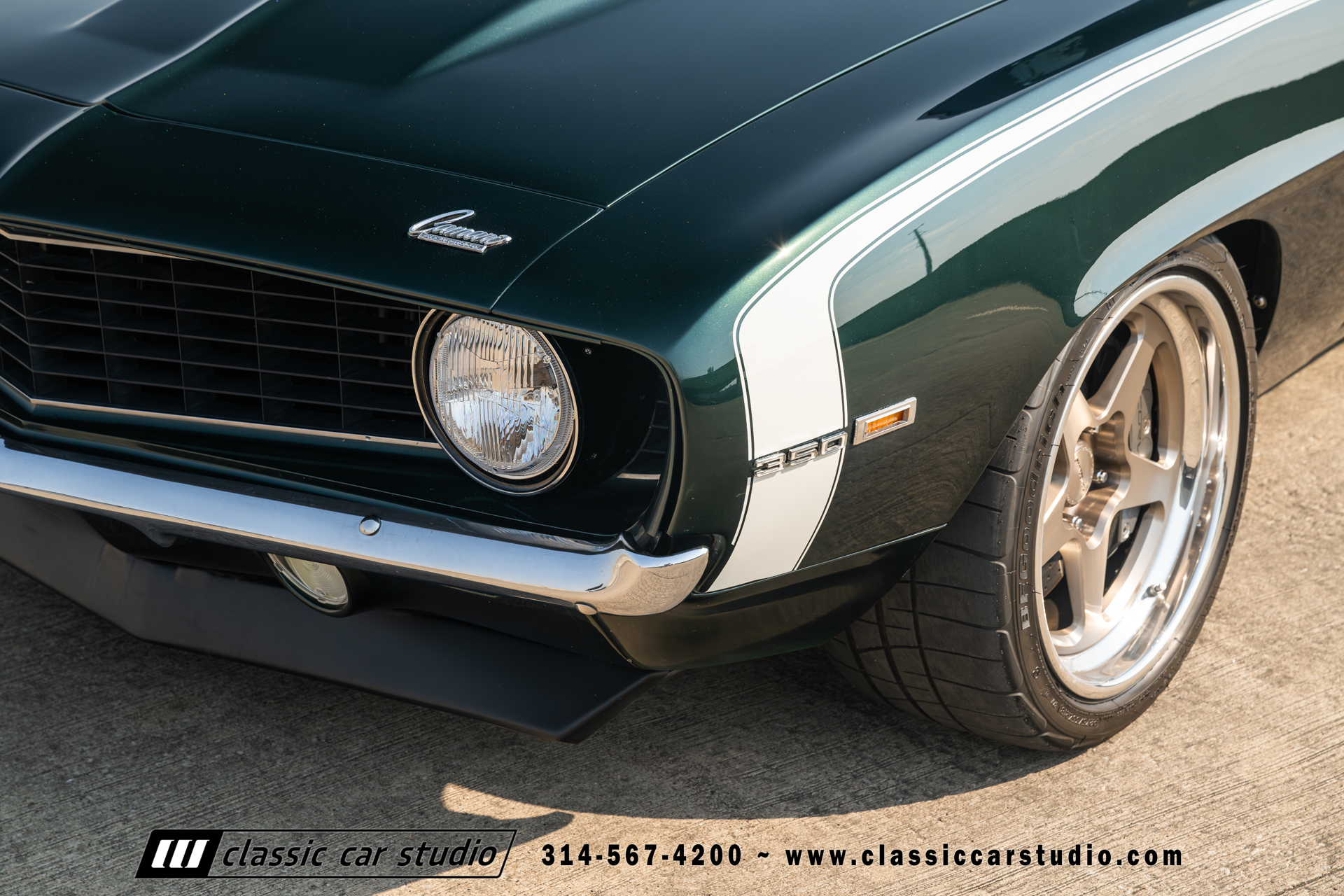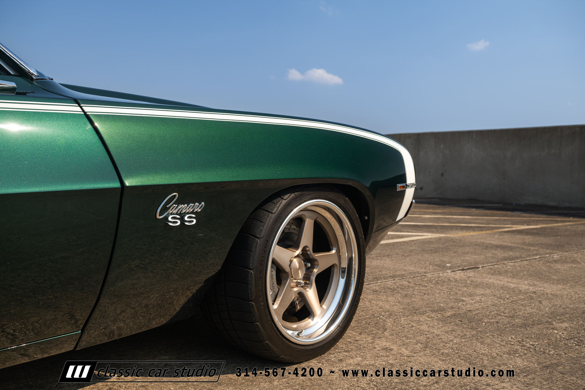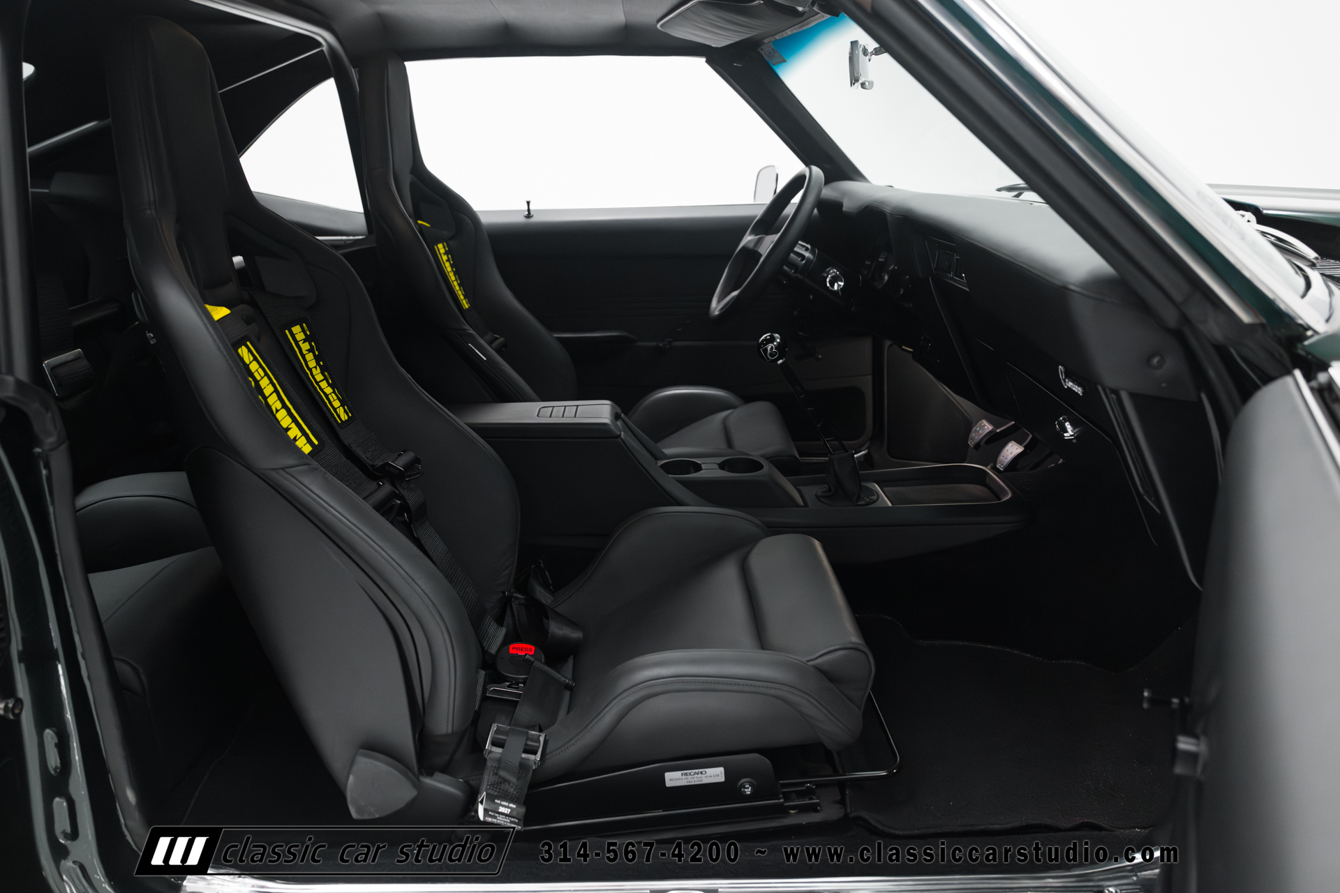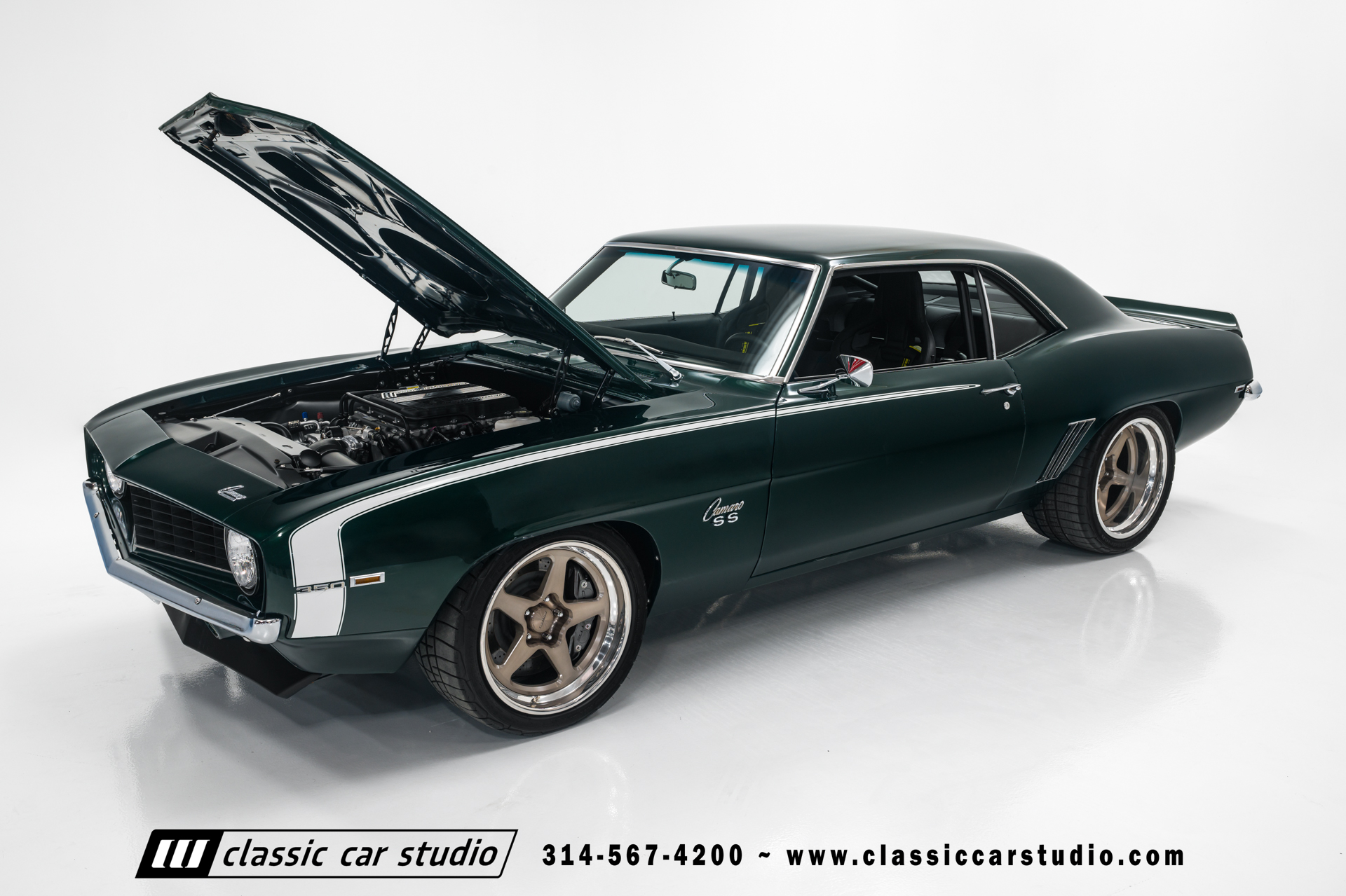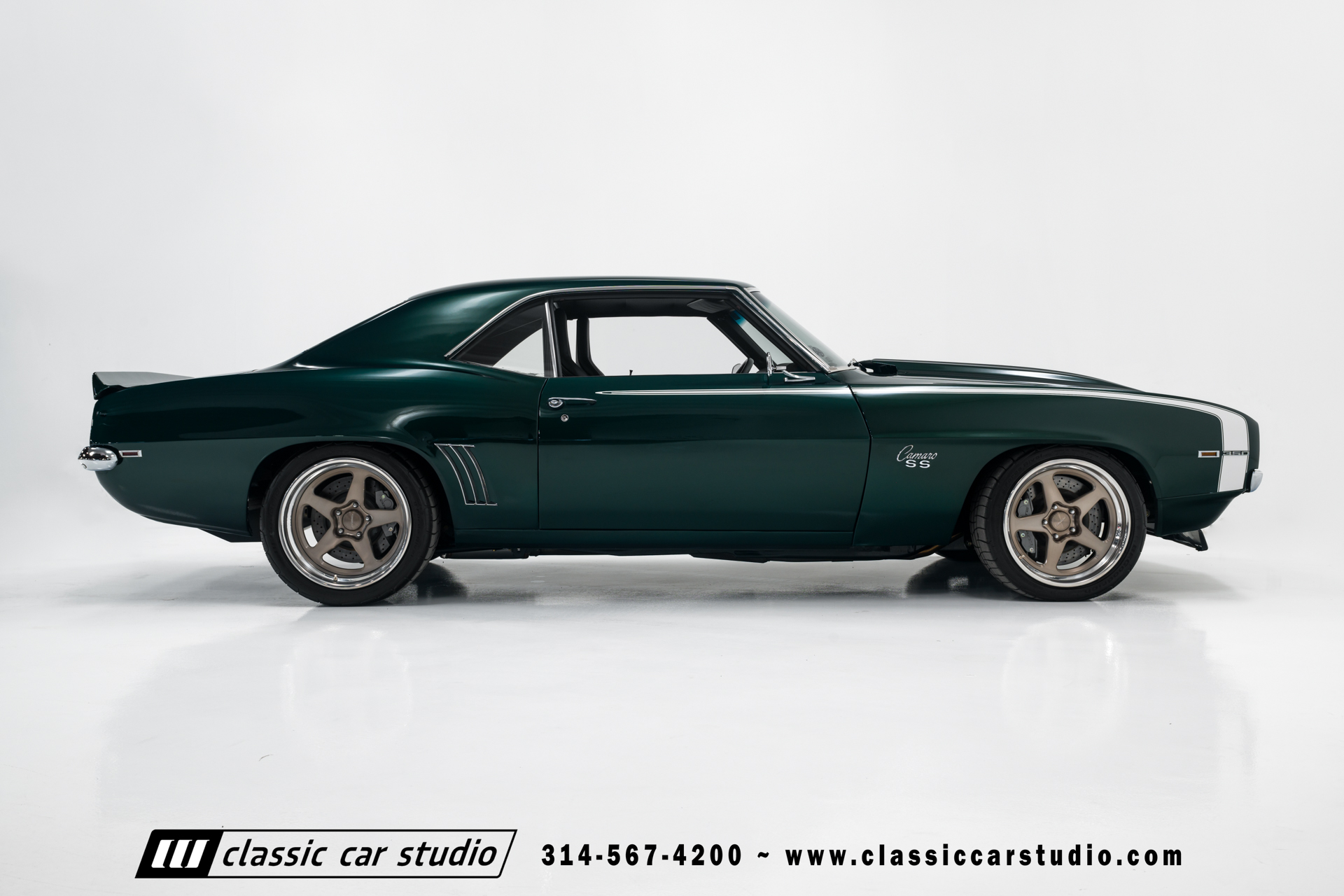This 1969 Chevrolet Camaro coupe is powered by a 6.2-liter LT4 V8 that is equipped with a Katech supercharger and linked to a Tremec six-speed manual transmission. The car rides on a Detroit Speed suspension kit with a hydroformed front subframe, sway bars, and a Quadralink rear setup, and the Forgeline 18″ wheels are mounted over C6 Z06-specification brakes. The body is finished in dark green with white side stripes and features front and rear spoilers and a cowl induction hood, while the cabin is outfitted with a roll bar, digital climate control, a Kenwood head unit, Hertz audio, cruise control, and black leather Recaro front seats with Schroth harnesses…. (full write up on bringatrailer.com, at the link above)