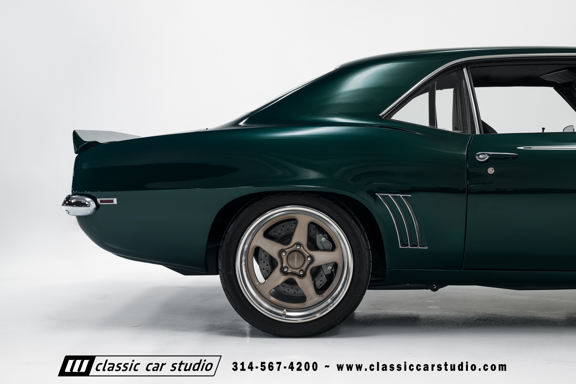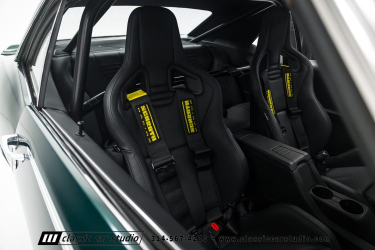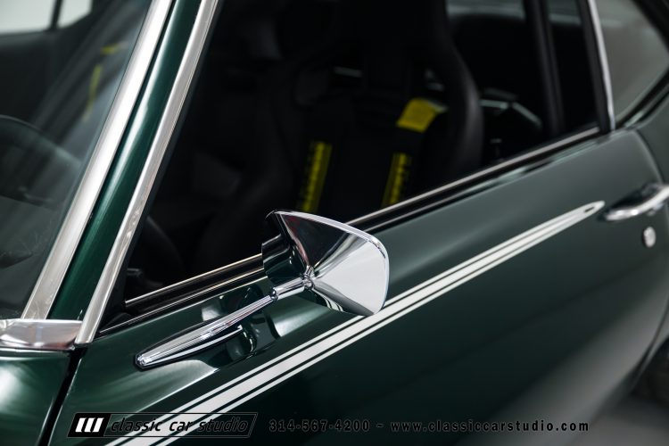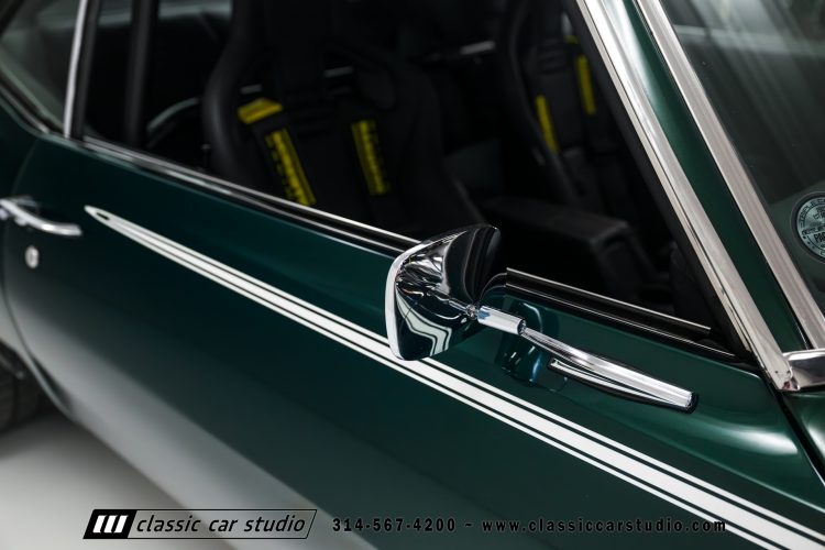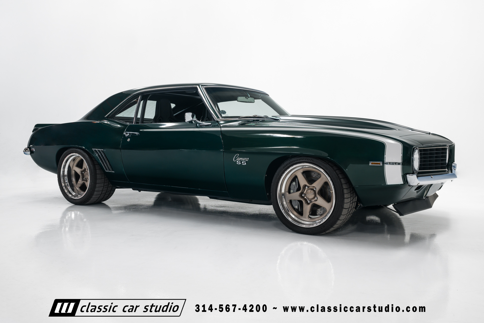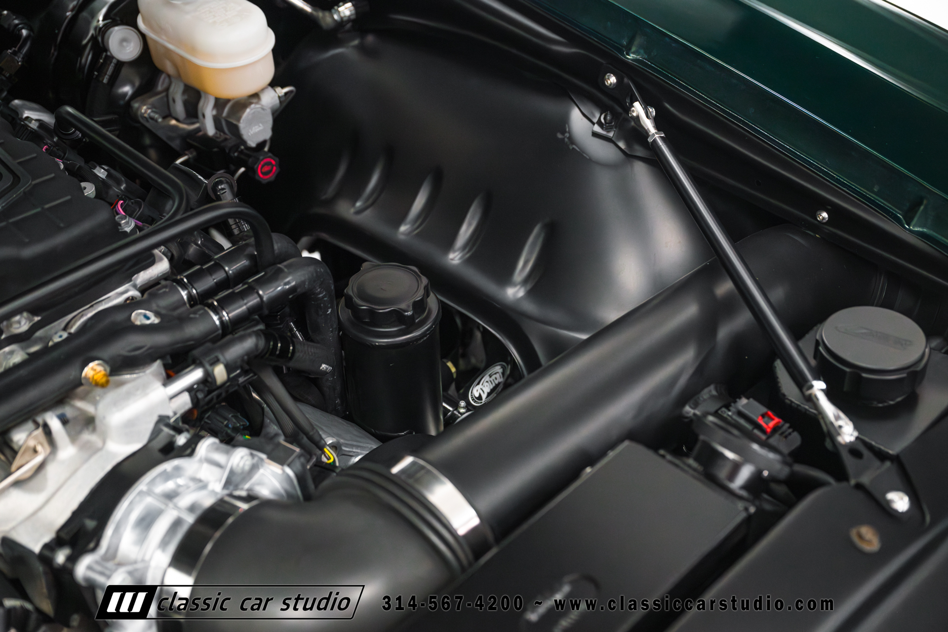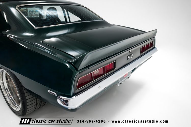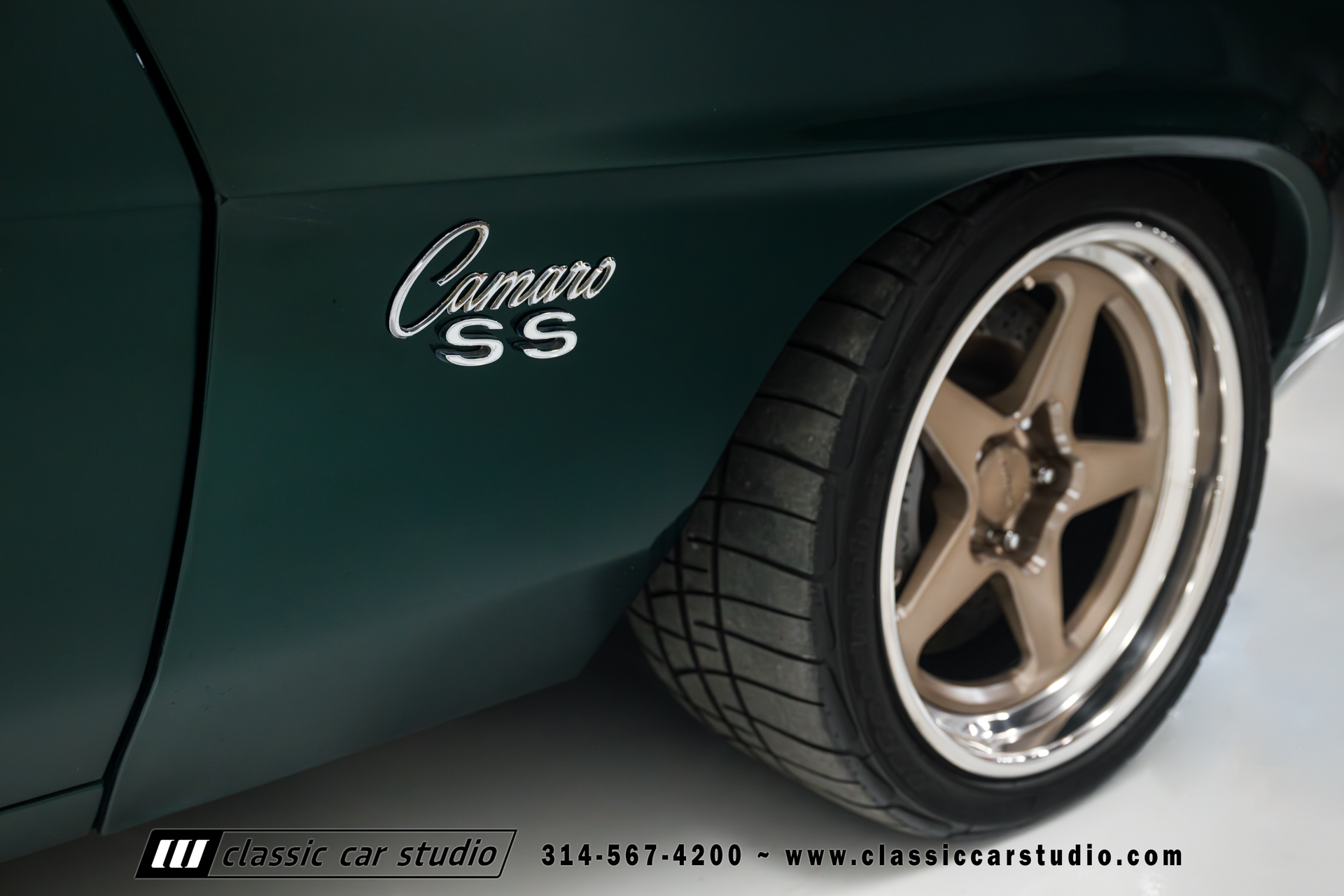 This 1969 Chevrolet Camaro coupe is powered by a 6.2-liter LT4 V8 that is equipped with a Katech supercharger and linked to a Tremec six-speed manual transmission. The car rides on a Detroit Speed suspension kit with a hydroformed front subframe, sway bars, and a Quadralink rear setup, and the Forgeline 18″ wheels are mounted over C6 Z06-specification brakes. The body is finished in dark green with white side stripes and features front and rear spoilers and a cowl induction hood, while the cabin is outfitted with a roll bar, digital climate control, a Kenwood head unit, Hertz audio, cruise control, and black leather Recaro front seats with Schroth harnesses…. (full write up on bringatrailer.com, at the link above)