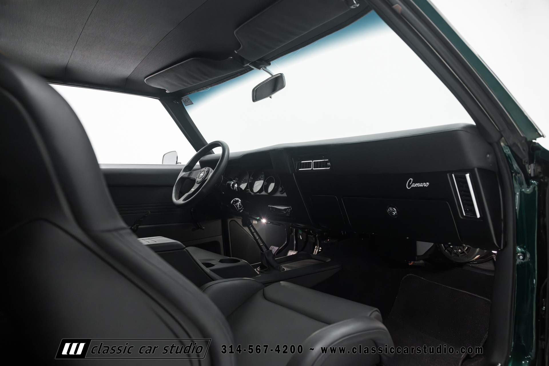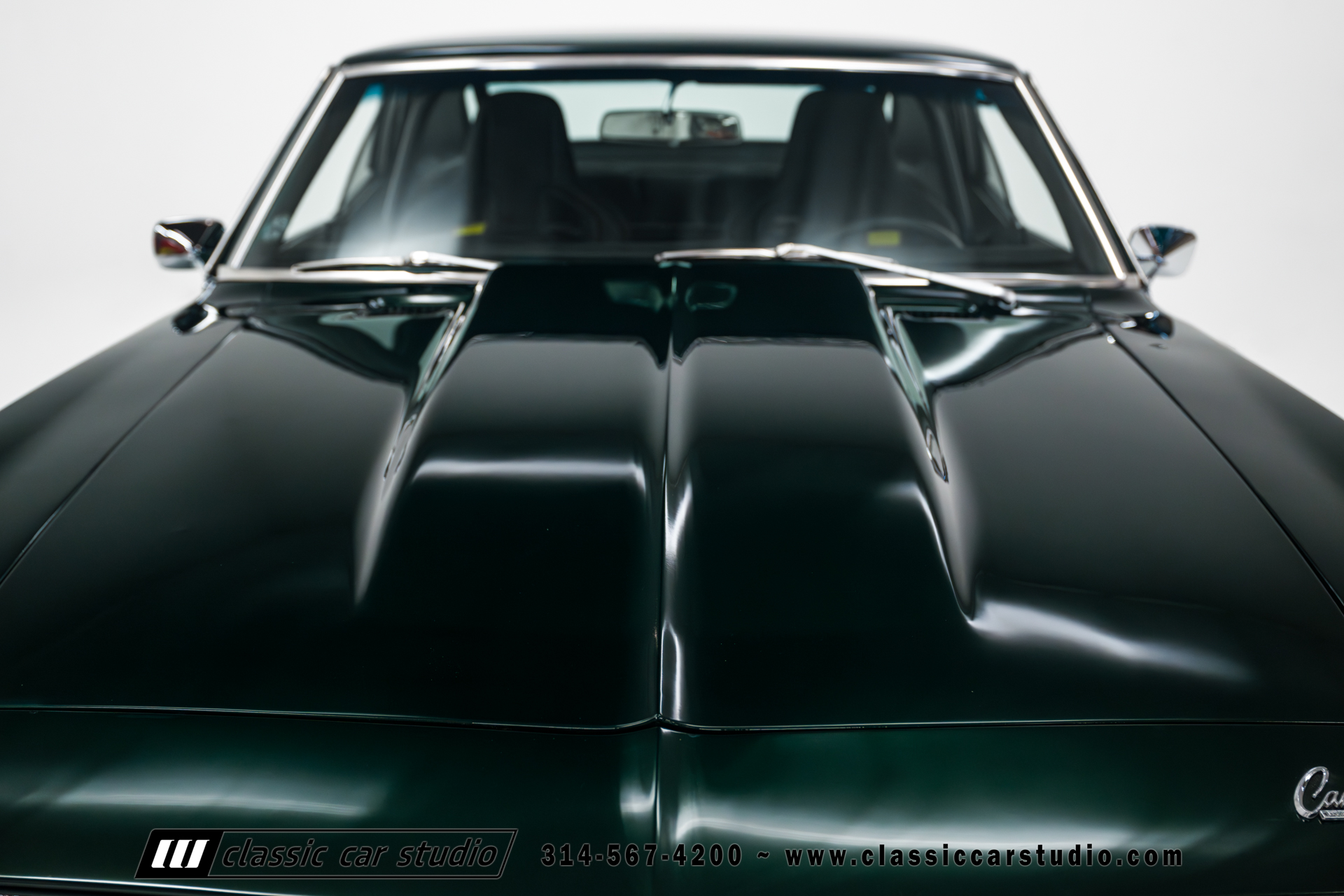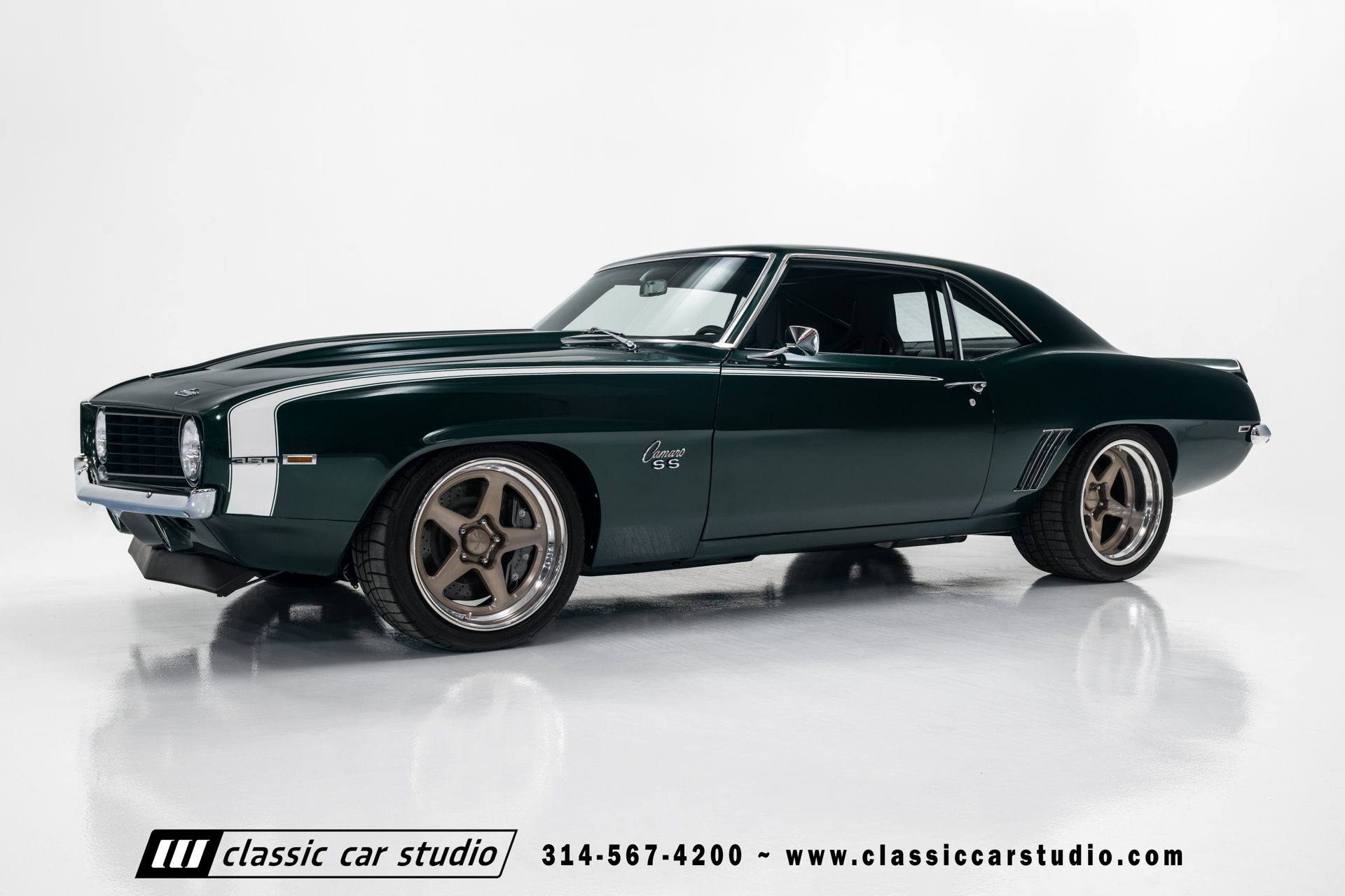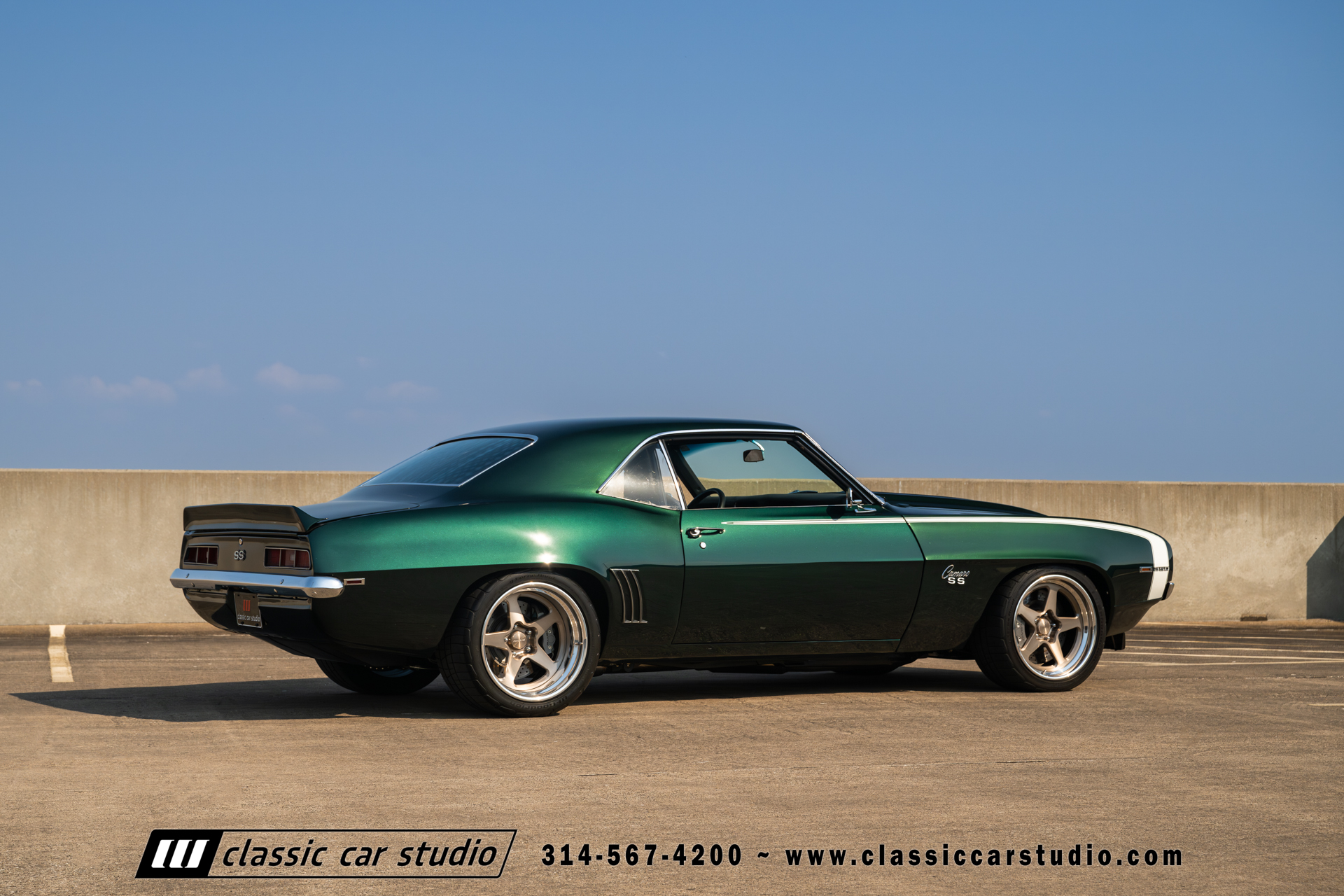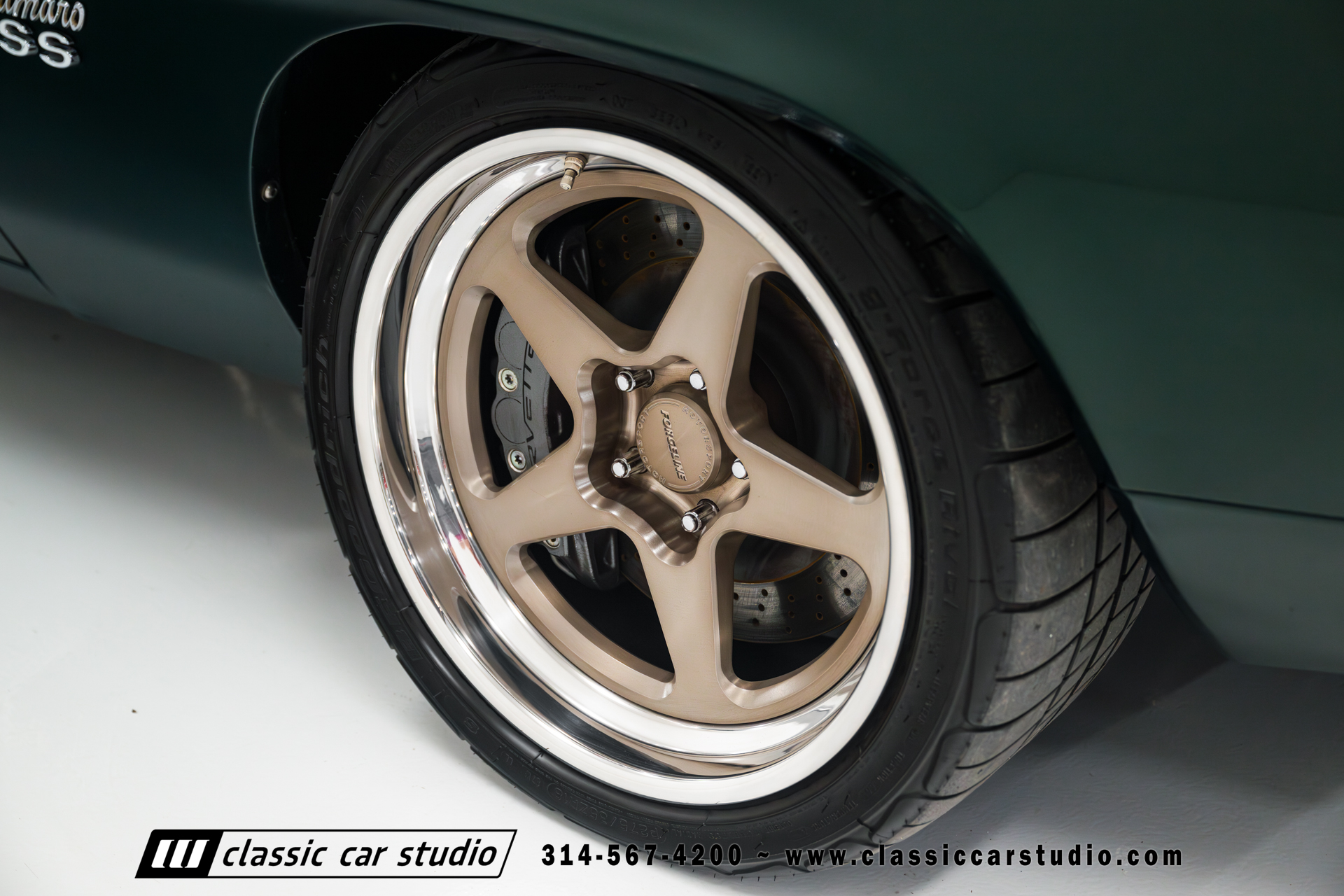 This 1969 Chevrolet Camaro coupe is powered by a 6.2-liter LT4 V8 that is equipped with a Katech supercharger and linked to a Tremec six-speed manual transmission. The car rides on a Detroit Speed suspension kit with a hydroformed front subframe, sway bars, and a Quadralink rear setup, and the Forgeline 18″ wheels are mounted over C6 Z06-specification brakes. The body is finished in dark green with white side stripes and features front and rear spoilers and a cowl induction hood, while the cabin is outfitted with a roll bar, digital climate control, a Kenwood head unit, Hertz audio, cruise control, and black leather Recaro front seats with Schroth harnesses…. (full write up on bringatrailer.com, at the link above)