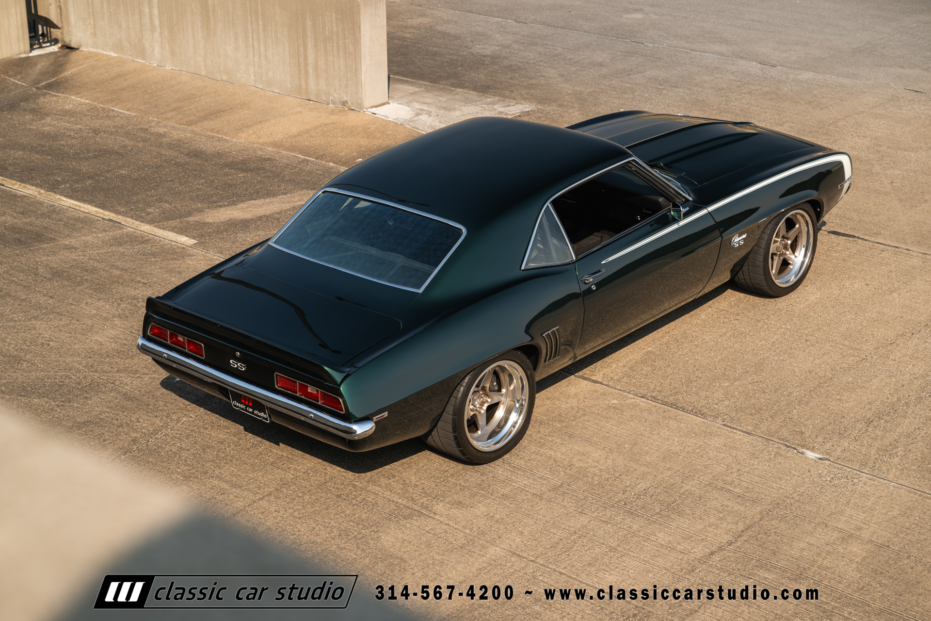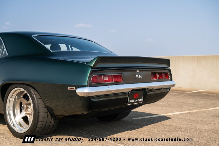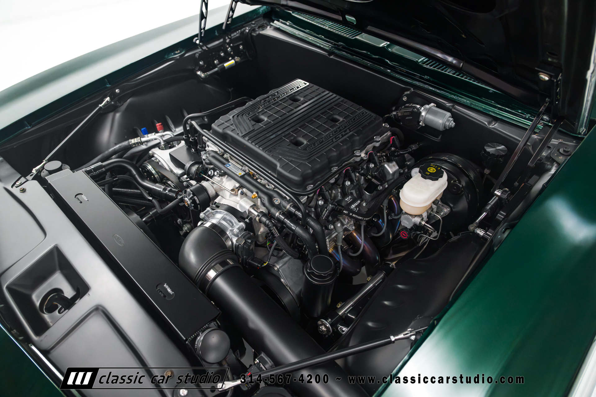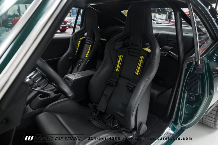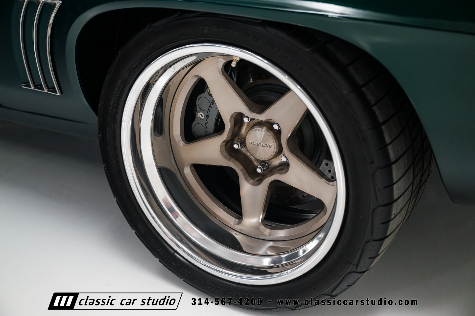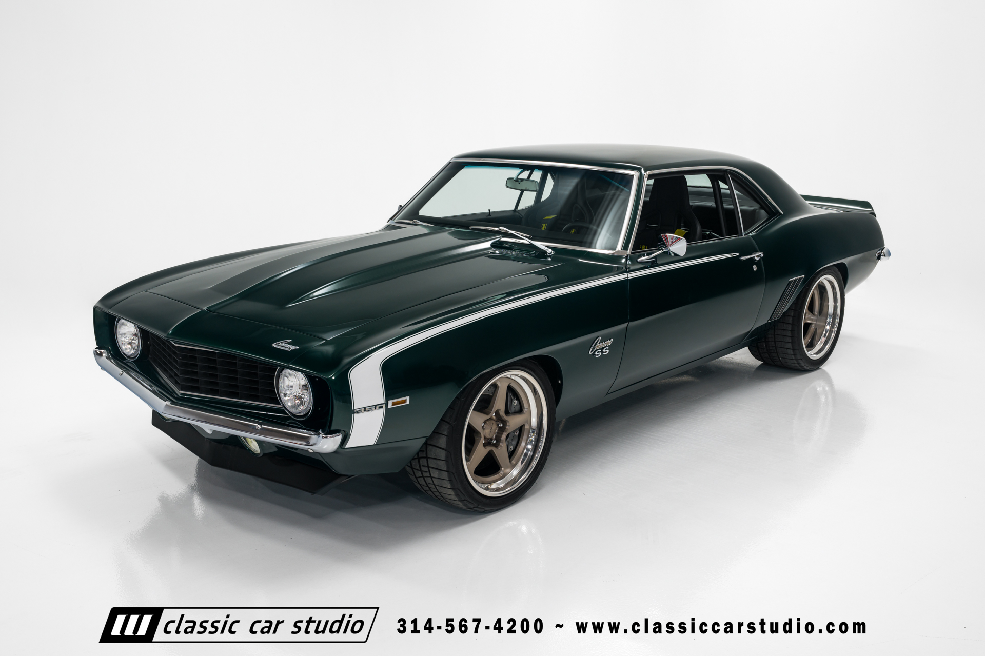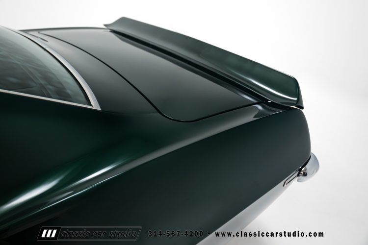 This 1969 Chevrolet Camaro coupe is powered by a 6.2-liter LT4 V8 that is equipped with a Katech supercharger and linked to a Tremec six-speed manual transmission. The car rides on a Detroit Speed suspension kit with a hydroformed front subframe, sway bars, and a Quadralink rear setup, and the Forgeline 18″ wheels are mounted over C6 Z06-specification brakes. The body is finished in dark green with white side stripes and features front and rear spoilers and a cowl induction hood, while the cabin is outfitted with a roll bar, digital climate control, a Kenwood head unit, Hertz audio, cruise control, and black leather Recaro front seats with Schroth harnesses…. (full write up on bringatrailer.com, at the link above)