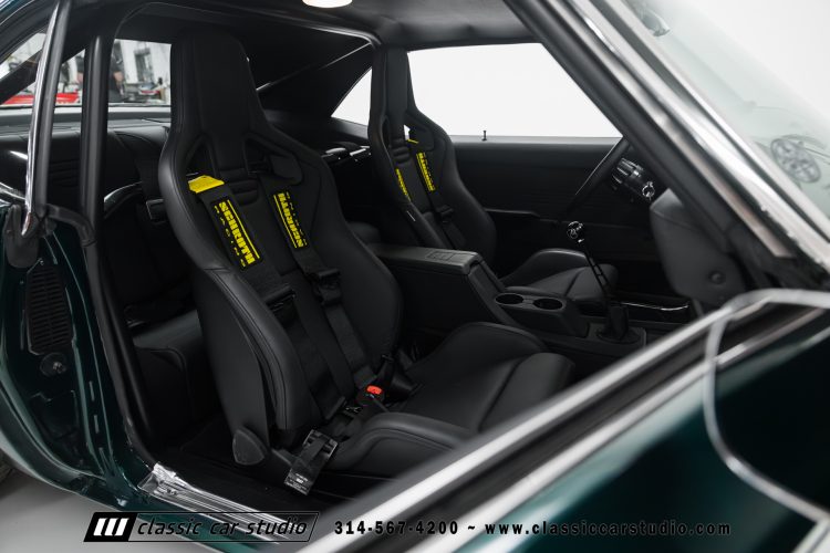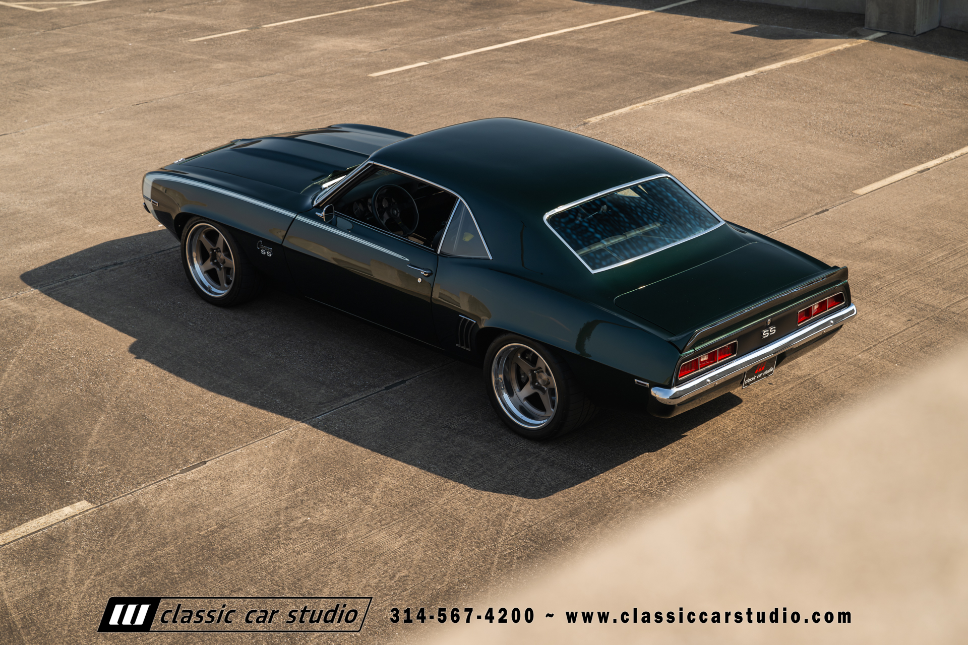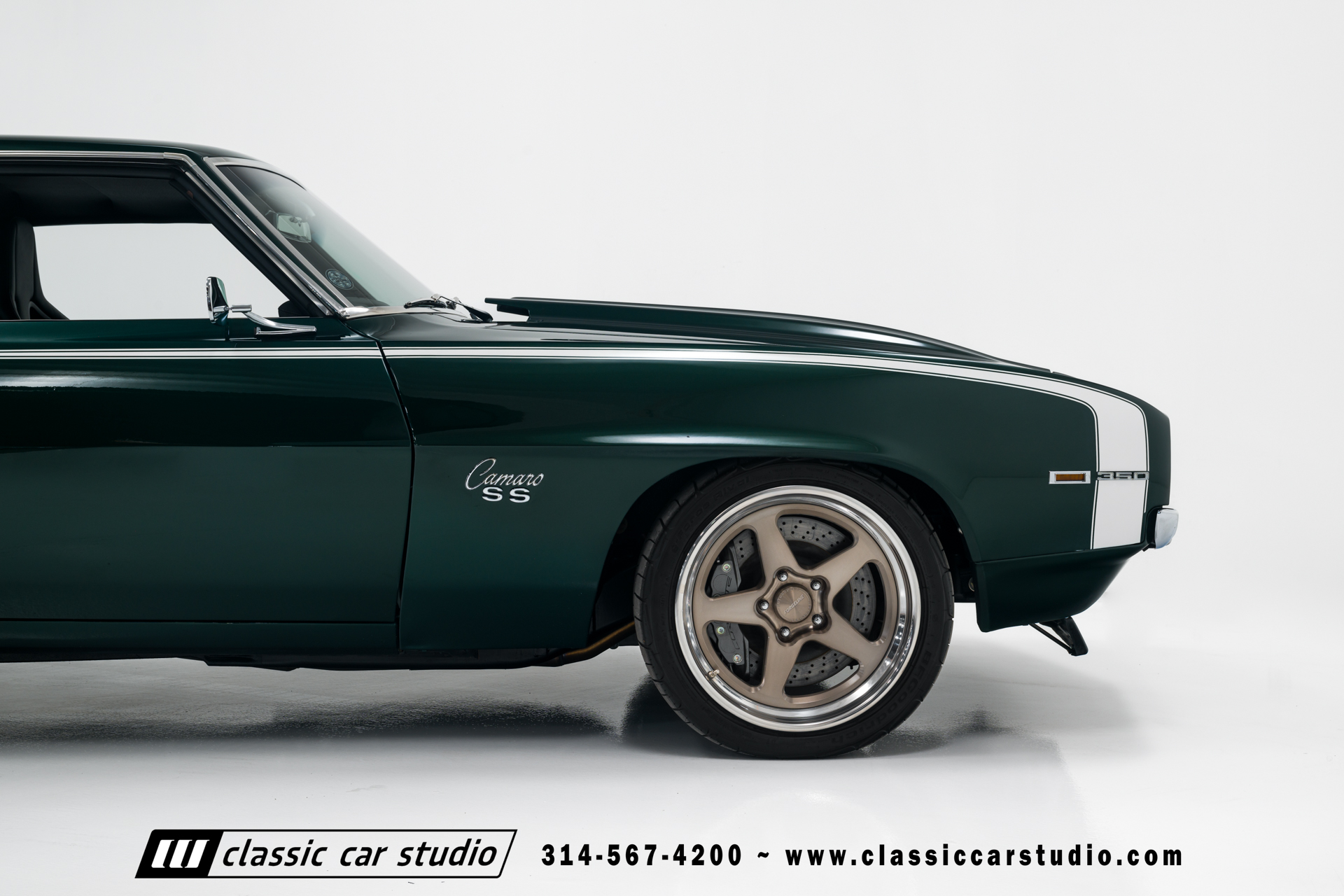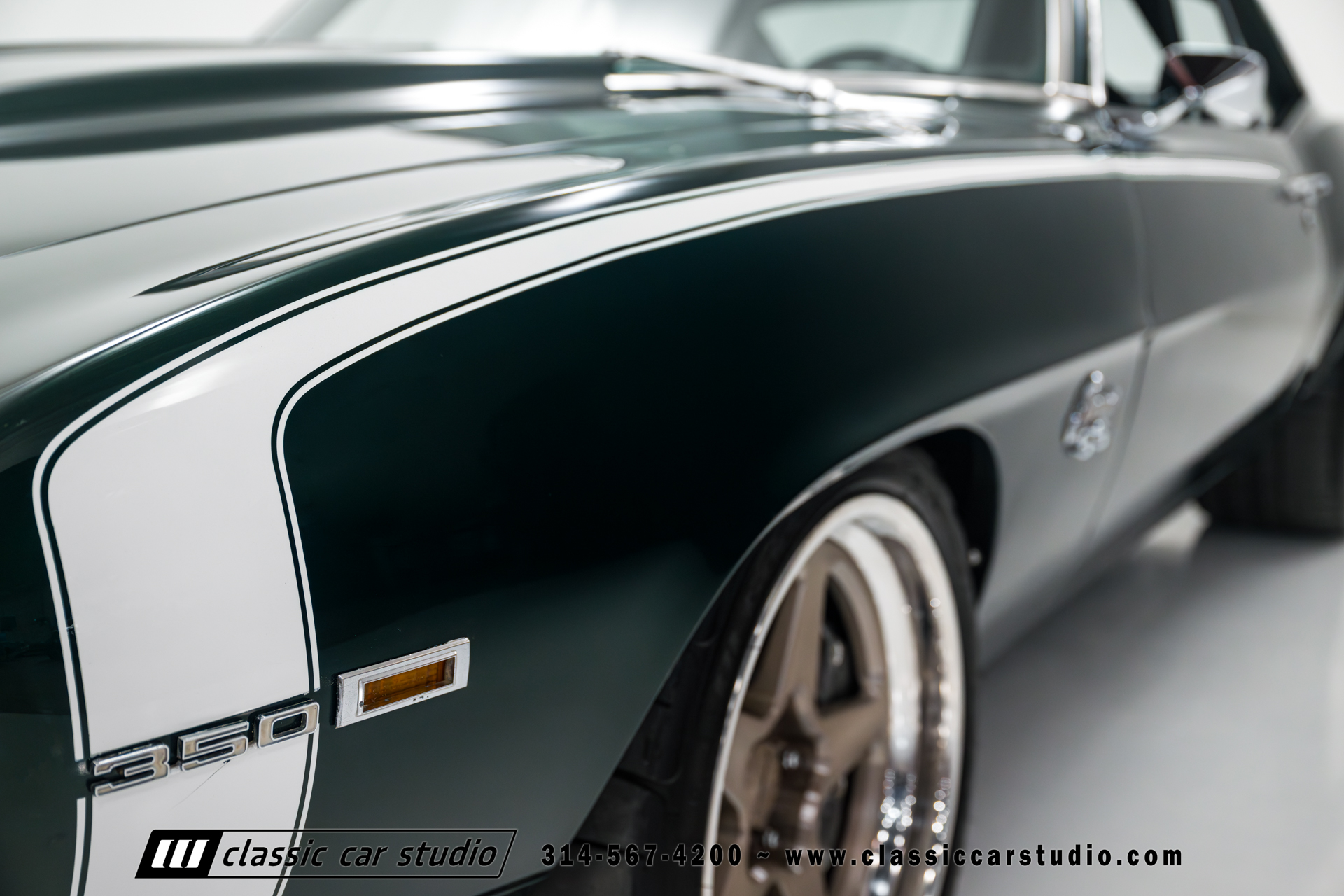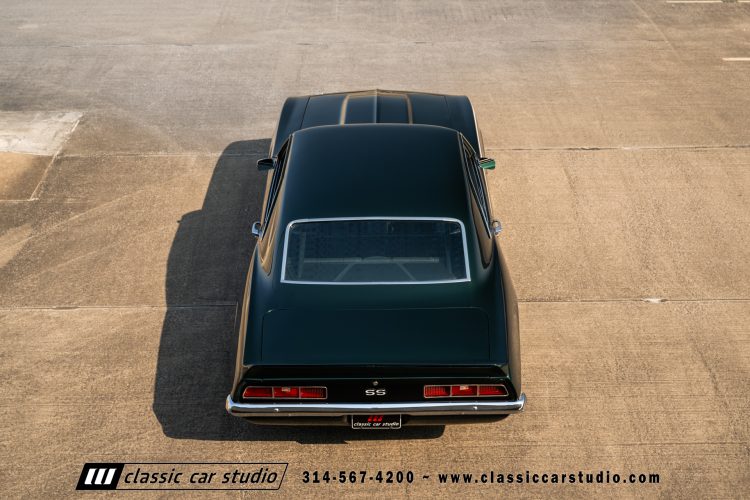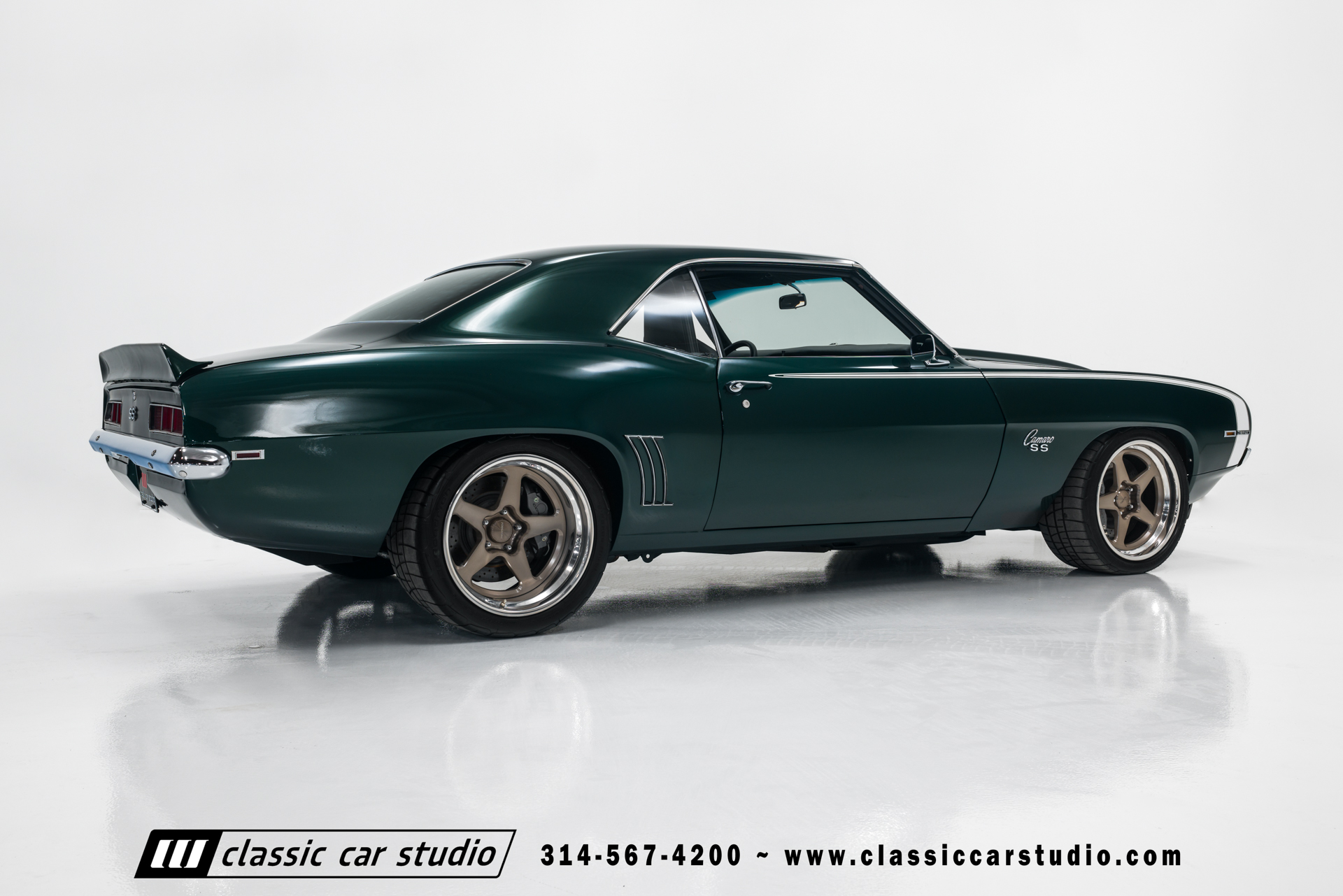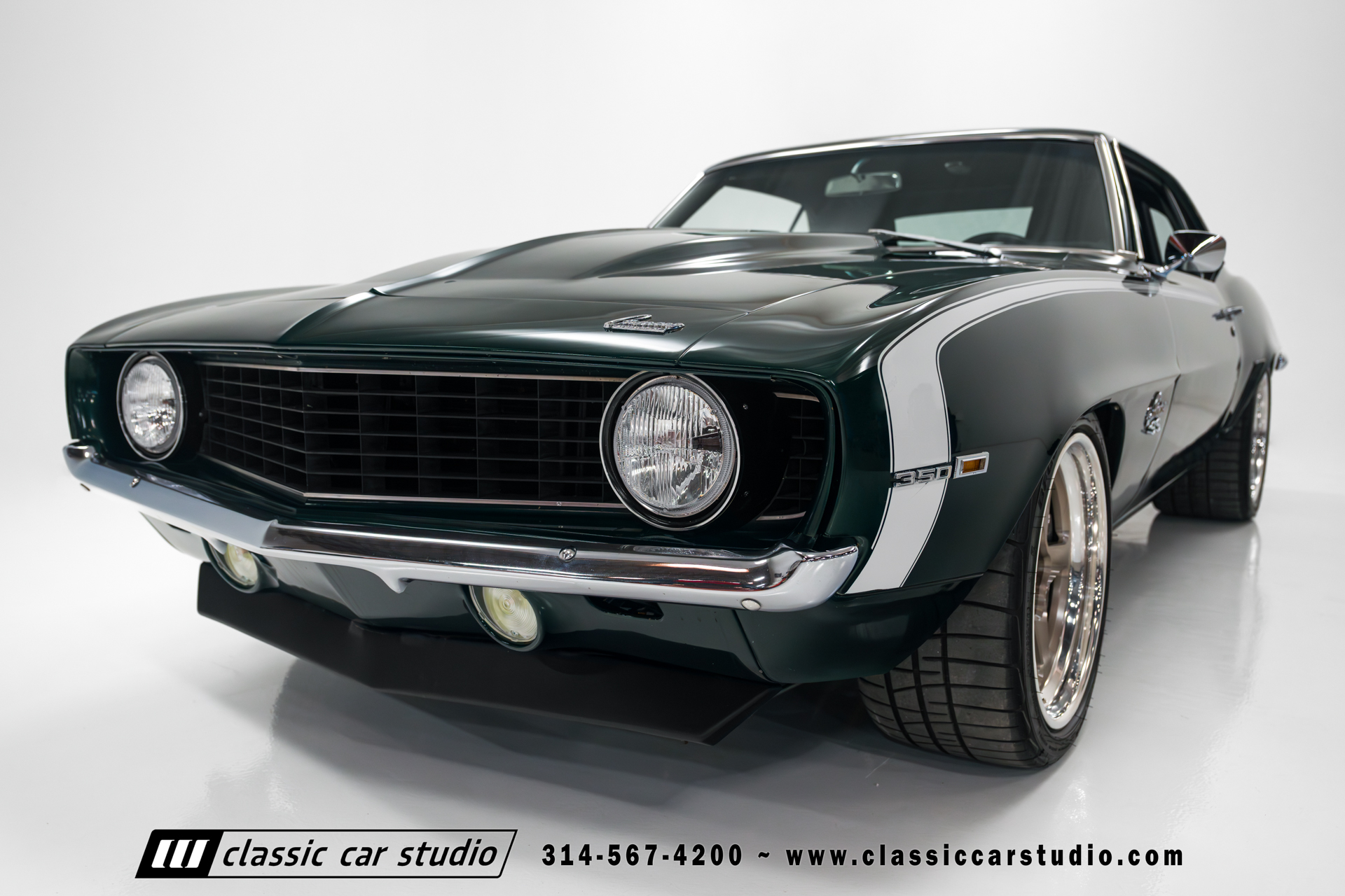 This 1969 Chevrolet Camaro coupe is powered by a 6.2-liter LT4 V8 that is equipped with a Katech supercharger and linked to a Tremec six-speed manual transmission. The car rides on a Detroit Speed suspension kit with a hydroformed front subframe, sway bars, and a Quadralink rear setup, and the Forgeline 18″ wheels are mounted over C6 Z06-specification brakes. The body is finished in dark green with white side stripes and features front and rear spoilers and a cowl induction hood, while the cabin is outfitted with a roll bar, digital climate control, a Kenwood head unit, Hertz audio, cruise control, and black leather Recaro front seats with Schroth harnesses…. (full write up on bringatrailer.com, at the link above)