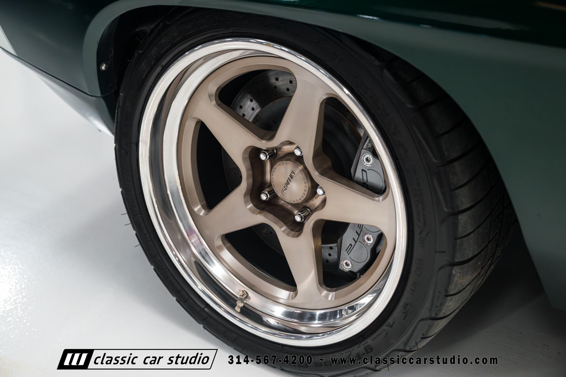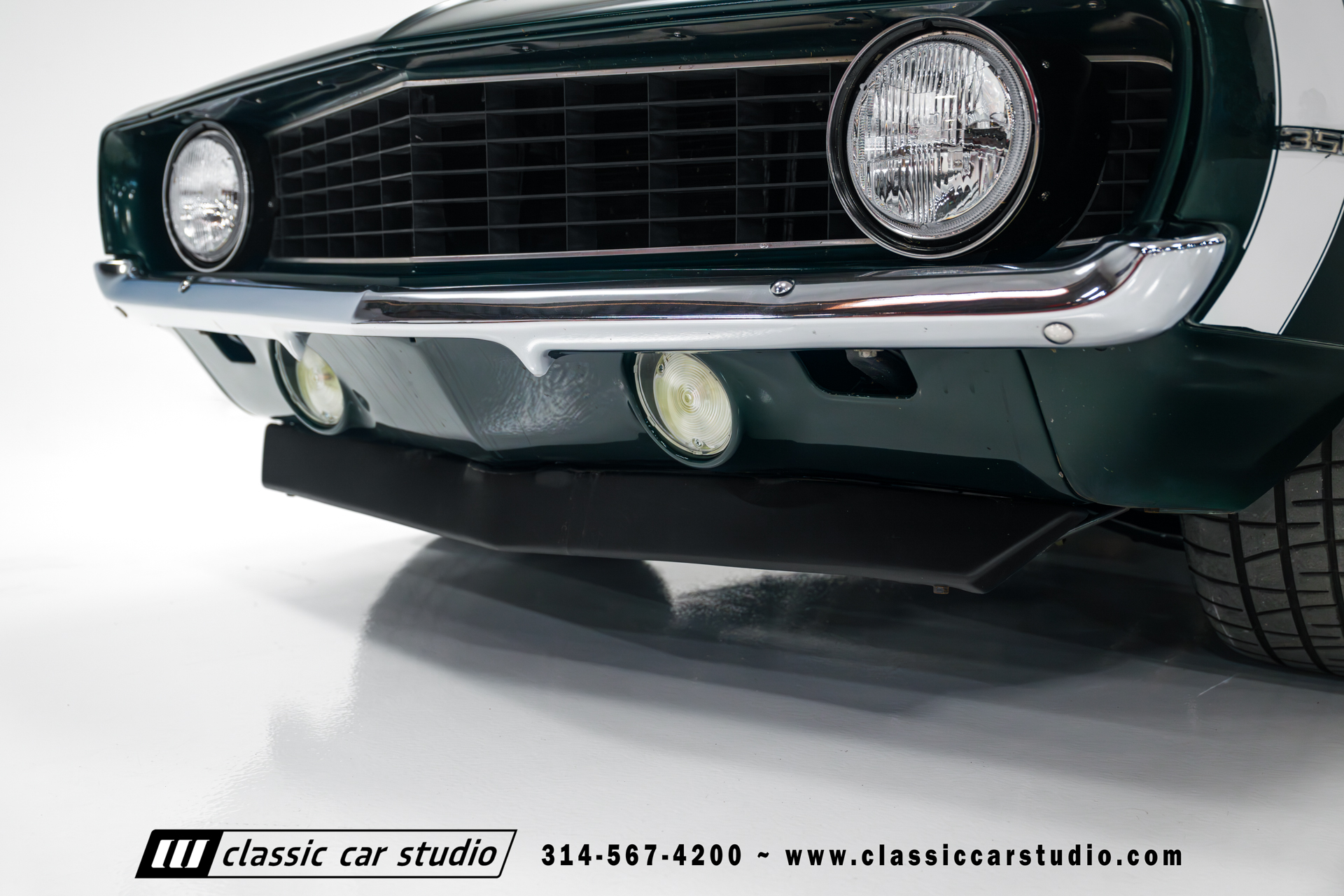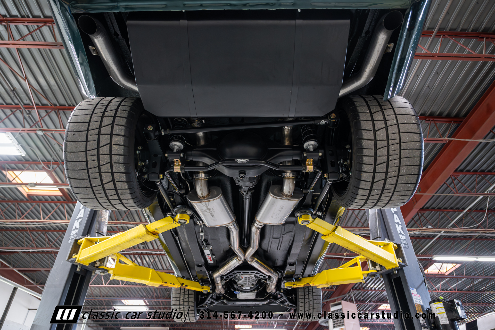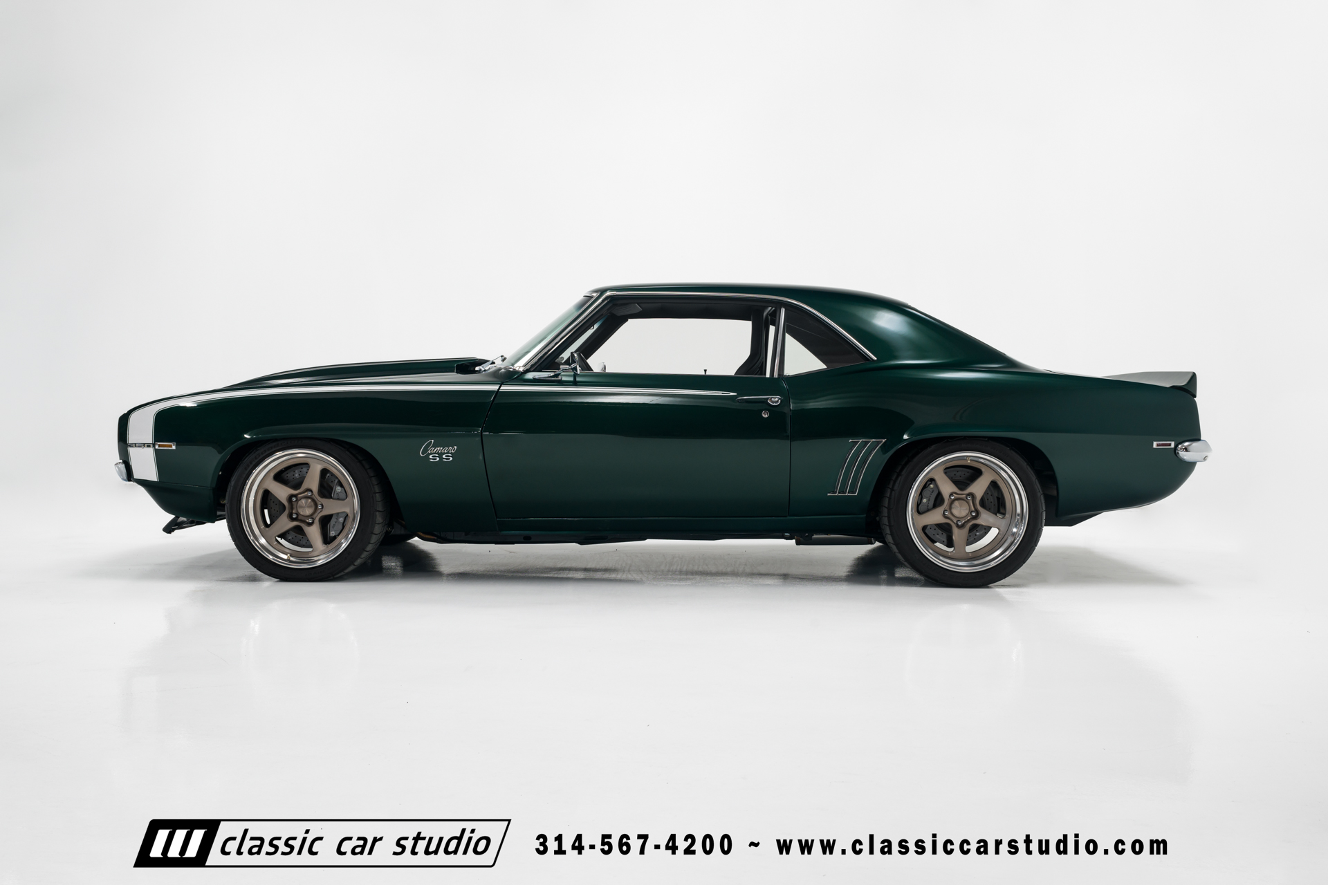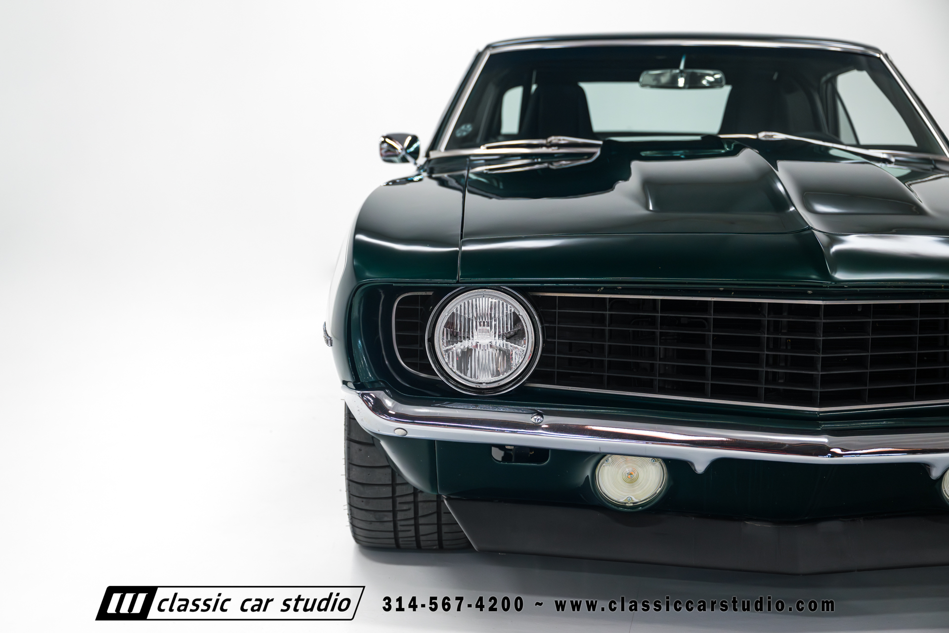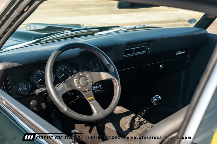 This 1969 Chevrolet Camaro coupe is powered by a 6.2-liter LT4 V8 that is equipped with a Katech supercharger and linked to a Tremec six-speed manual transmission. The car rides on a Detroit Speed suspension kit with a hydroformed front subframe, sway bars, and a Quadralink rear setup, and the Forgeline 18″ wheels are mounted over C6 Z06-specification brakes. The body is finished in dark green with white side stripes and features front and rear spoilers and a cowl induction hood, while the cabin is outfitted with a roll bar, digital climate control, a Kenwood head unit, Hertz audio, cruise control, and black leather Recaro front seats with Schroth harnesses…. (full write up on bringatrailer.com, at the link above)