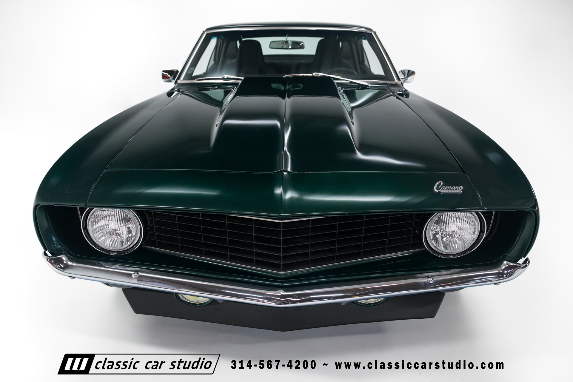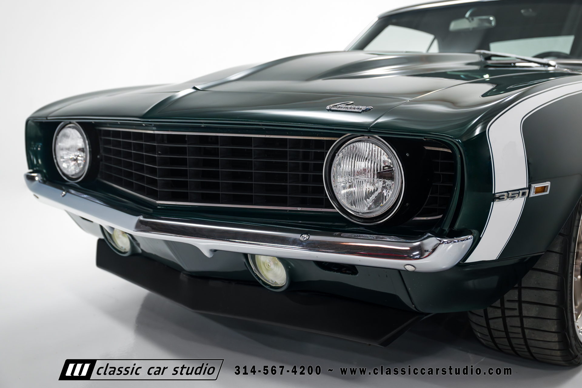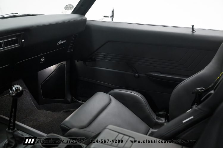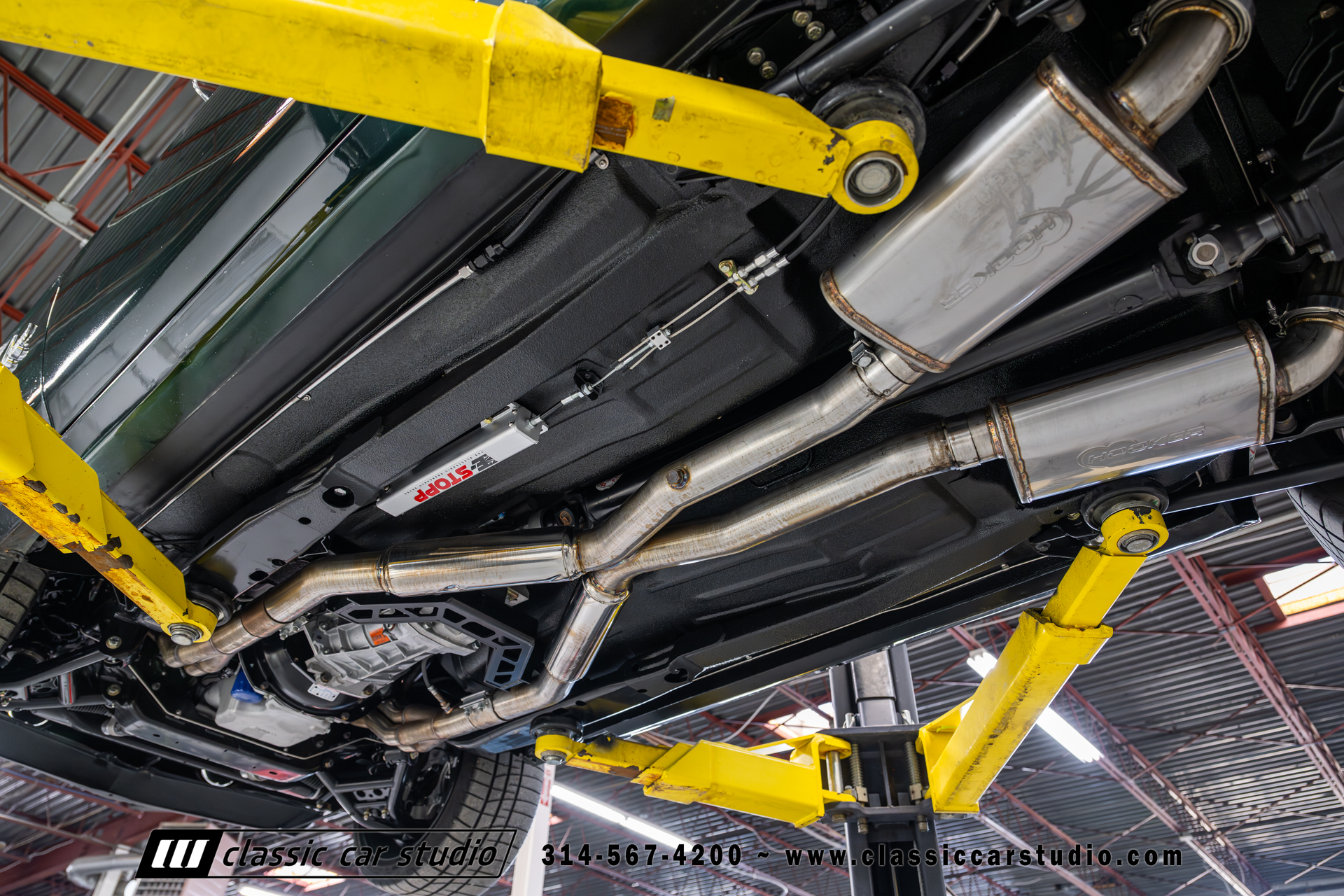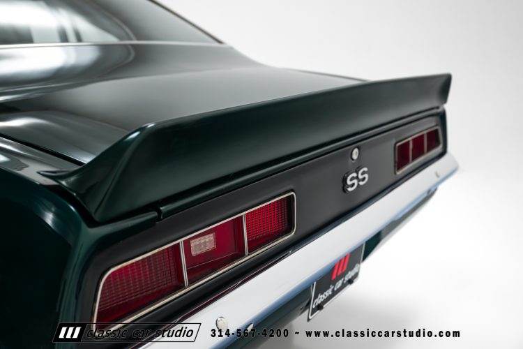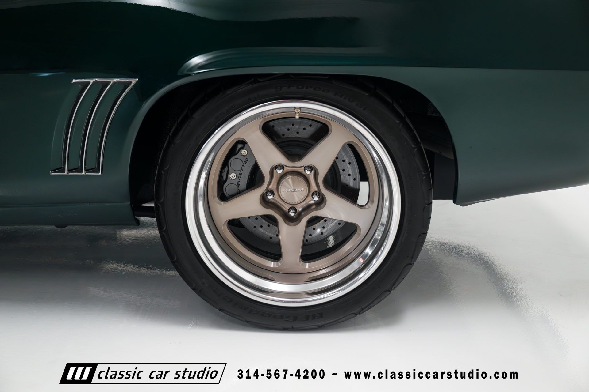 This 1969 Chevrolet Camaro coupe is powered by a 6.2-liter LT4 V8 that is equipped with a Katech supercharger and linked to a Tremec six-speed manual transmission. The car rides on a Detroit Speed suspension kit with a hydroformed front subframe, sway bars, and a Quadralink rear setup, and the Forgeline 18″ wheels are mounted over C6 Z06-specification brakes. The body is finished in dark green with white side stripes and features front and rear spoilers and a cowl induction hood, while the cabin is outfitted with a roll bar, digital climate control, a Kenwood head unit, Hertz audio, cruise control, and black leather Recaro front seats with Schroth harnesses…. (full write up on bringatrailer.com, at the link above)