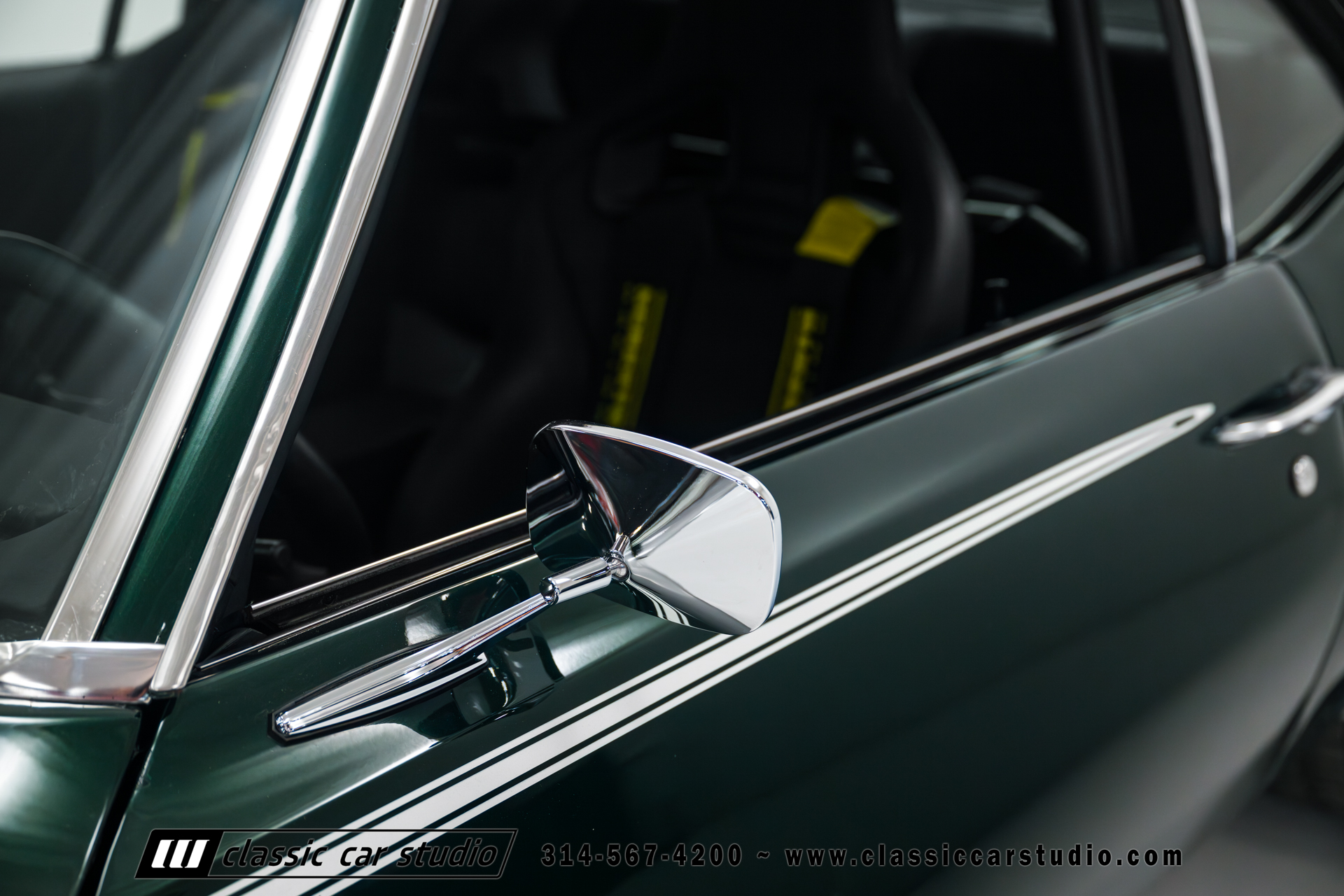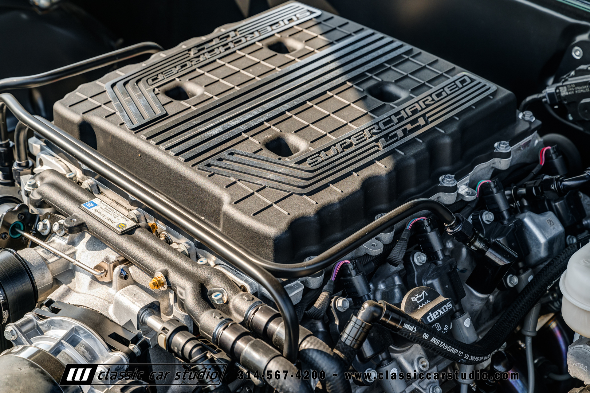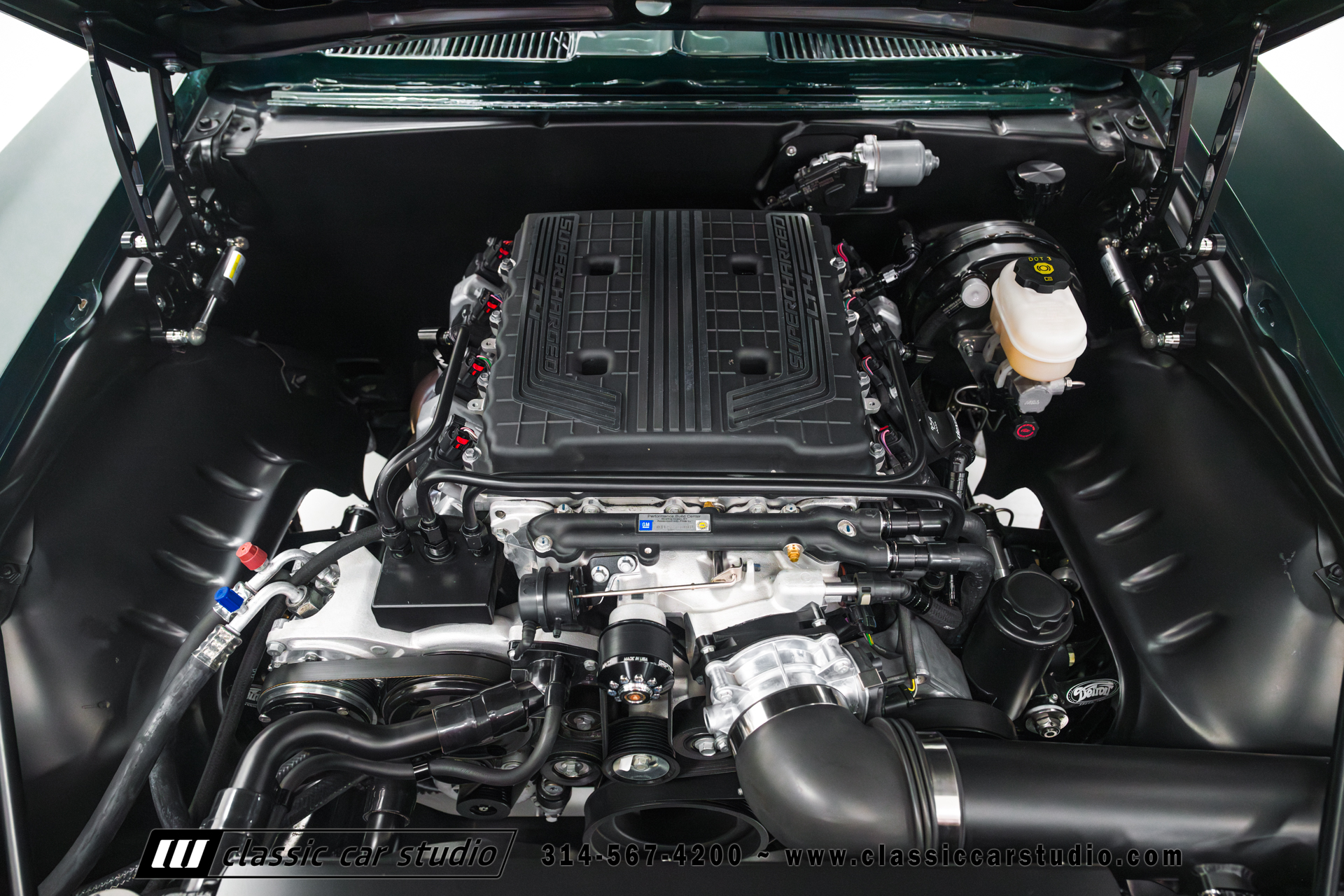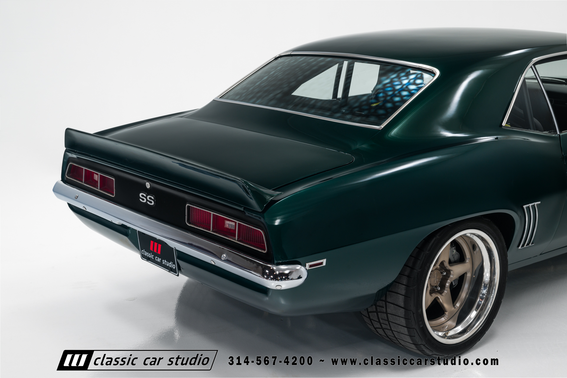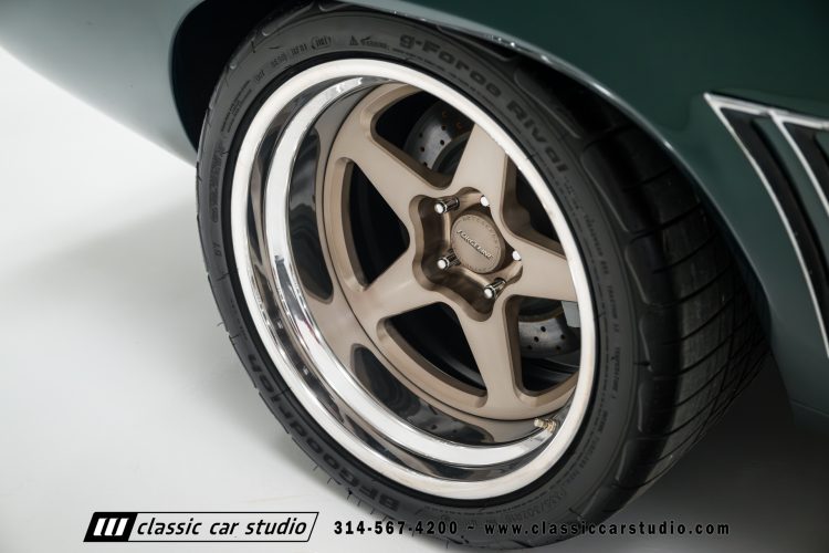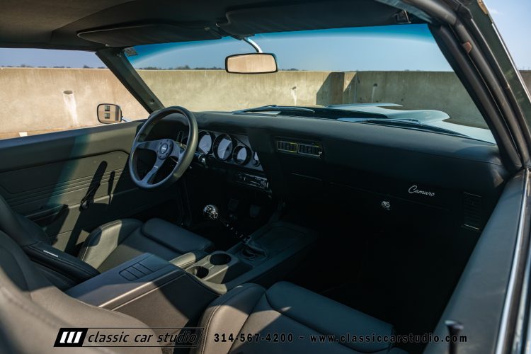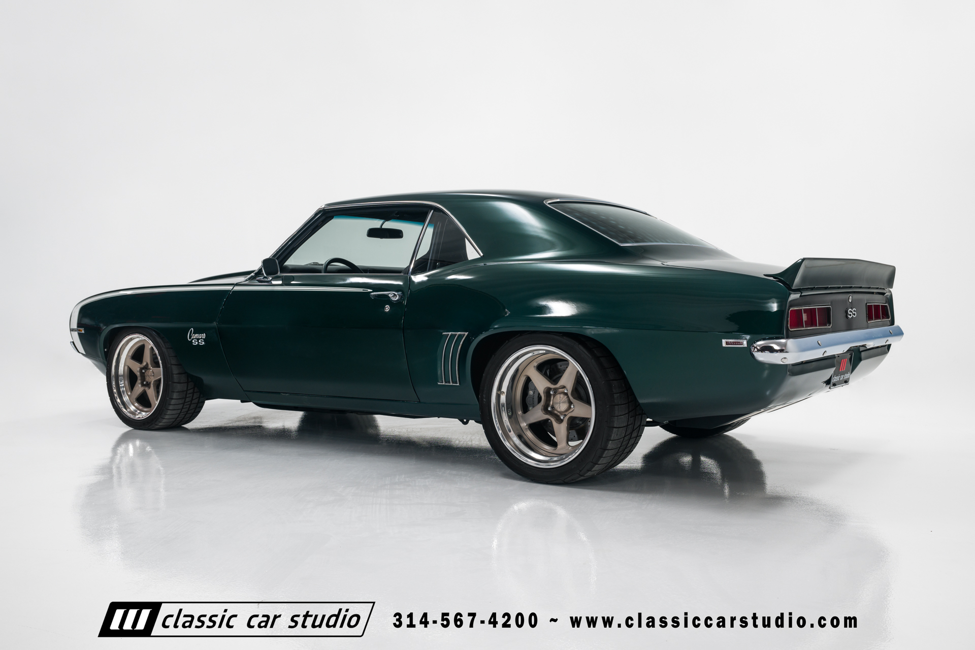 This 1969 Chevrolet Camaro coupe is powered by a 6.2-liter LT4 V8 that is equipped with a Katech supercharger and linked to a Tremec six-speed manual transmission. The car rides on a Detroit Speed suspension kit with a hydroformed front subframe, sway bars, and a Quadralink rear setup, and the Forgeline 18″ wheels are mounted over C6 Z06-specification brakes. The body is finished in dark green with white side stripes and features front and rear spoilers and a cowl induction hood, while the cabin is outfitted with a roll bar, digital climate control, a Kenwood head unit, Hertz audio, cruise control, and black leather Recaro front seats with Schroth harnesses…. (full write up on bringatrailer.com, at the link above)