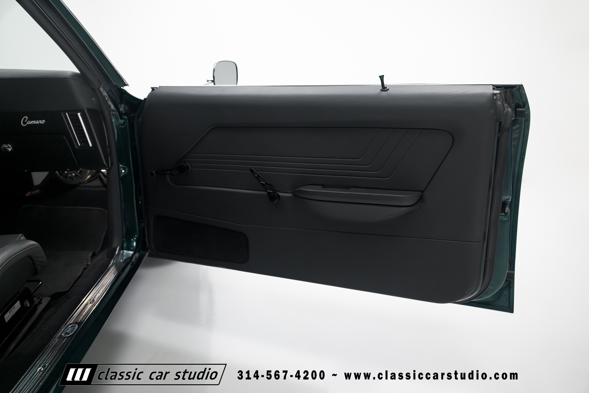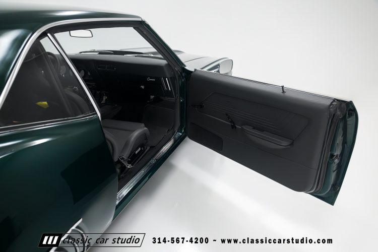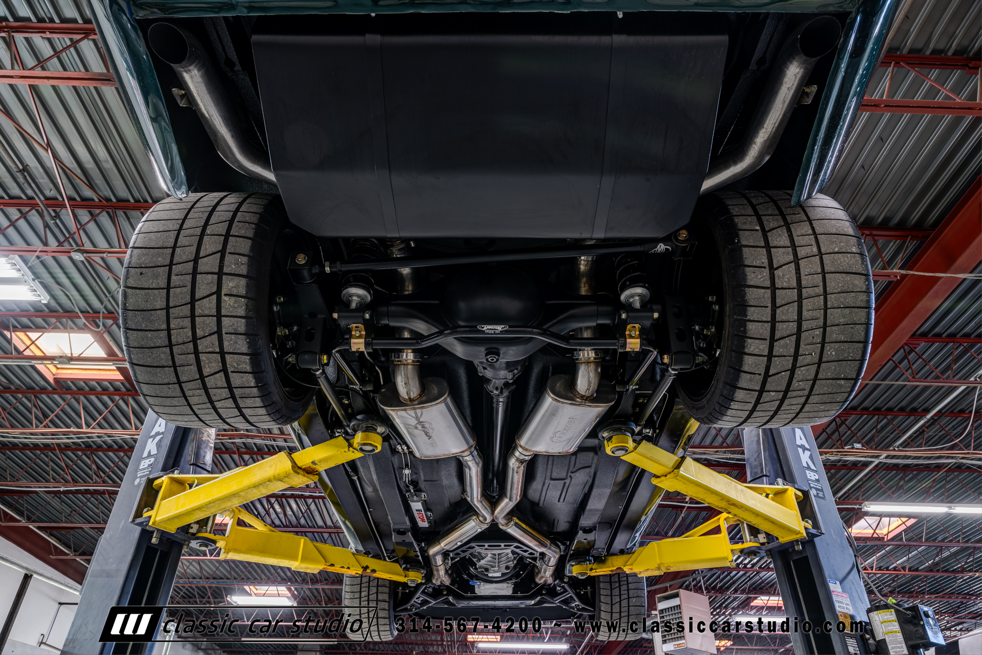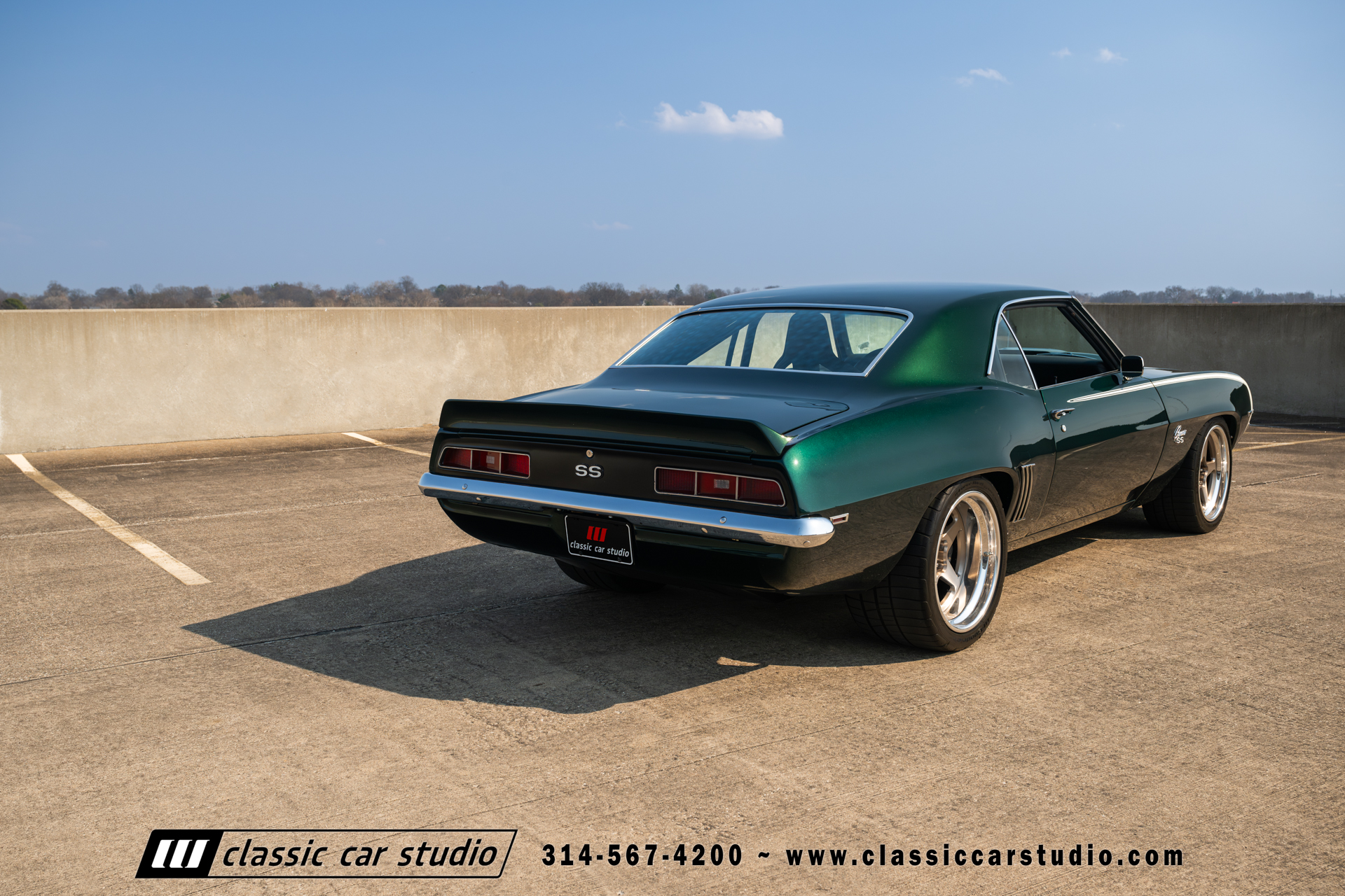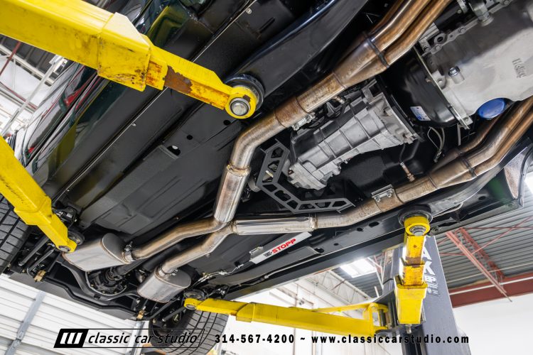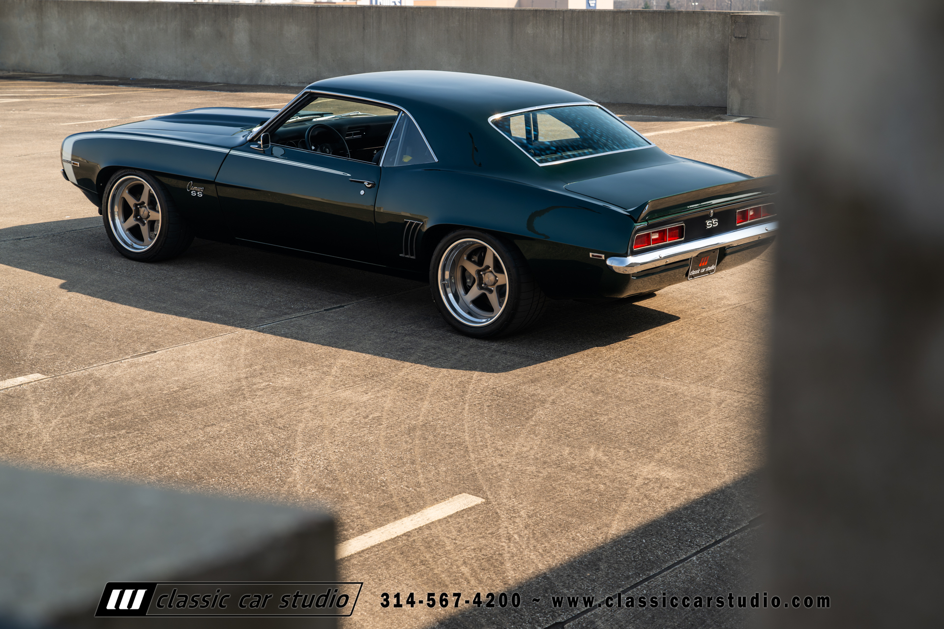 This 1969 Chevrolet Camaro coupe is powered by a 6.2-liter LT4 V8 that is equipped with a Katech supercharger and linked to a Tremec six-speed manual transmission. The car rides on a Detroit Speed suspension kit with a hydroformed front subframe, sway bars, and a Quadralink rear setup, and the Forgeline 18″ wheels are mounted over C6 Z06-specification brakes. The body is finished in dark green with white side stripes and features front and rear spoilers and a cowl induction hood, while the cabin is outfitted with a roll bar, digital climate control, a Kenwood head unit, Hertz audio, cruise control, and black leather Recaro front seats with Schroth harnesses…. (full write up on bringatrailer.com, at the link above)