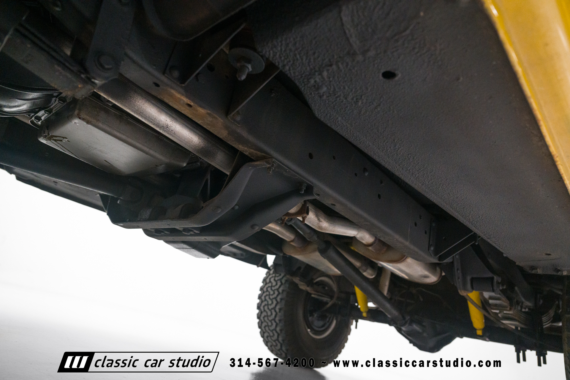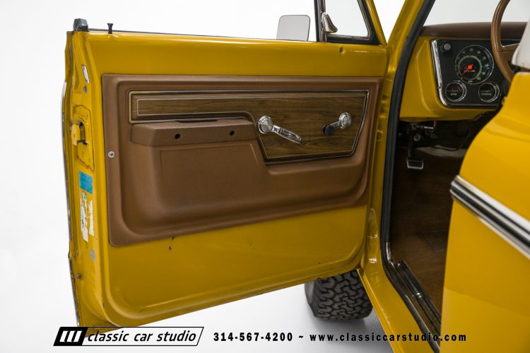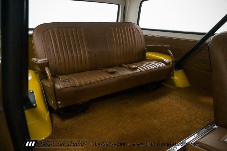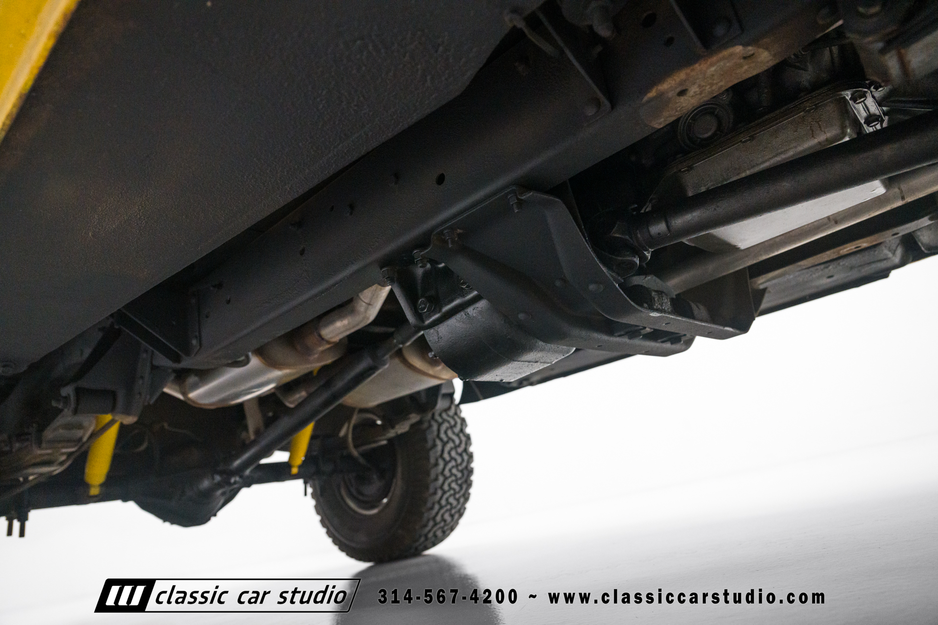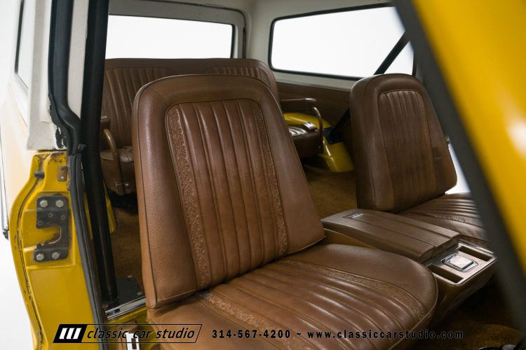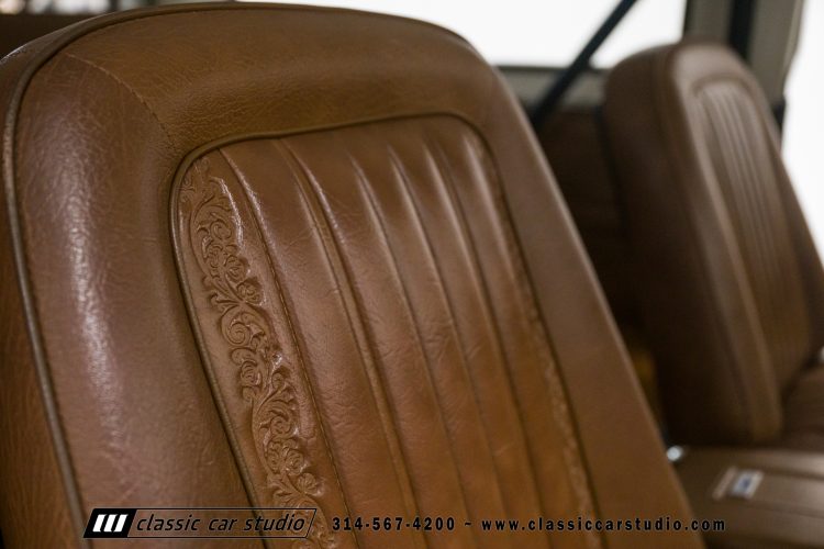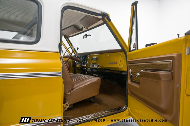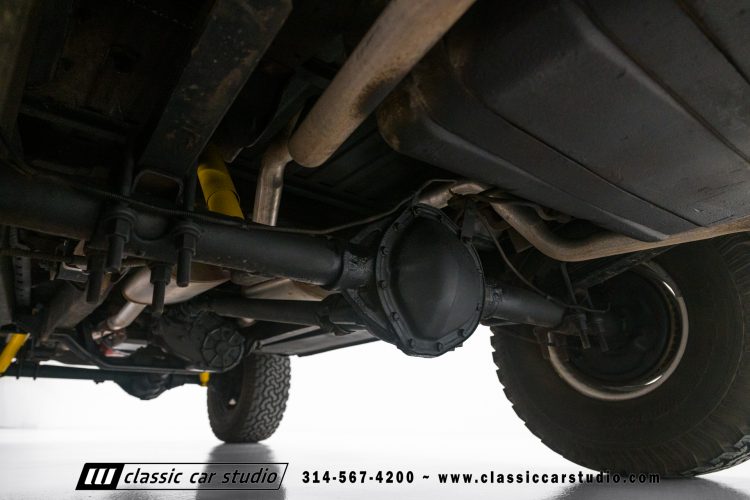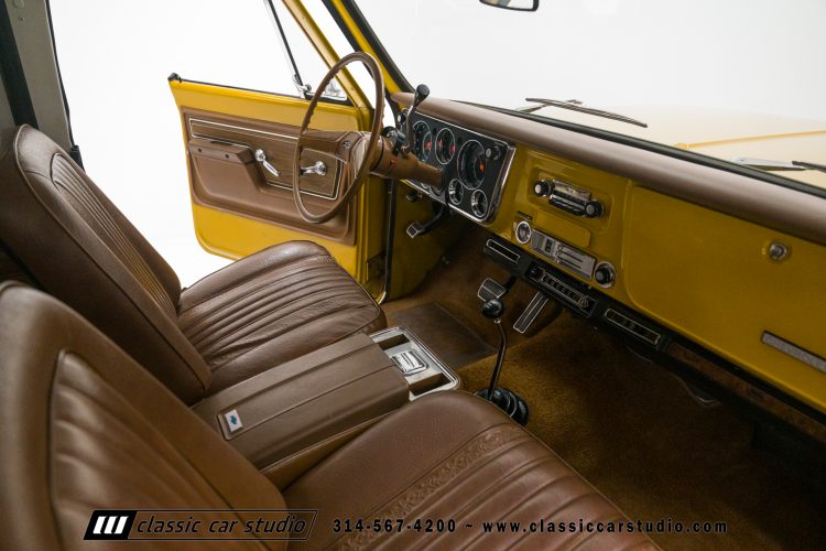 The original 350 fires right up, the transmission shifts properly through all the gears and the transfer case works as it should. All of the gauges are in good working order but the original radio does not turn on. The interior is mostly original and very well kept. The seat covers and door panels are in very good condition for their age.