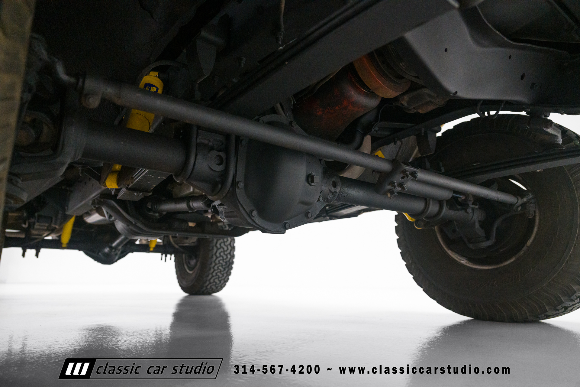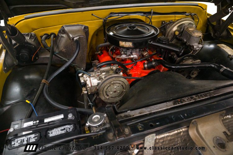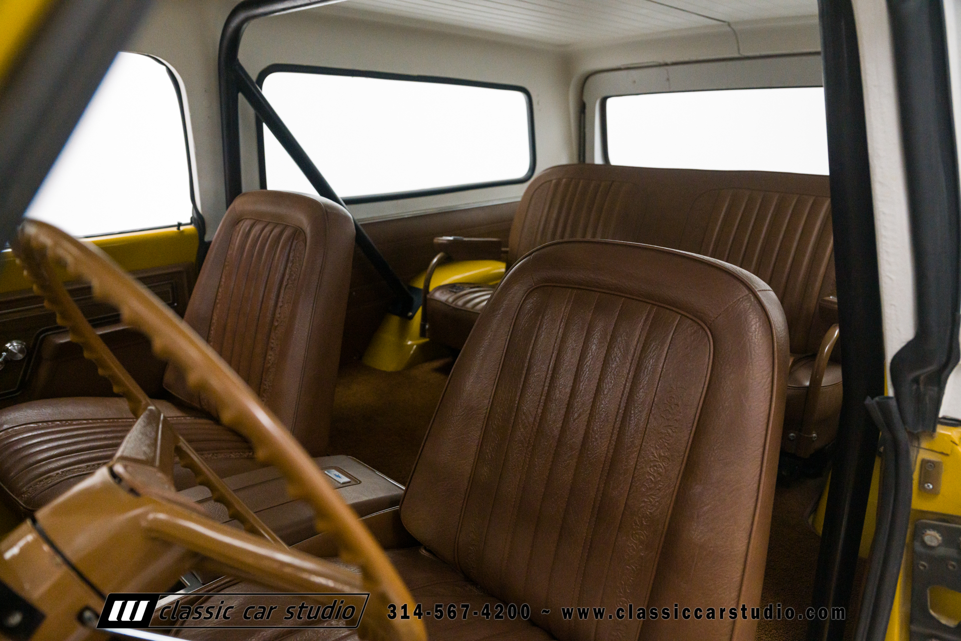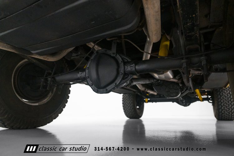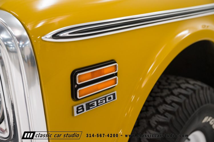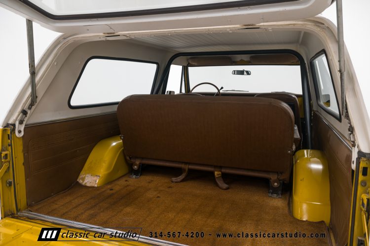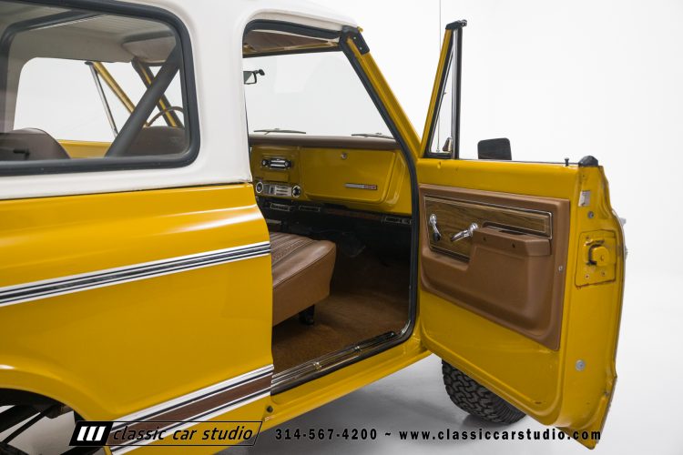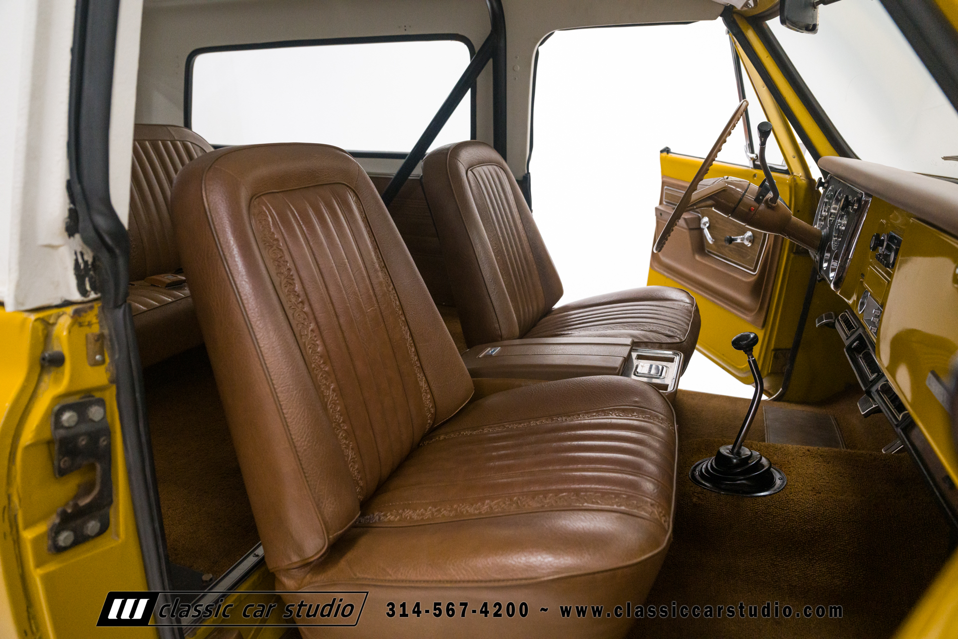The original 350 fires right up, the transmission shifts properly through all the gears and the transfer case works as it should. All of the gauges are in good working order but the original radio does not turn on. The interior is mostly original and very well kept. The seat covers and door panels are in very good condition for their age.