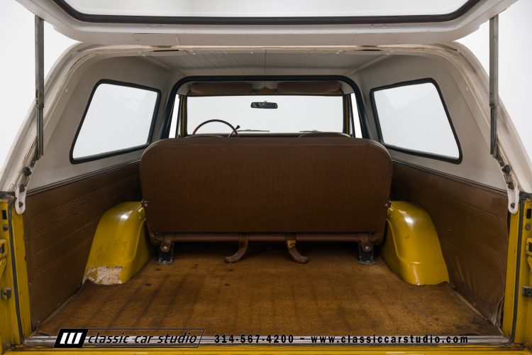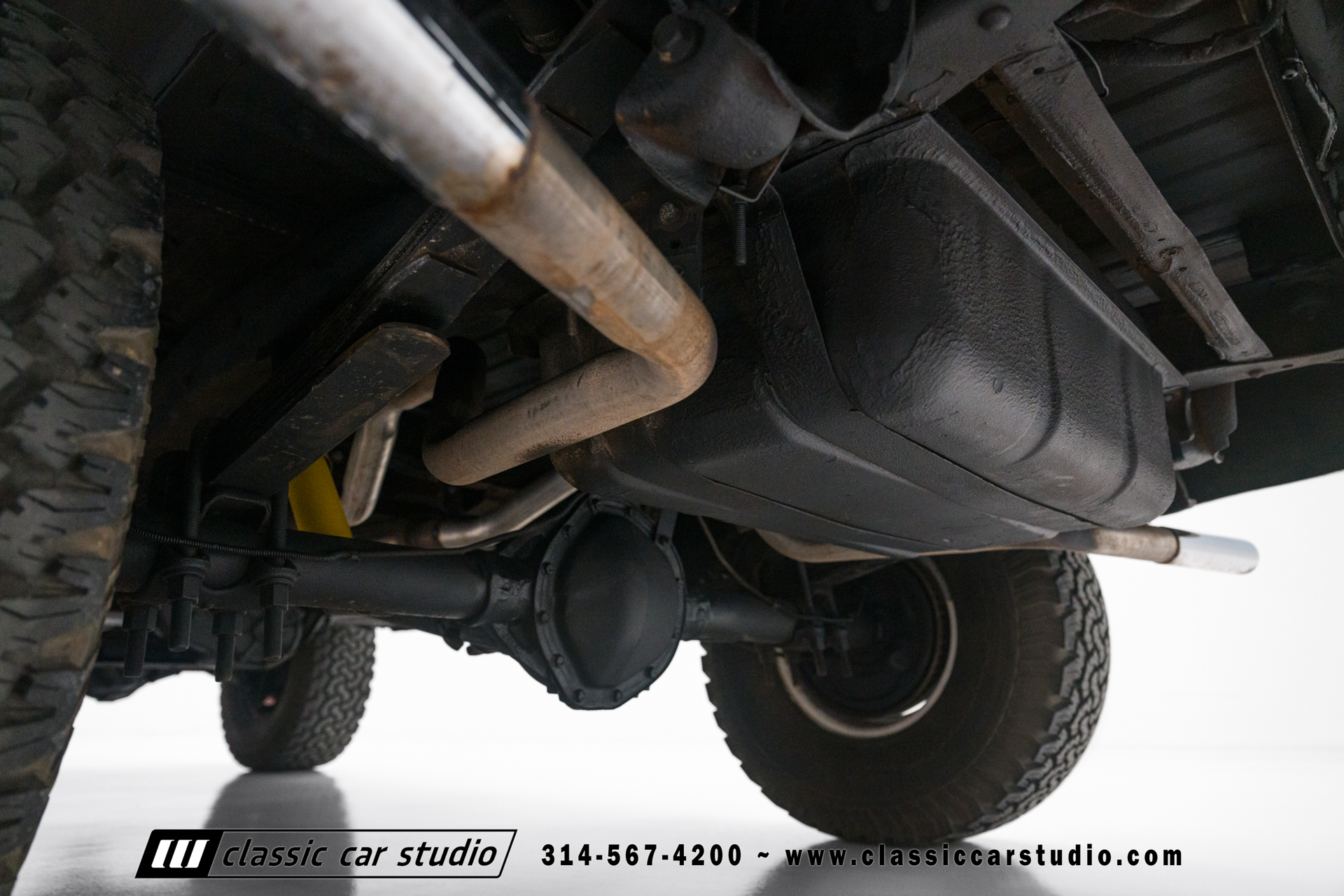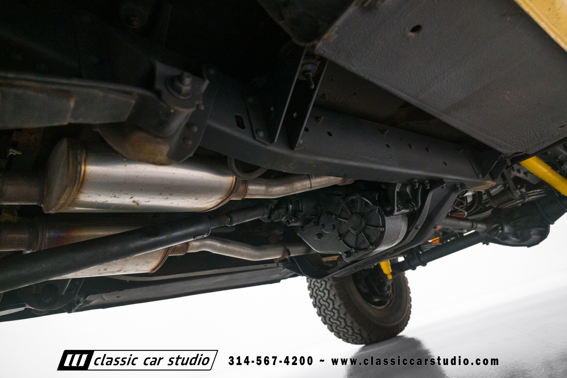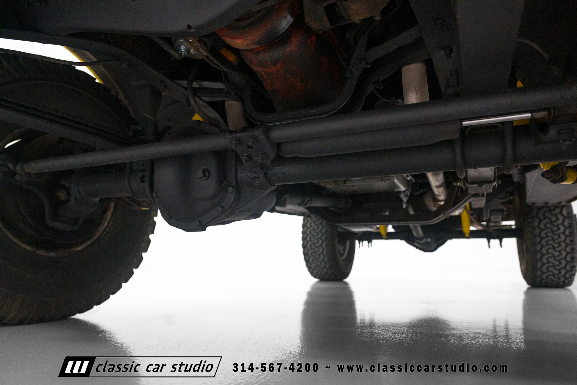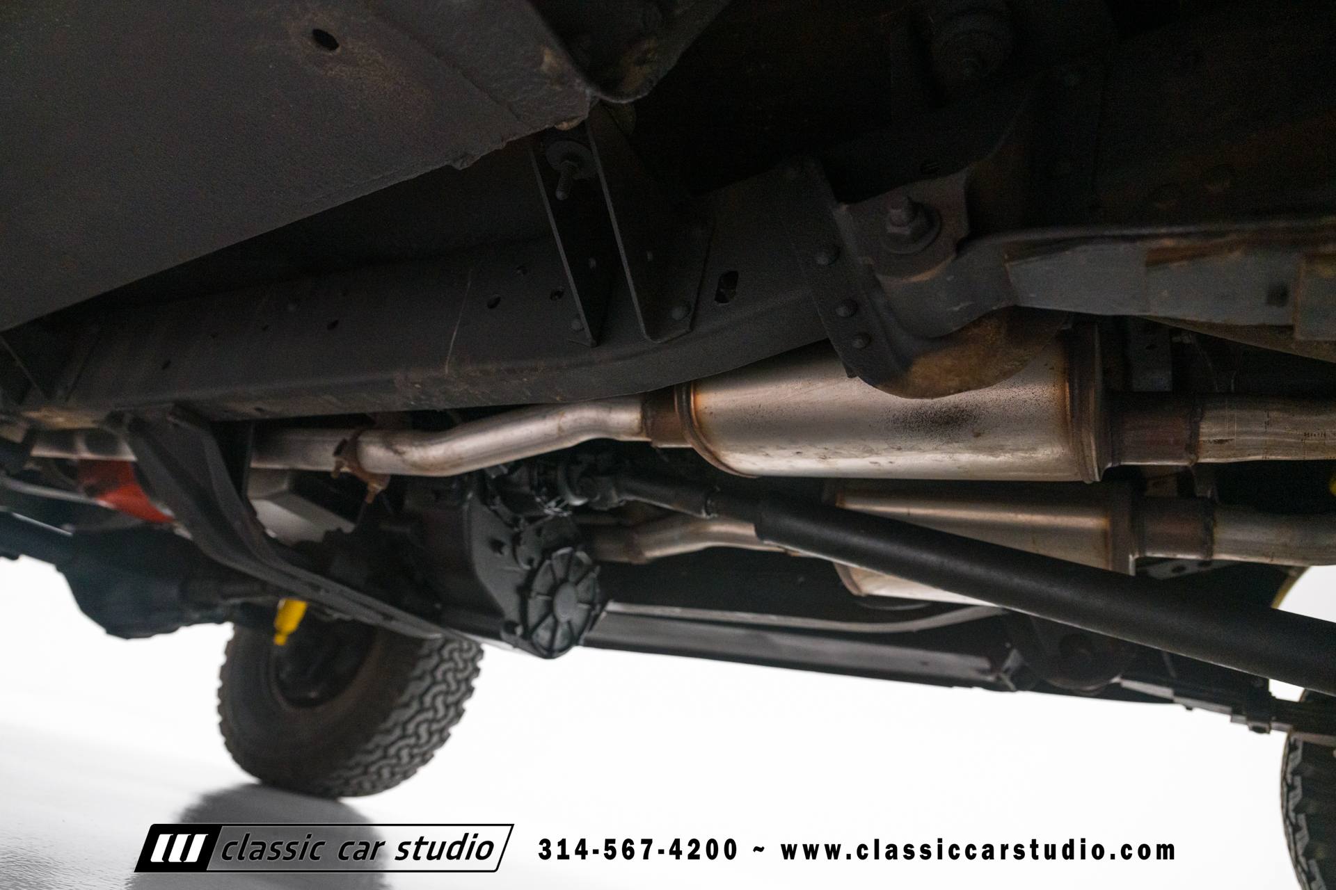 The original 350 fires right up, the transmission shifts properly through all the gears and the transfer case works as it should. All of the gauges are in good working order but the original radio does not turn on. The interior is mostly original and very well kept. The seat covers and door panels are in very good condition for their age.