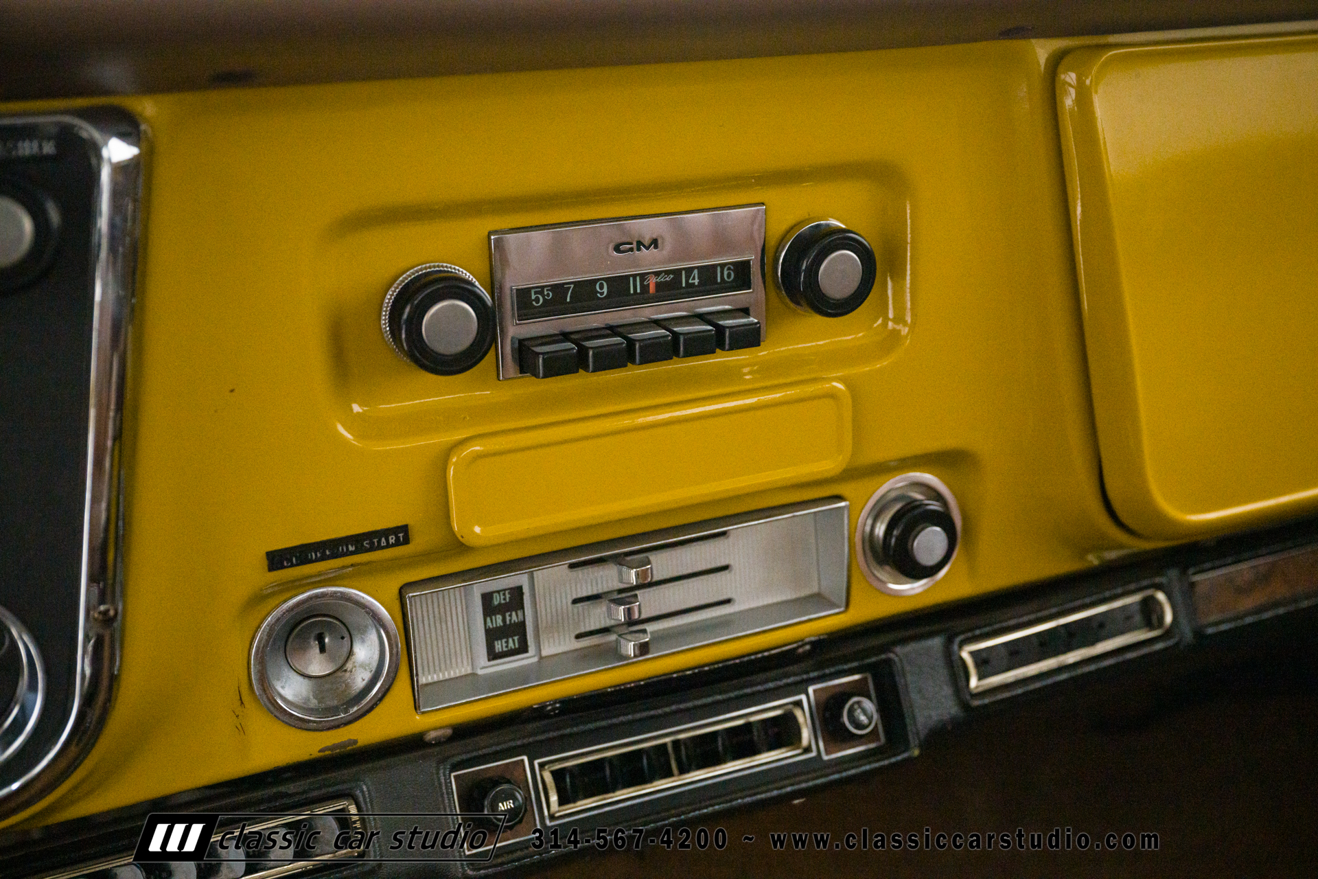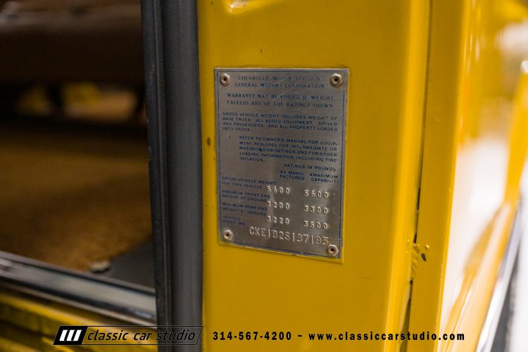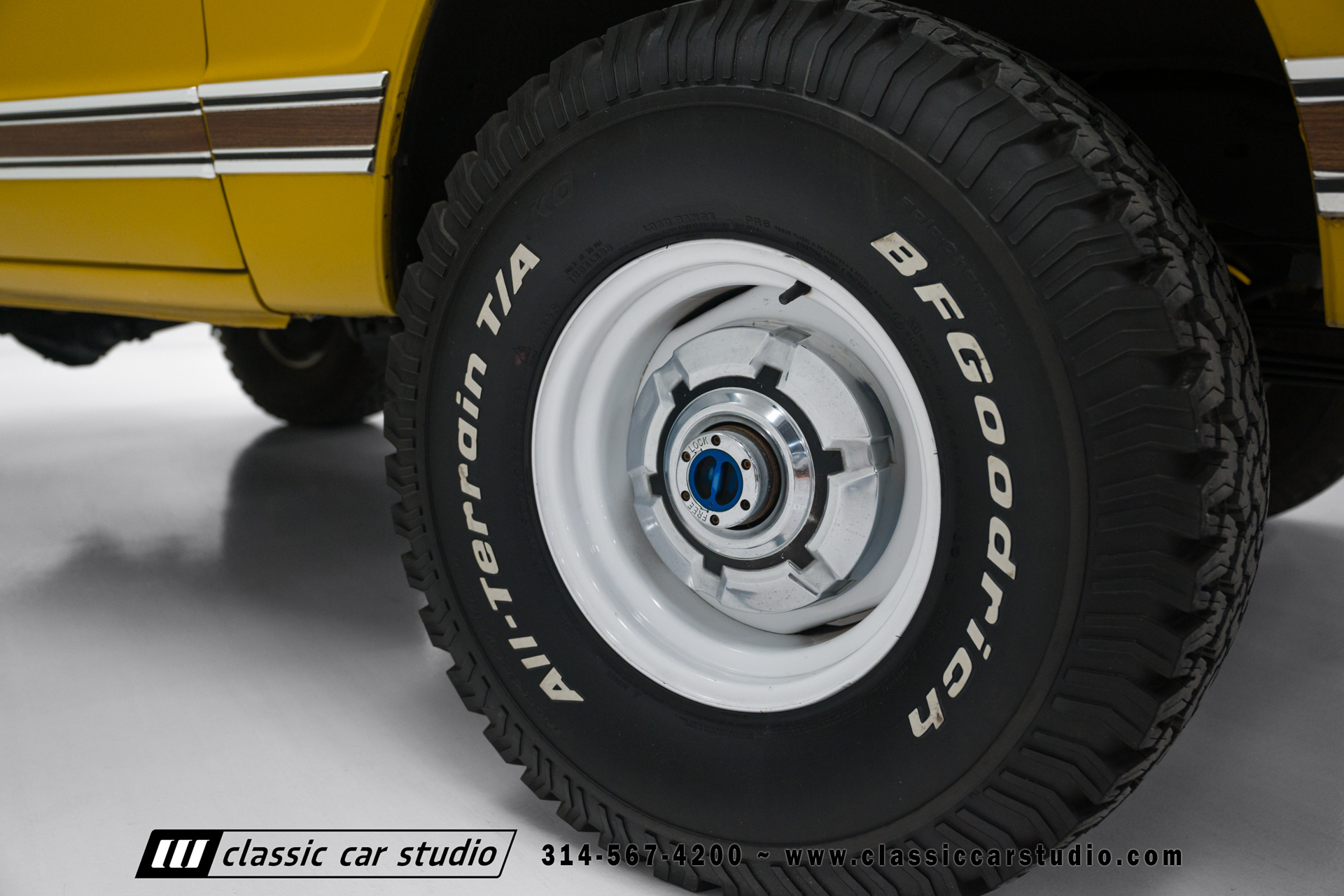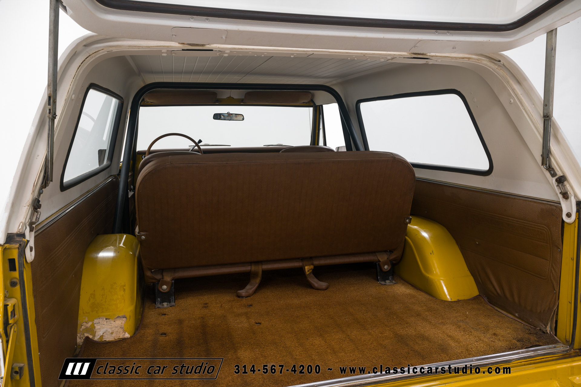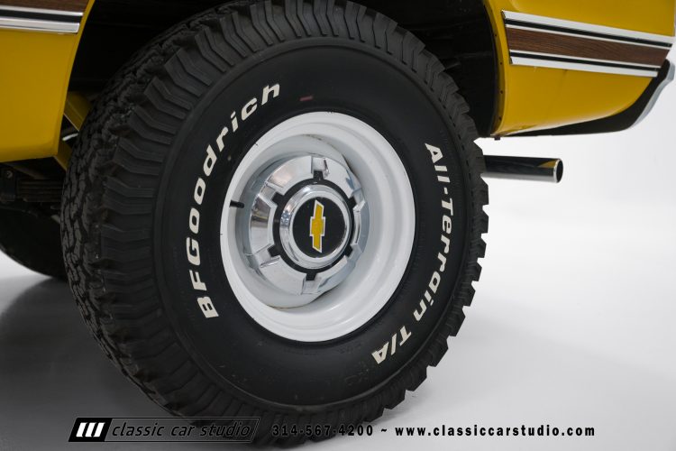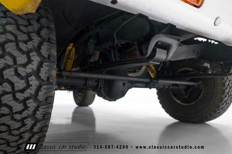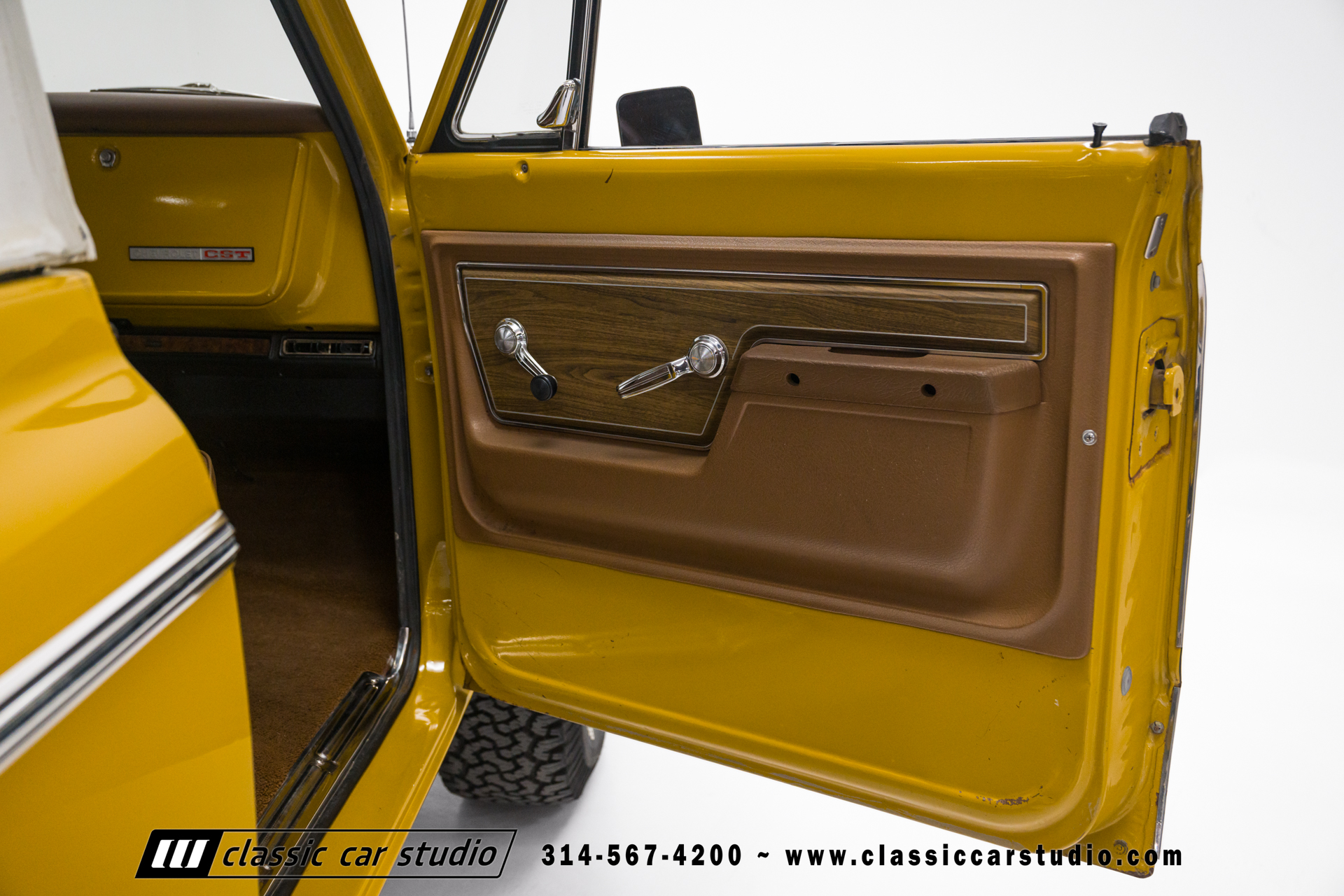 The original 350 fires right up, the transmission shifts properly through all the gears and the transfer case works as it should. All of the gauges are in good working order but the original radio does not turn on. The interior is mostly original and very well kept. The seat covers and door panels are in very good condition for their age.