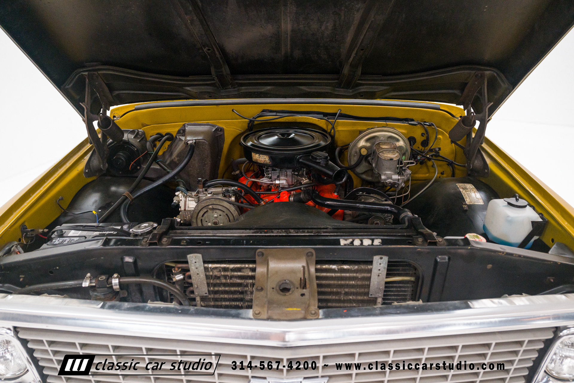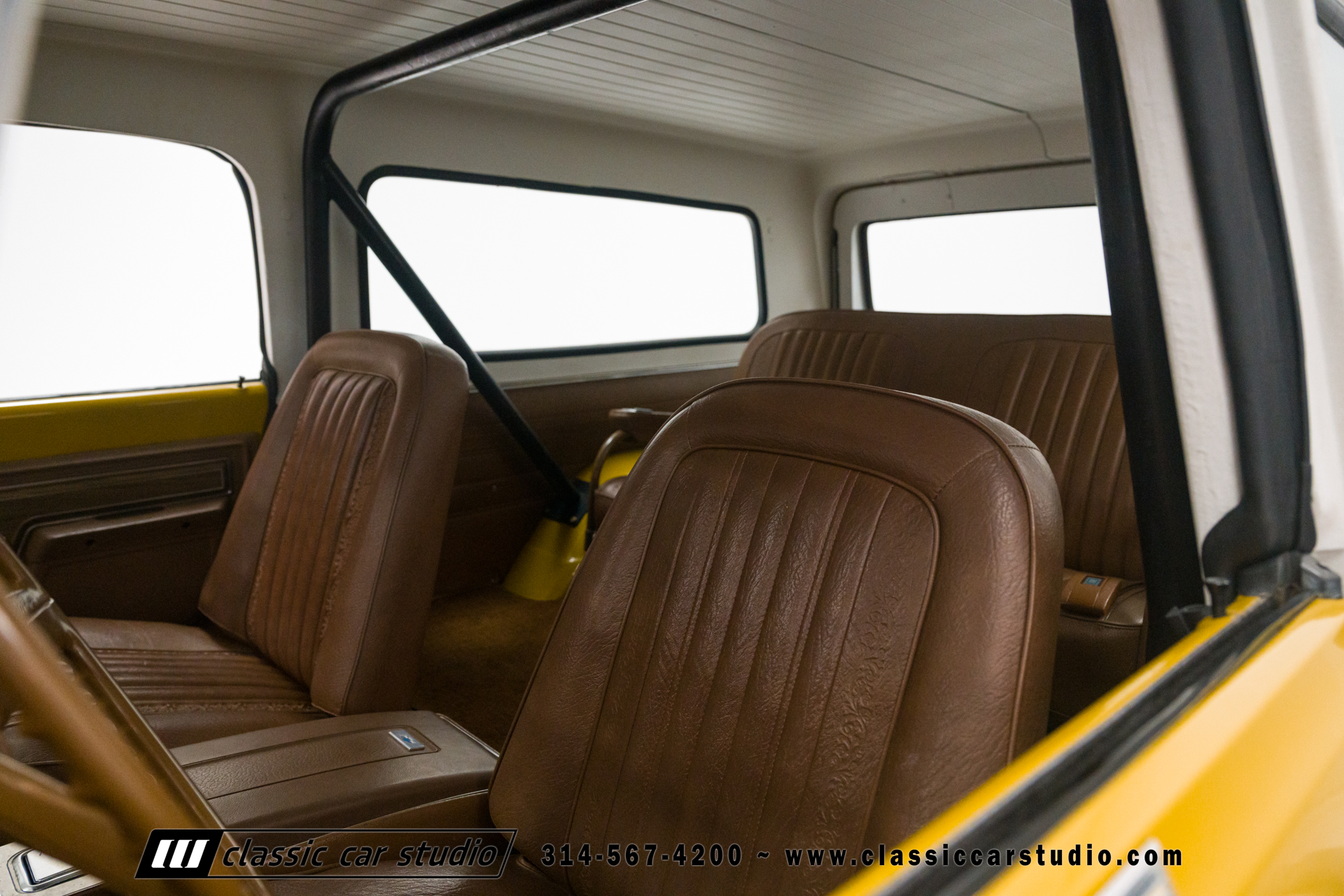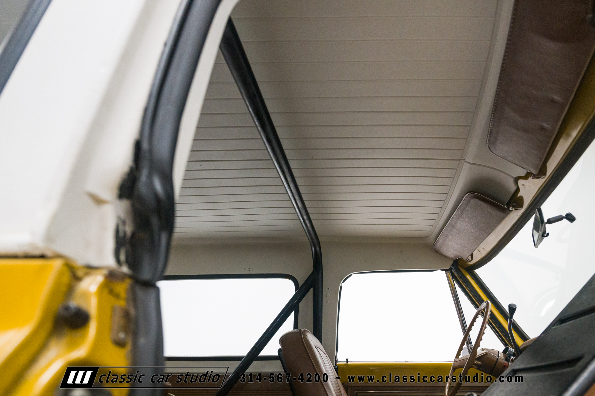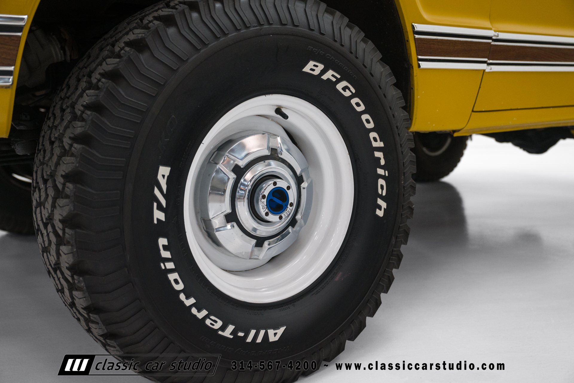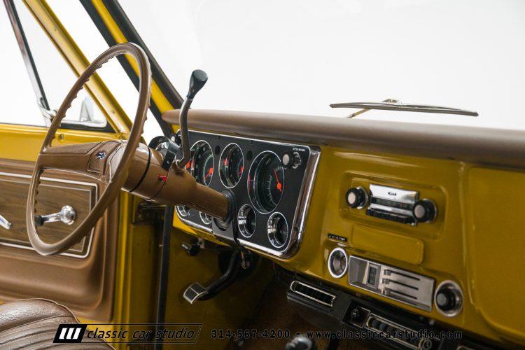 The original 350 fires right up, the transmission shifts properly through all the gears and the transfer case works as it should. All of the gauges are in good working order but the original radio does not turn on. The interior is mostly original and very well kept. The seat covers and door panels are in very good condition for their age.