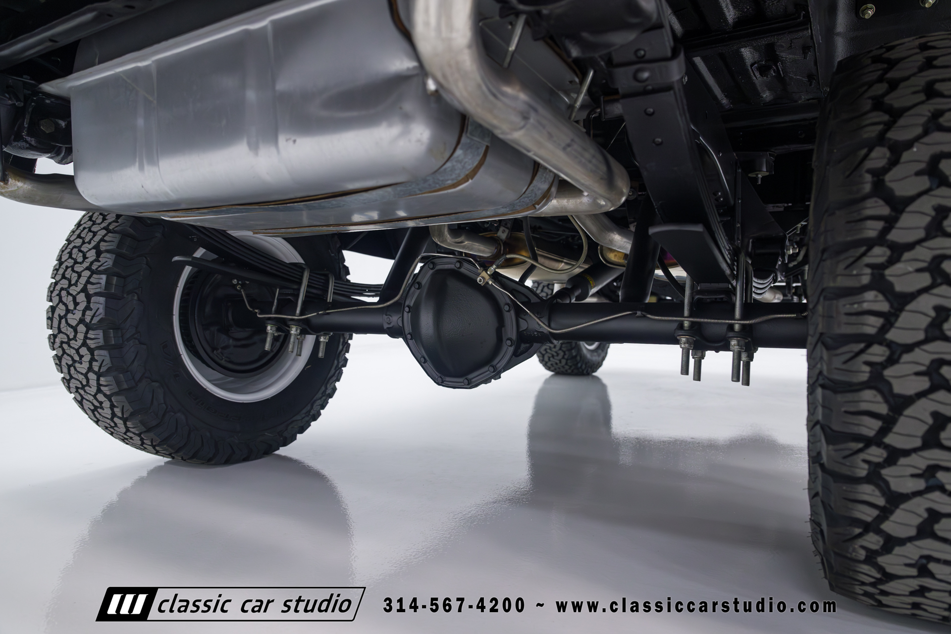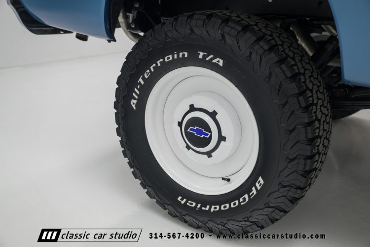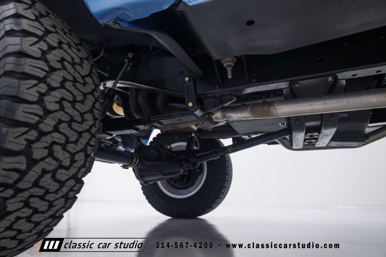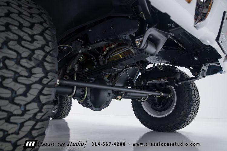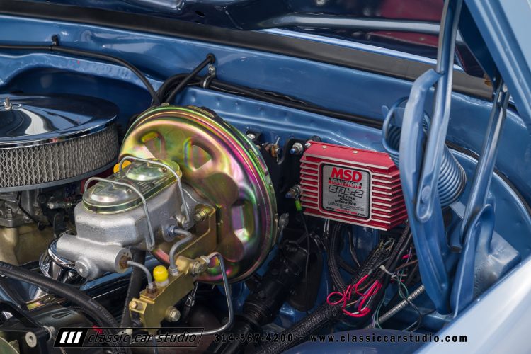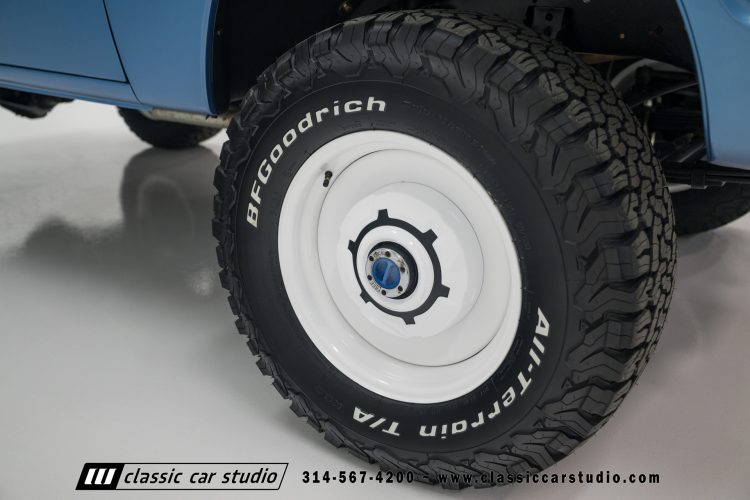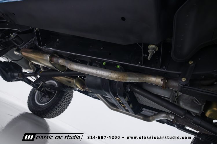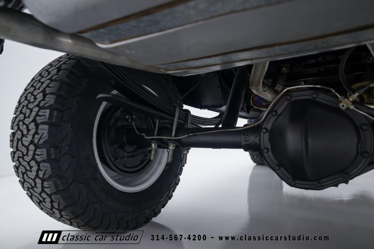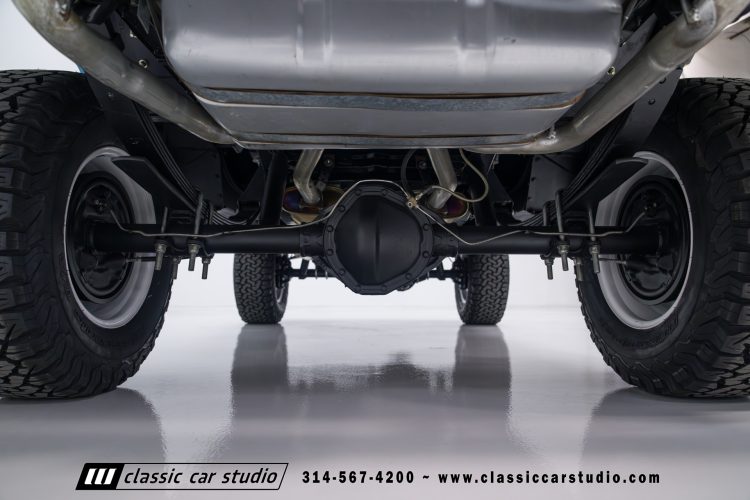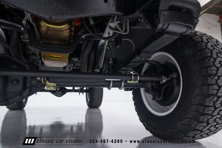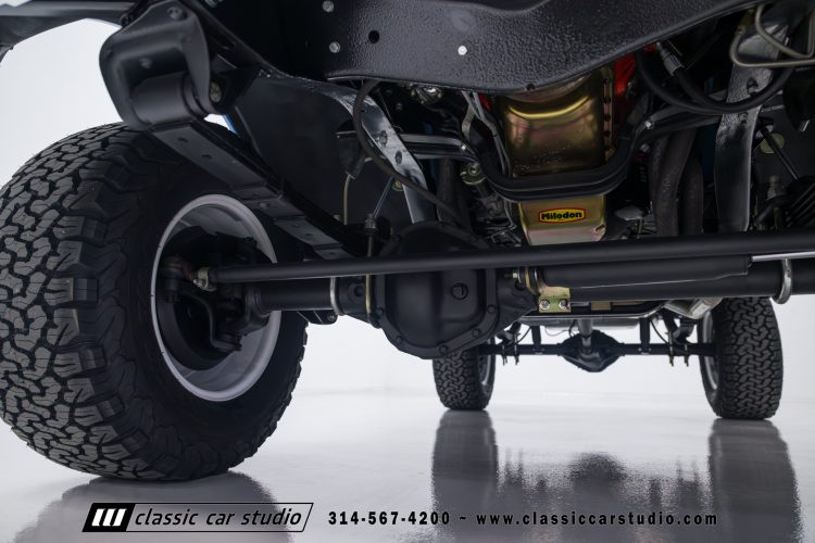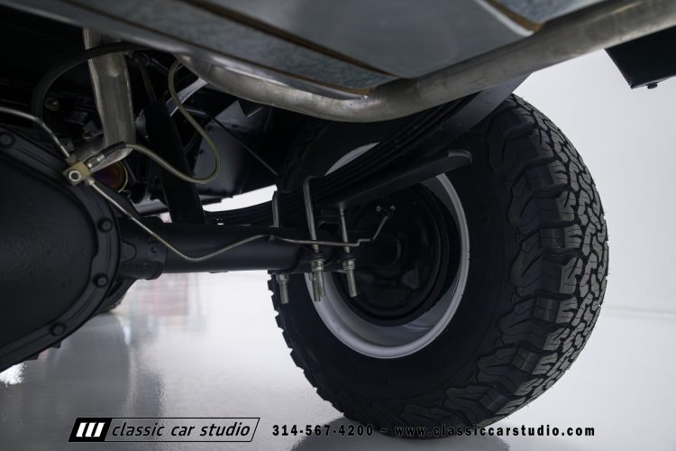 While the body was off, the frame was sandblasted and powder coated before it was reassembled with all new suspension components. The brakes have been rebuilt and are configured with front disc, rear drum, and a new master cylinder and booster. All of the brake lines and hoses are new as well. The wheels are 17” steel wheels with custom fitted restored dog dishes and new BFG tires.