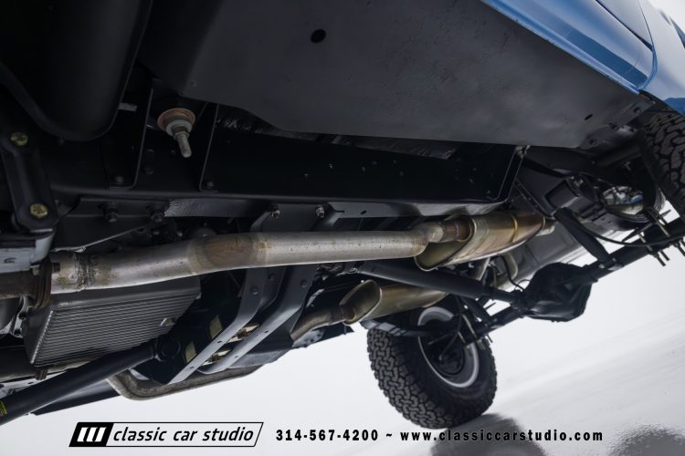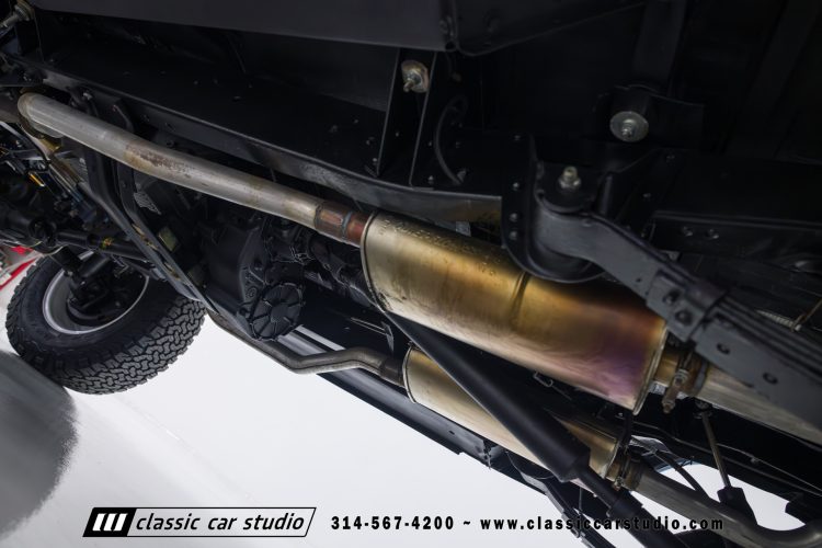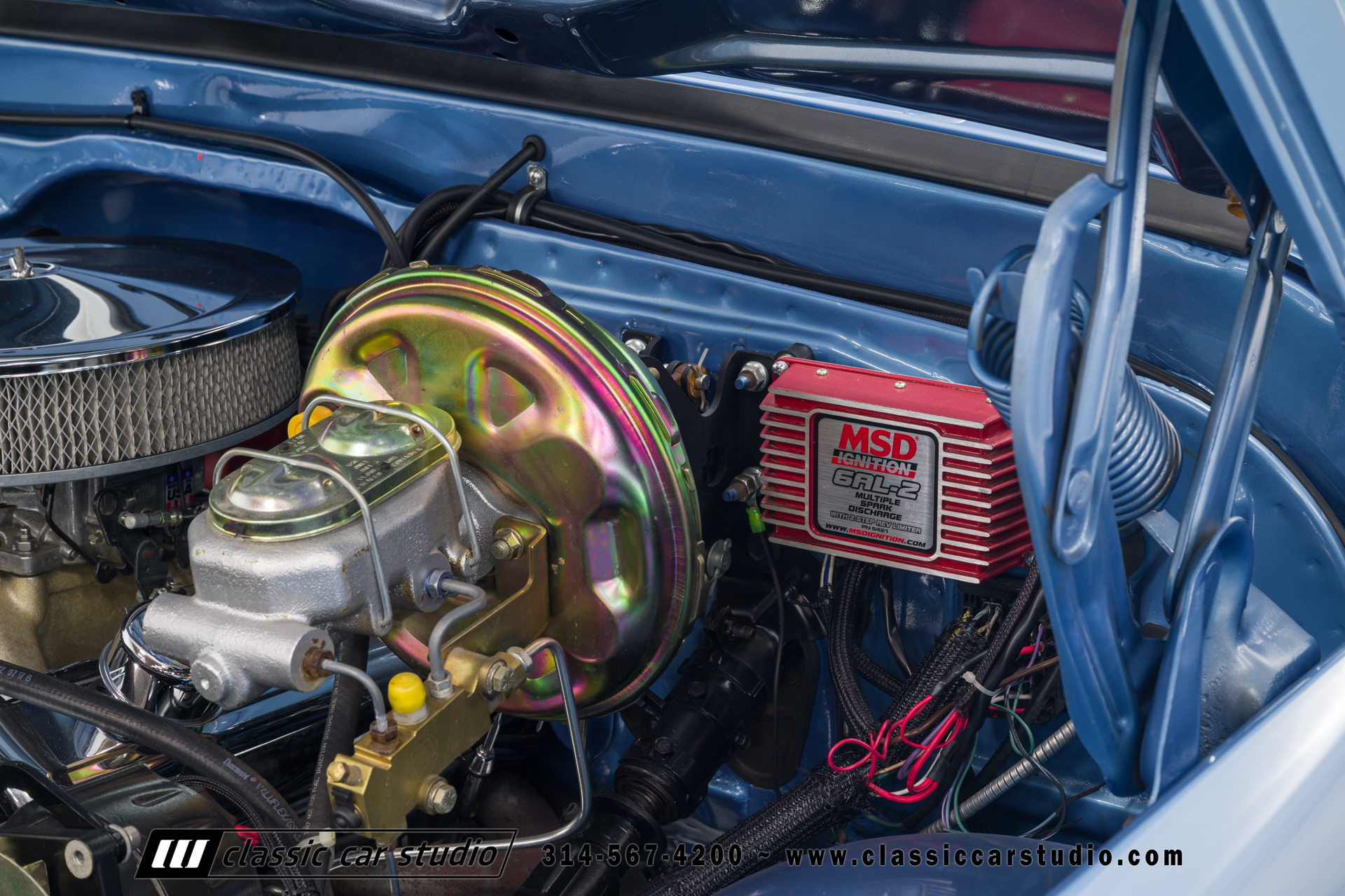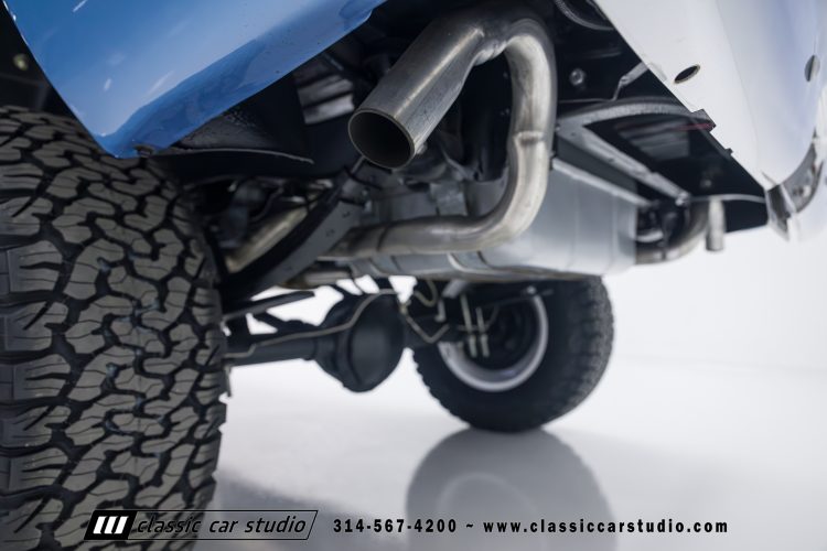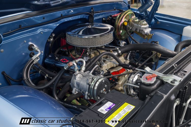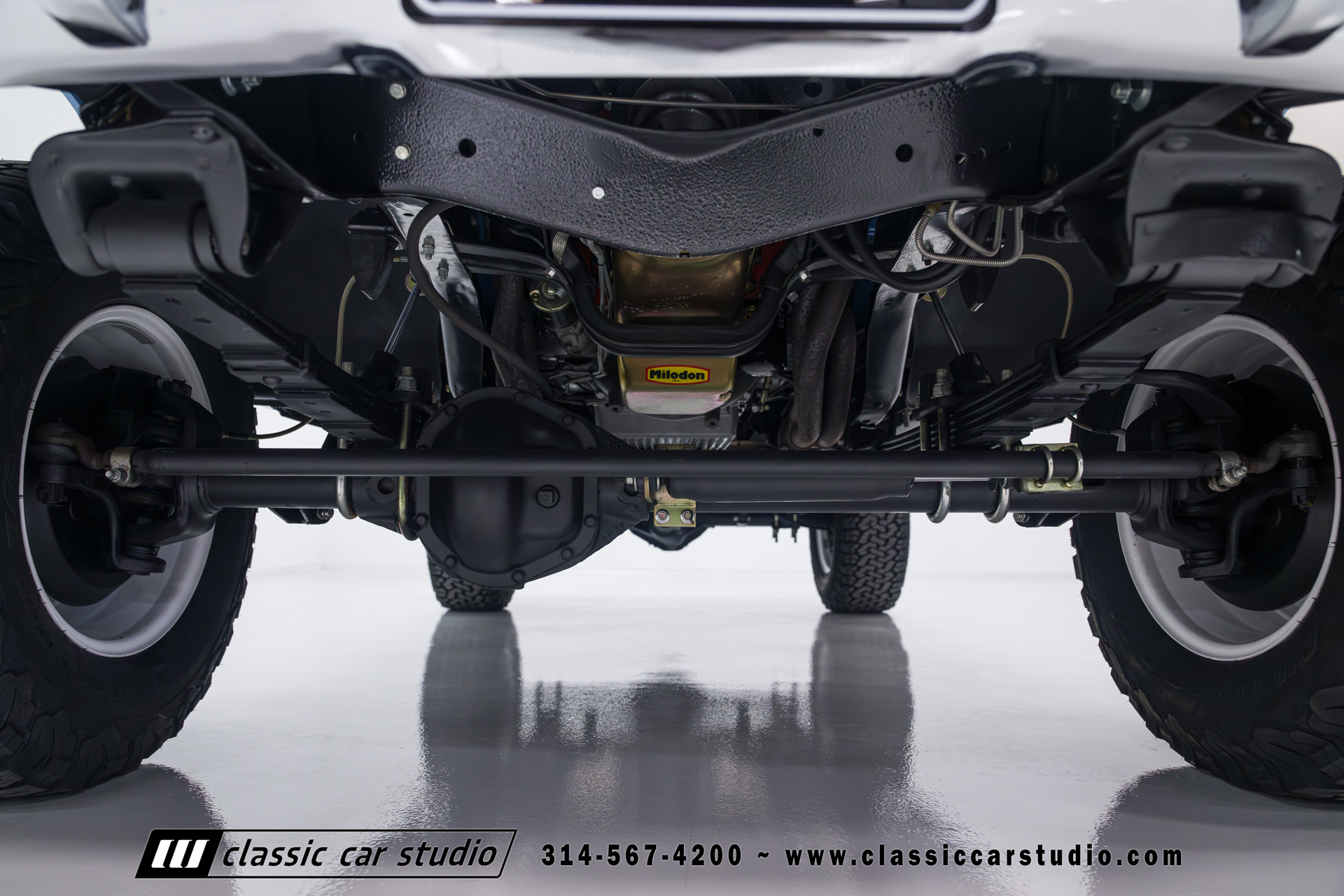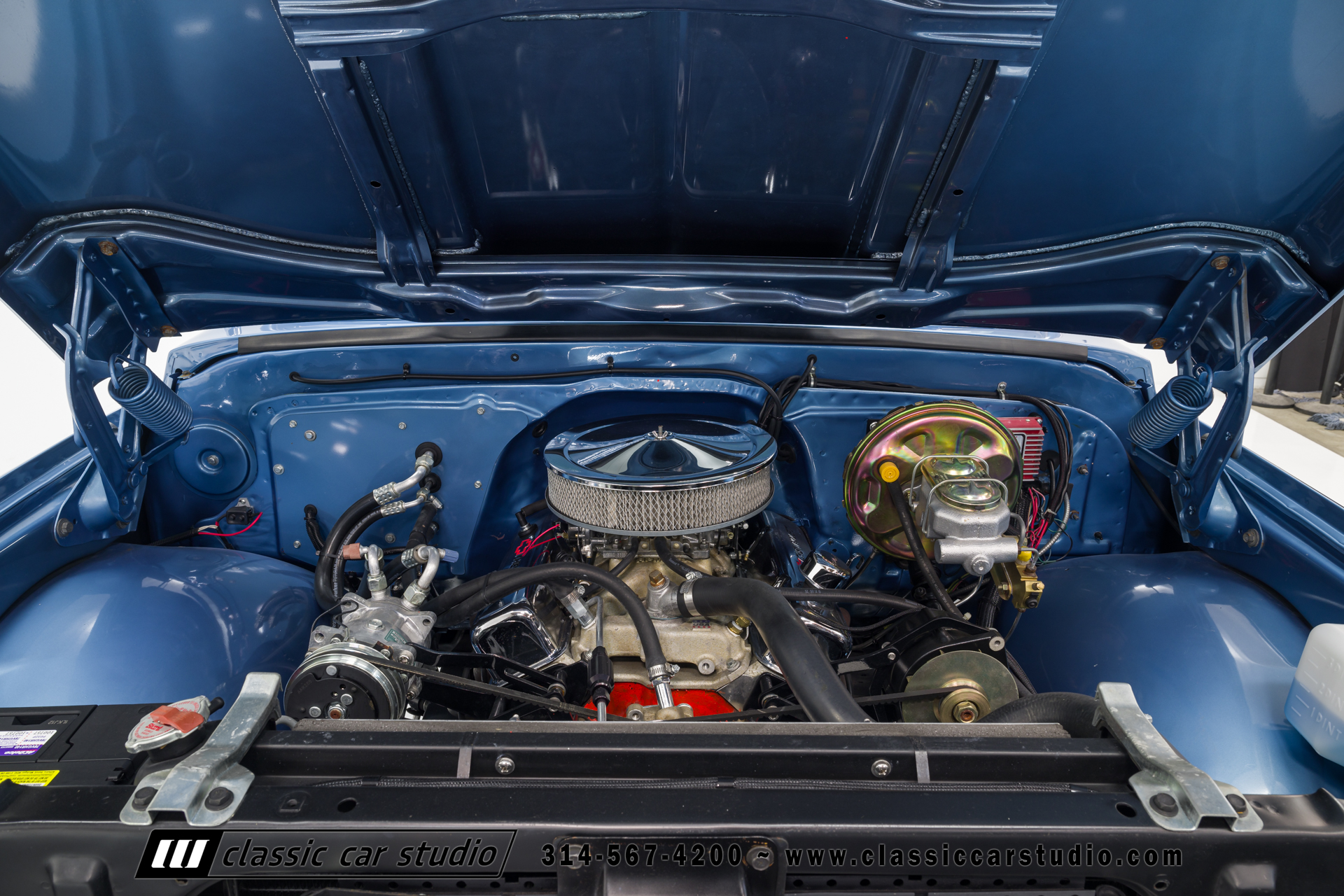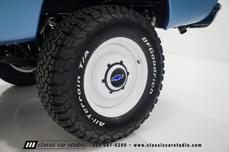 While the body was off, the frame was sandblasted and powder coated before it was reassembled with all new suspension components. The brakes have been rebuilt and are configured with front disc, rear drum, and a new master cylinder and booster. All of the brake lines and hoses are new as well. The wheels are 17” steel wheels with custom fitted restored dog dishes and new BFG tires.