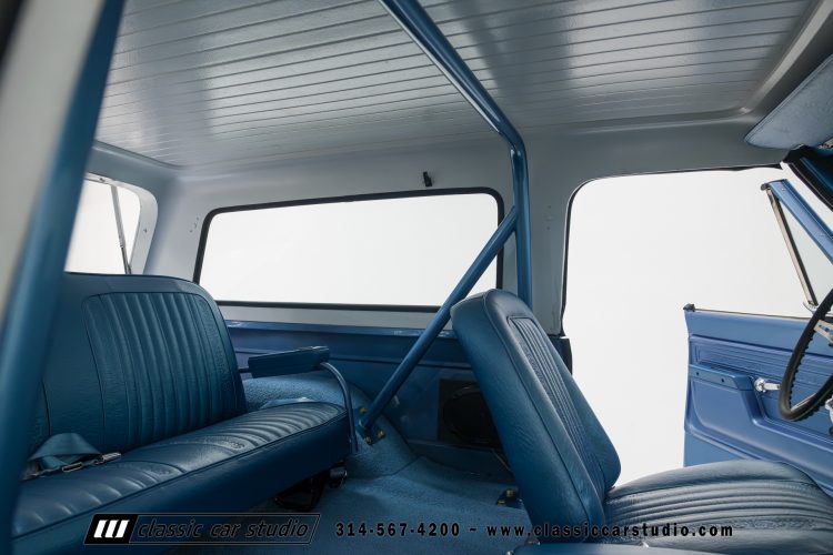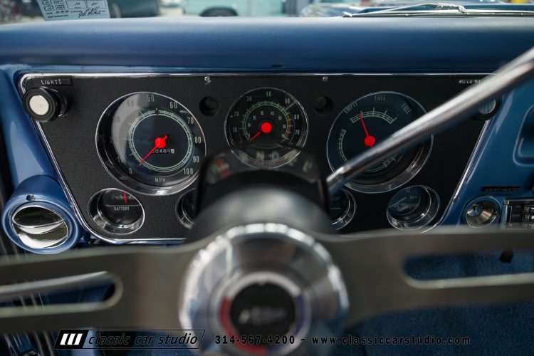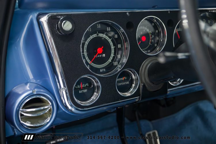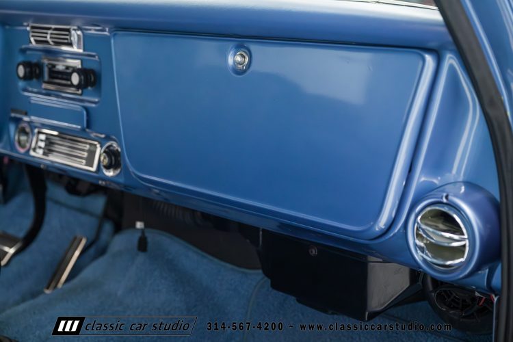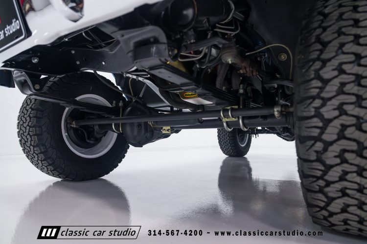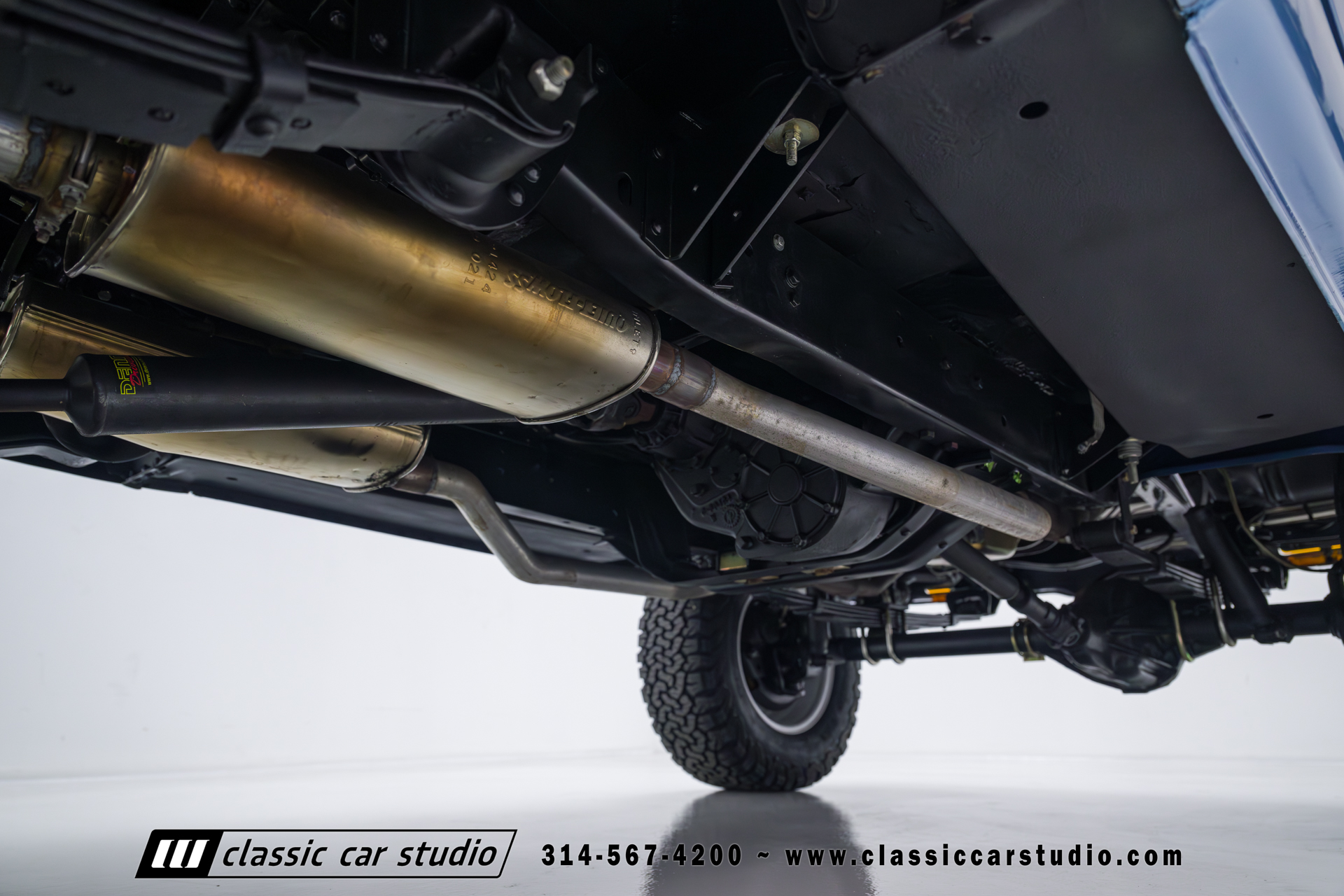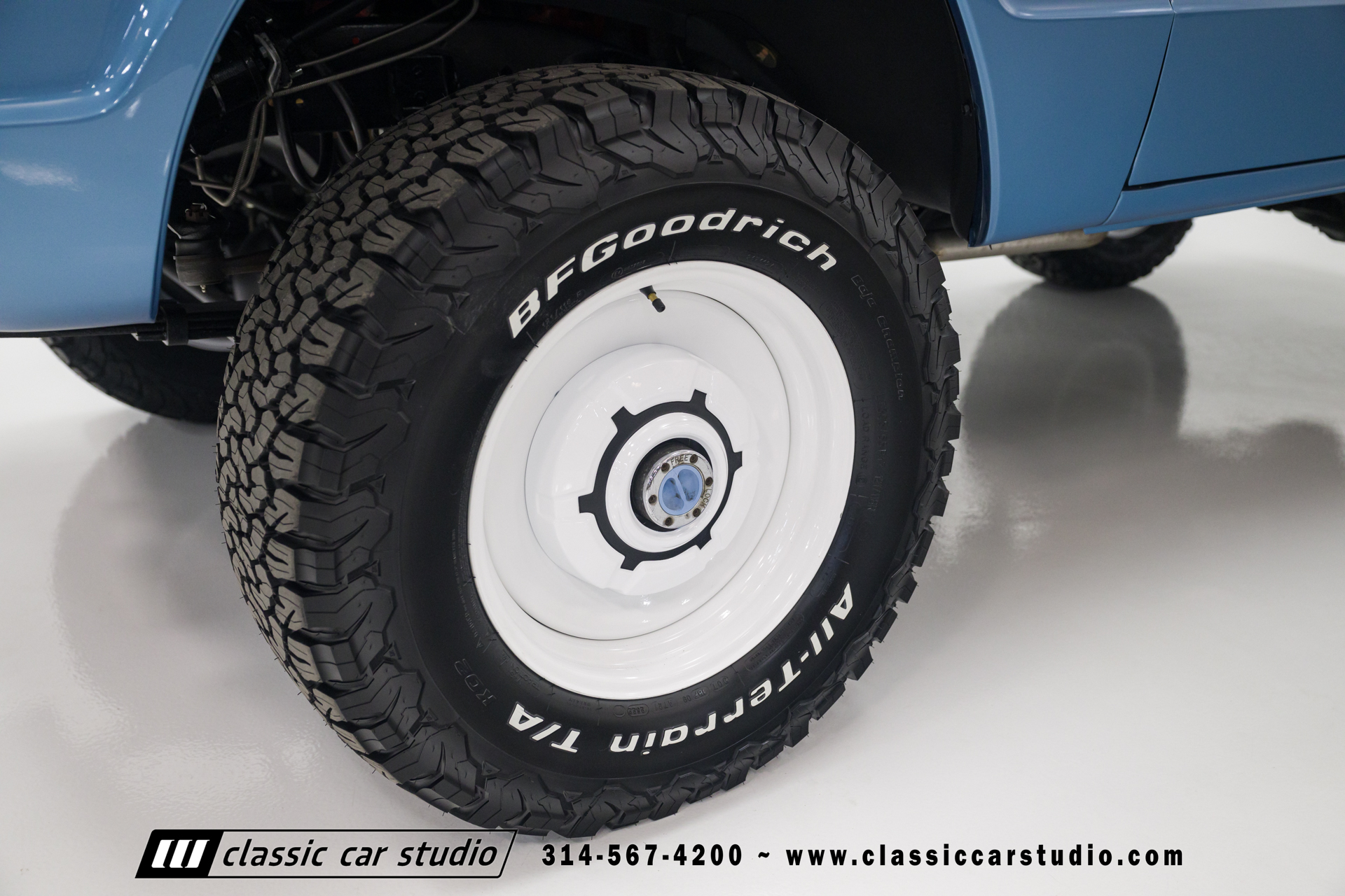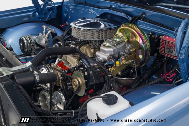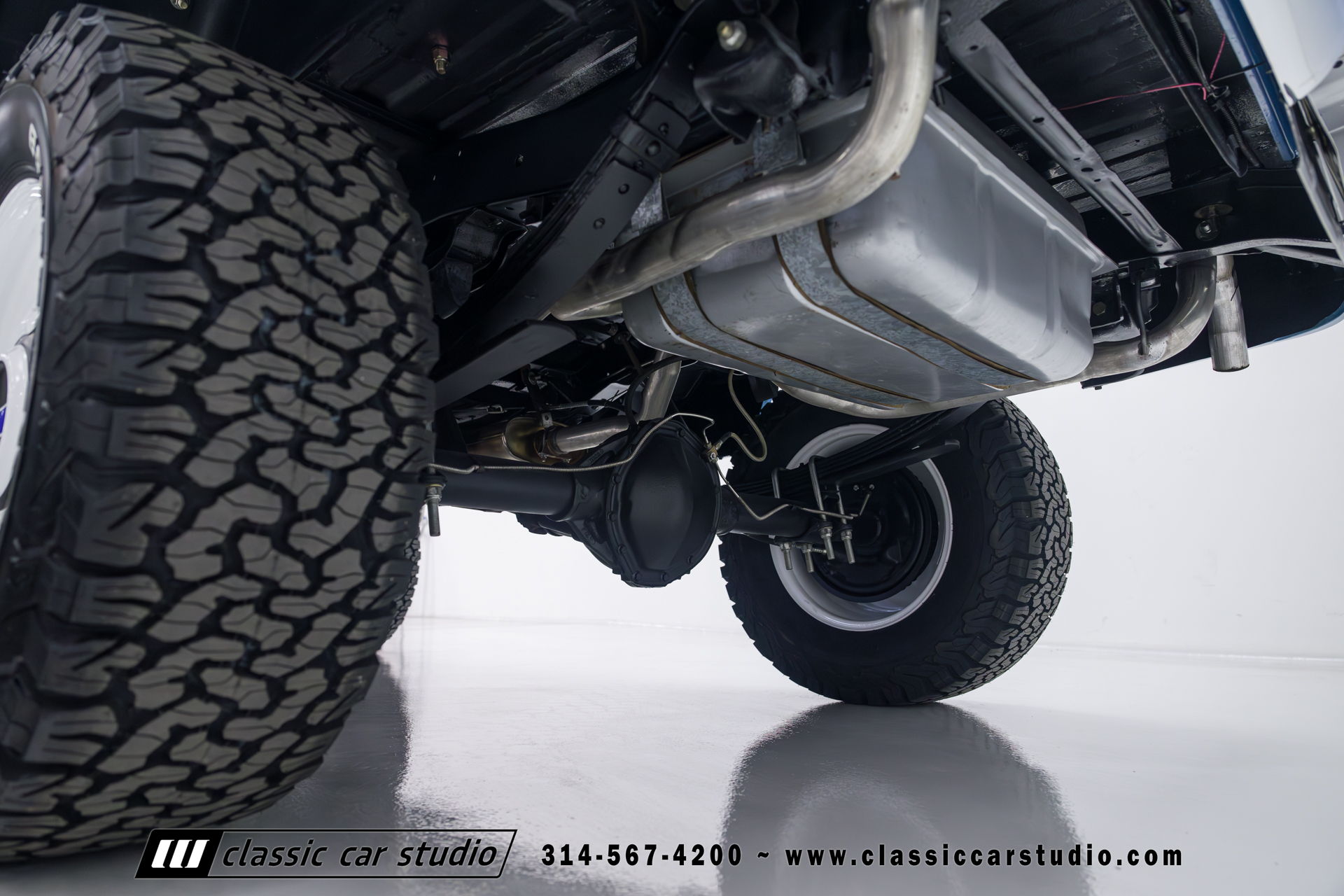 While the body was off, the frame was sandblasted and powder coated before it was reassembled with all new suspension components. The brakes have been rebuilt and are configured with front disc, rear drum, and a new master cylinder and booster. All of the brake lines and hoses are new as well. The wheels are 17” steel wheels with custom fitted restored dog dishes and new BFG tires.