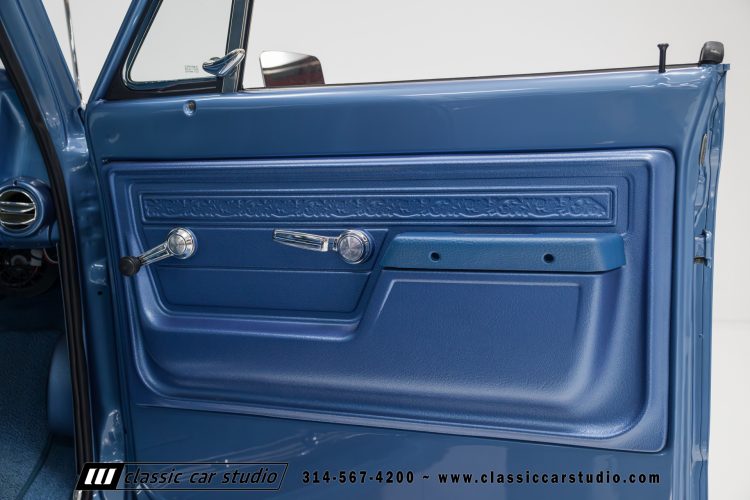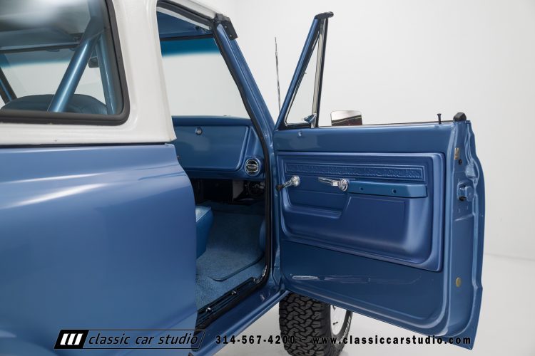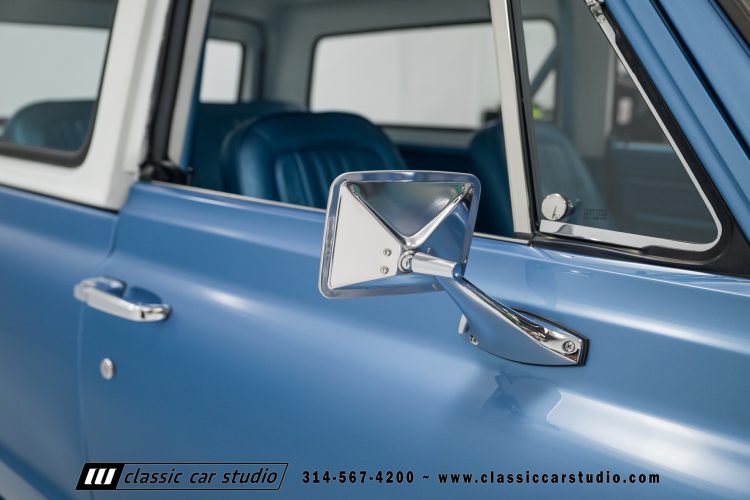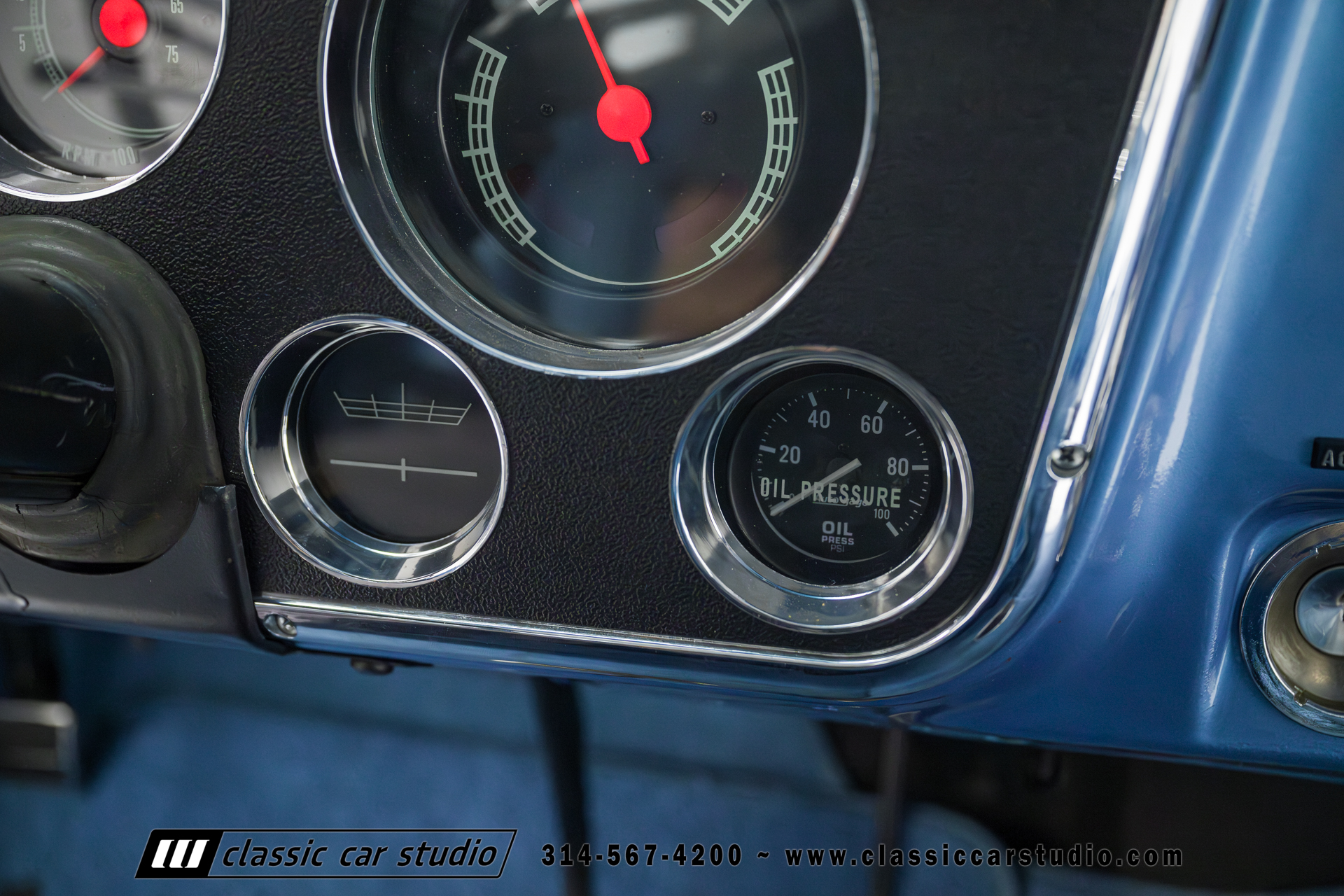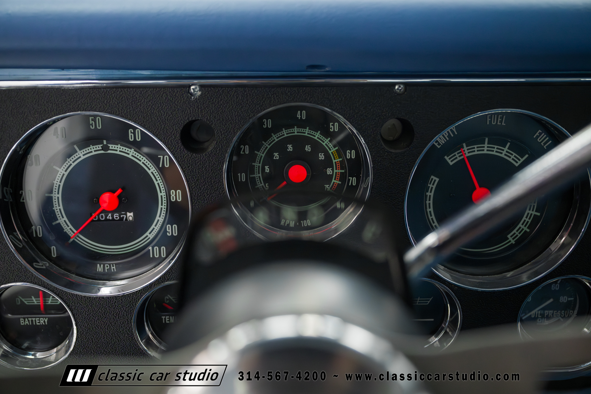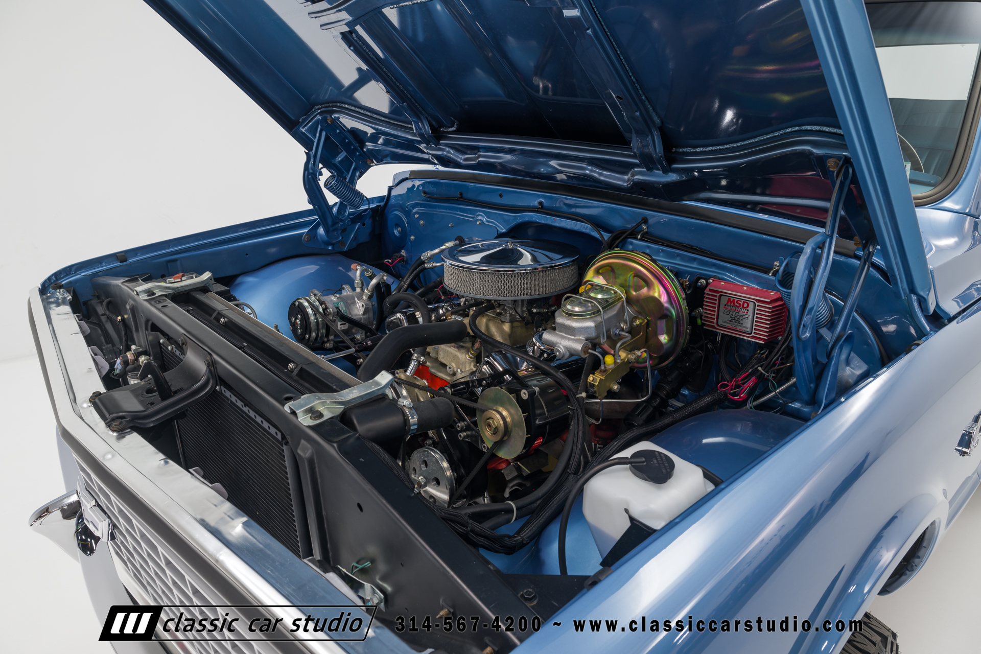 While the body was off, the frame was sandblasted and powder coated before it was reassembled with all new suspension components. The brakes have been rebuilt and are configured with front disc, rear drum, and a new master cylinder and booster. All of the brake lines and hoses are new as well. The wheels are 17” steel wheels with custom fitted restored dog dishes and new BFG tires.