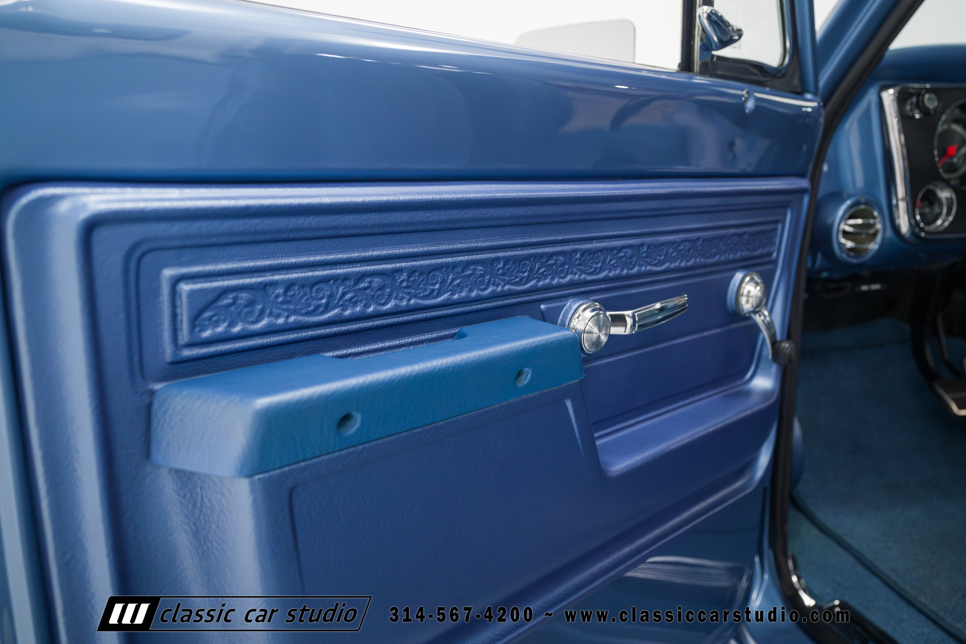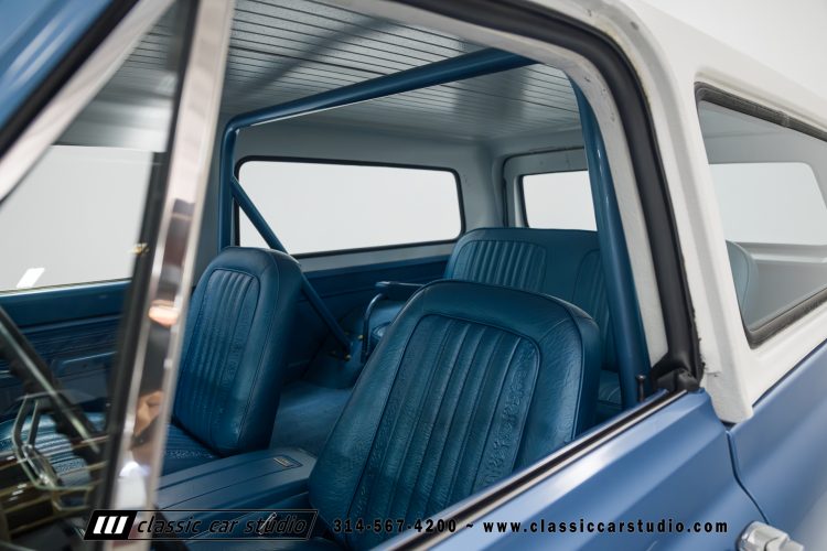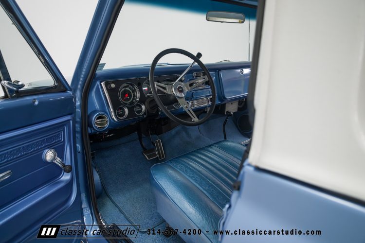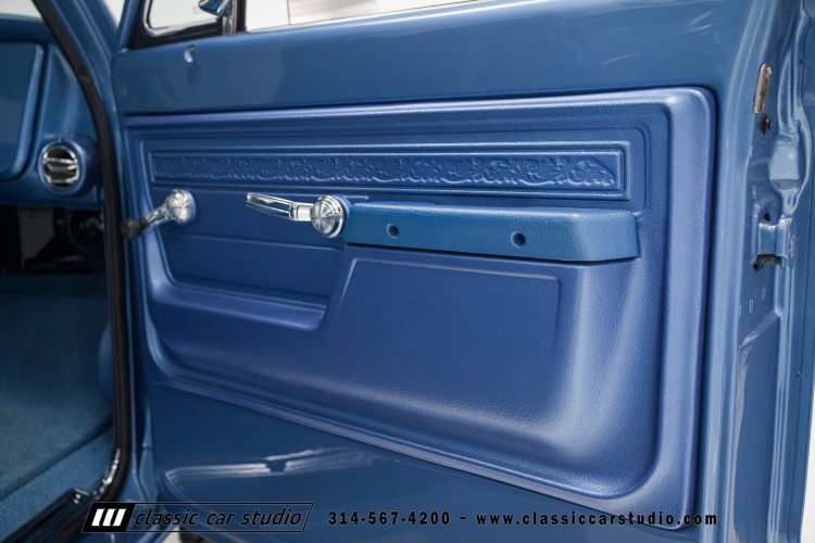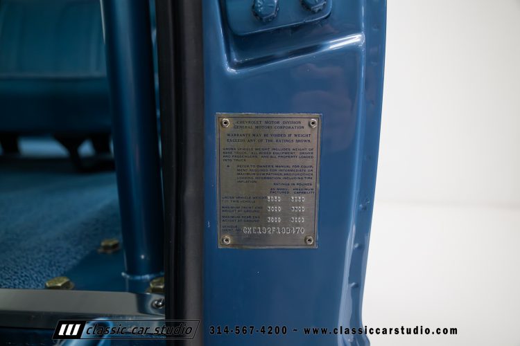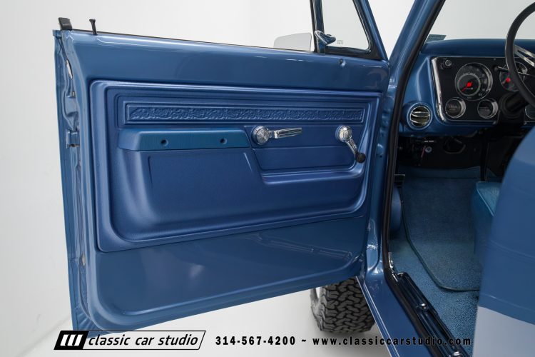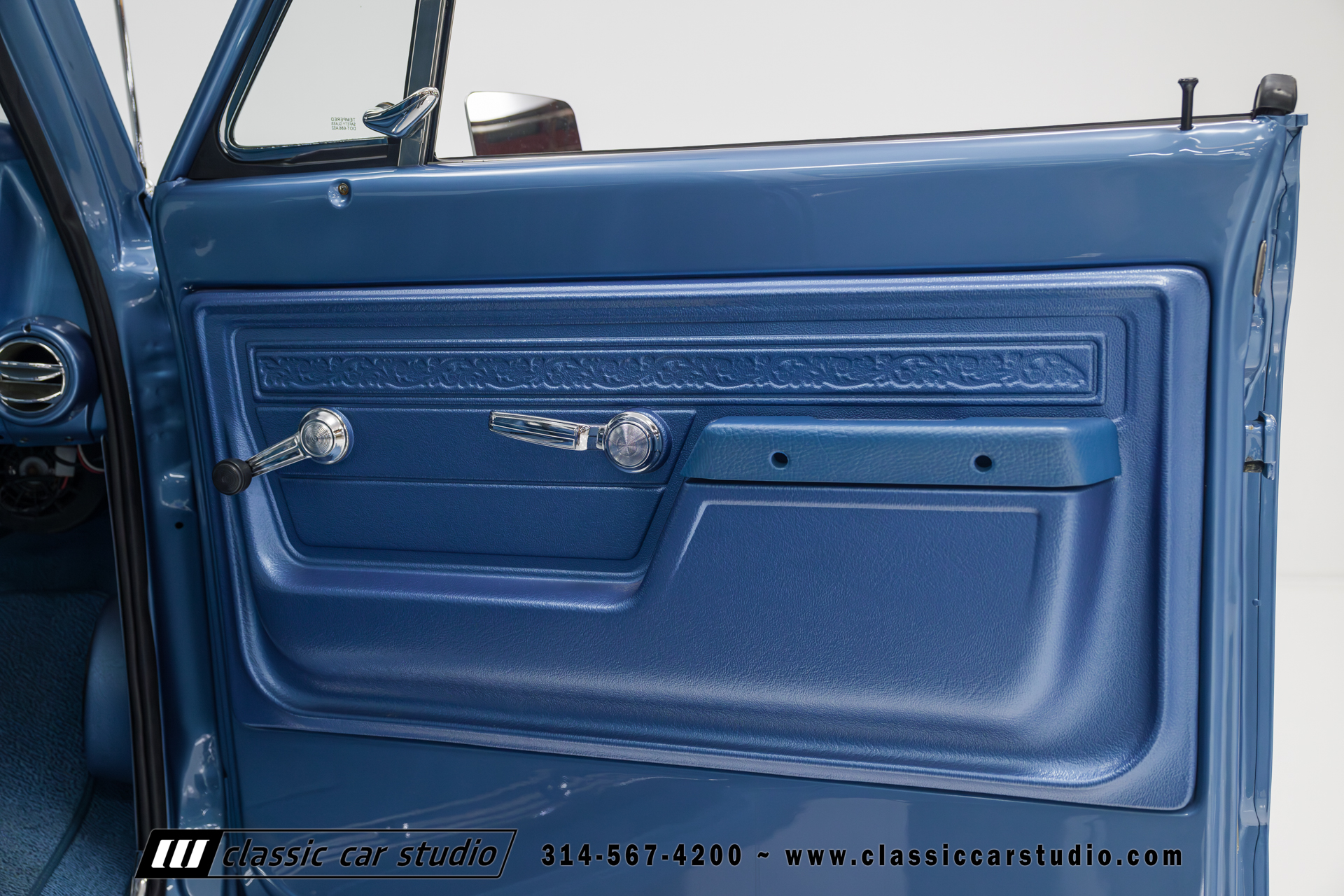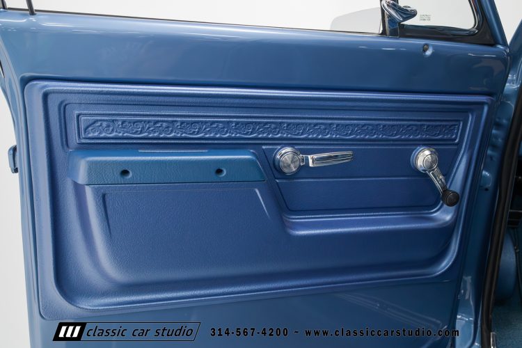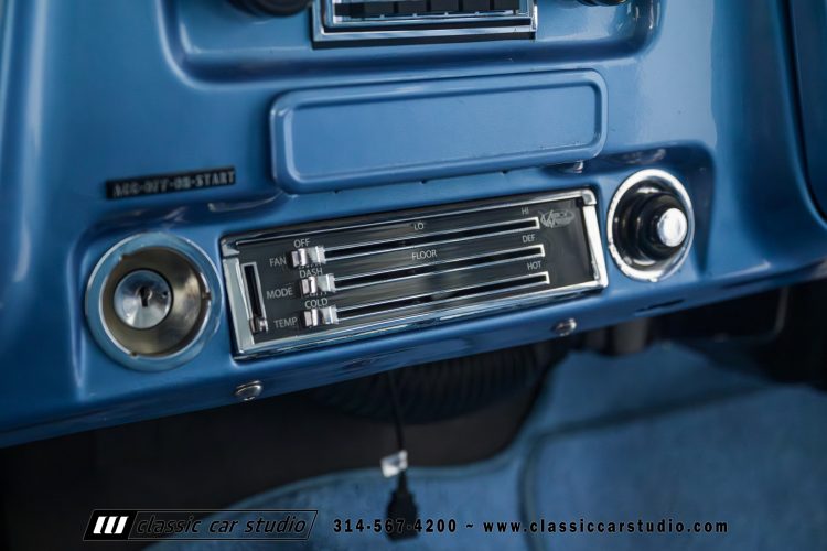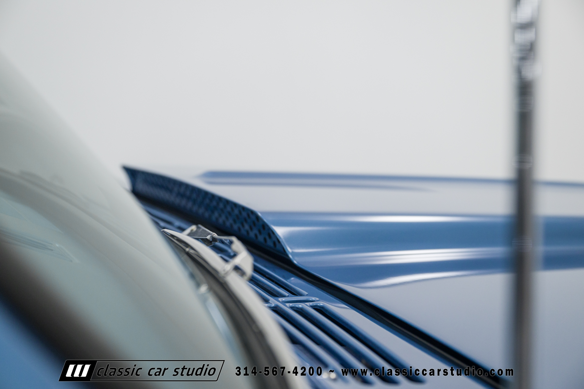 While the body was off, the frame was sandblasted and powder coated before it was reassembled with all new suspension components. The brakes have been rebuilt and are configured with front disc, rear drum, and a new master cylinder and booster. All of the brake lines and hoses are new as well. The wheels are 17” steel wheels with custom fitted restored dog dishes and new BFG tires.