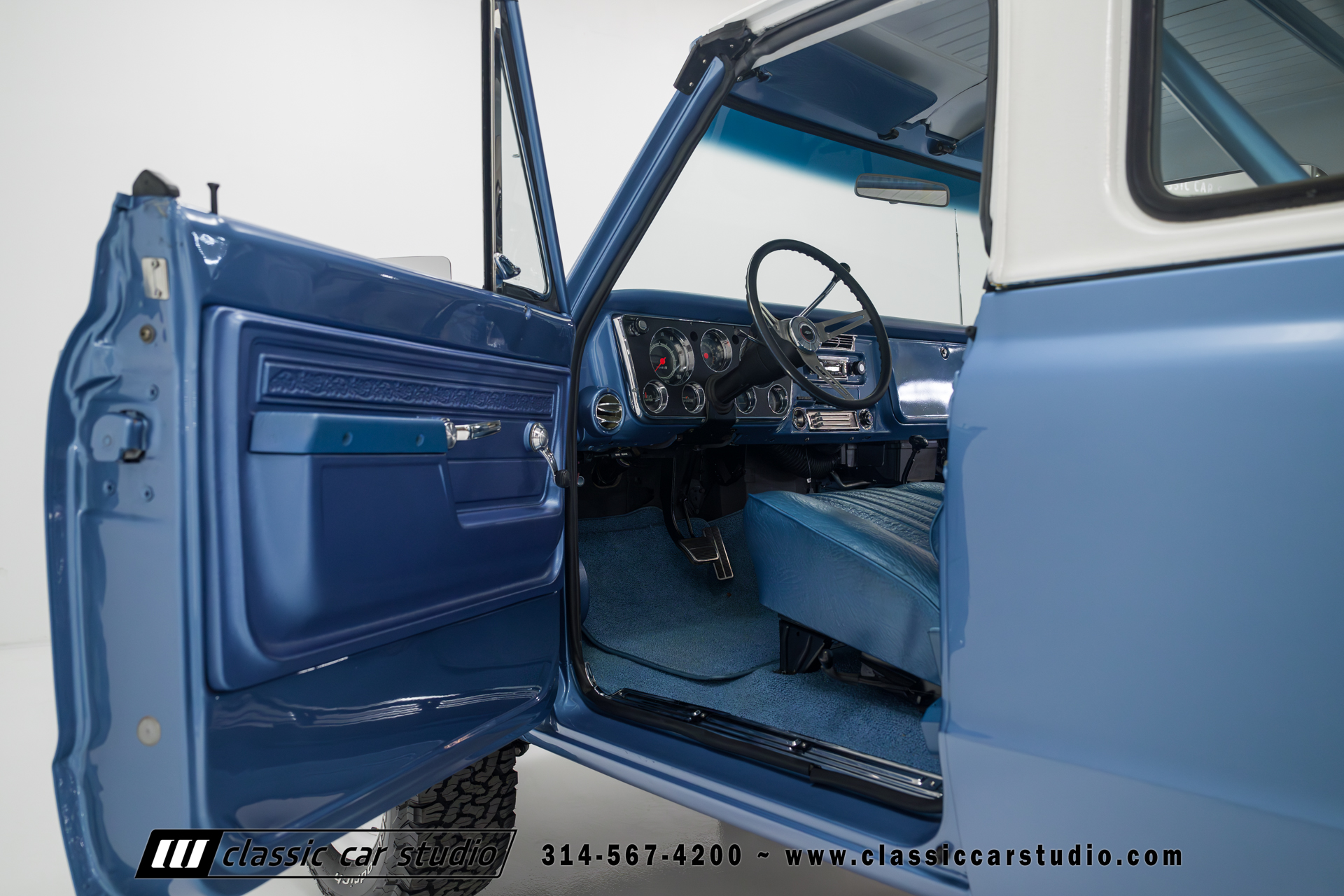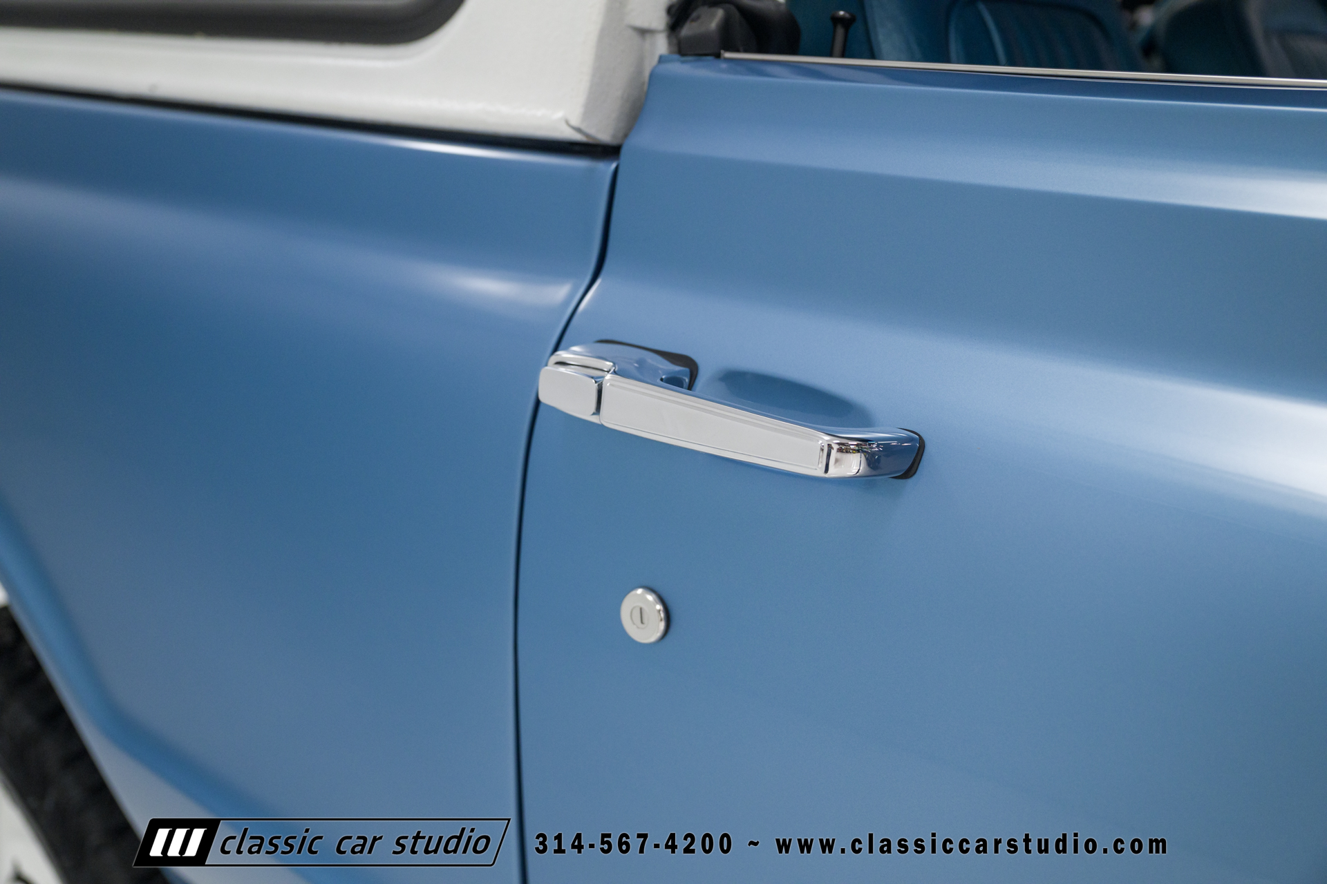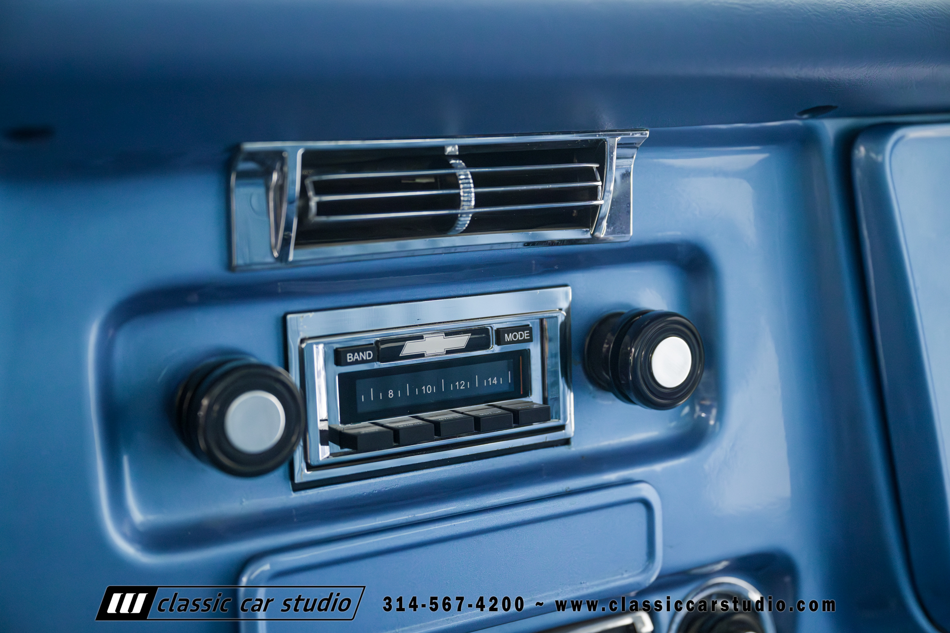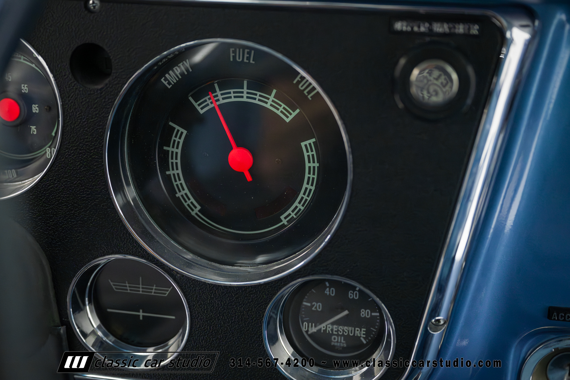 While the body was off, the frame was sandblasted and powder coated before it was reassembled with all new suspension components. The brakes have been rebuilt and are configured with front disc, rear drum, and a new master cylinder and booster. All of the brake lines and hoses are new as well. The wheels are 17” steel wheels with custom fitted restored dog dishes and new BFG tires.