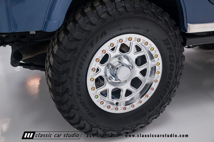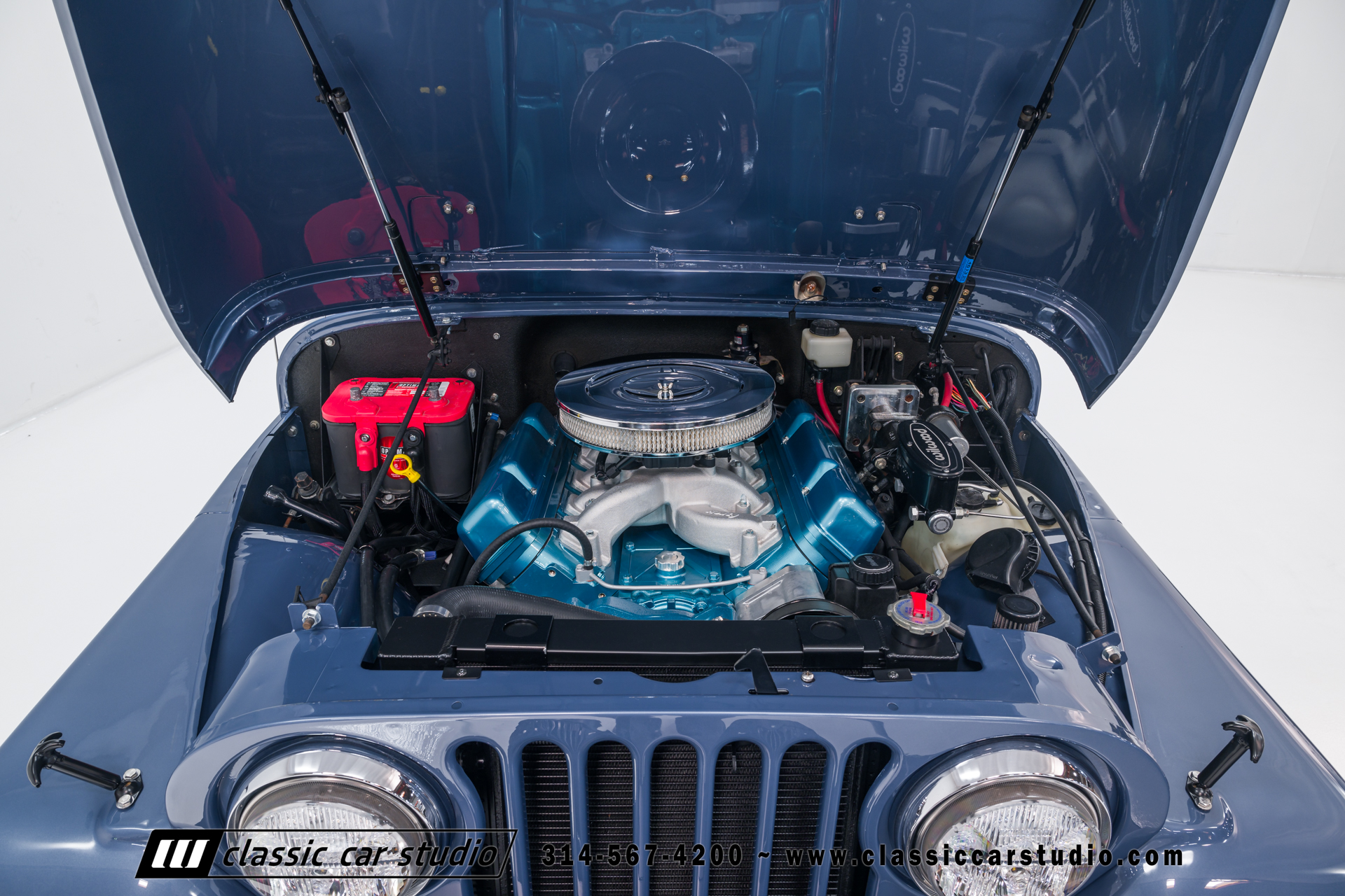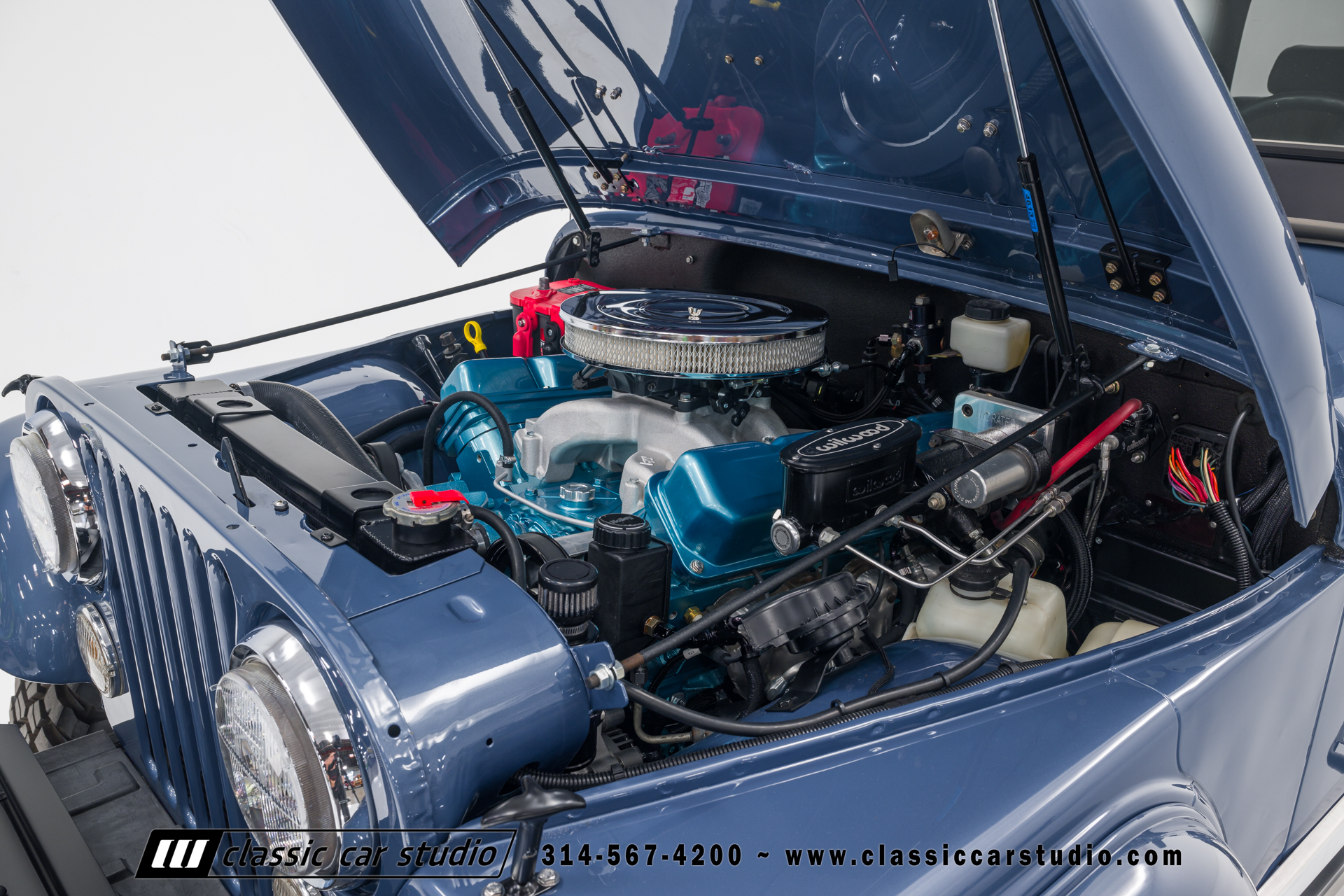 As a recipient of an early Corvette LS1 swap, the owner aimed to elevate the engine to contemporary LS standards. Classic Car Studio, in pursuit of enhancing an already remarkable platform, replaced the engine with a new GM Performance LS3, controlled by a Holley Terminator system. The engine, meticulously painted in the correct AMC blue, mirrors the original Jeep’s finish.