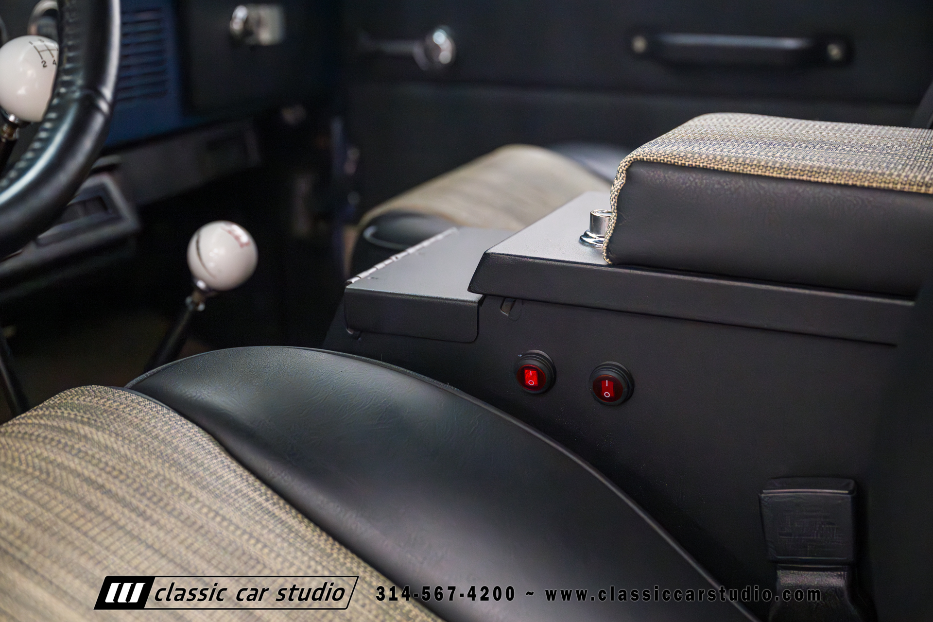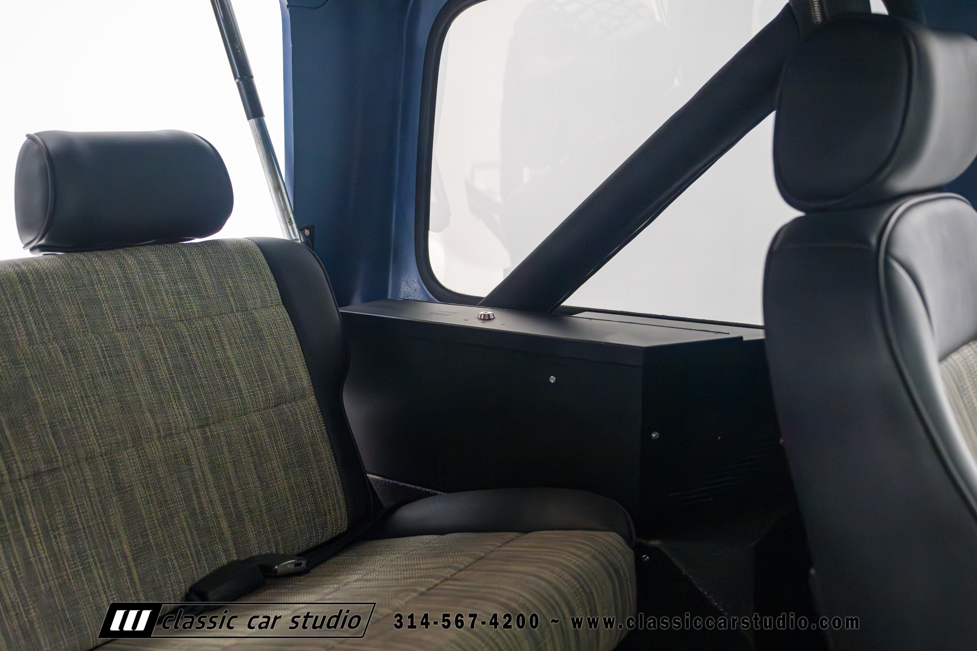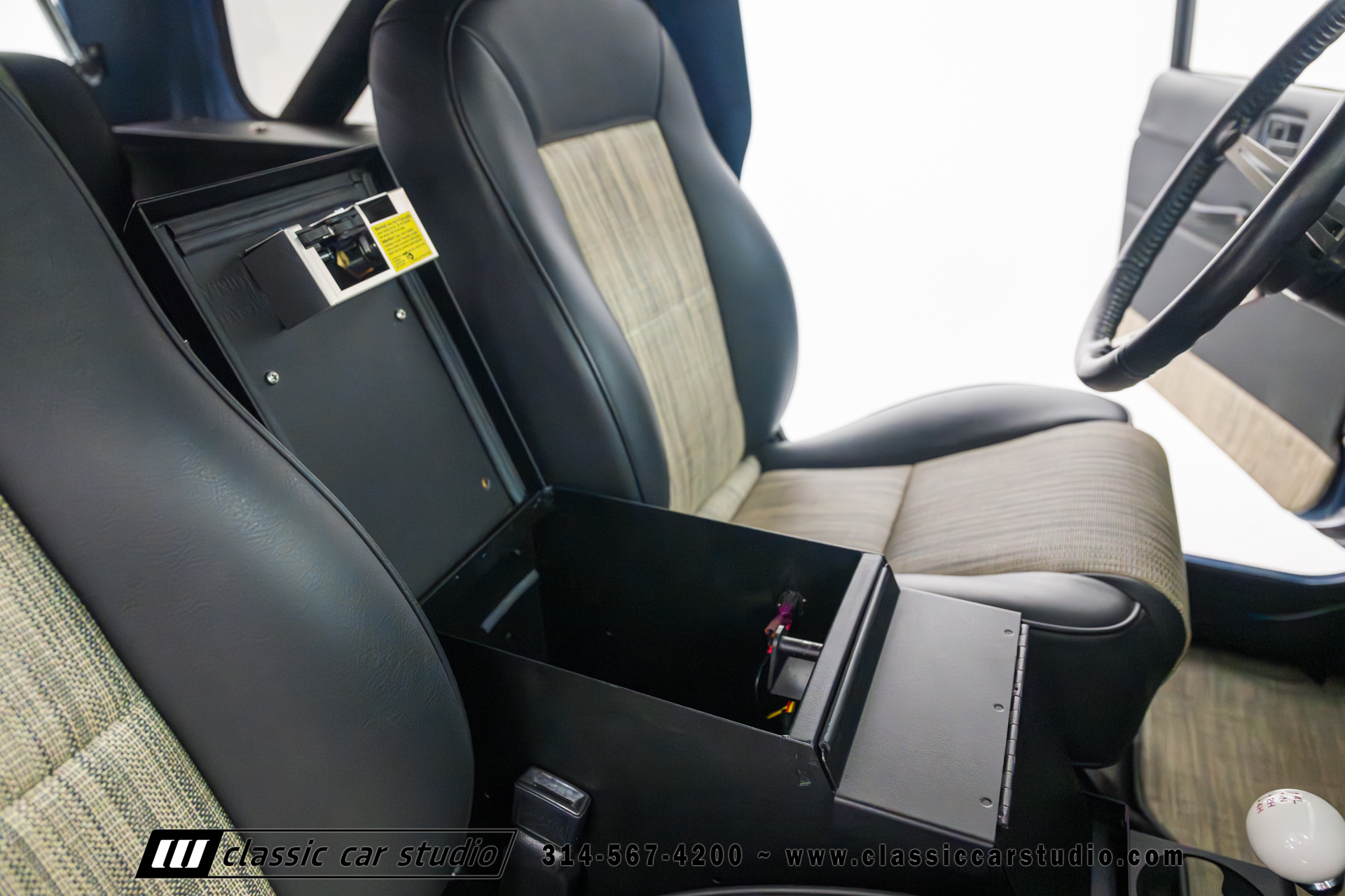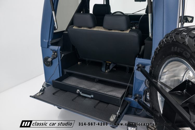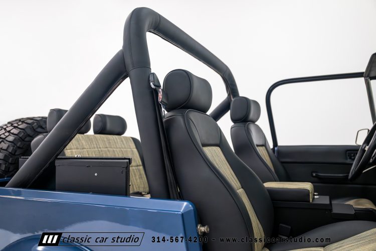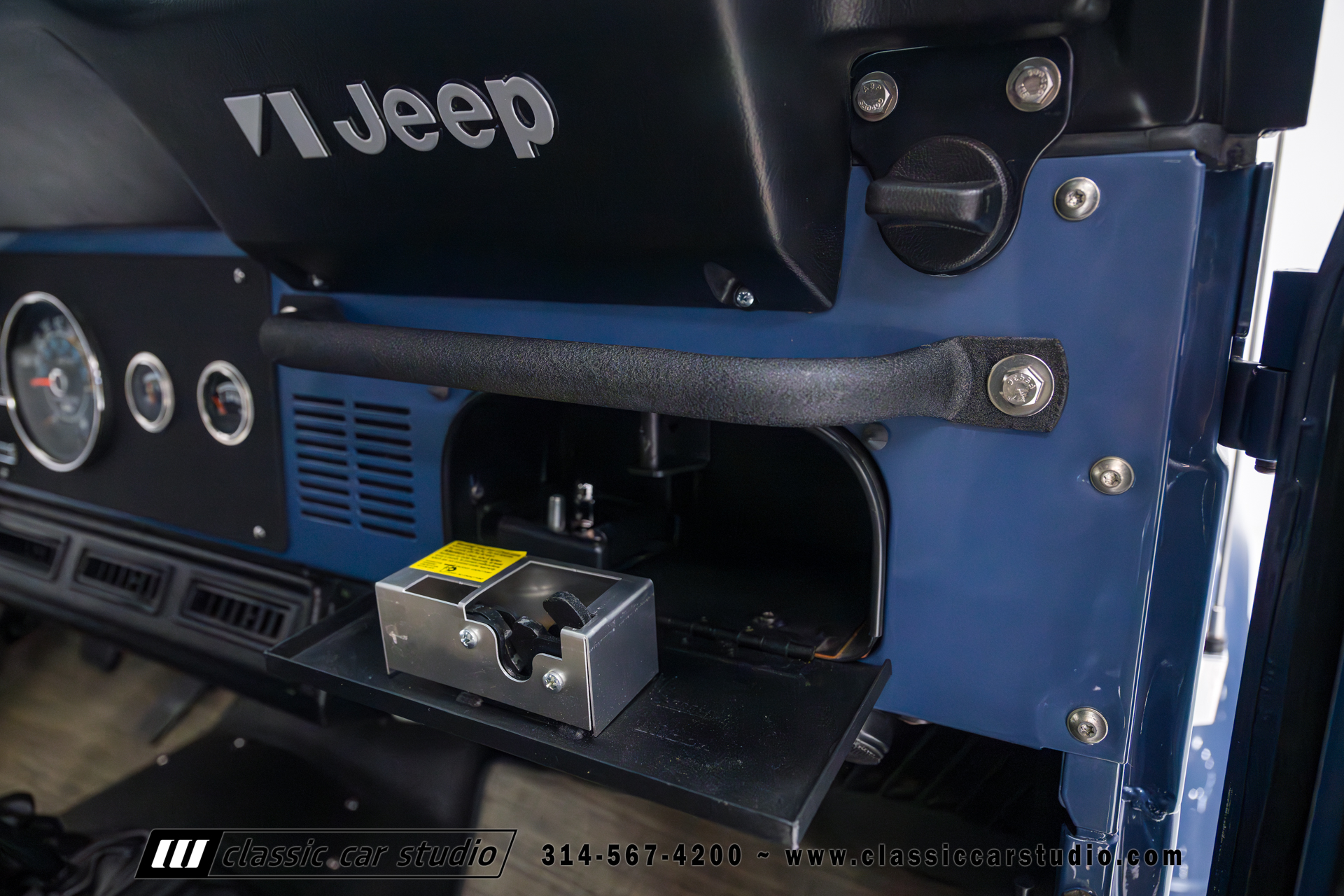 Enhancing both safety and style, the interior boasts a roll bar, complemented by an Alpine stereo system paired with high-quality Focal speakers. Practicality meets design with the inclusion of a lockable drawer in the rear cargo area. The CJ-7 also features additional interior enhancements, such as an upgraded Vintage Air system.
