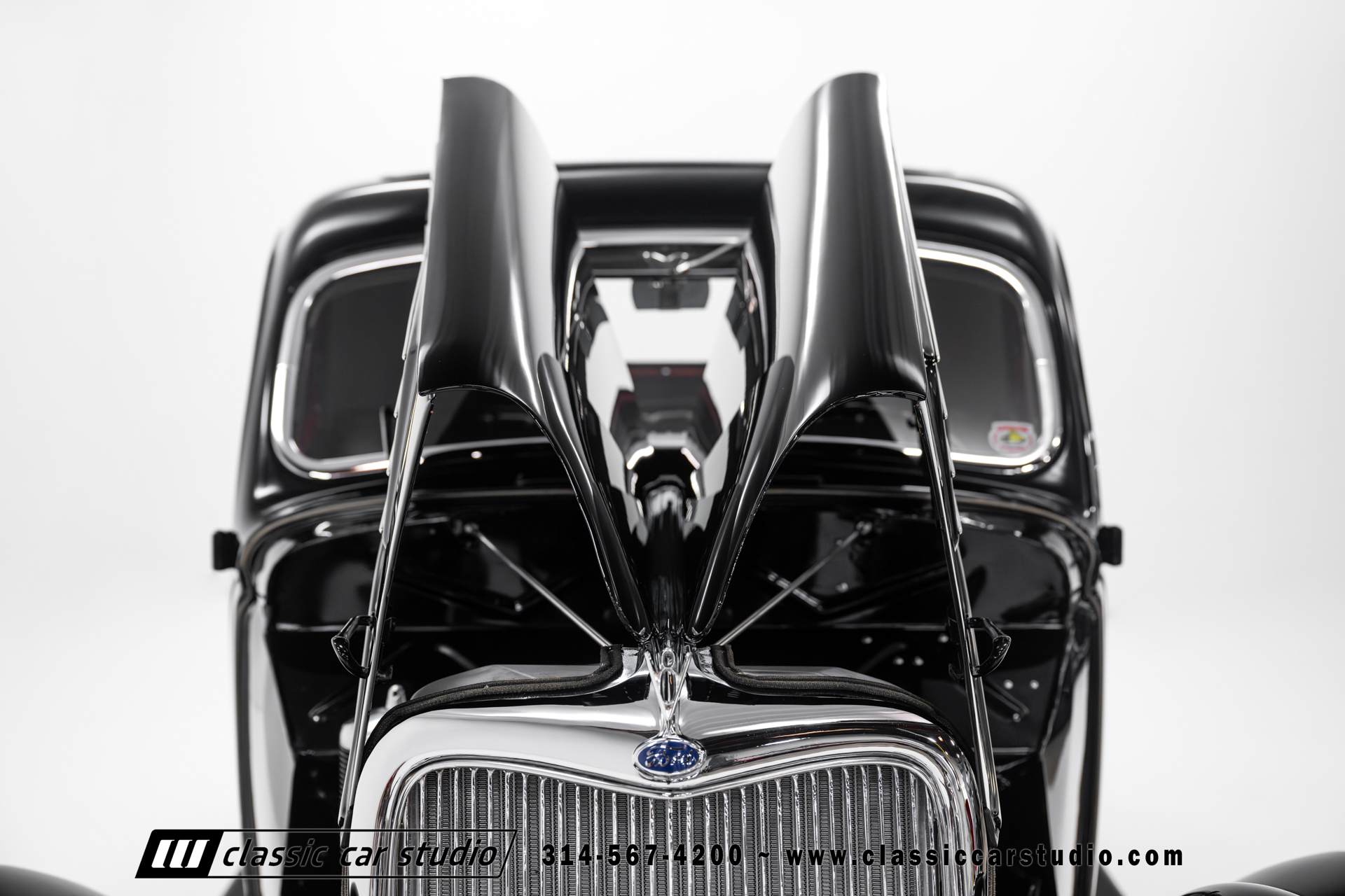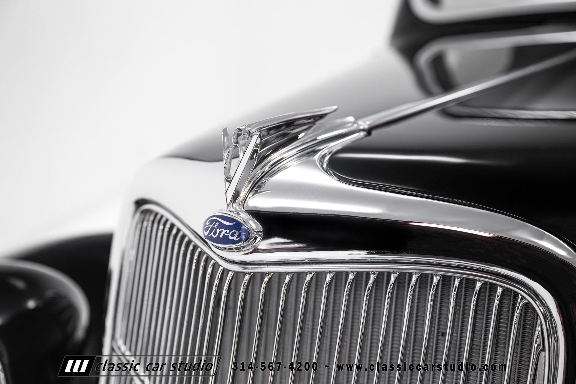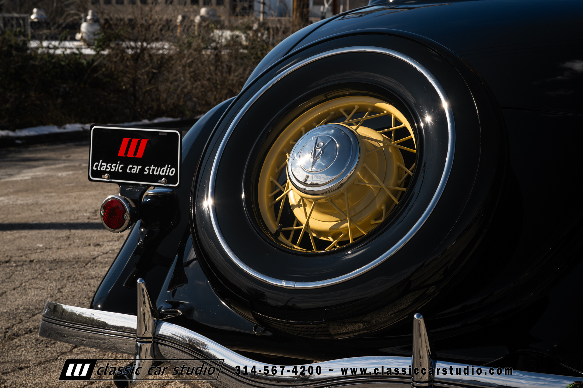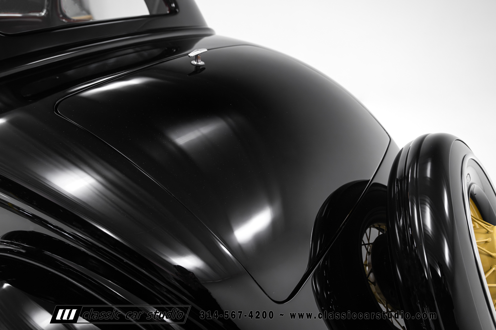 In 2017, the restoration was completed by Rezurected Rod and Kustom in Wayne, NE. This all steel car with original fenders that was stripped down to bare metal and the project began! All new body work was laid out as well as a slick black paint job. The grill, bumpers and windshield surround received all new chrome and the factory wire wheels were refinished in yellow with chrome “V8” caps.